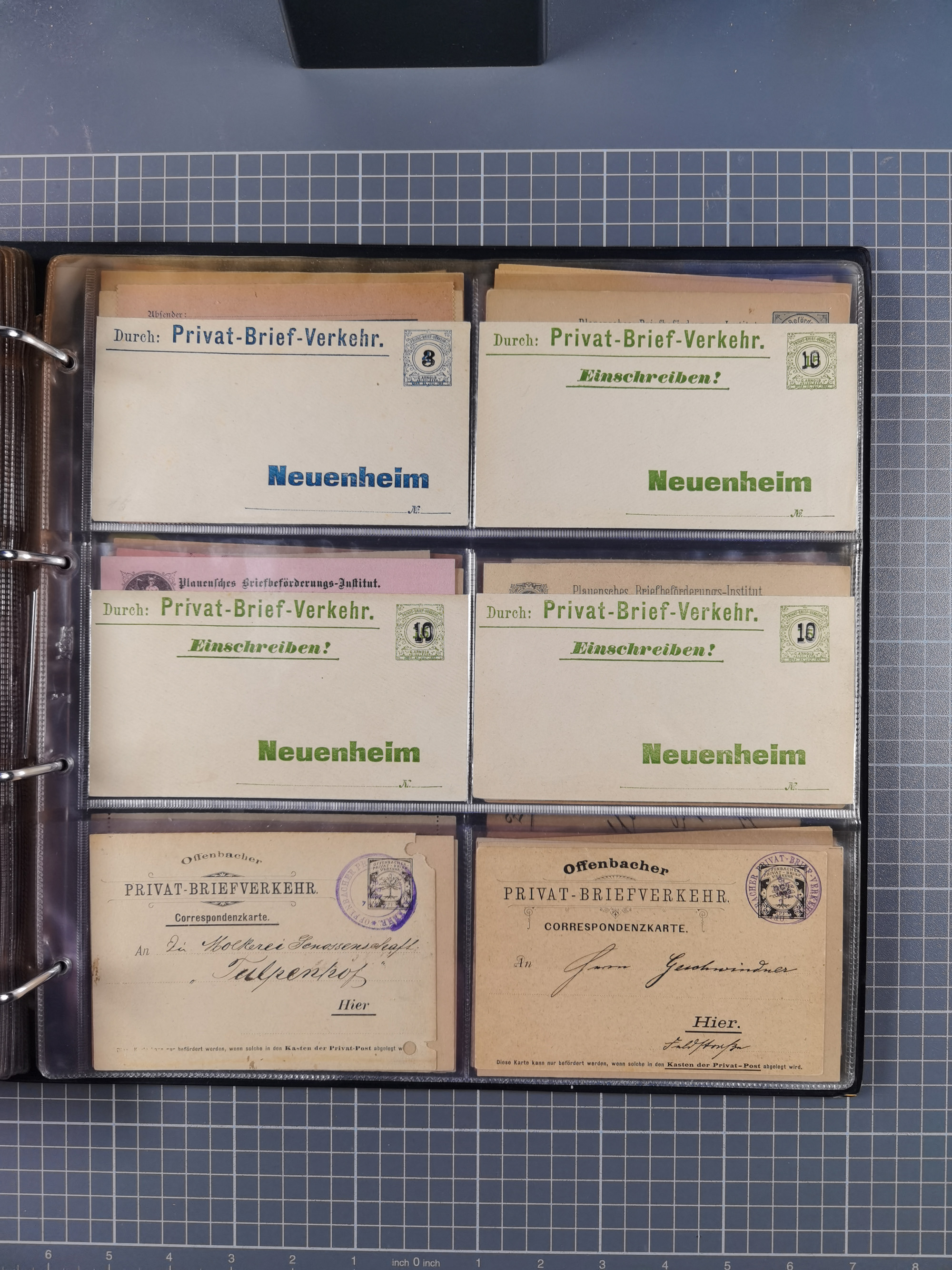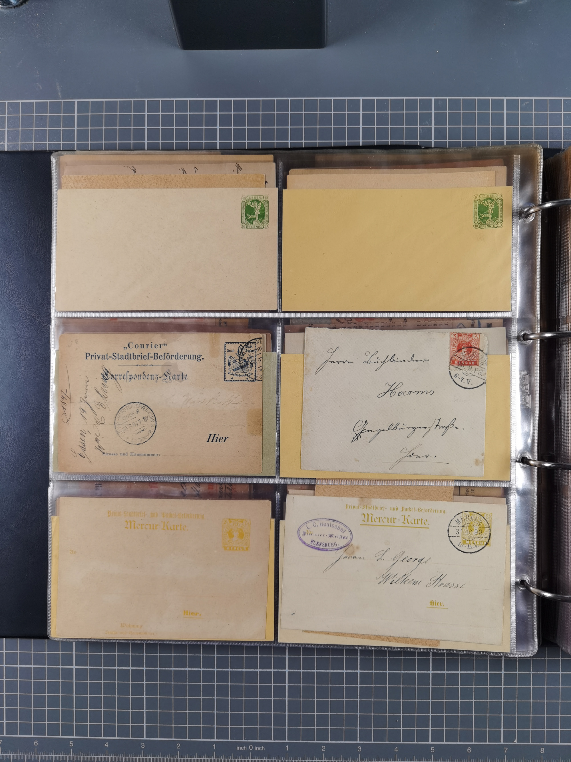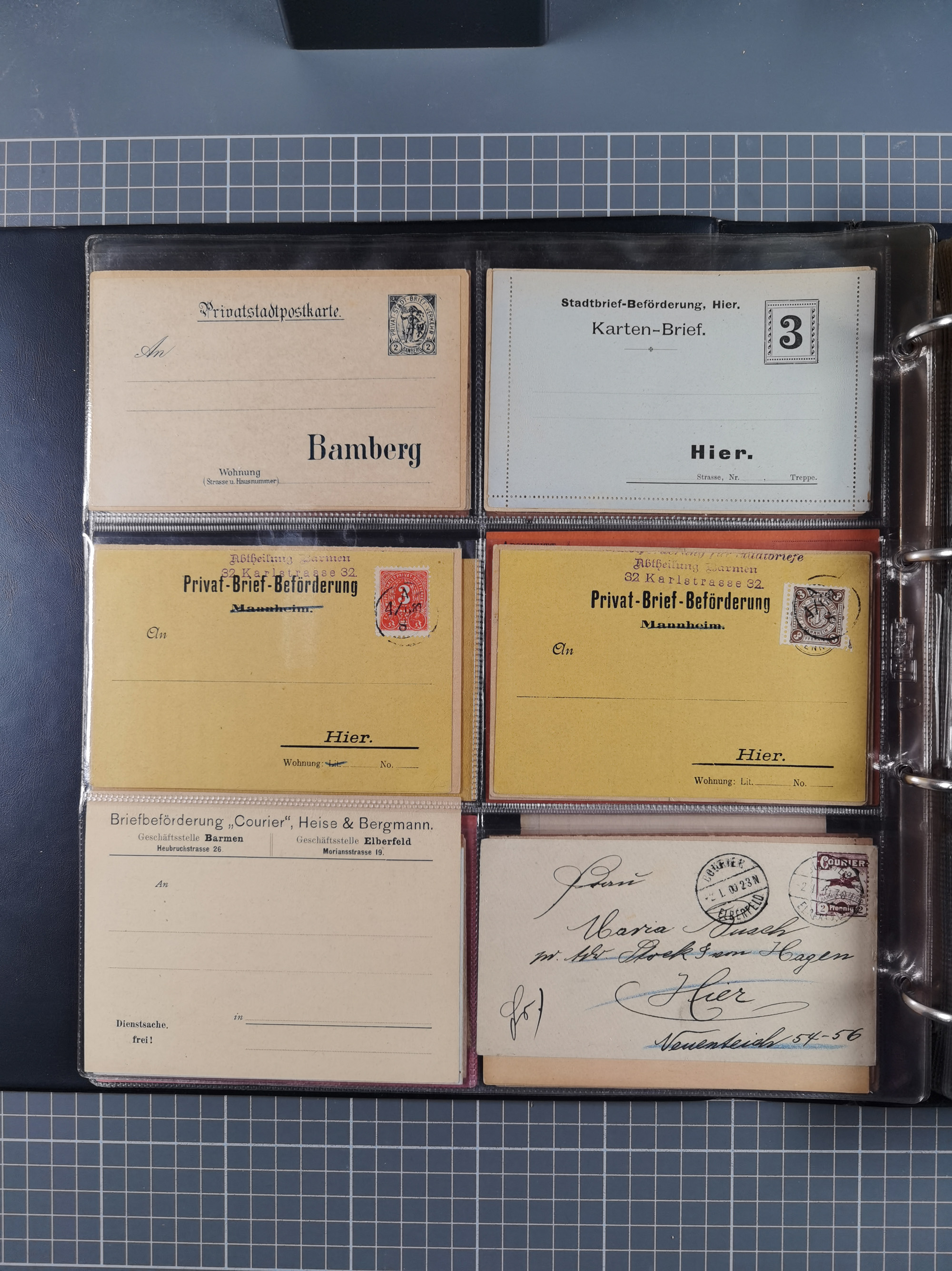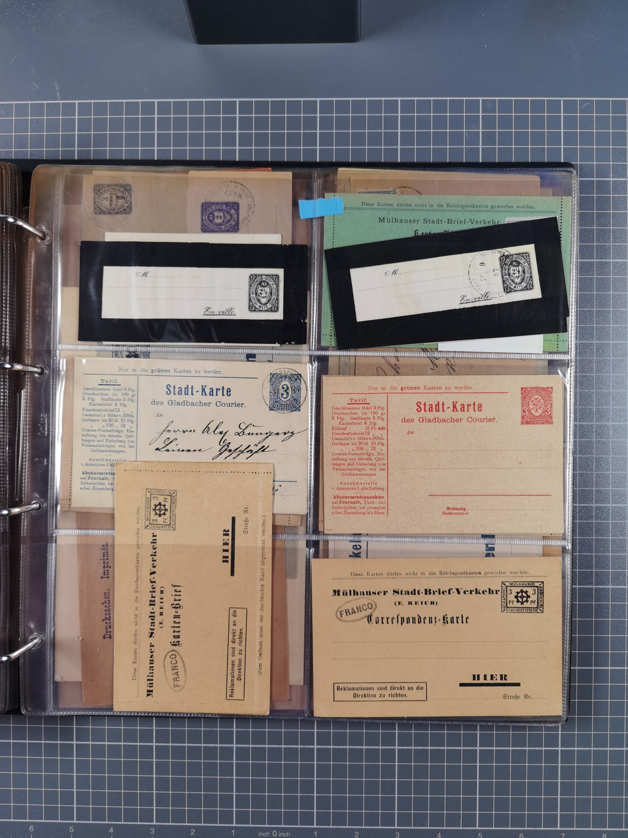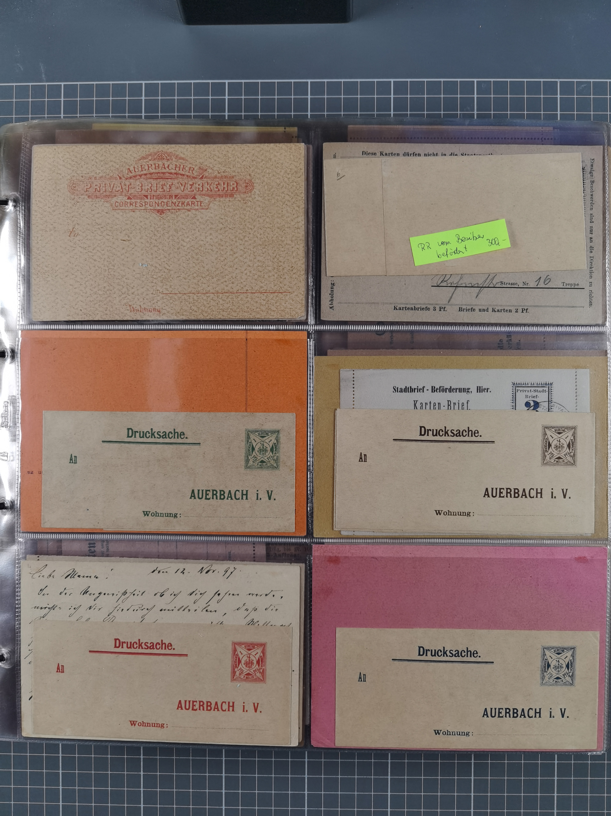Auerbach bis Zittau: 1886/1900, umfangreiche Sammlung mit über 550 Briefen, Karten sowie ungebrauchten und gebrauchten Ganzsachen und einigen Formularen. Dabei u.a. Augsburg mit K3 gebraucht, Bamberg mit Mi.-Nr. 4 auf drei Briefen/Postkarten, Bonn mit Ganzsachen mit Firmen-Absendern, Dortmund mit P1 gebraucht (kleine Randfehler), Duisburg mit etwas fehlerhafter P2 gebraucht, Kassel Mi.-Nr. 14 auf Postkarte, Krefeld-Express-Beförderung Mi.-Nr. 5 auf Briefvorderseite, Mönchengladbach Courier Mi.-Nr. 4 auf Brief, Offenbach Privat-Post-Verkehr P1 gebraucht, Rostock K1 gebraucht, Worms K1 als Vorderseite gebraucht und Zittau P3 gebraucht mit Text. Die Erhaltung ist zum Teil leicht fehlerhaft, meist aber einwandfrei