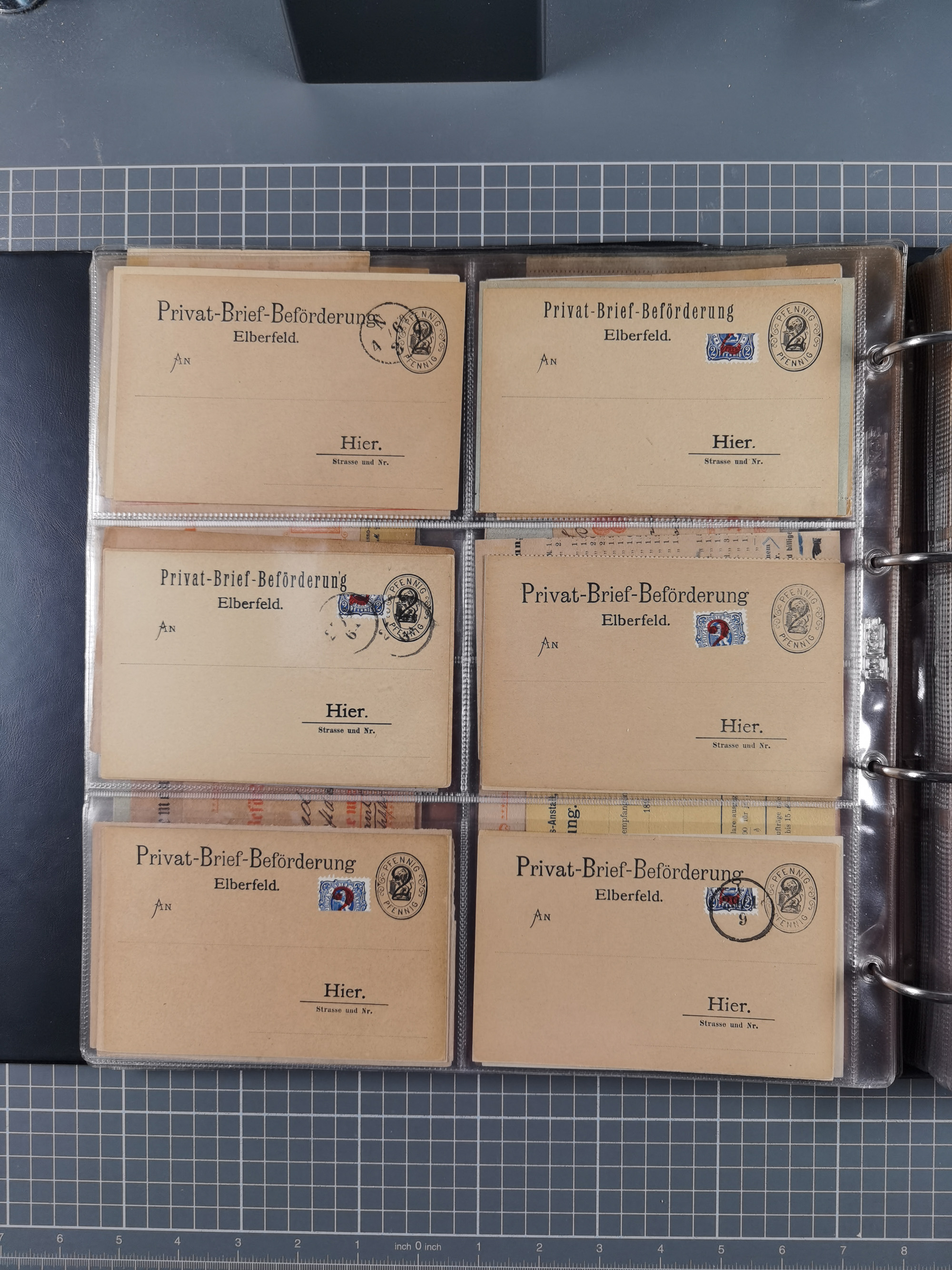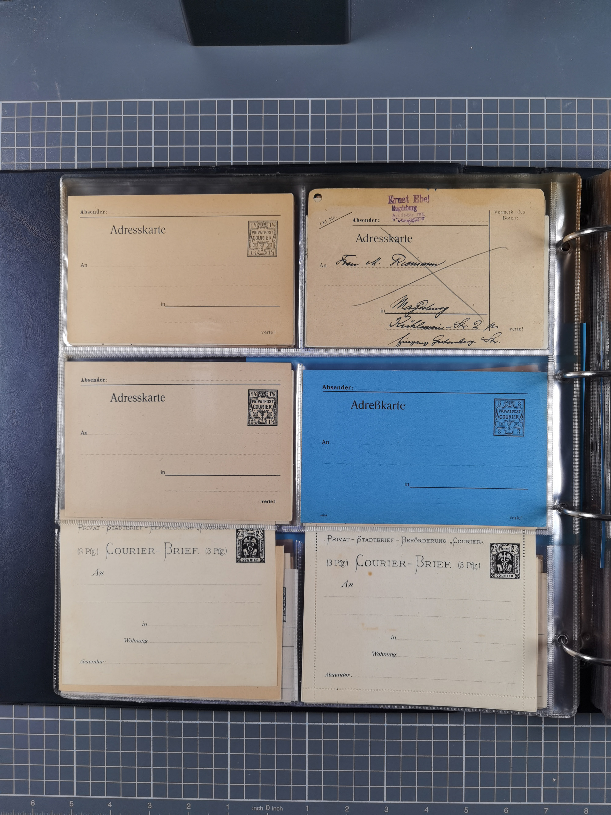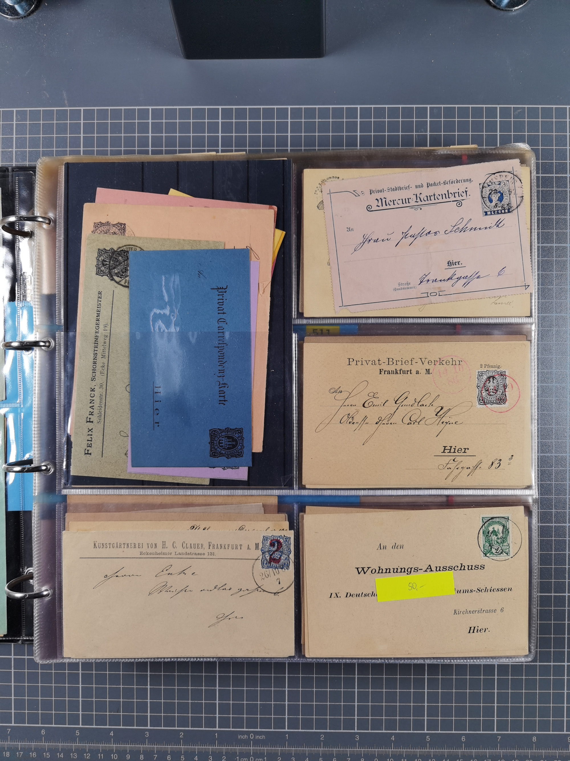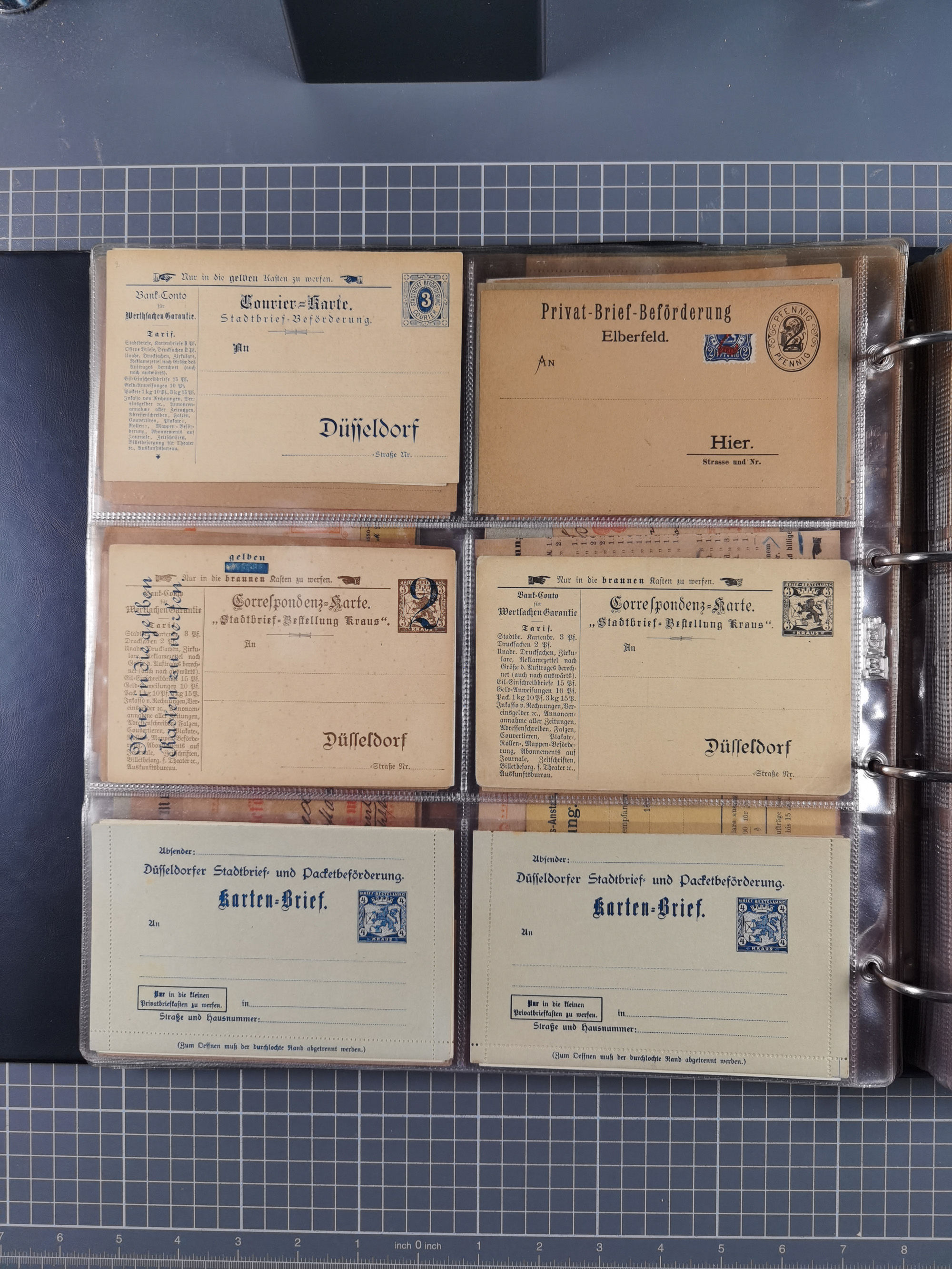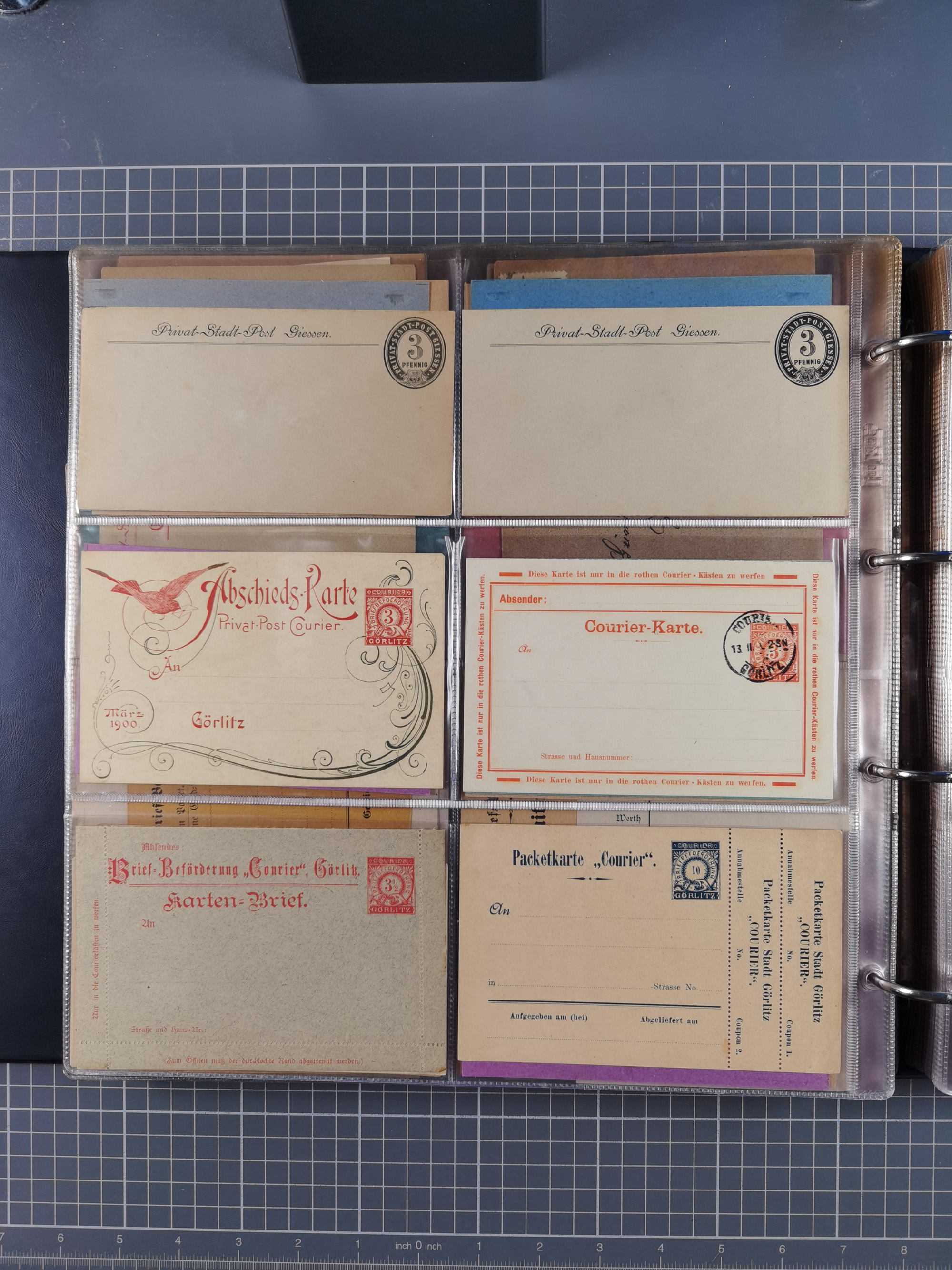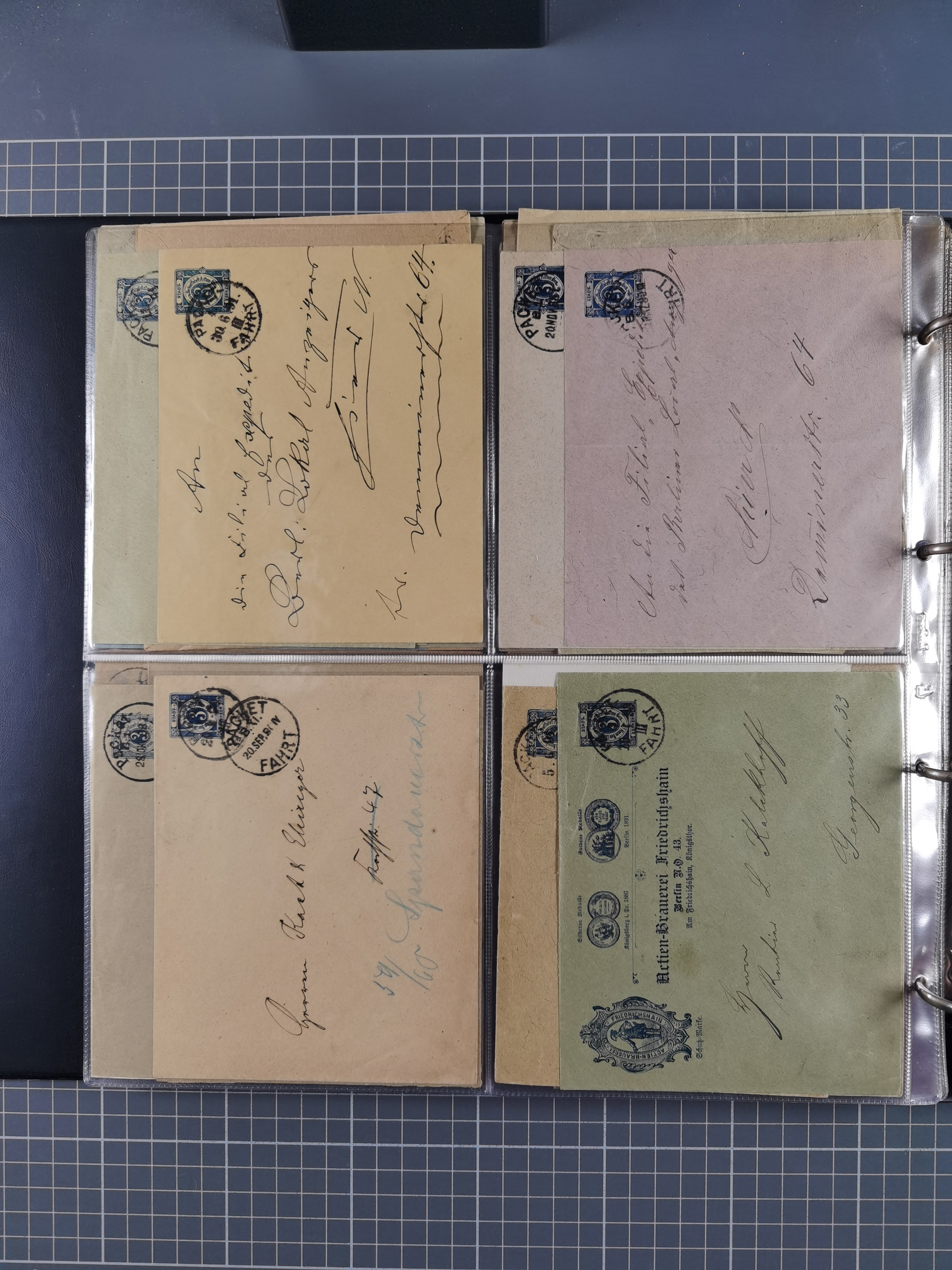 Auerbach bis Zittau: 1886/1900, umfangreiche Sammlung mit über 550 Briefen, Karten sowie ungebrauchten und gebrauchten Ganzsachen und einigen Formularen. Dabei u.a. Augsburg mit K3 gebraucht, Bamberg mit Mi.-Nr. 4 auf drei Briefen/Postkarten, Bonn mit Ganzsachen mit Firmen-Absendern, Dortmund mit P1 gebraucht (kleine Randfehler), Duisburg mit etwas fehlerhafter P2 gebraucht, Kassel Mi.-Nr. 14 auf Postkarte, Krefeld-Express-Beförderung Mi.-Nr. 5 auf Briefvorderseite, Mönchengladbach Courier Mi.-Nr. 4 auf Brief, Offenbach Privat-Post-Verkehr P1 gebraucht, Rostock K1 gebraucht, Worms K1 als Vorderseite gebraucht und Zittau P3 gebraucht mit Text. Die Erhaltung ist zum Teil leicht fehlerhaft, meist aber einwandfrei
