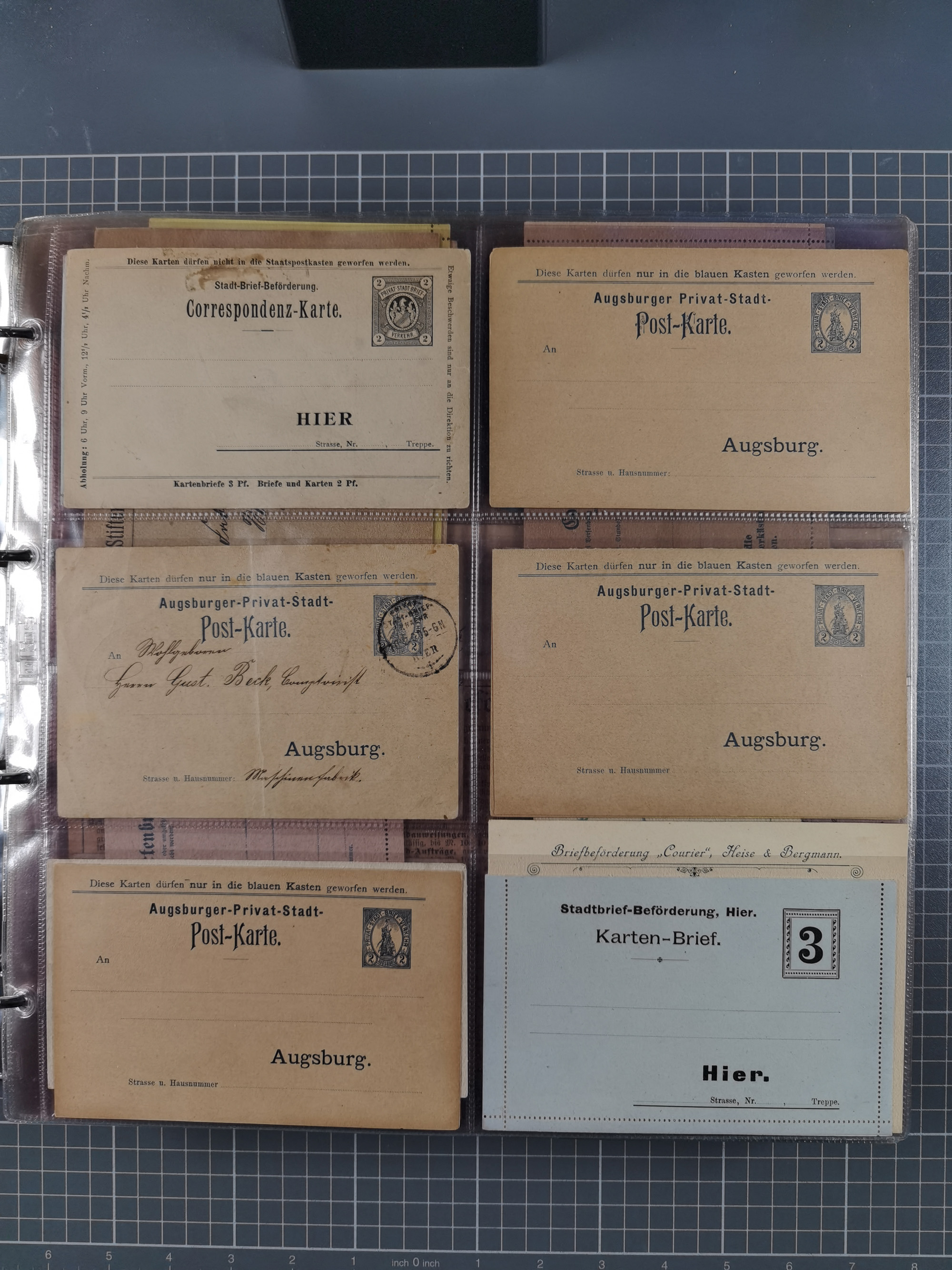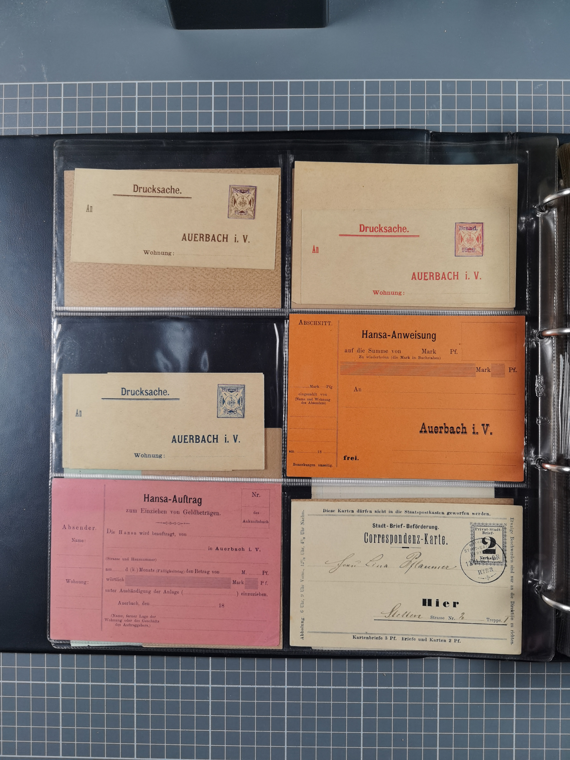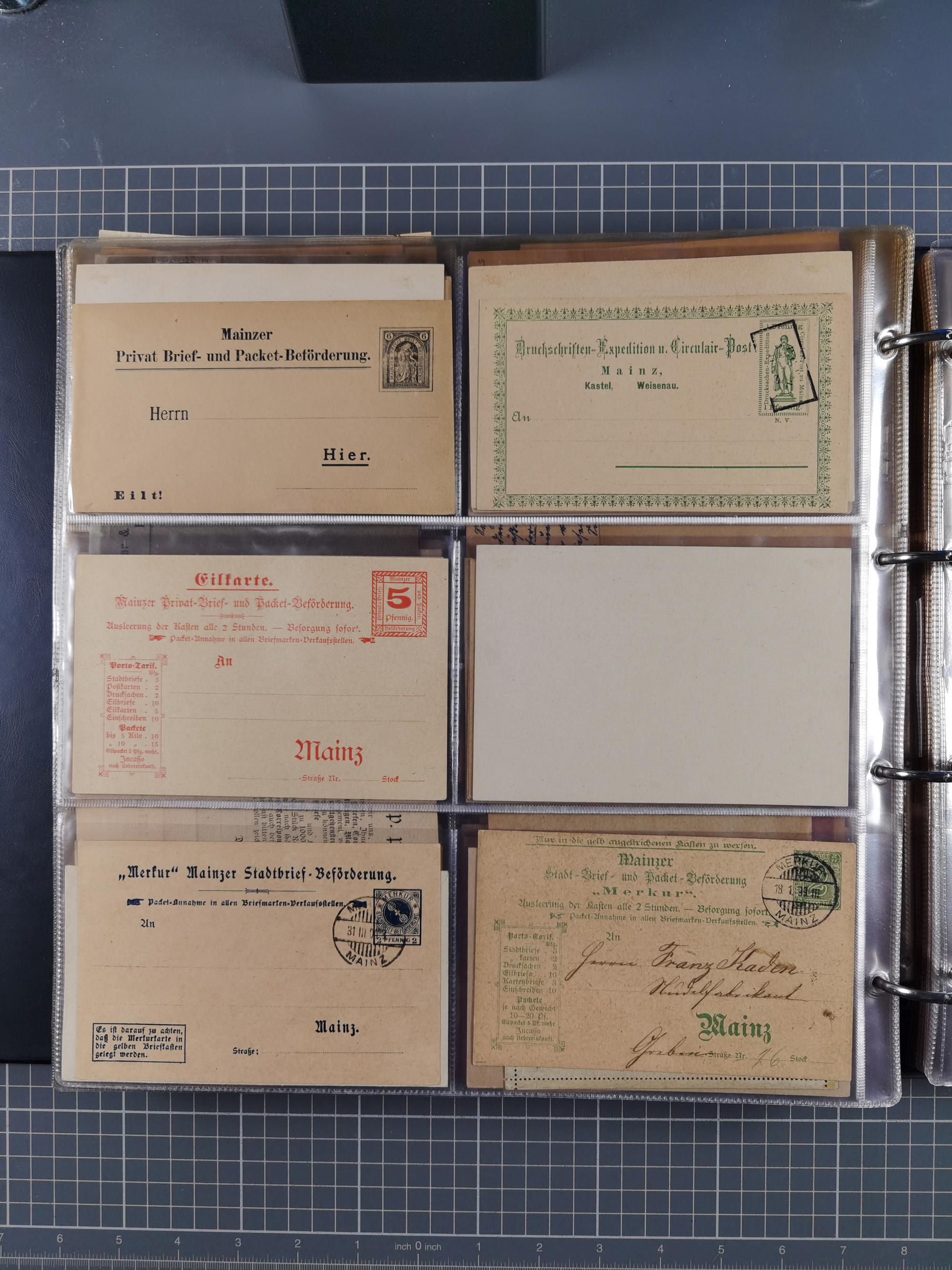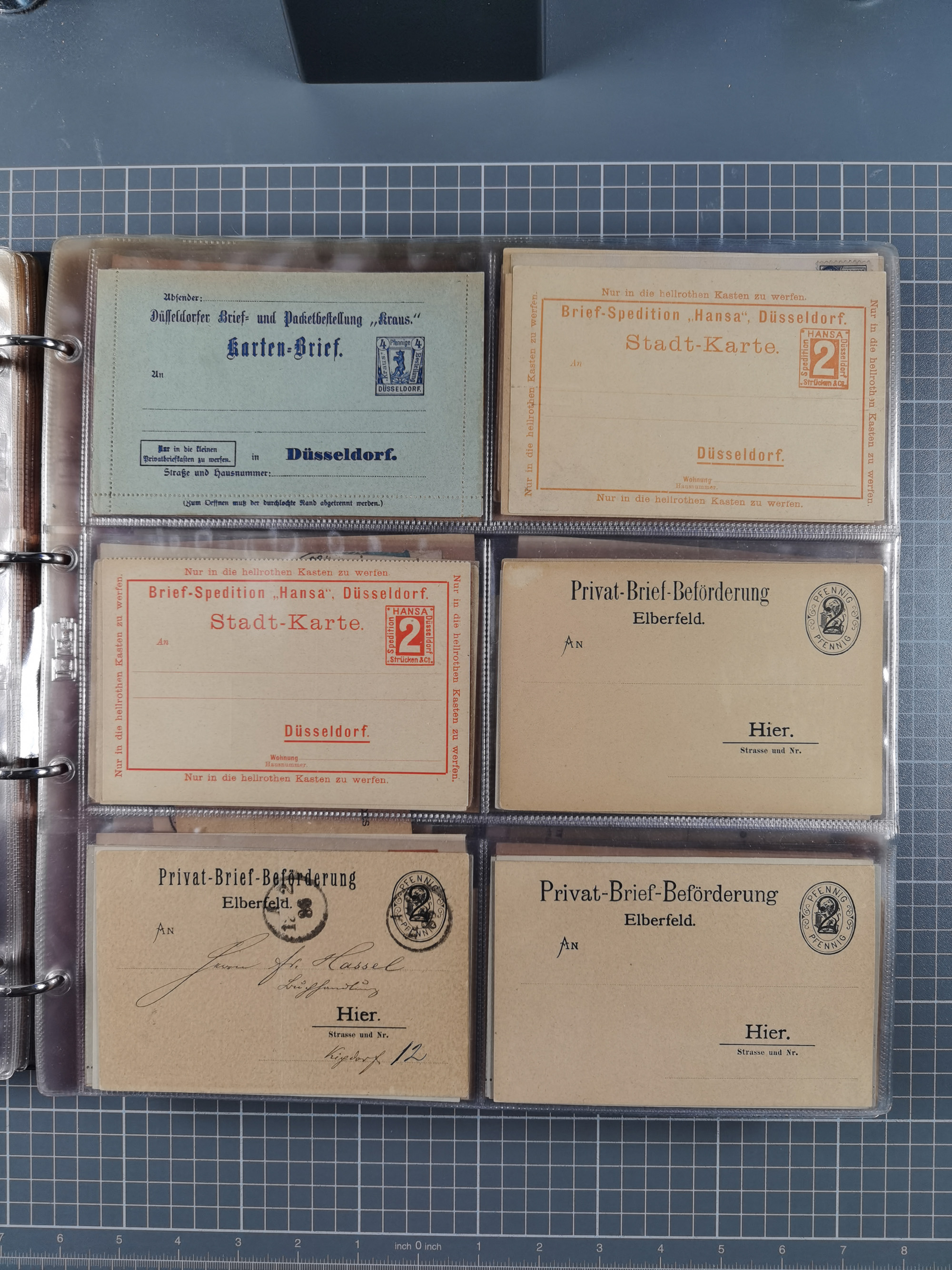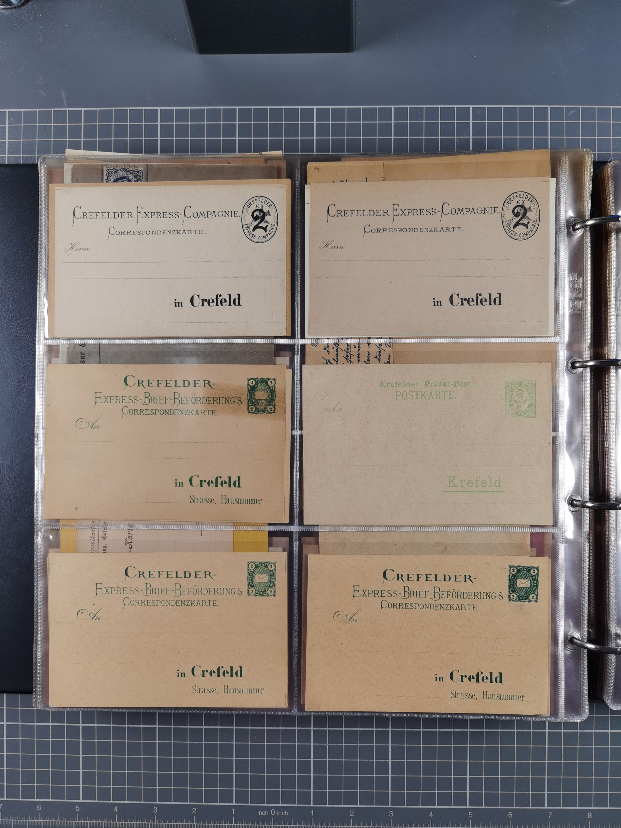 Auerbach bis Zittau: 1886/1900, umfangreiche Sammlung mit über 550 Briefen, Karten sowie ungebrauchten und gebrauchten Ganzsachen und einigen Formularen. Dabei u.a. Augsburg mit K3 gebraucht, Bamberg mit Mi.-Nr. 4 auf drei Briefen/Postkarten, Bonn mit Ganzsachen mit Firmen-Absendern, Dortmund mit P1 gebraucht (kleine Randfehler), Duisburg mit etwas fehlerhafter P2 gebraucht, Kassel Mi.-Nr. 14 auf Postkarte, Krefeld-Express-Beförderung Mi.-Nr. 5 auf Briefvorderseite, Mönchengladbach Courier Mi.-Nr. 4 auf Brief, Offenbach Privat-Post-Verkehr P1 gebraucht, Rostock K1 gebraucht, Worms K1 als Vorderseite gebraucht und Zittau P3 gebraucht mit Text. Die Erhaltung ist zum Teil leicht fehlerhaft, meist aber einwandfrei
