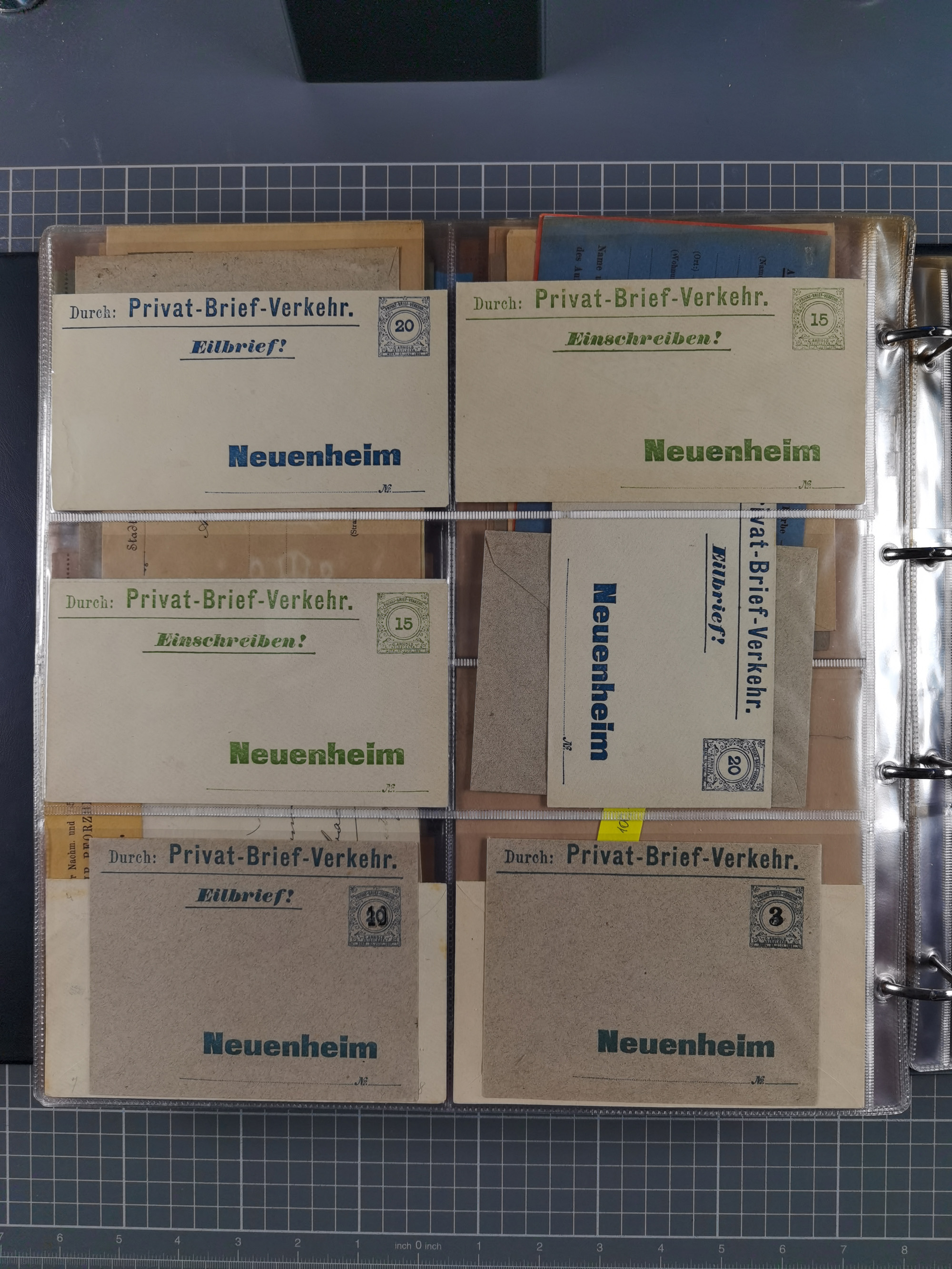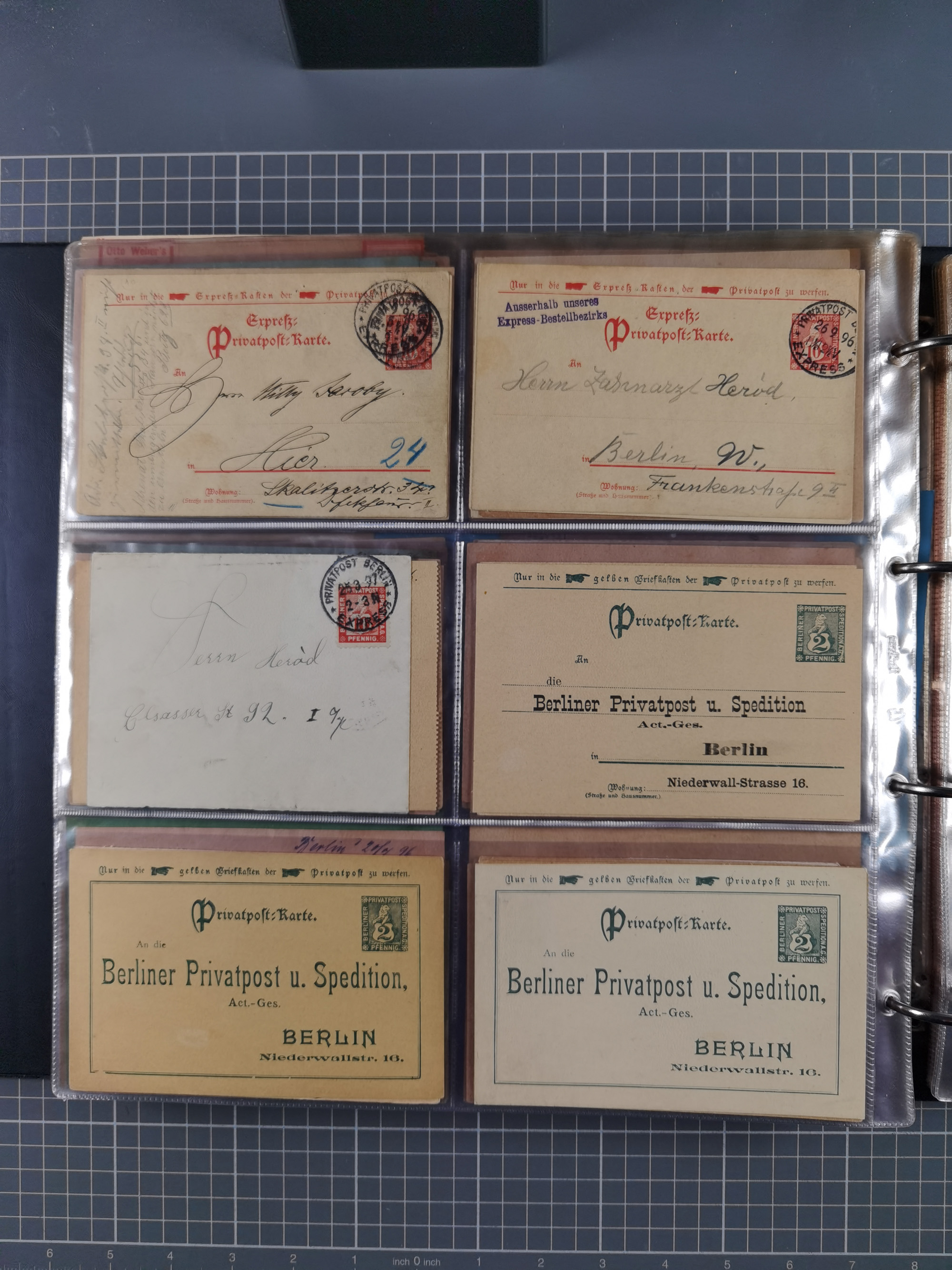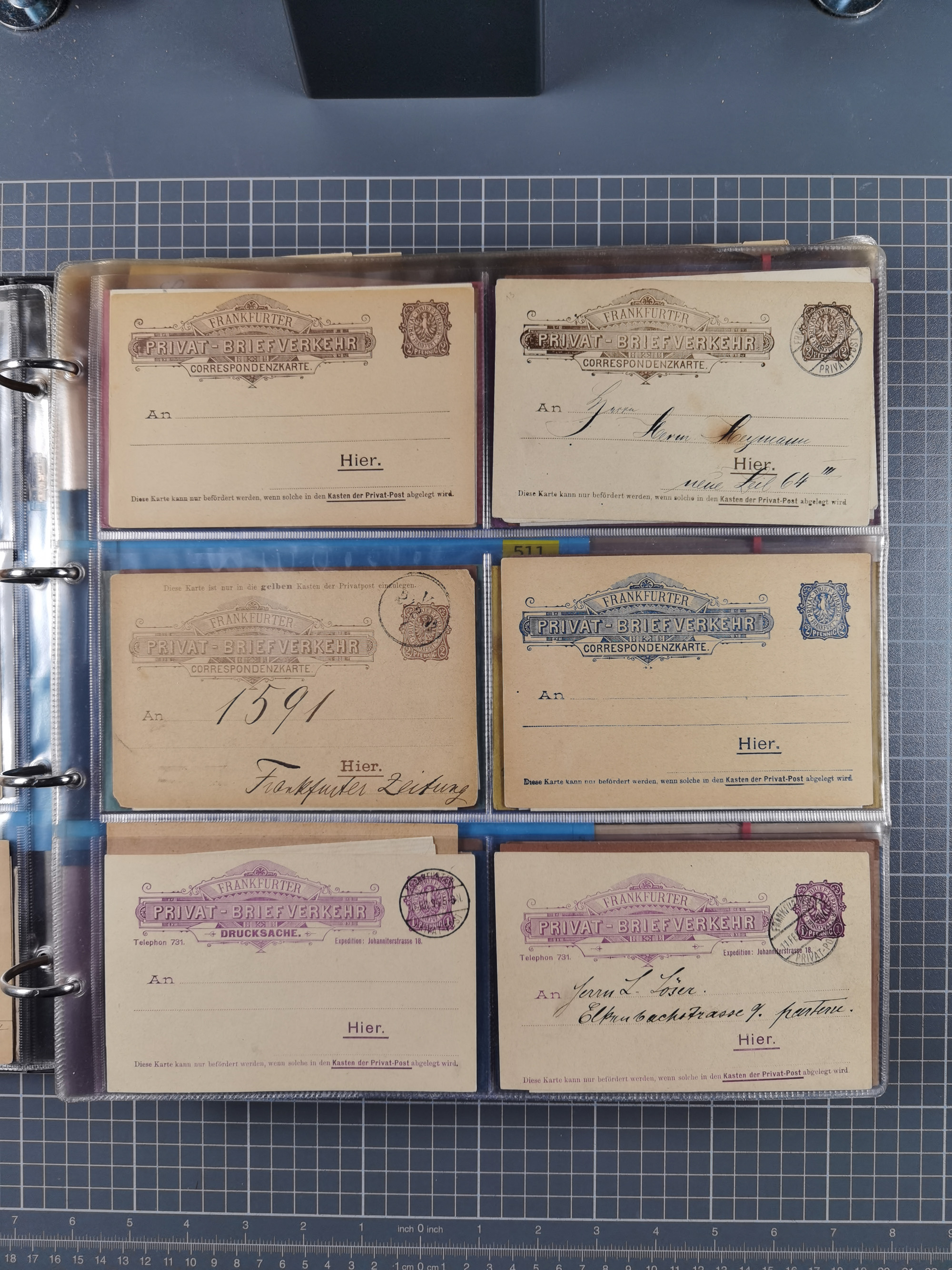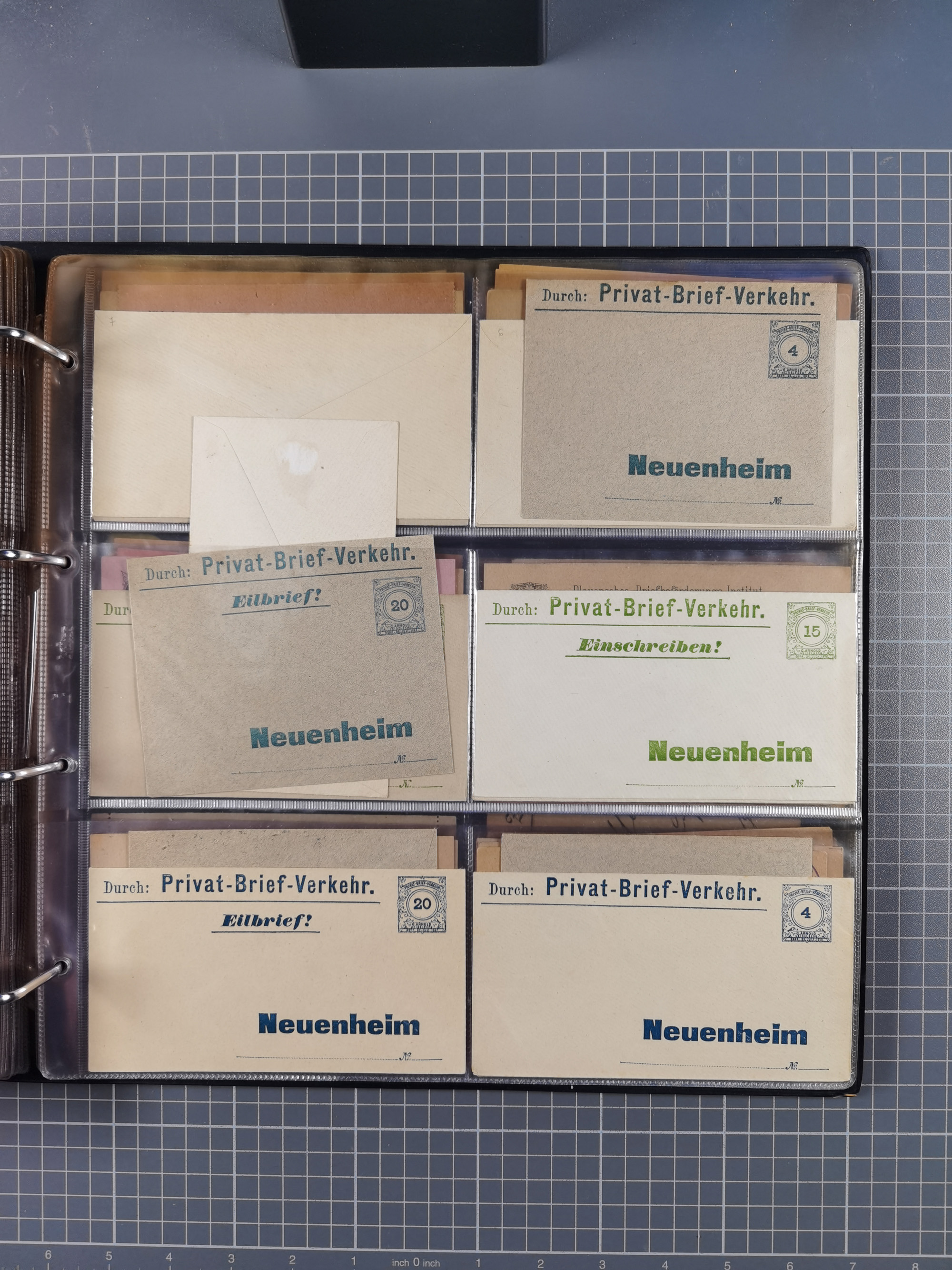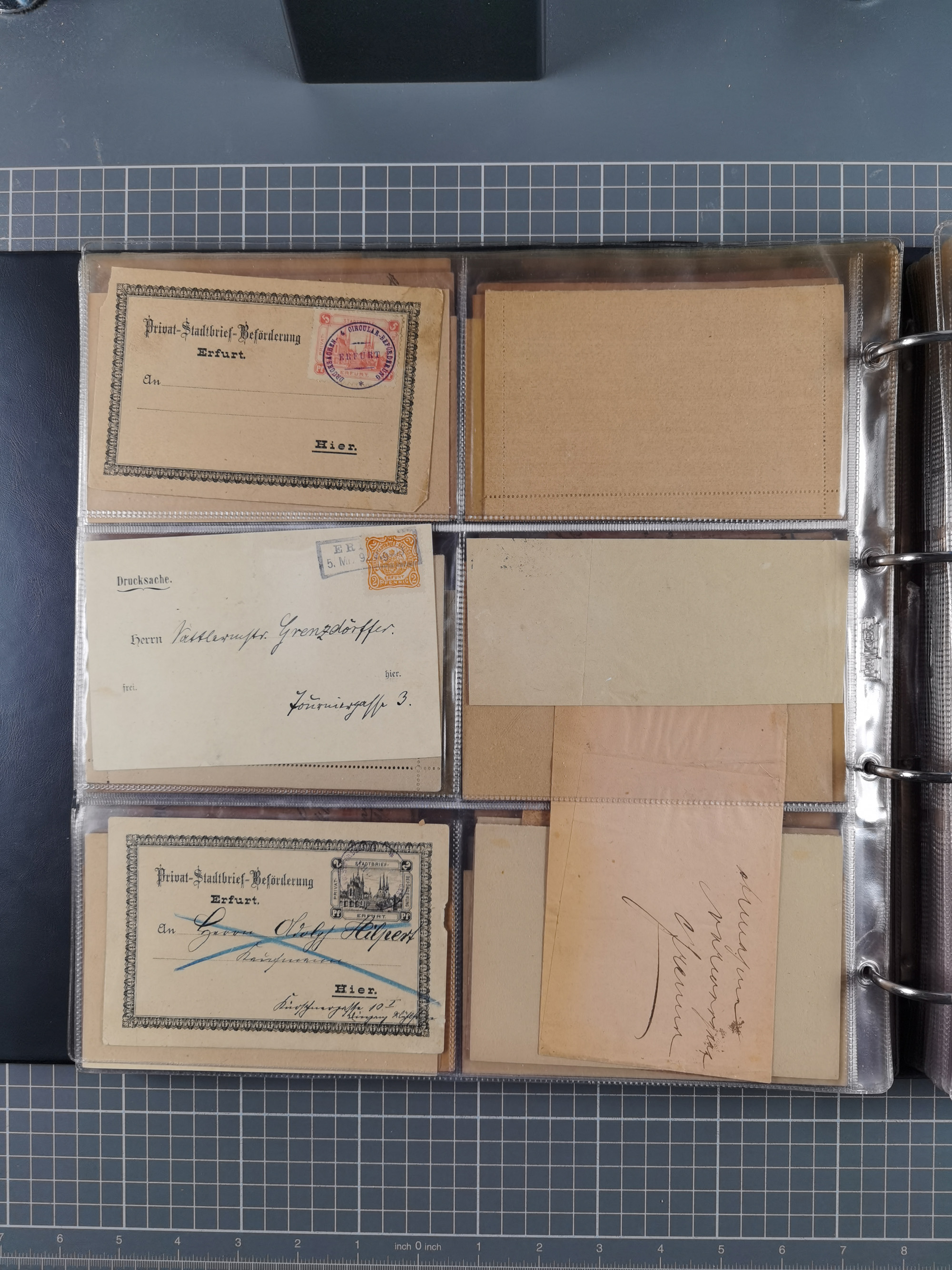 Auerbach bis Zittau: 1886/1900, umfangreiche Sammlung mit über 550 Briefen, Karten sowie ungebrauchten und gebrauchten Ganzsachen und einigen Formularen. Dabei u.a. Augsburg mit K3 gebraucht, Bamberg mit Mi.-Nr. 4 auf drei Briefen/Postkarten, Bonn mit Ganzsachen mit Firmen-Absendern, Dortmund mit P1 gebraucht (kleine Randfehler), Duisburg mit etwas fehlerhafter P2 gebraucht, Kassel Mi.-Nr. 14 auf Postkarte, Krefeld-Express-Beförderung Mi.-Nr. 5 auf Briefvorderseite, Mönchengladbach Courier Mi.-Nr. 4 auf Brief, Offenbach Privat-Post-Verkehr P1 gebraucht, Rostock K1 gebraucht, Worms K1 als Vorderseite gebraucht und Zittau P3 gebraucht mit Text. Die Erhaltung ist zum Teil leicht fehlerhaft, meist aber einwandfrei