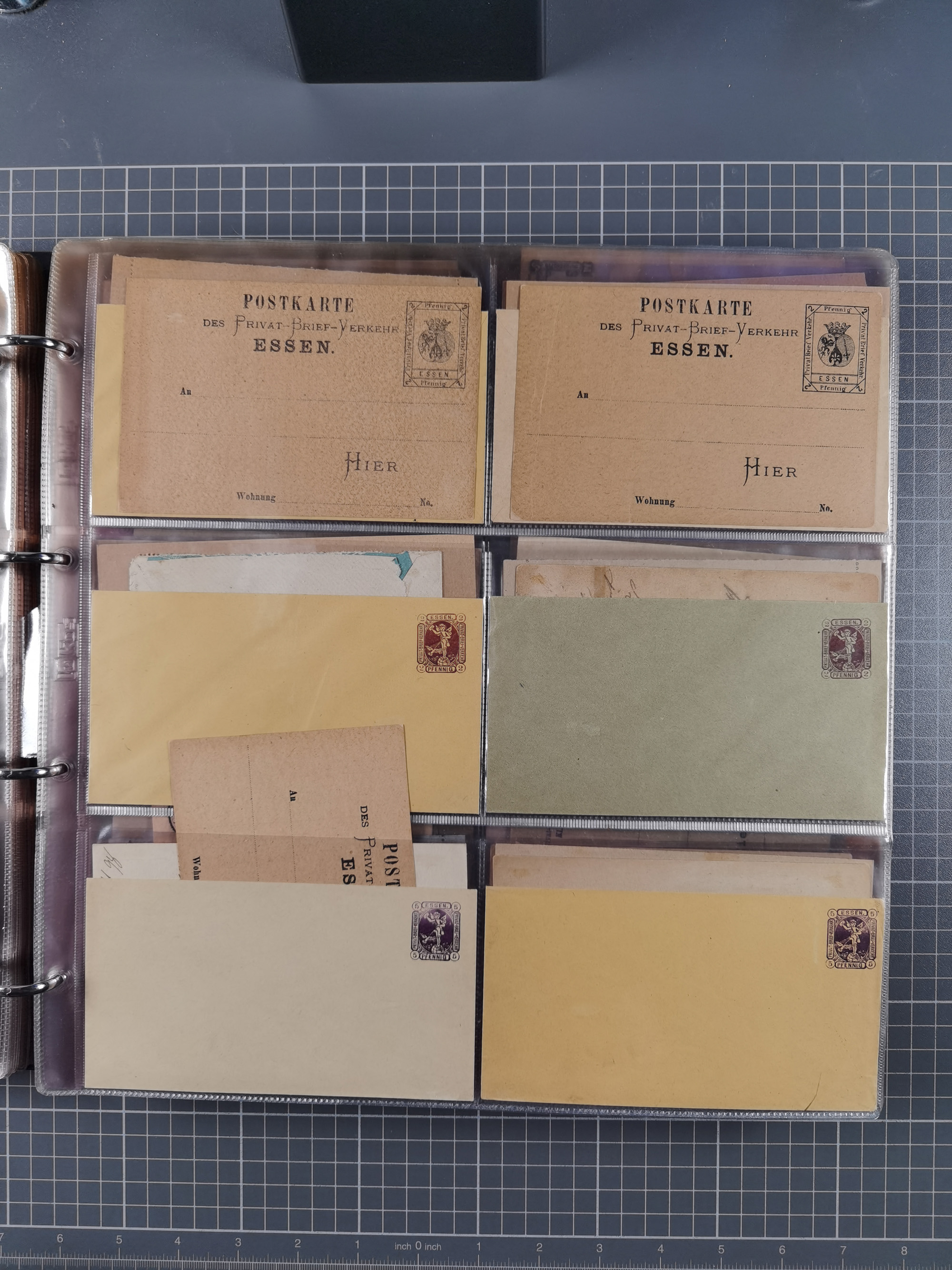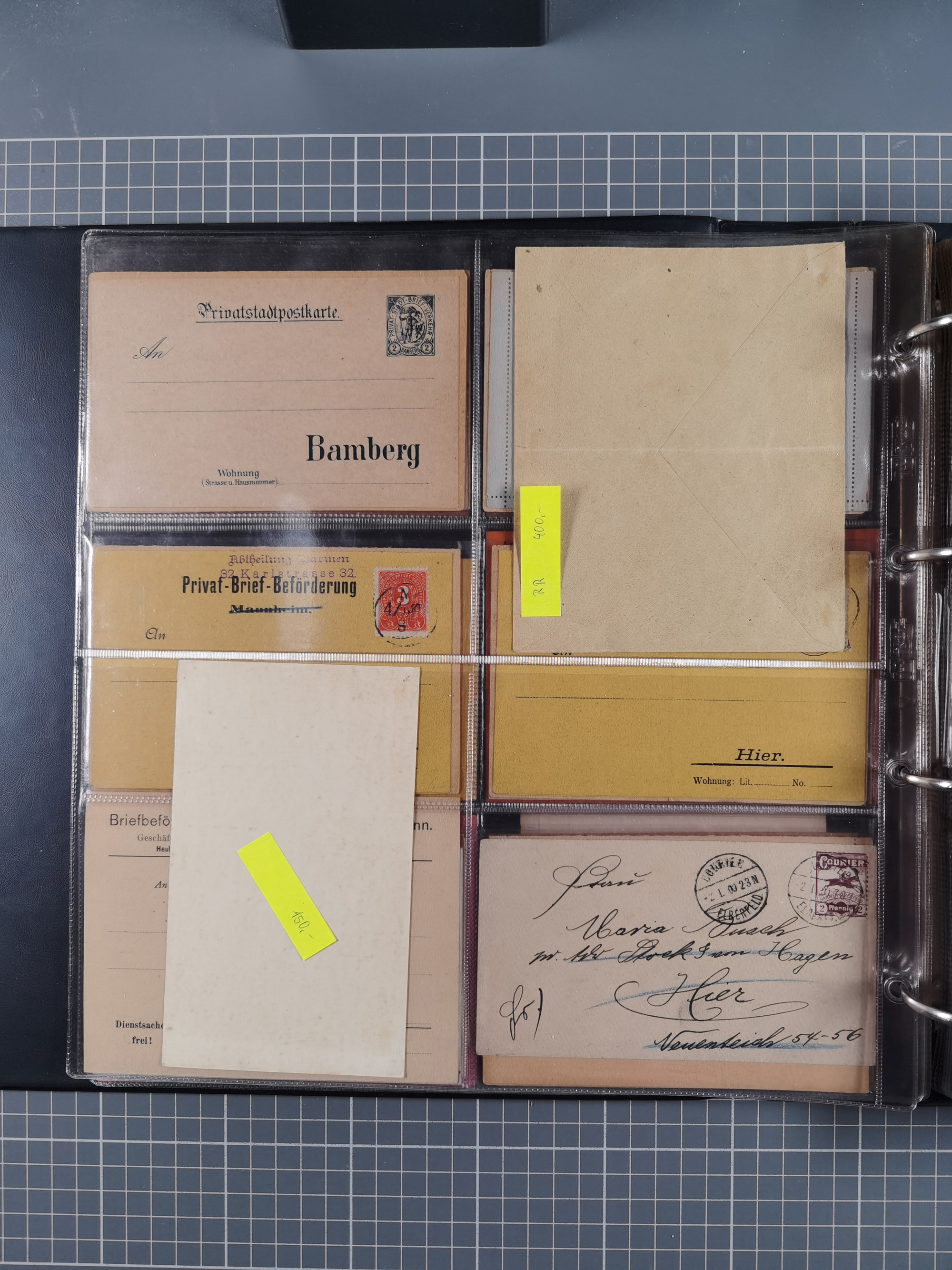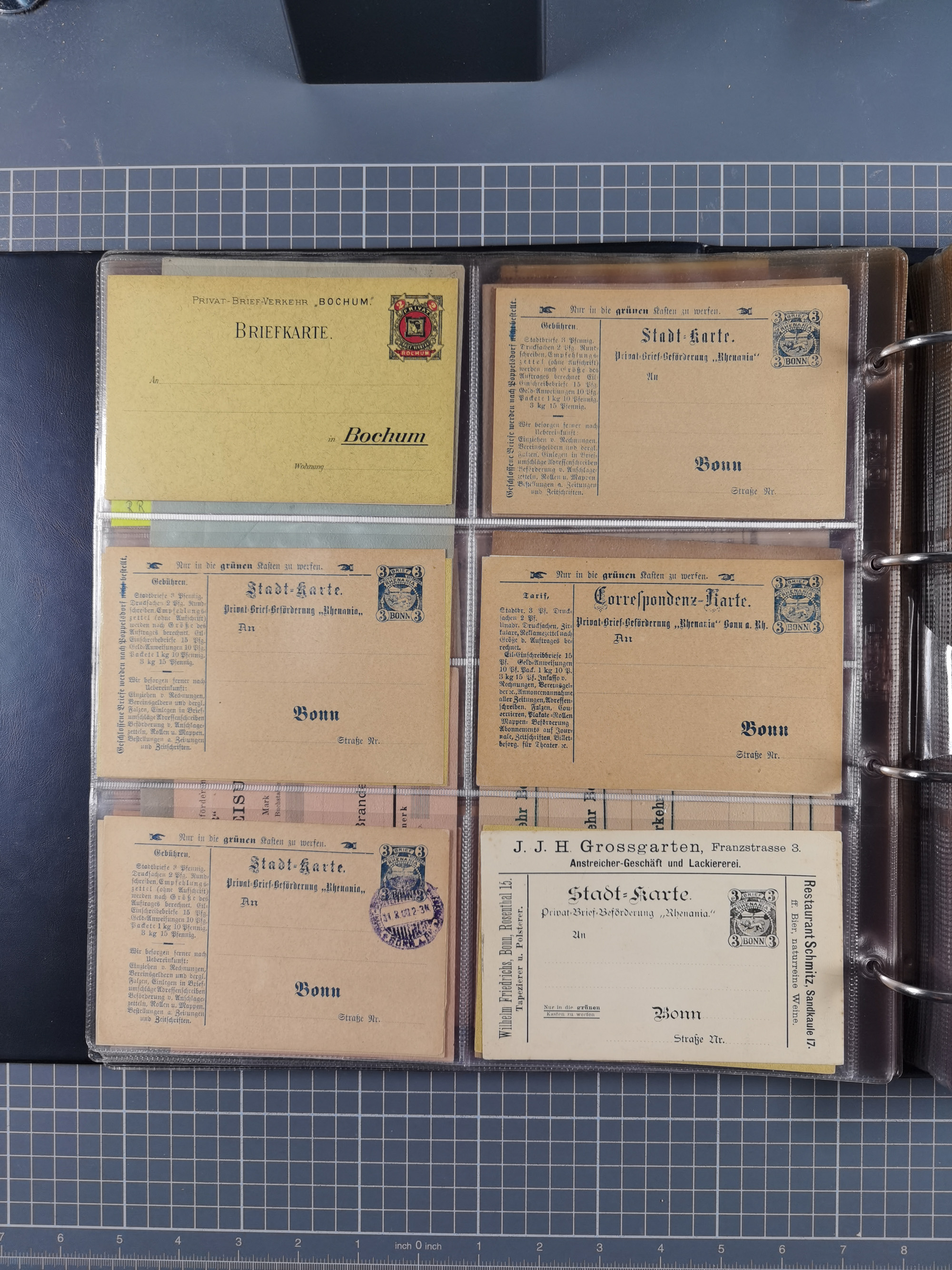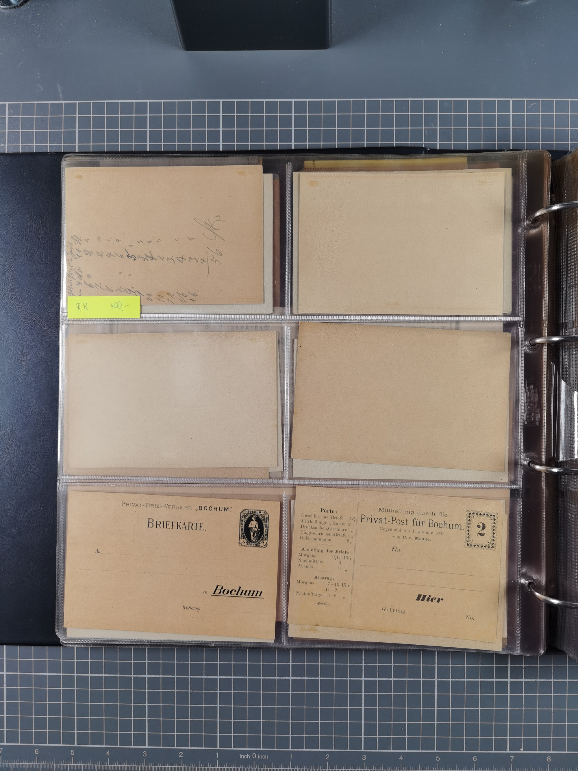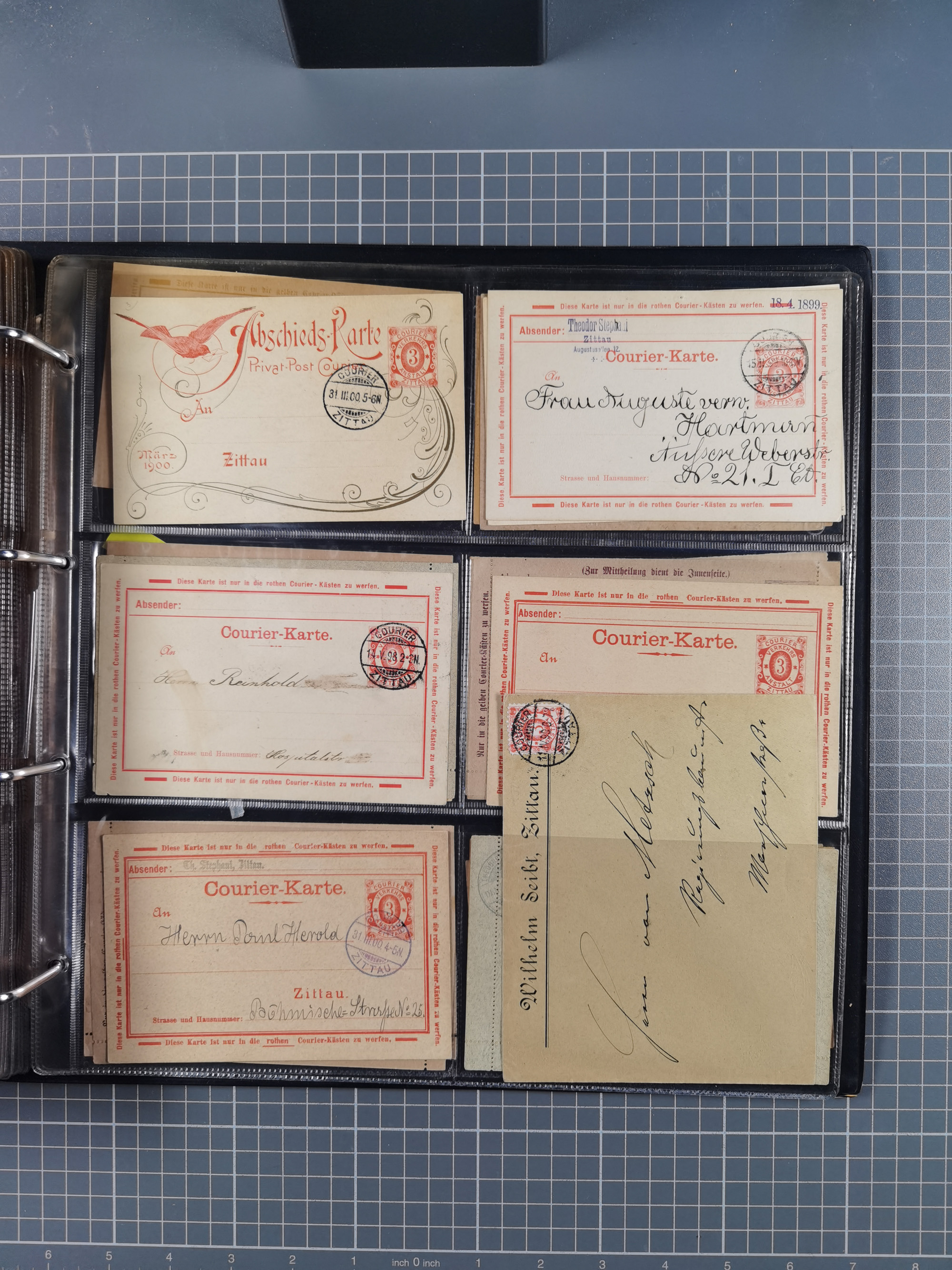 Auerbach bis Zittau: 1886/1900, umfangreiche Sammlung mit über 550 Briefen, Karten sowie ungebrauchten und gebrauchten Ganzsachen und einigen Formularen. Dabei u.a. Augsburg mit K3 gebraucht, Bamberg mit Mi.-Nr. 4 auf drei Briefen/Postkarten, Bonn mit Ganzsachen mit Firmen-Absendern, Dortmund mit P1 gebraucht (kleine Randfehler), Duisburg mit etwas fehlerhafter P2 gebraucht, Kassel Mi.-Nr. 14 auf Postkarte, Krefeld-Express-Beförderung Mi.-Nr. 5 auf Briefvorderseite, Mönchengladbach Courier Mi.-Nr. 4 auf Brief, Offenbach Privat-Post-Verkehr P1 gebraucht, Rostock K1 gebraucht, Worms K1 als Vorderseite gebraucht und Zittau P3 gebraucht mit Text. Die Erhaltung ist zum Teil leicht fehlerhaft, meist aber einwandfrei