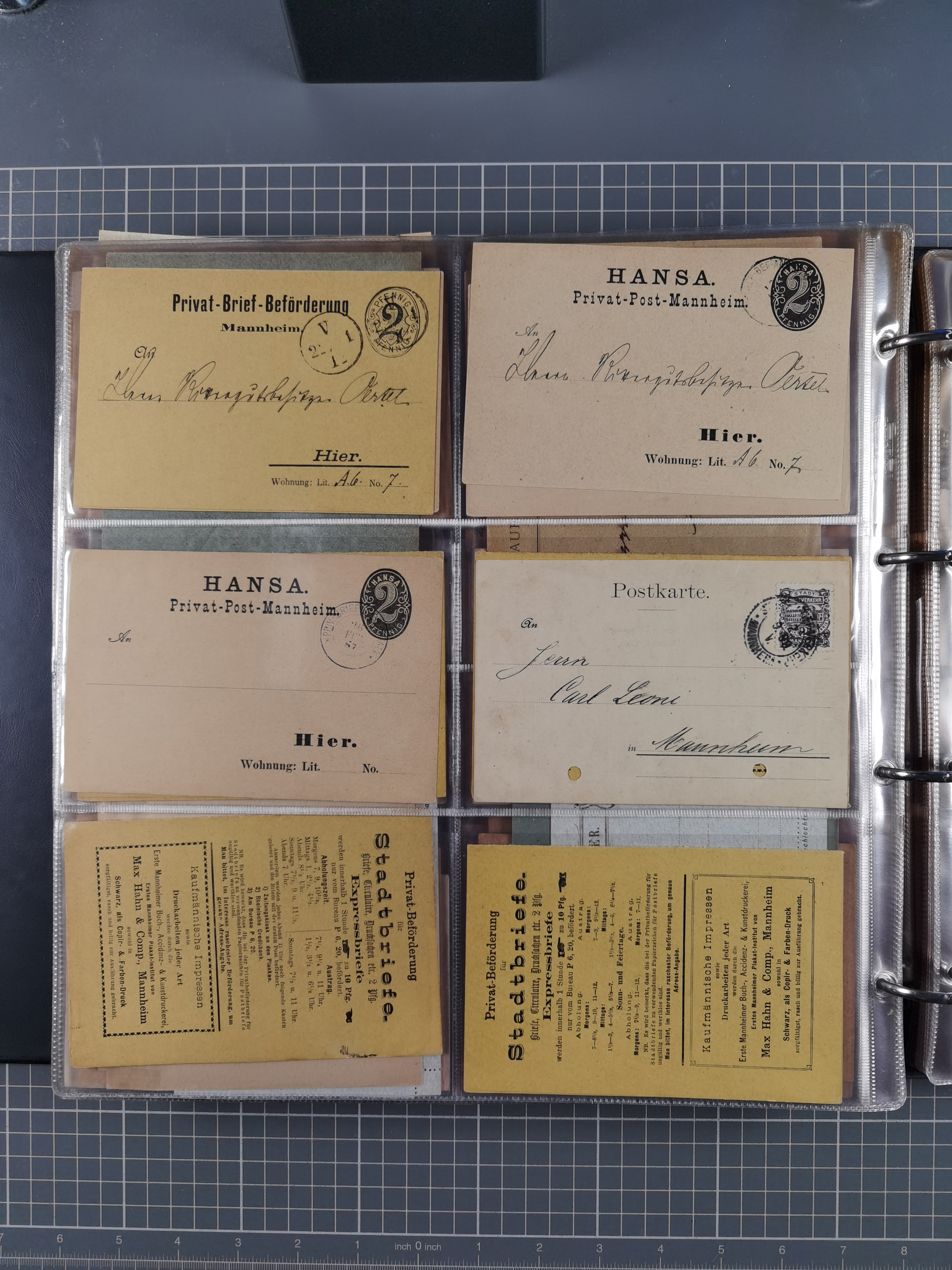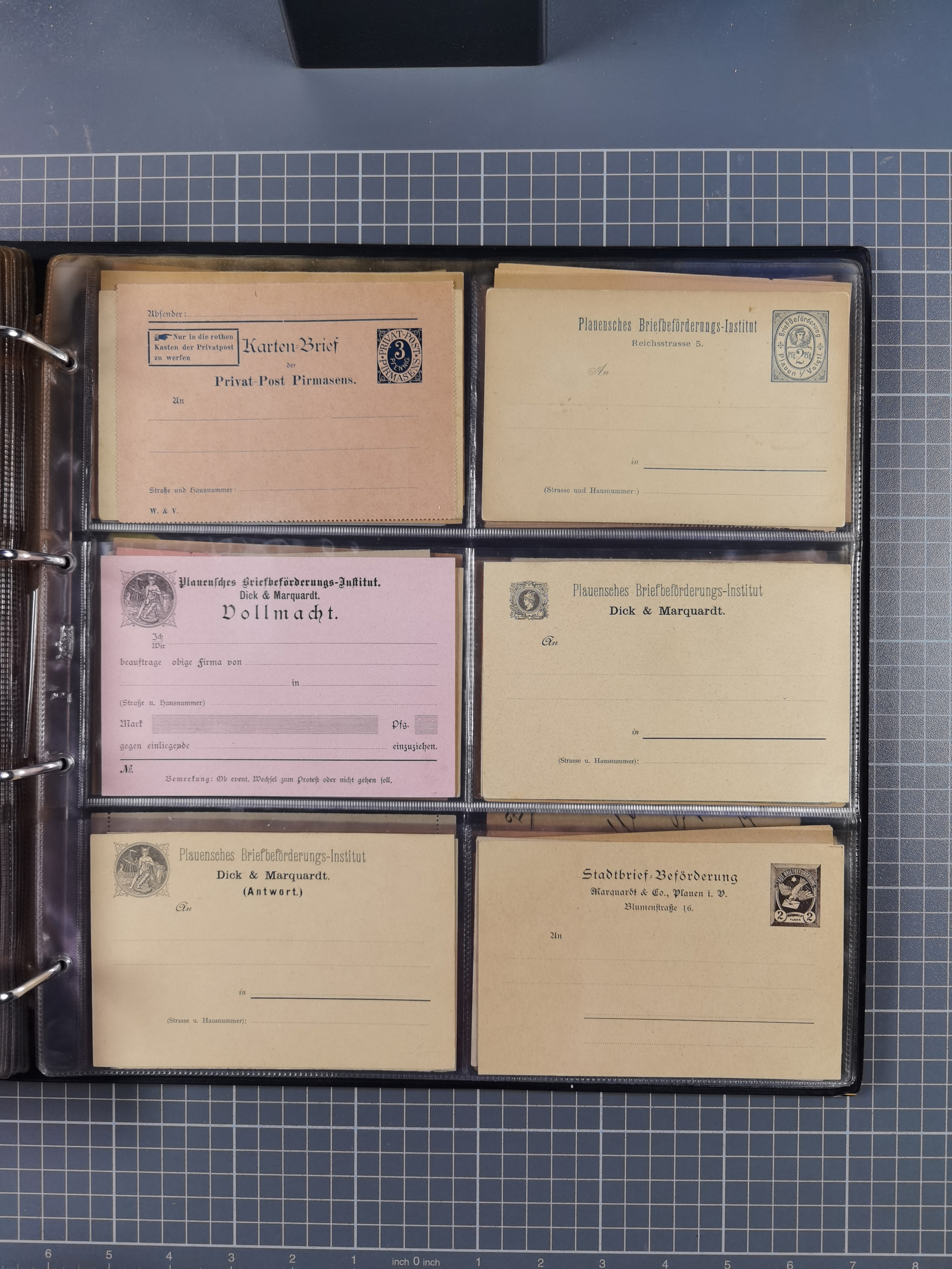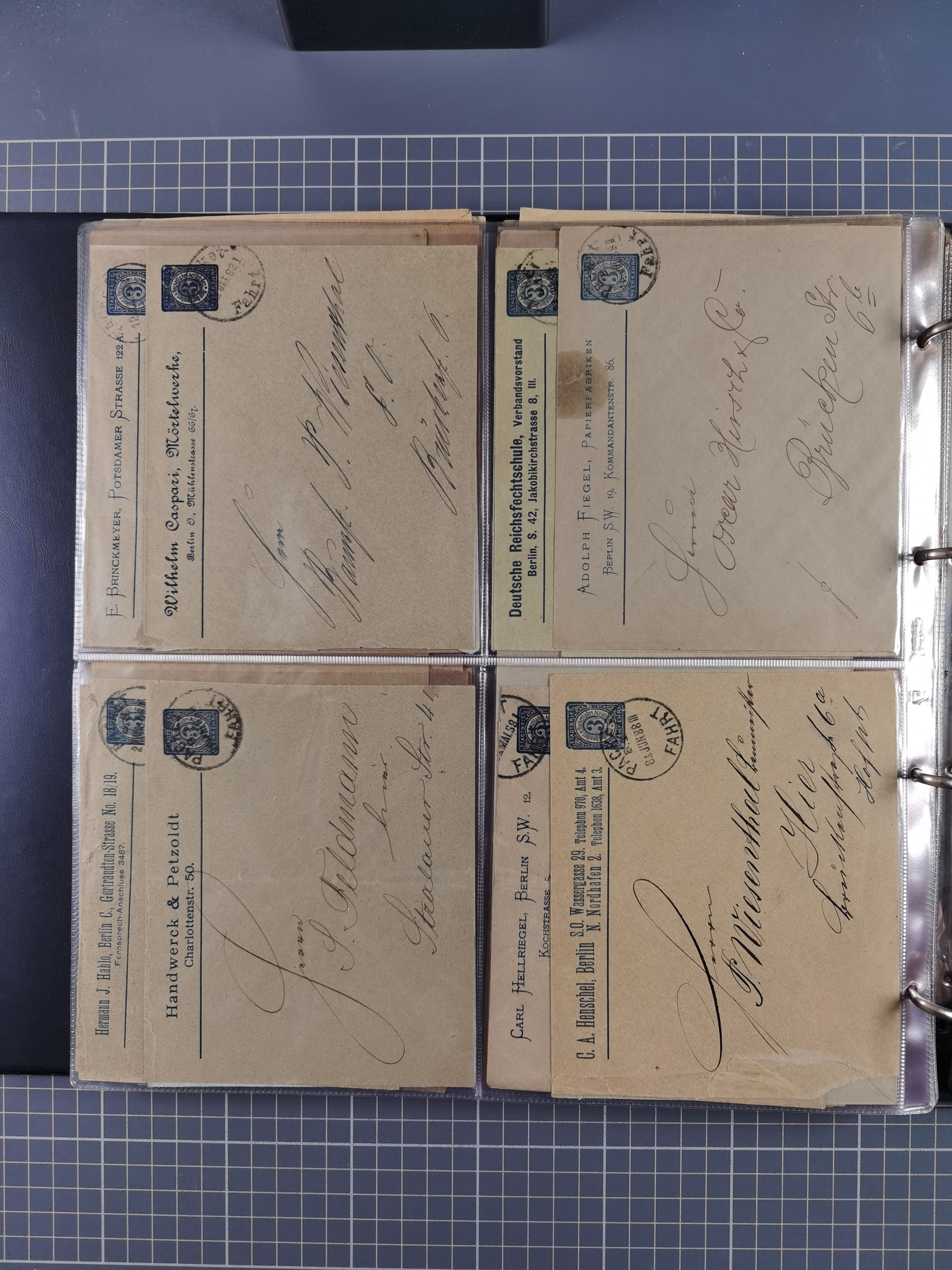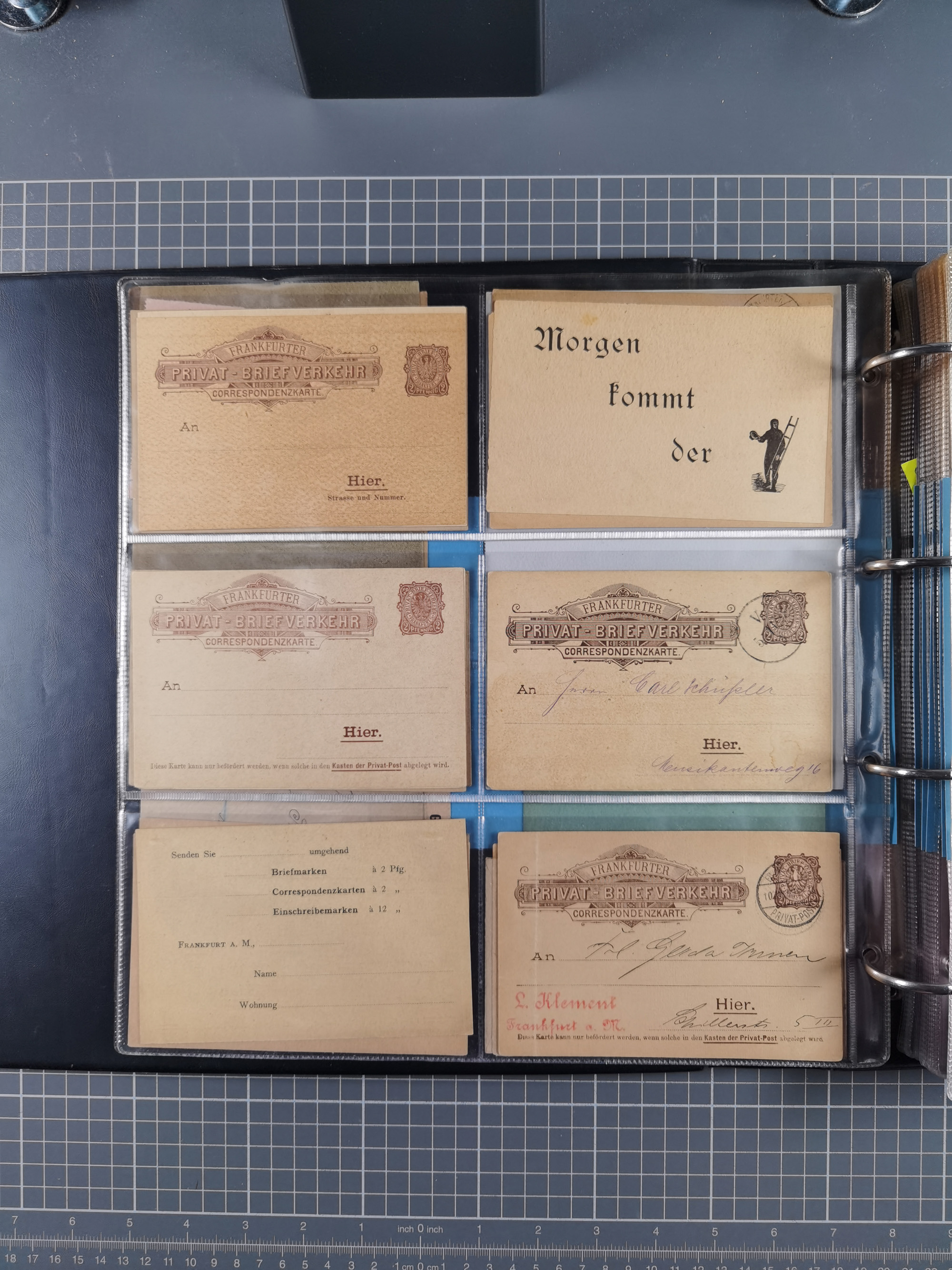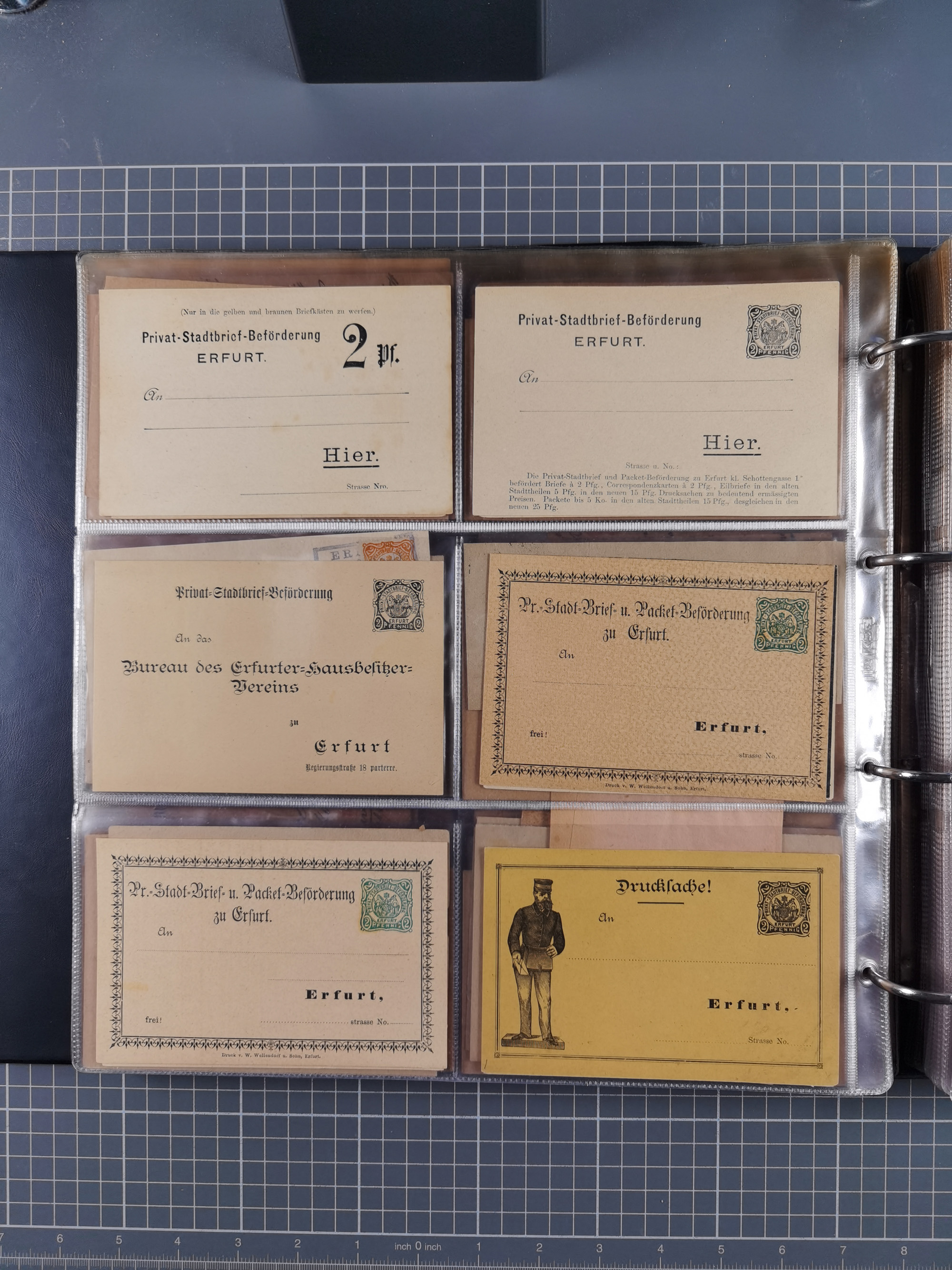 Auerbach bis Zittau: 1886/1900, umfangreiche Sammlung mit über 550 Briefen, Karten sowie ungebrauchten und gebrauchten Ganzsachen und einigen Formularen. Dabei u.a. Augsburg mit K3 gebraucht, Bamberg mit Mi.-Nr. 4 auf drei Briefen/Postkarten, Bonn mit Ganzsachen mit Firmen-Absendern, Dortmund mit P1 gebraucht (kleine Randfehler), Duisburg mit etwas fehlerhafter P2 gebraucht, Kassel Mi.-Nr. 14 auf Postkarte, Krefeld-Express-Beförderung Mi.-Nr. 5 auf Briefvorderseite, Mönchengladbach Courier Mi.-Nr. 4 auf Brief, Offenbach Privat-Post-Verkehr P1 gebraucht, Rostock K1 gebraucht, Worms K1 als Vorderseite gebraucht und Zittau P3 gebraucht mit Text. Die Erhaltung ist zum Teil leicht fehlerhaft, meist aber einwandfrei