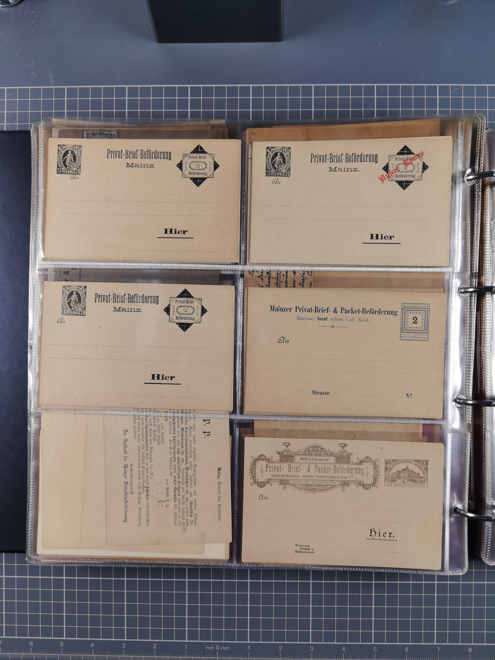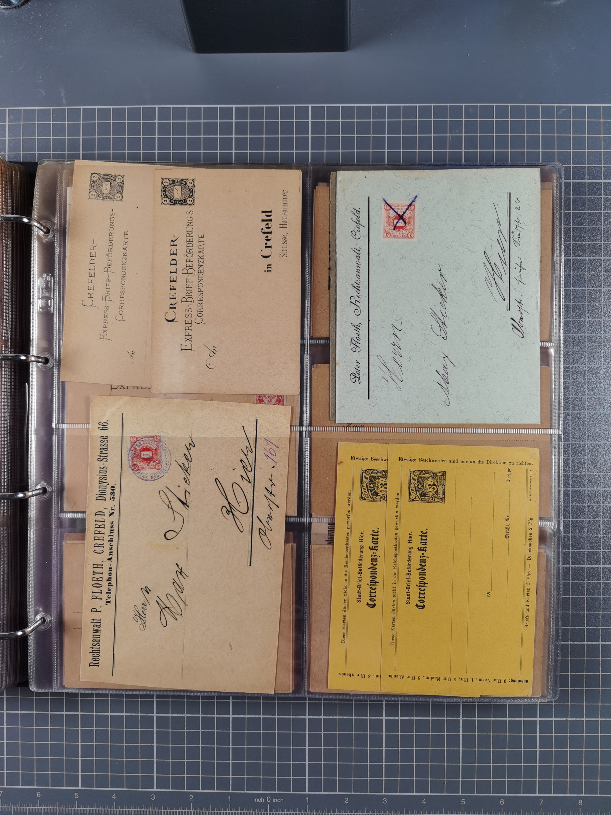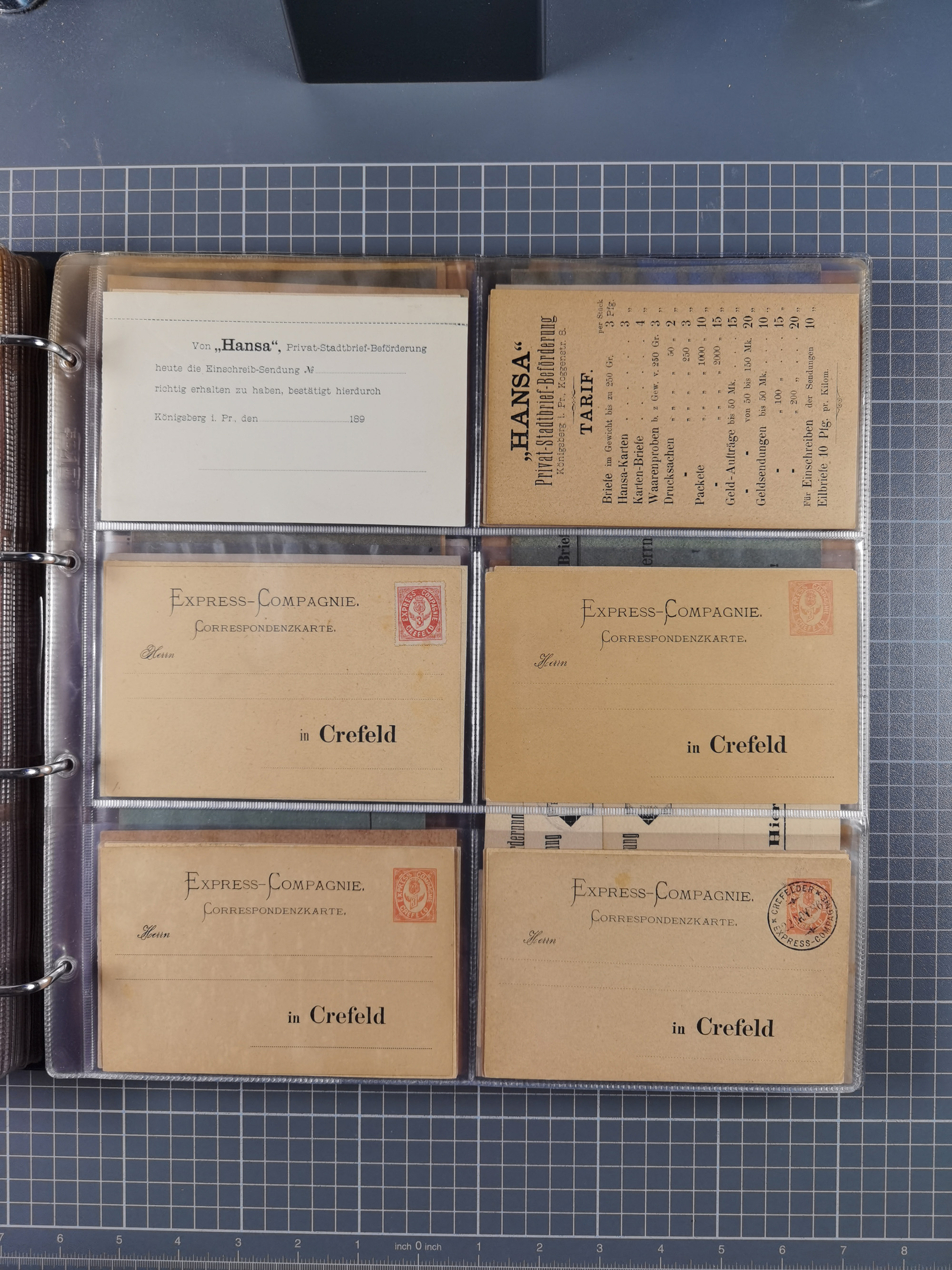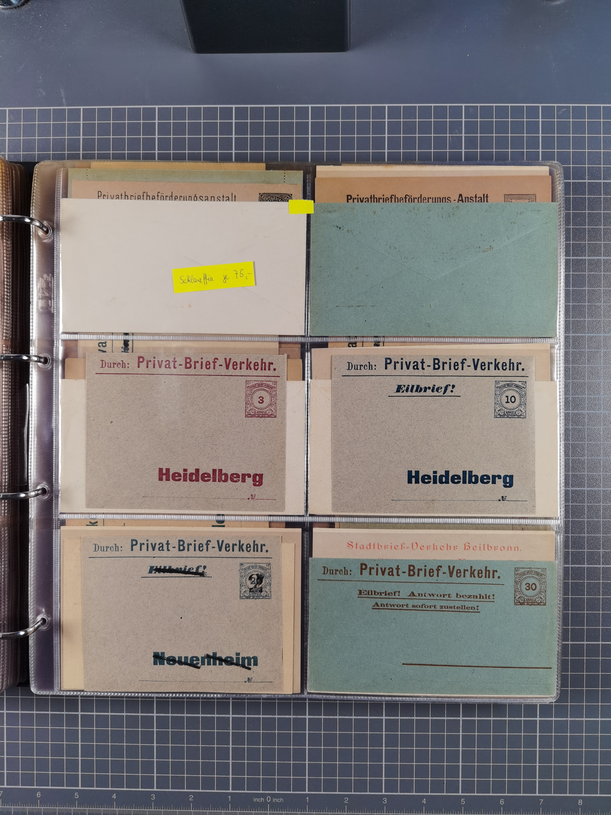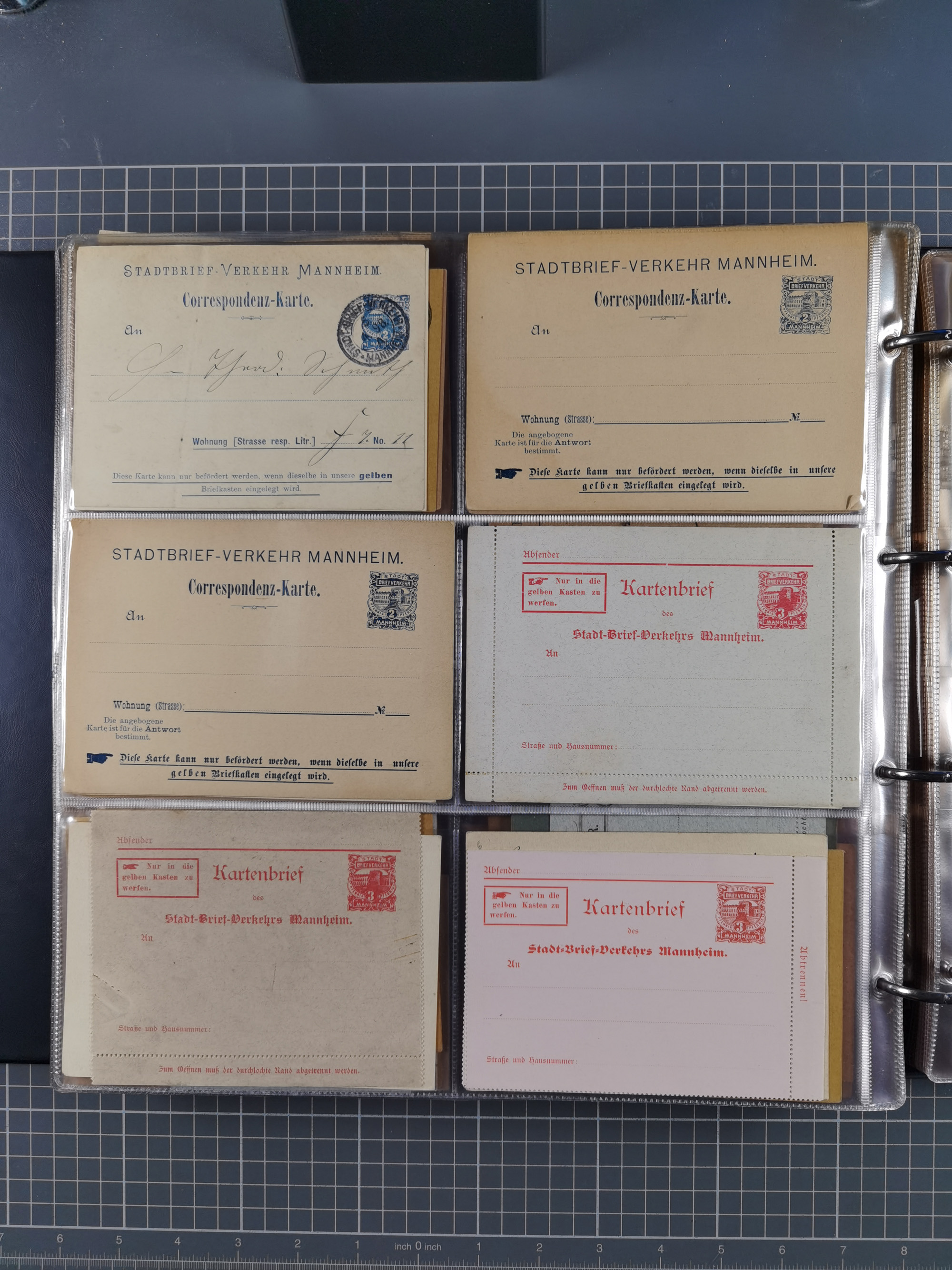 Auerbach bis Zittau: 1886/1900, umfangreiche Sammlung mit über 550 Briefen, Karten sowie ungebrauchten und gebrauchten Ganzsachen und einigen Formularen. Dabei u.a. Augsburg mit K3 gebraucht, Bamberg mit Mi.-Nr. 4 auf drei Briefen/Postkarten, Bonn mit Ganzsachen mit Firmen-Absendern, Dortmund mit P1 gebraucht (kleine Randfehler), Duisburg mit etwas fehlerhafter P2 gebraucht, Kassel Mi.-Nr. 14 auf Postkarte, Krefeld-Express-Beförderung Mi.-Nr. 5 auf Briefvorderseite, Mönchengladbach Courier Mi.-Nr. 4 auf Brief, Offenbach Privat-Post-Verkehr P1 gebraucht, Rostock K1 gebraucht, Worms K1 als Vorderseite gebraucht und Zittau P3 gebraucht mit Text. Die Erhaltung ist zum Teil leicht fehlerhaft, meist aber einwandfrei