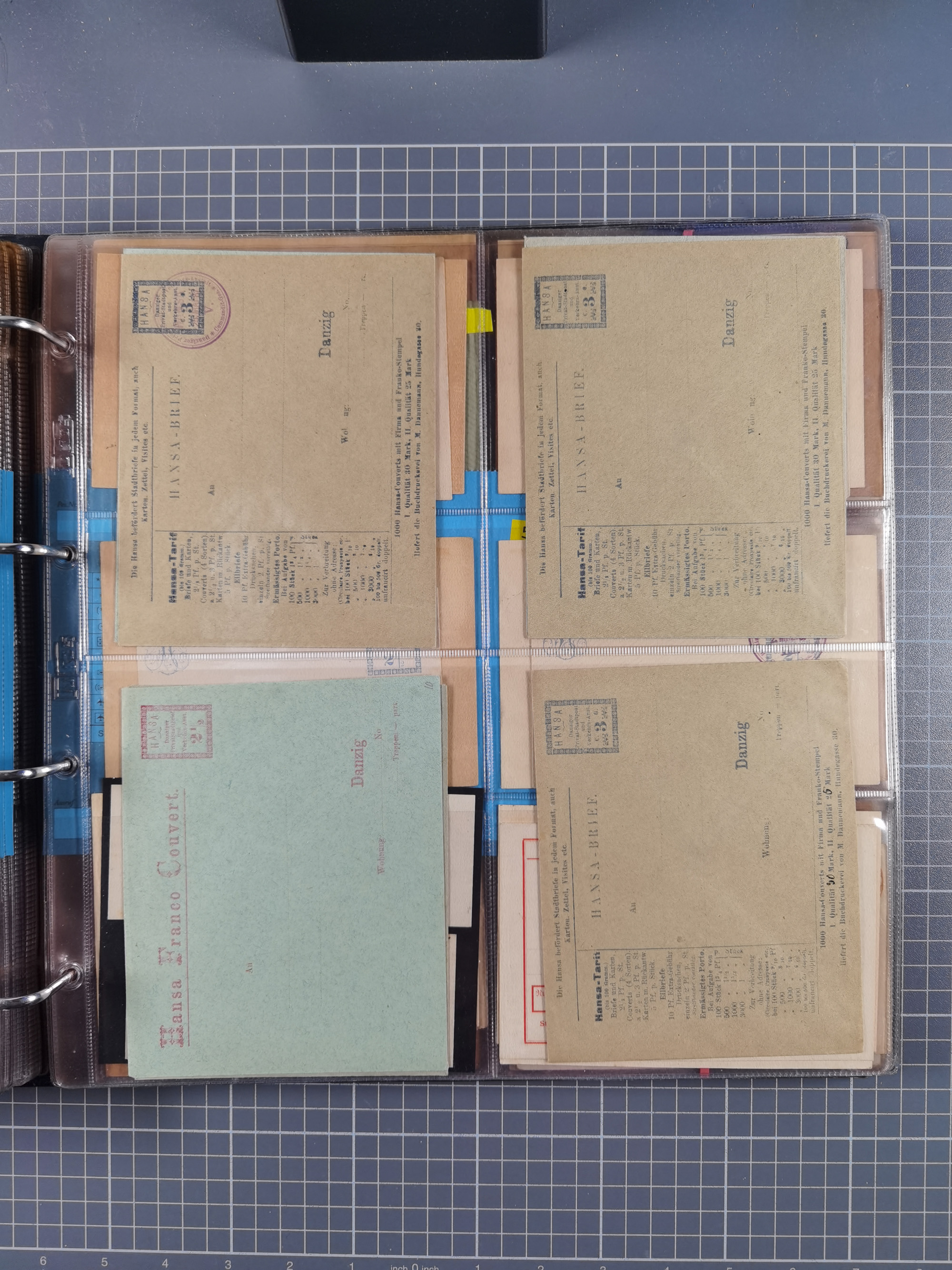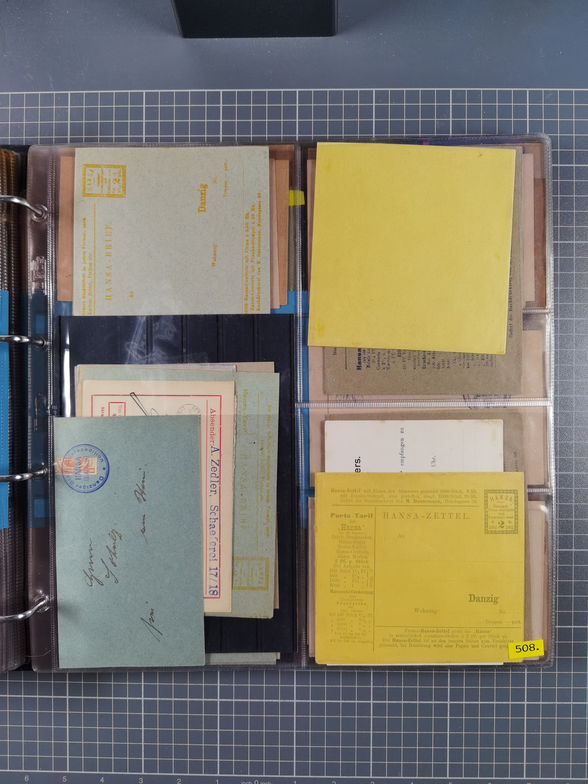 Danzig-Hansa: 1890, zwei Briefe, zwei Streifbänder und eine Reichspost-Anweisung als Postkarte mit Text, jeweils mit diversen Halbierungen und anderen Teilungen von Marken und Ganzsachen-Auschnitten. Ein Umschlag links stark fehlerhaft, alle Marken in einwandfreier Erhaltung (Mi.-Nr. 1-6H)