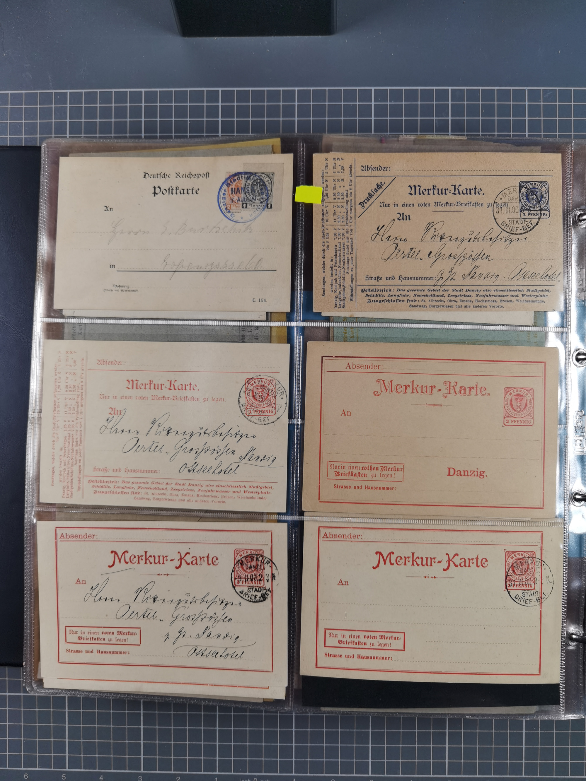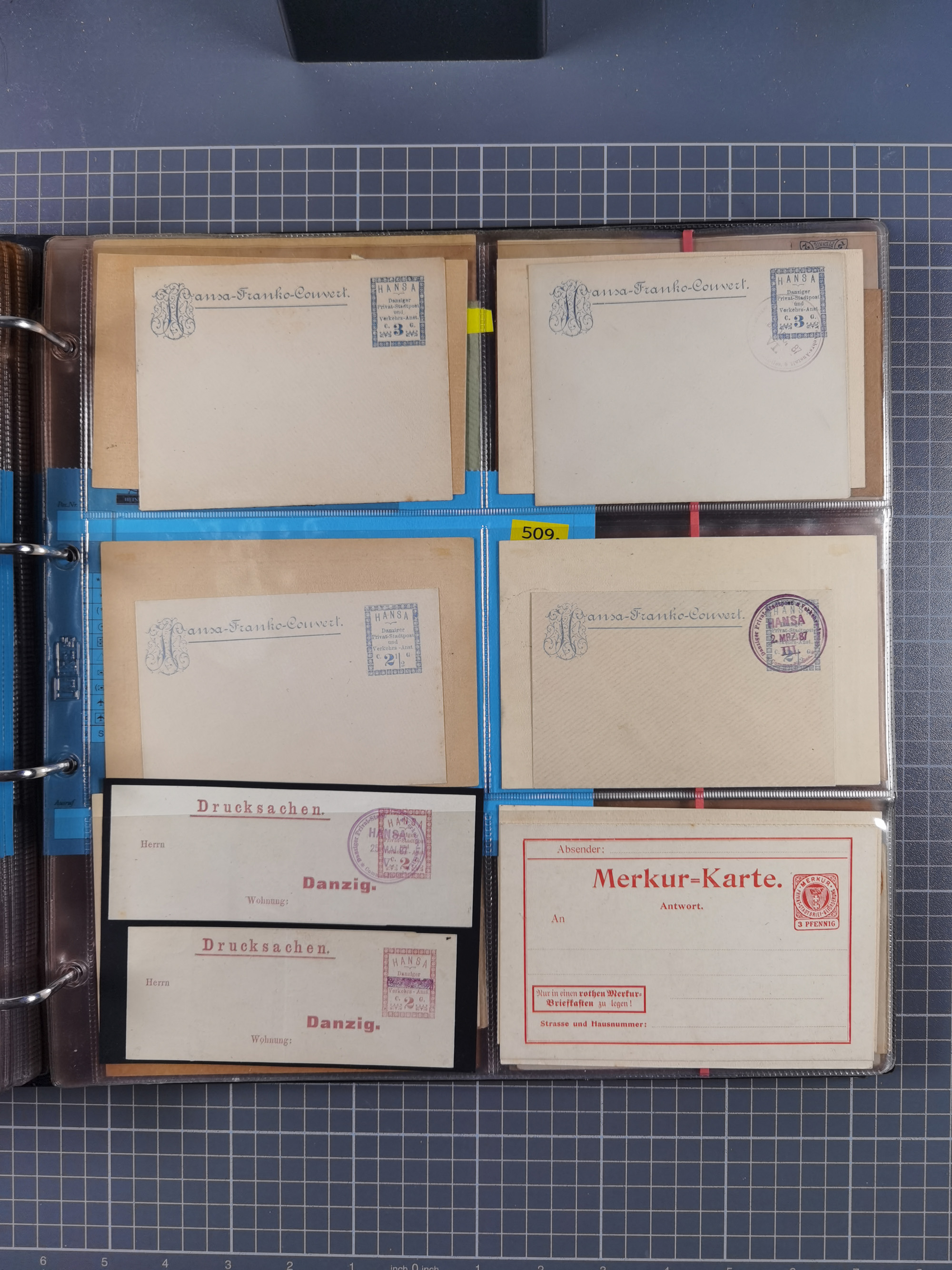 Danzig: 1886/1900, fast 40 Briefe und meist ungebrauchte und gebrauchte Ganzsachen der HANSA und COURIER/MERKUR. Dabei u.a. unfrankierter Umschlag mit blauem Stempel “Danziger Stadt-Briefspedition HANSA Franco” und Merkur P15 mit Controll-Stempel