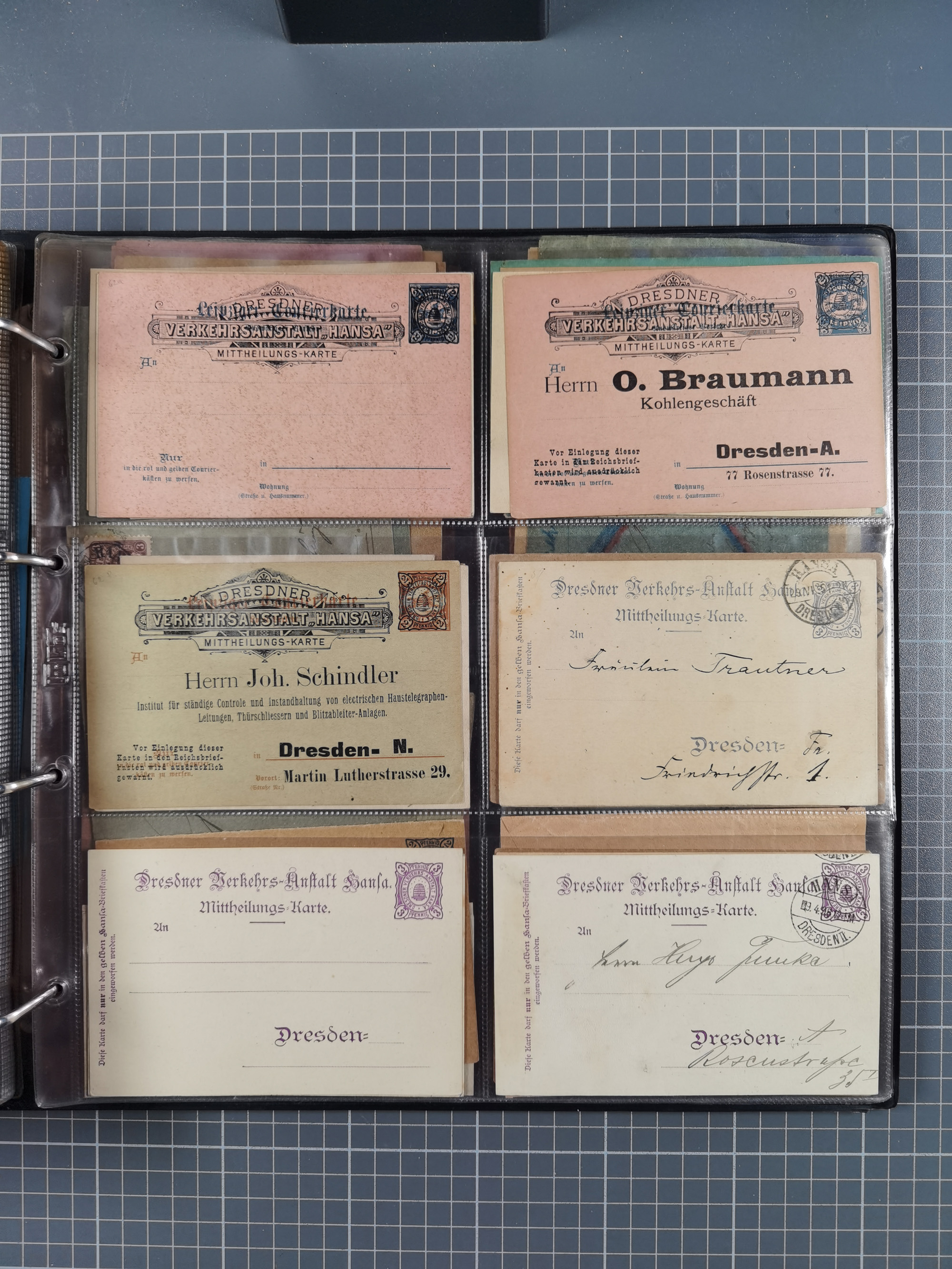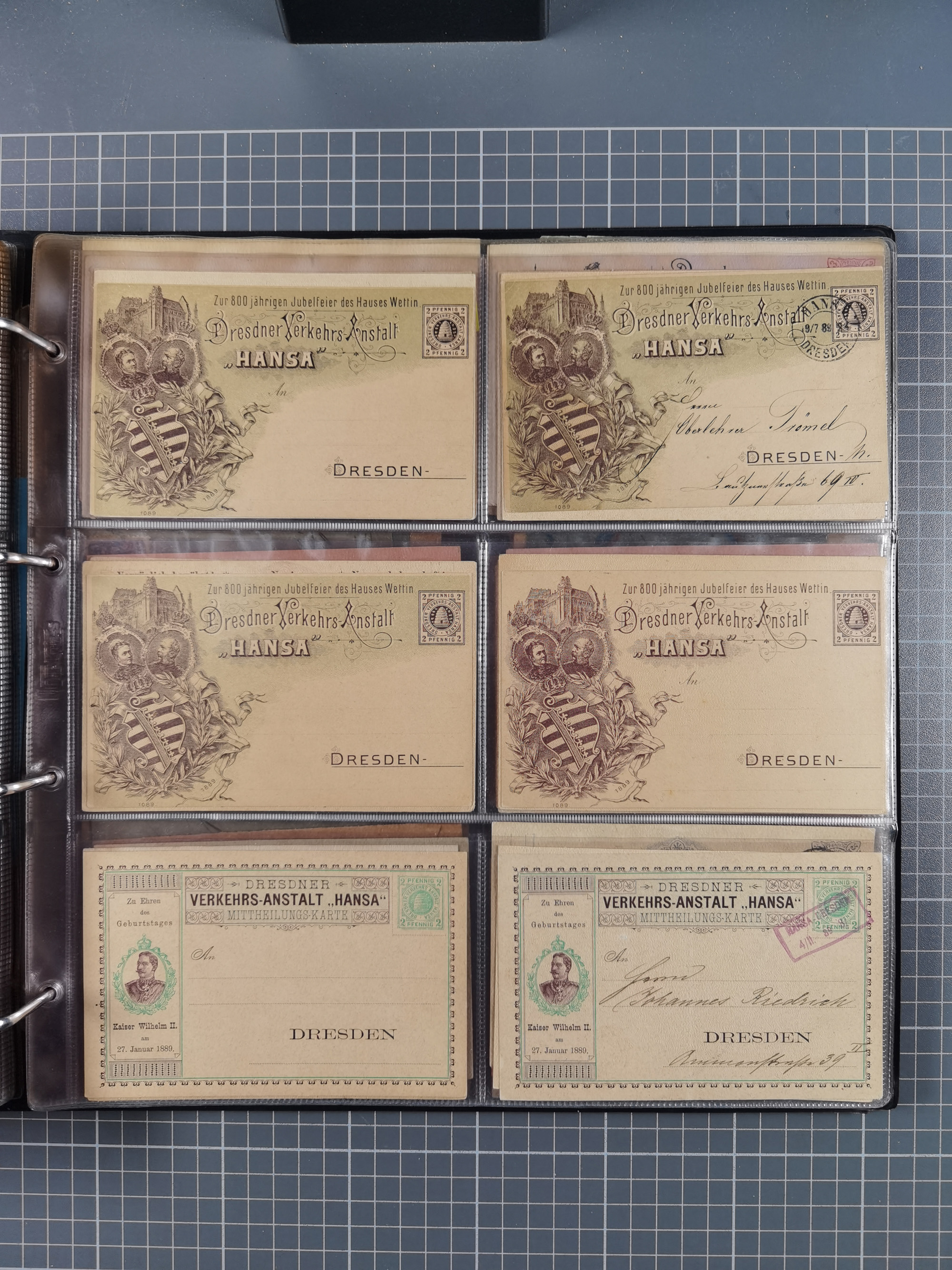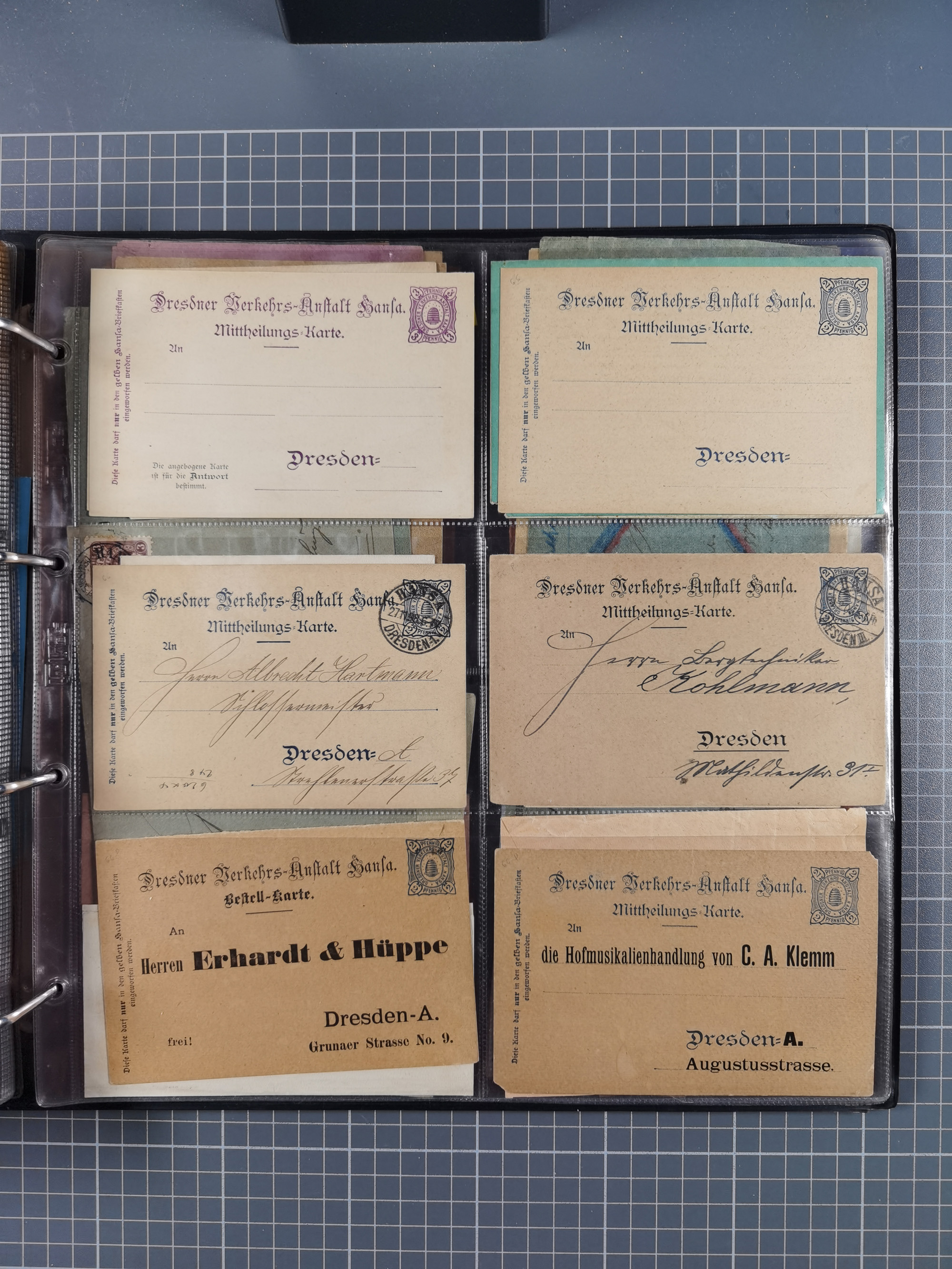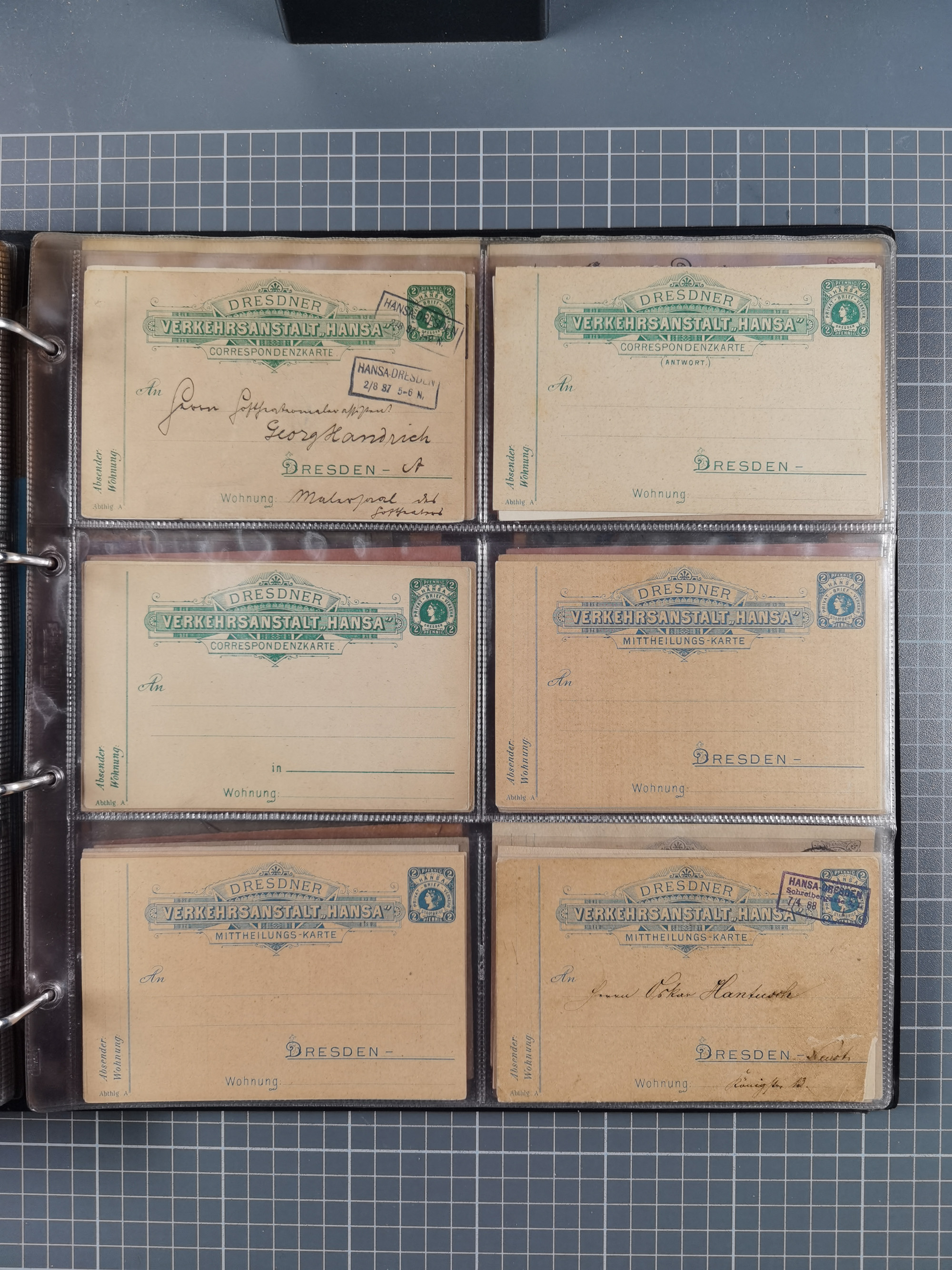 Dresden-Hansa: 1886/1900, Sammlung mit fast 160 Briefen, Karten und vielen ungebrauchten und gebrauchten Ganzsachen inkl. etwas Express-Compagnie. Dabei u.a. Firmen-Vordruckbrief mit violettem Rahmenstempel “HANSA-DRESDEN Scheibergsasse 2, I 17.12.87”, Mi.-Nr. 89 auf Brief-Vorderseite, Mi.-Nr. 92auf Umschlag, sechs ungebrauchte Karten ex P3-10 ungebraucht, P19 gebraucht, P23 ungebraucht, p61 gebraucht, 2x PF4 ungebraucht und PPF2 “Eberl-Bräu” ungebraucht