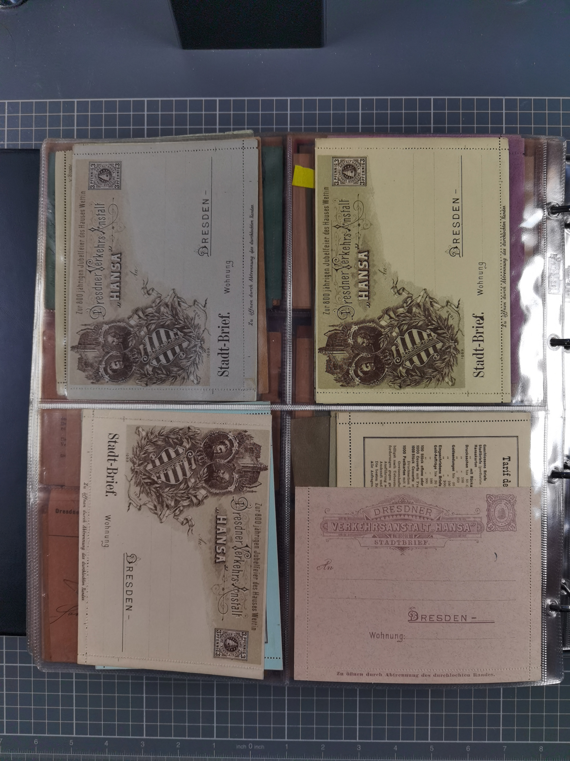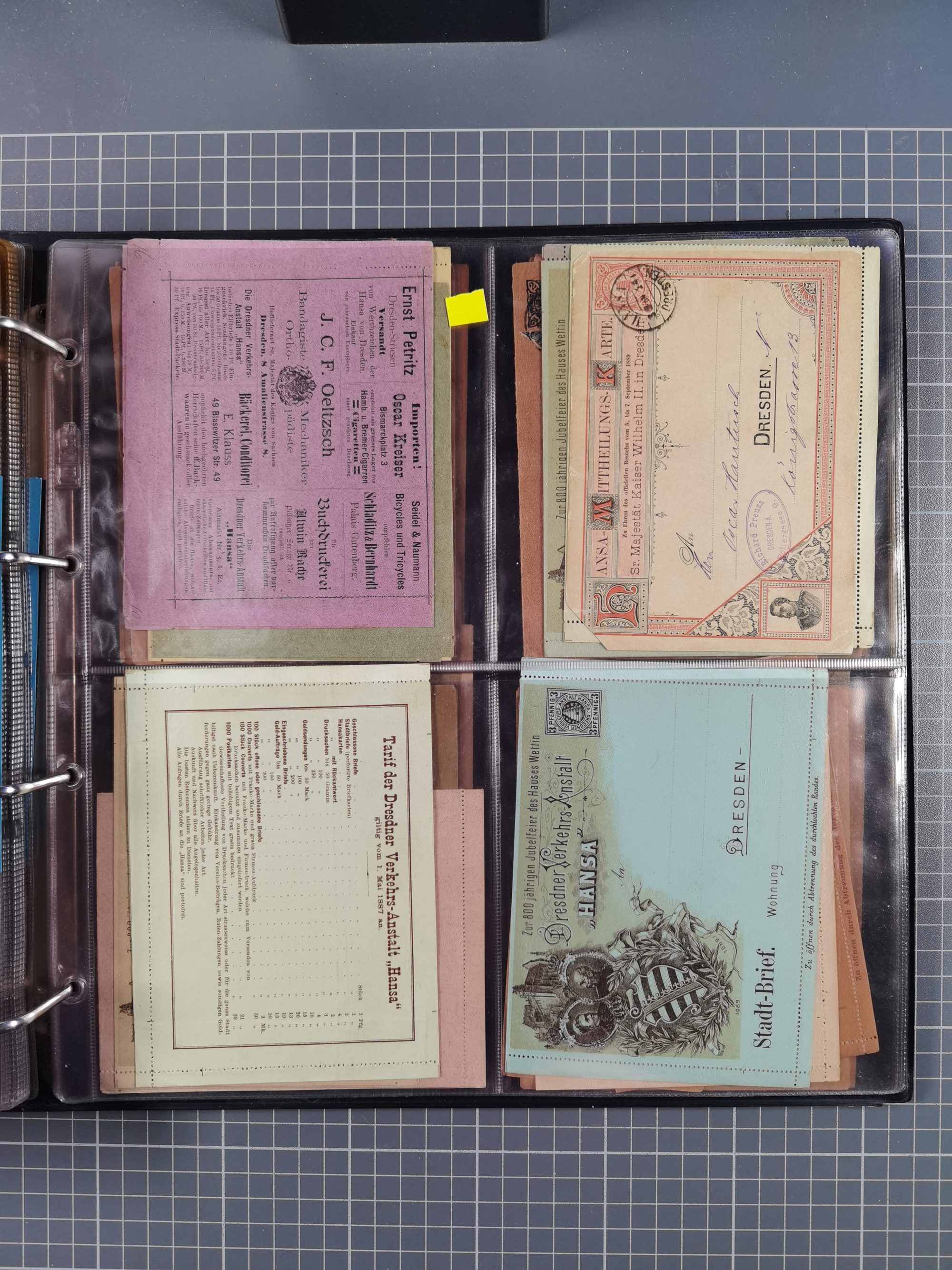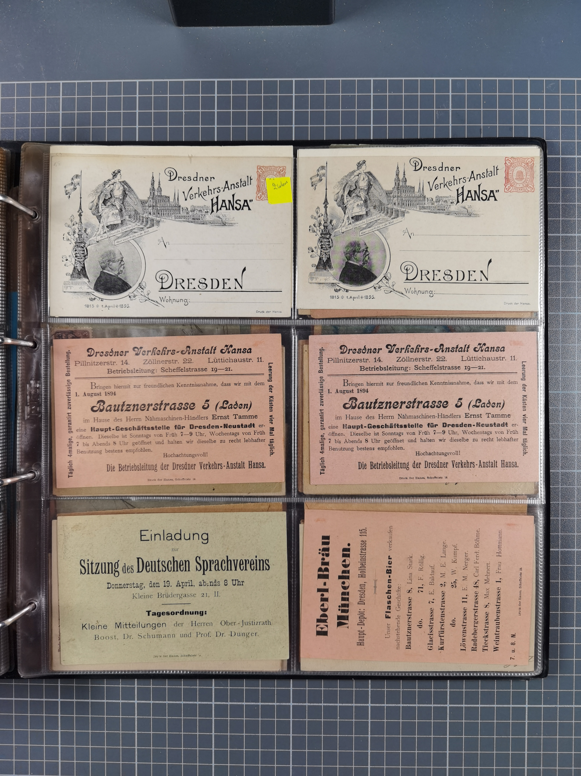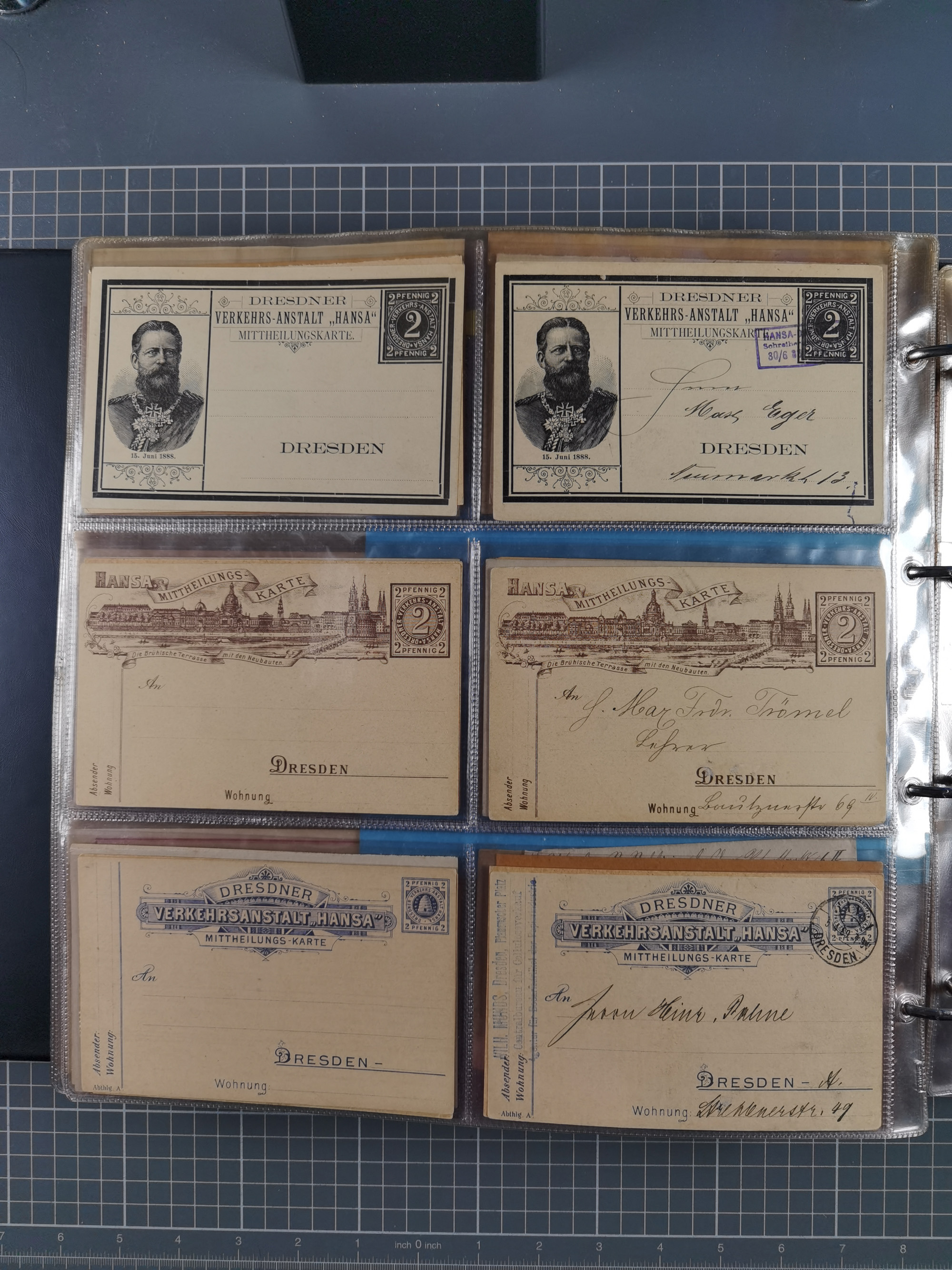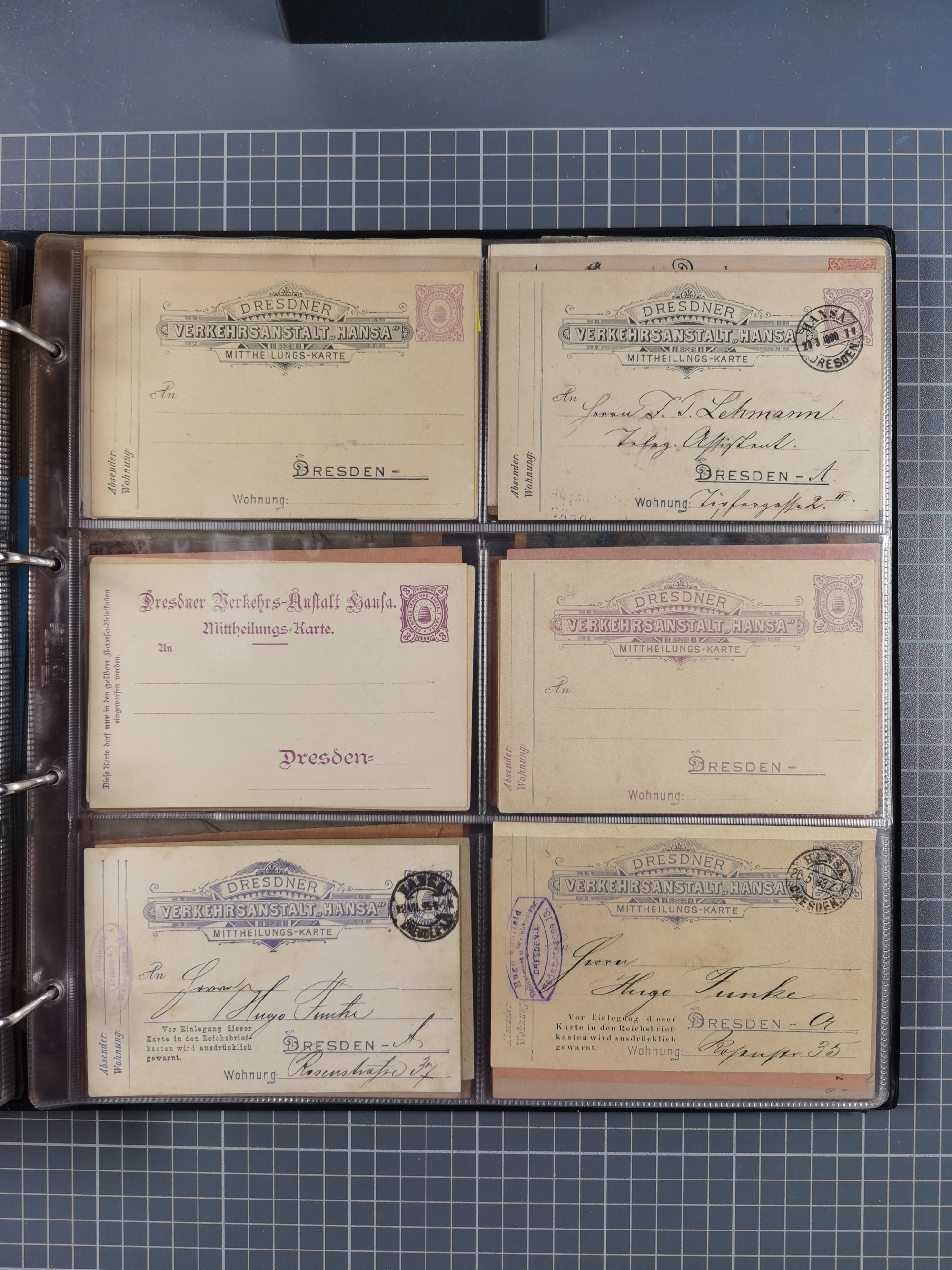 Dresden-Hansa: 1886/1900, Sammlung mit fast 160 Briefen, Karten und vielen ungebrauchten und gebrauchten Ganzsachen inkl. etwas Express-Compagnie. Dabei u.a. Firmen-Vordruckbrief mit violettem Rahmenstempel “HANSA-DRESDEN Scheibergsasse 2, I 17.12.87”, Mi.-Nr. 89 auf Brief-Vorderseite, Mi.-Nr. 92auf Umschlag, sechs ungebrauchte Karten ex P3-10 ungebraucht, P19 gebraucht, P23 ungebraucht, p61 gebraucht, 2x PF4 ungebraucht und PPF2 “Eberl-Bräu” ungebraucht