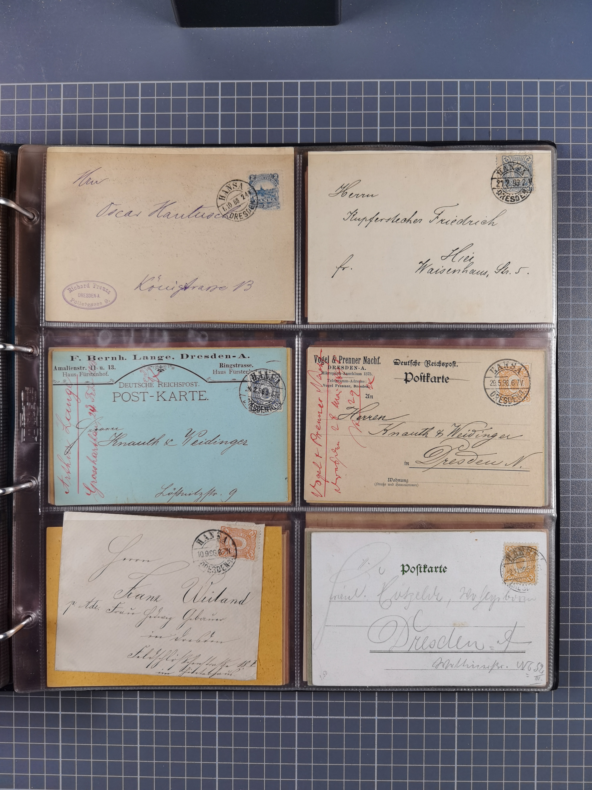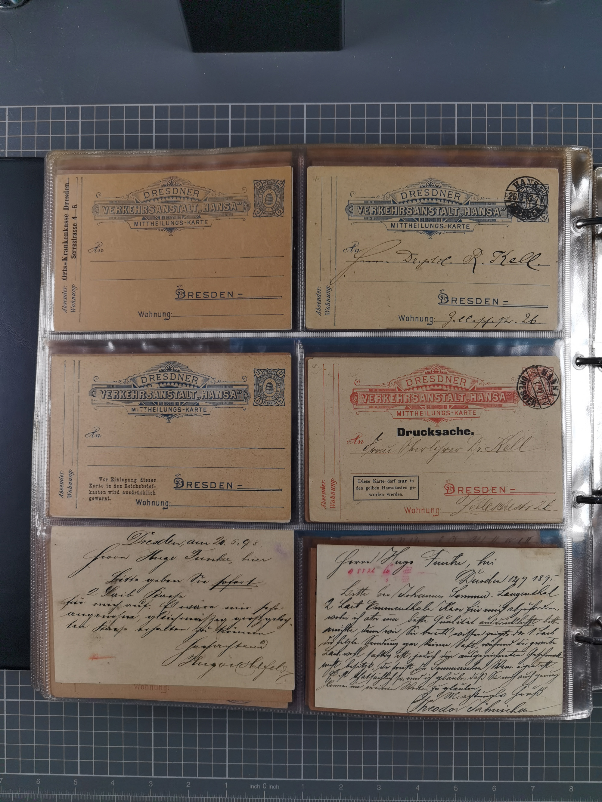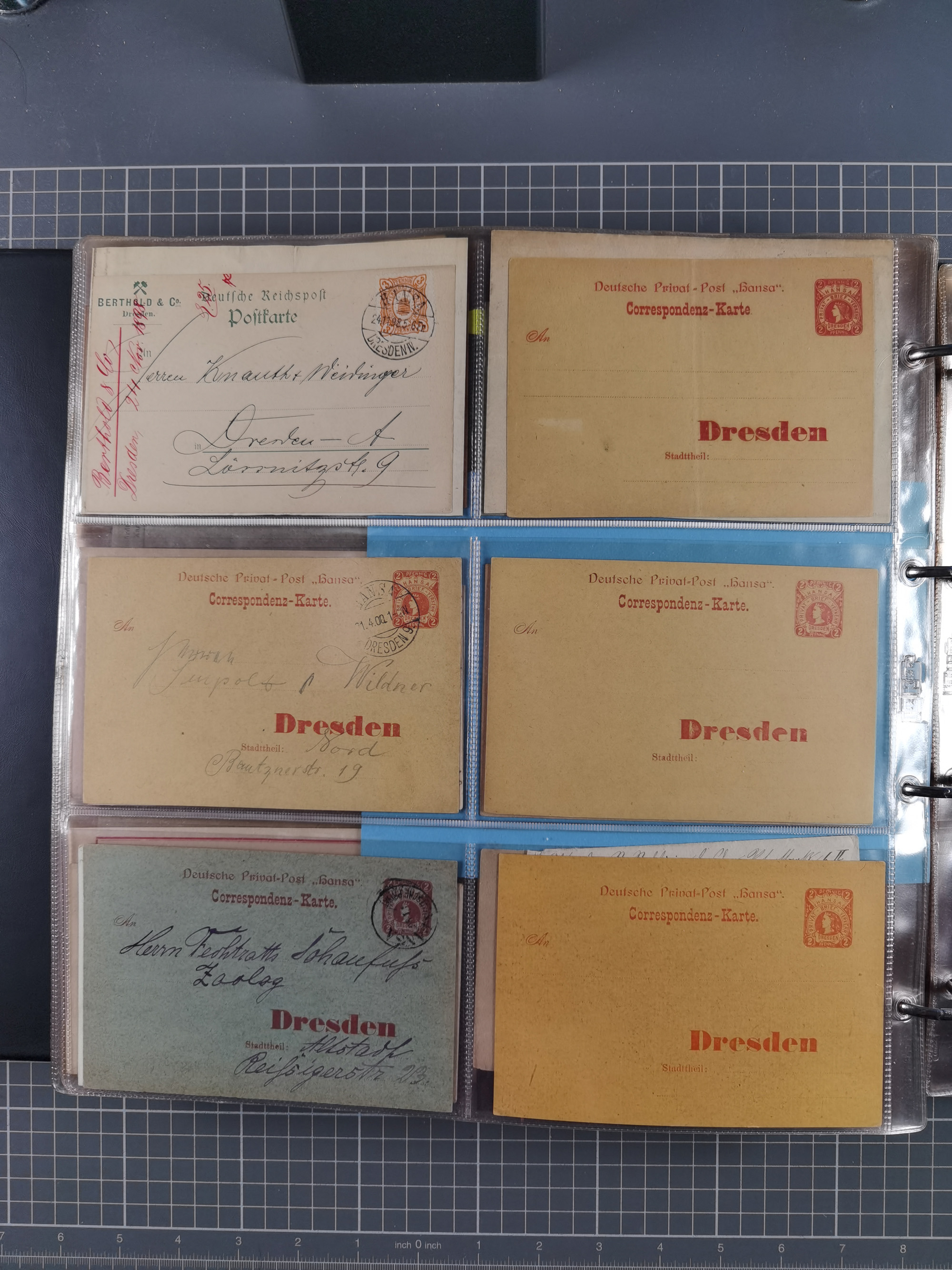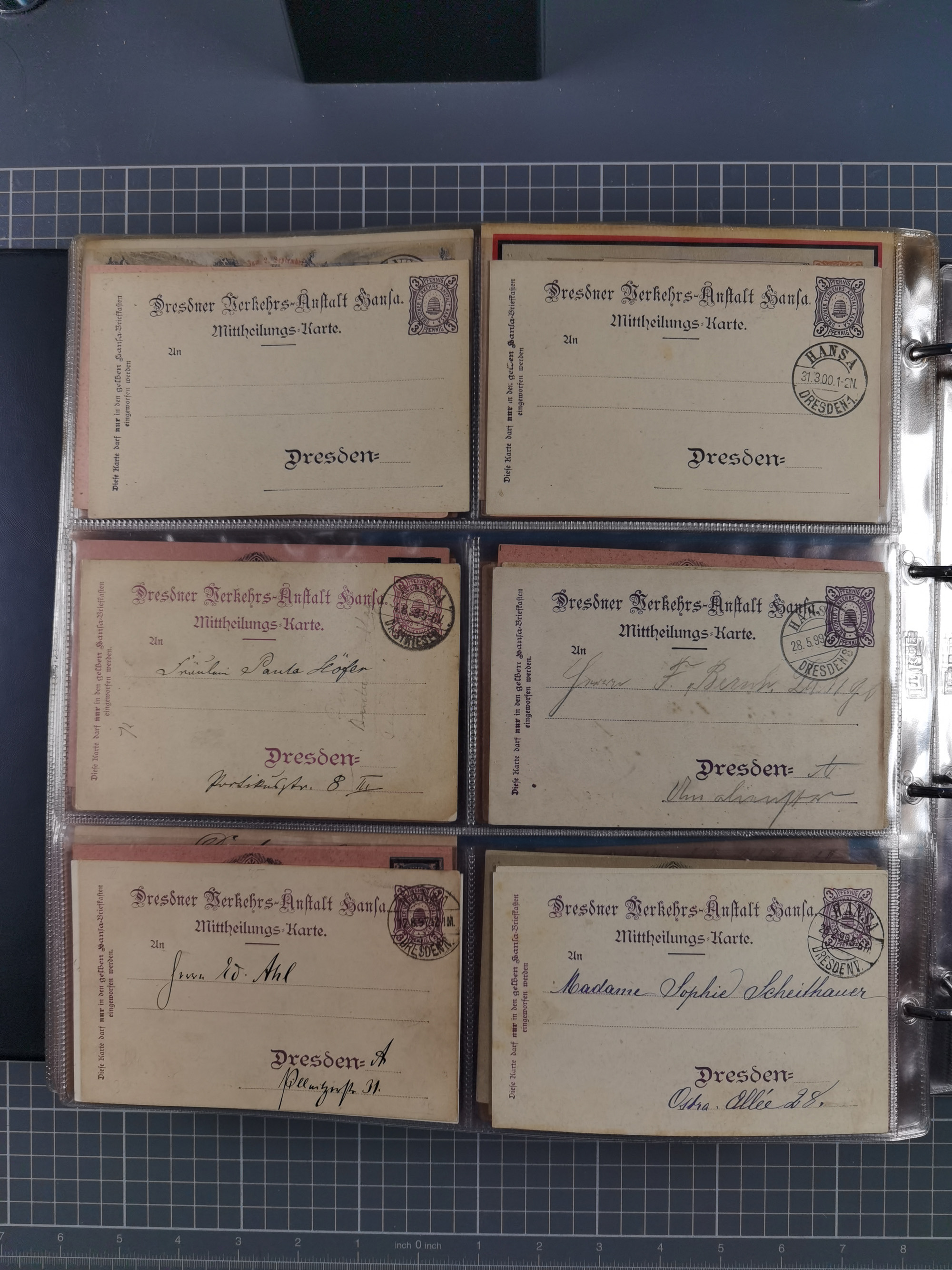 Dresden-Hansa: 1886/1900, Sammlung mit fast 160 Briefen, Karten und vielen ungebrauchten und gebrauchten Ganzsachen inkl. etwas Express-Compagnie. Dabei u.a. Firmen-Vordruckbrief mit violettem Rahmenstempel “HANSA-DRESDEN Scheibergsasse 2, I 17.12.87”, Mi.-Nr. 89 auf Brief-Vorderseite, Mi.-Nr. 92auf Umschlag, sechs ungebrauchte Karten ex P3-10 ungebraucht, P19 gebraucht, P23 ungebraucht, p61 gebraucht, 2x PF4 ungebraucht und PPF2 “Eberl-Bräu” ungebraucht