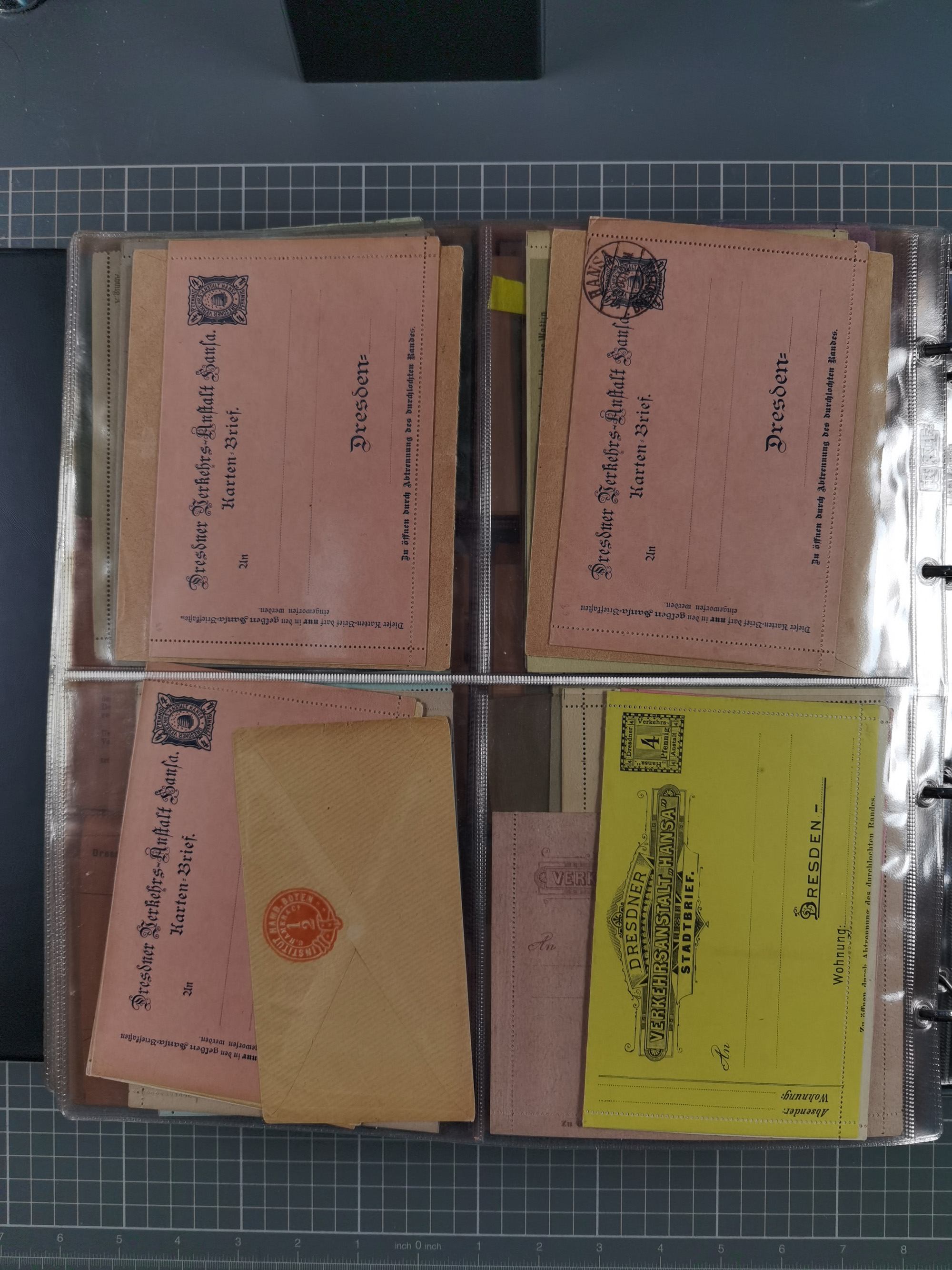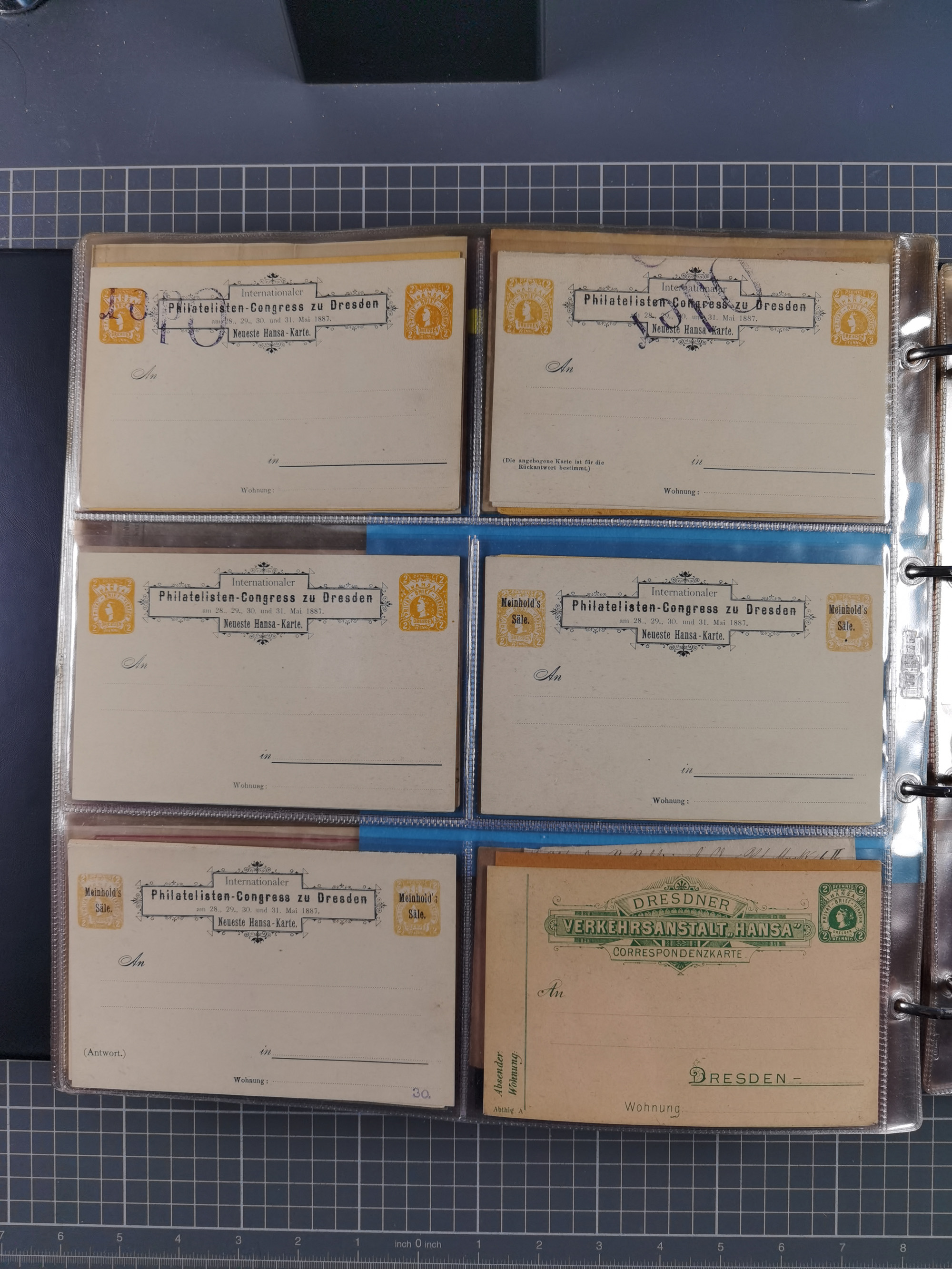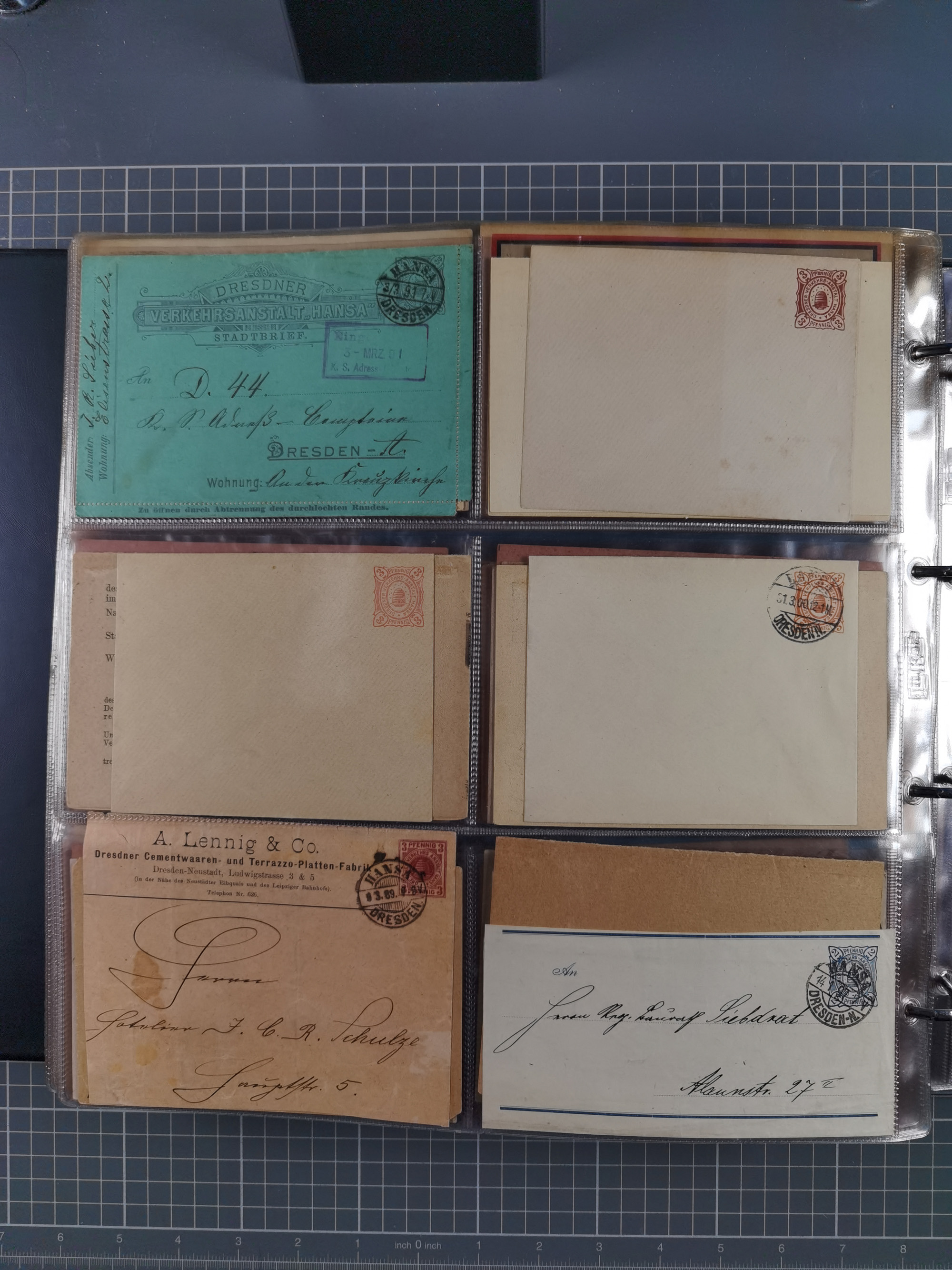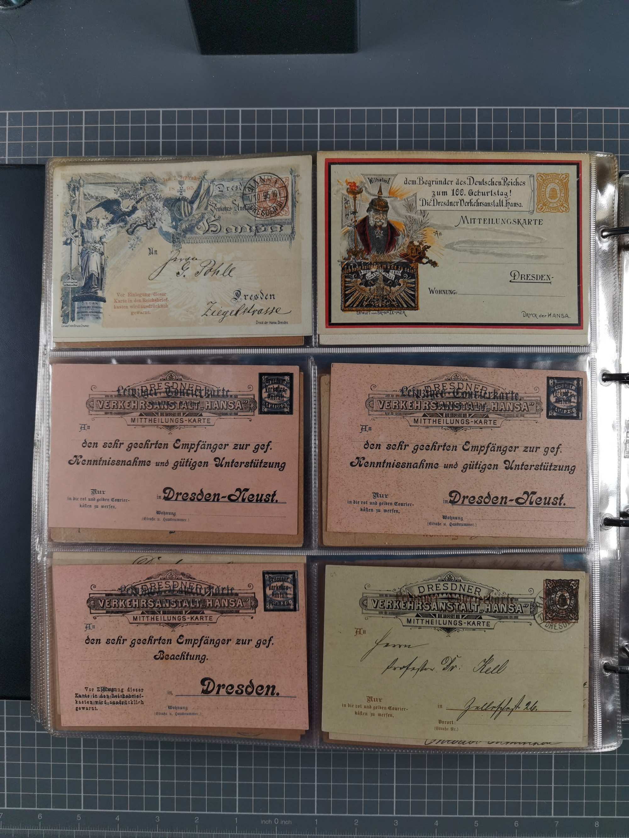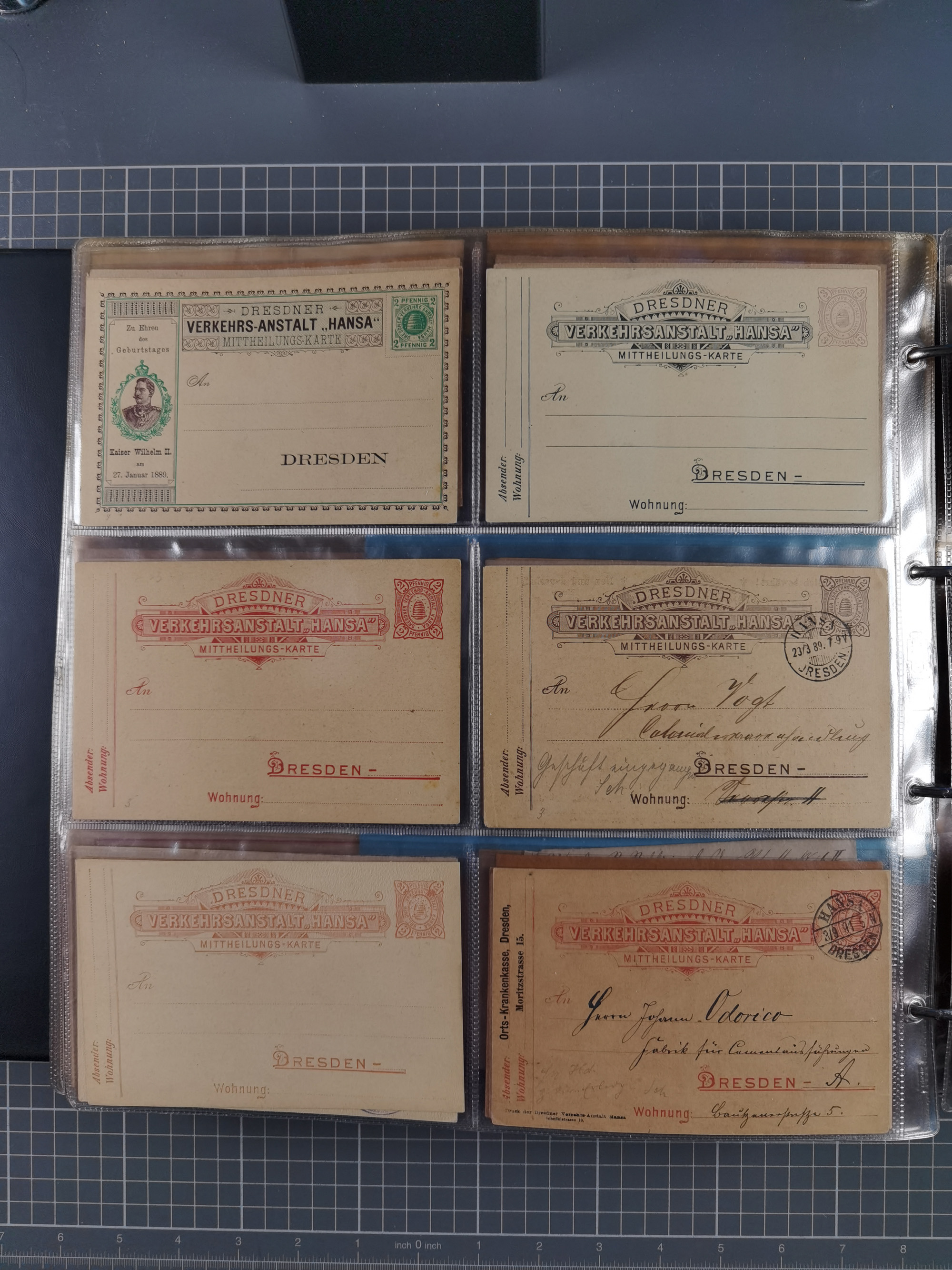 Dresden-Hansa: 1886/1900, Sammlung mit fast 160 Briefen, Karten und vielen ungebrauchten und gebrauchten Ganzsachen inkl. etwas Express-Compagnie. Dabei u.a. Firmen-Vordruckbrief mit violettem Rahmenstempel “HANSA-DRESDEN Scheibergsasse 2, I 17.12.87”, Mi.-Nr. 89 auf Brief-Vorderseite, Mi.-Nr. 92auf Umschlag, sechs ungebrauchte Karten ex P3-10 ungebraucht, P19 gebraucht, P23 ungebraucht, p61 gebraucht, 2x PF4 ungebraucht und PPF2 “Eberl-Bräu” ungebraucht