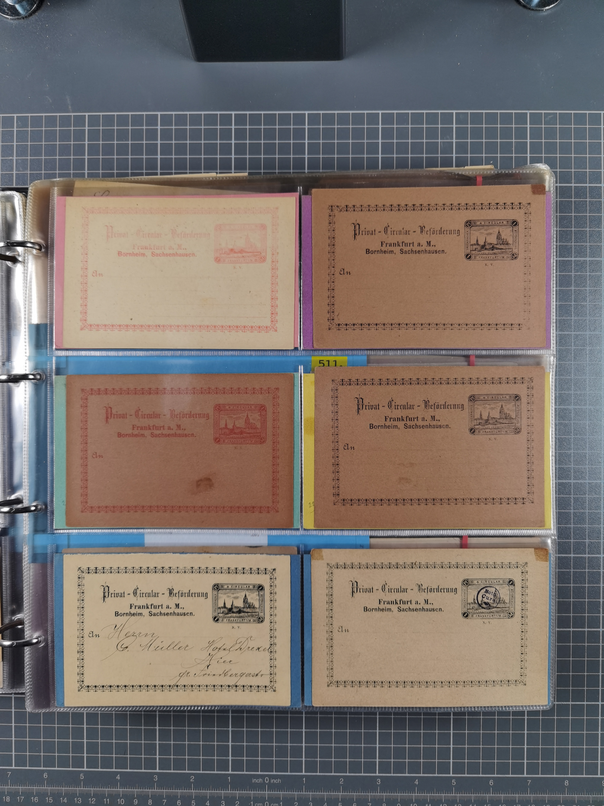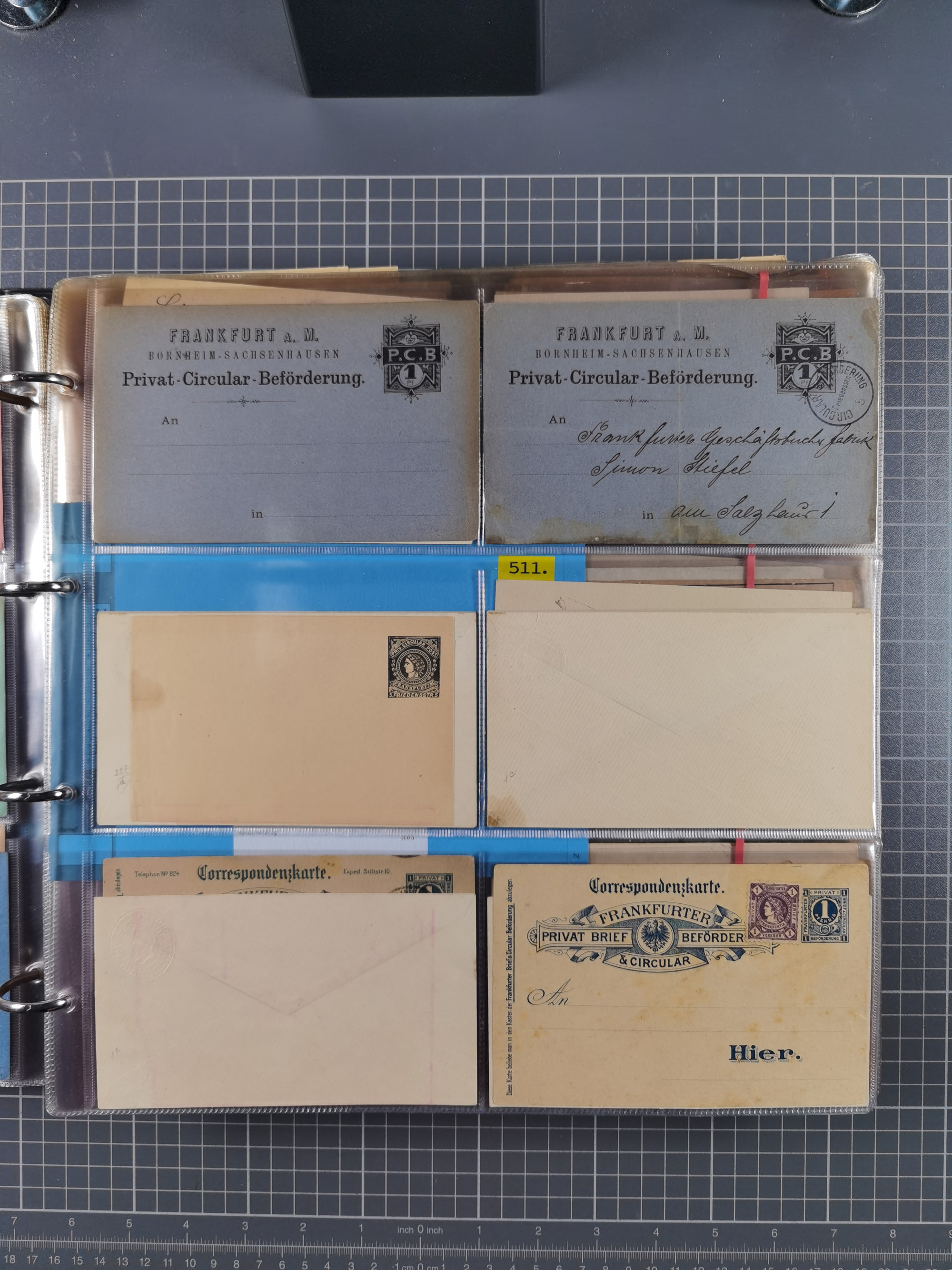 Frankfurt: 1886/1900, fast 90 Briefe und ungebrauchte/gebrauchte Ganzsachen von fast allen Anstalten in Frankfurt. Dabei Stadt-Brief-Verkehr mit u.a. Mi.-Nr. 1 mit rotem Stempel auf Postkarte, Mi.-Nr. 13 auf Karte und P15 gebraucht, Drucksachen & Circular 2x U1 gebraucht und PU2 gebraucht und Frankfurter Privat-Brief & Circular-Beförderung P1 gebraucht