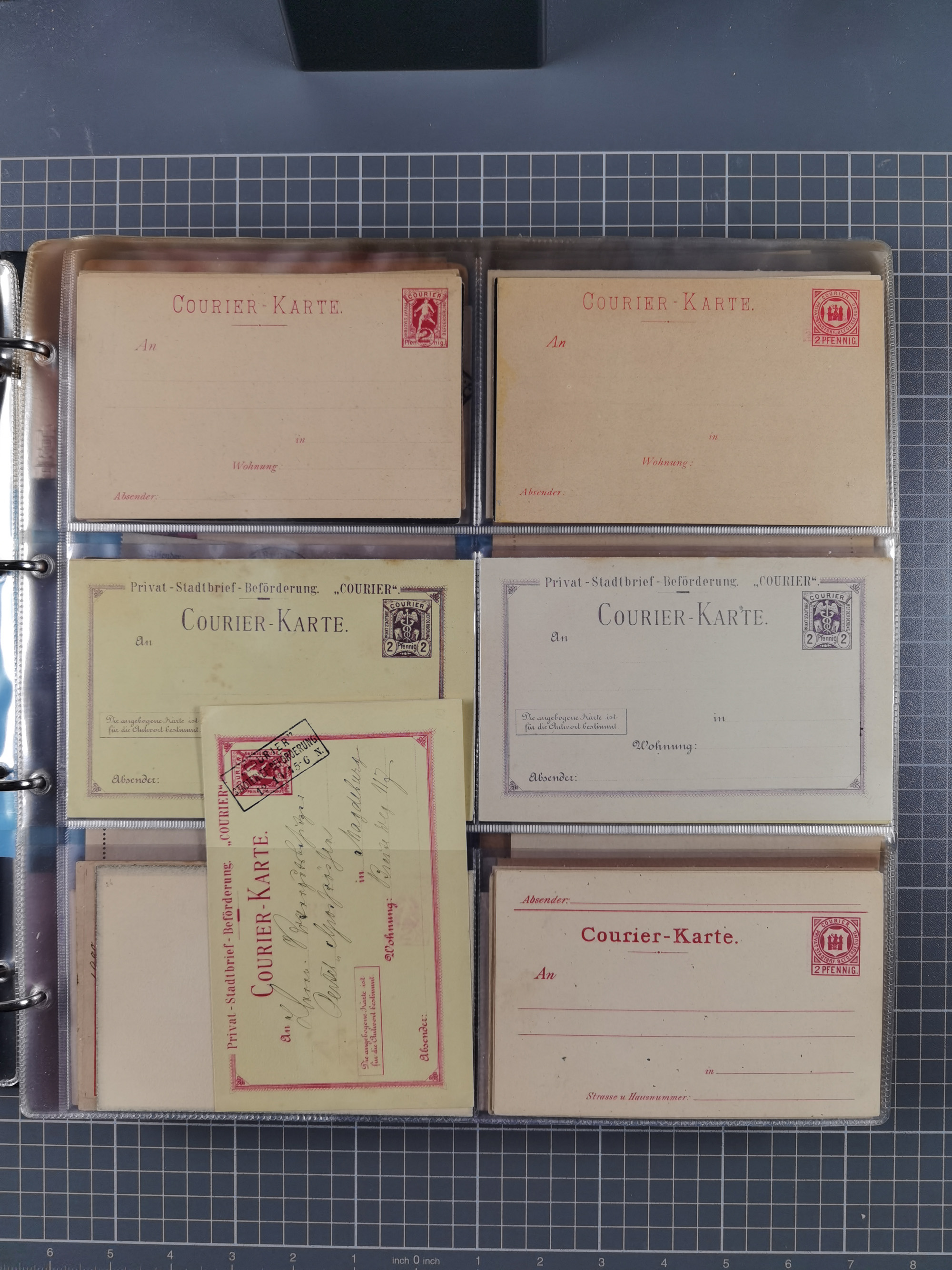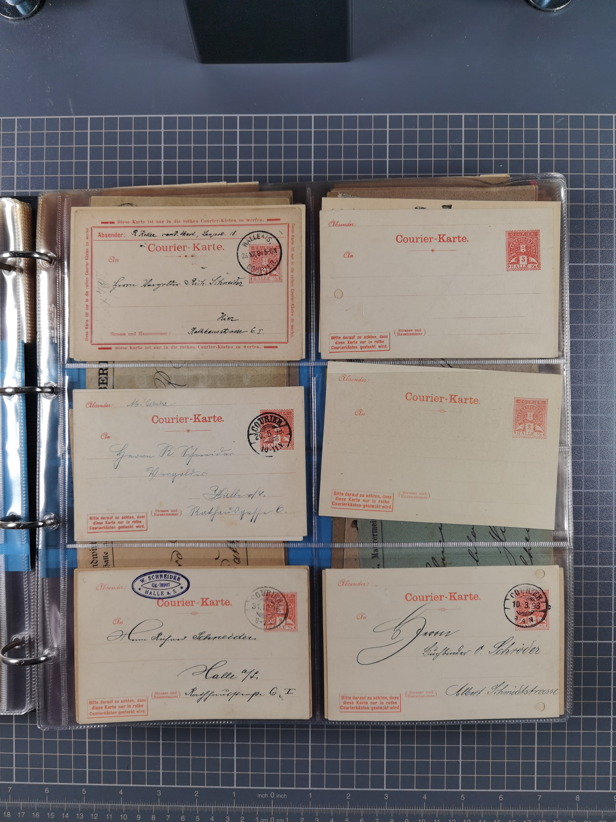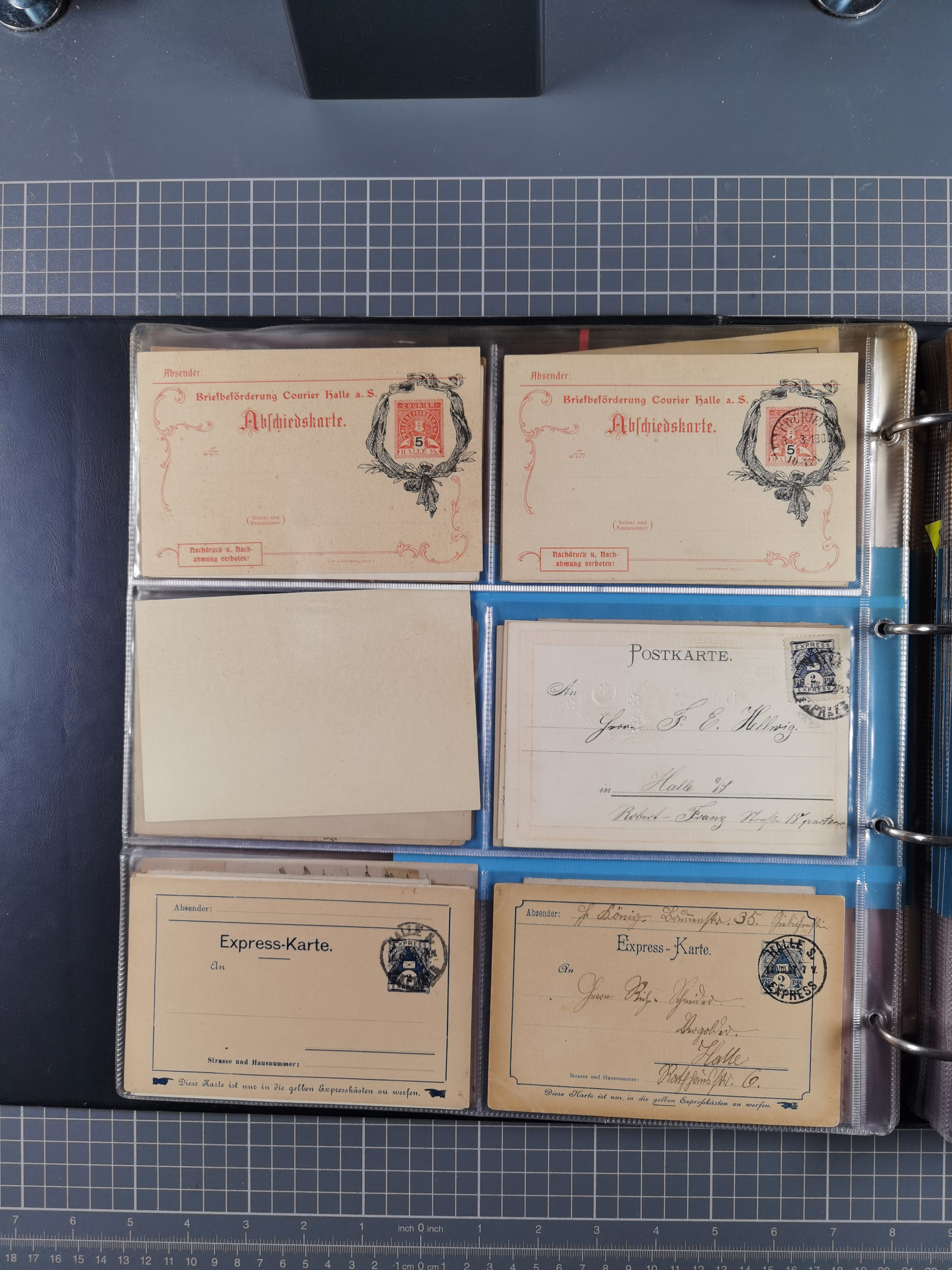 Halle/Saale: 1891/1900, ca. 50 Briefe, Karten und ungebrauchte/gebrauchte Ganzsachen von allen Anstalten. Dabei u.a. Courier Mi.-Nr. 1 im Paar auf Brief, Mi.-Nr. 2 auf Brief und Mi.-Nr. 18 auf Postkarte sowie “Expresse” mit u.a. P9 gebraucht und P12 mit Blanko-Stempel