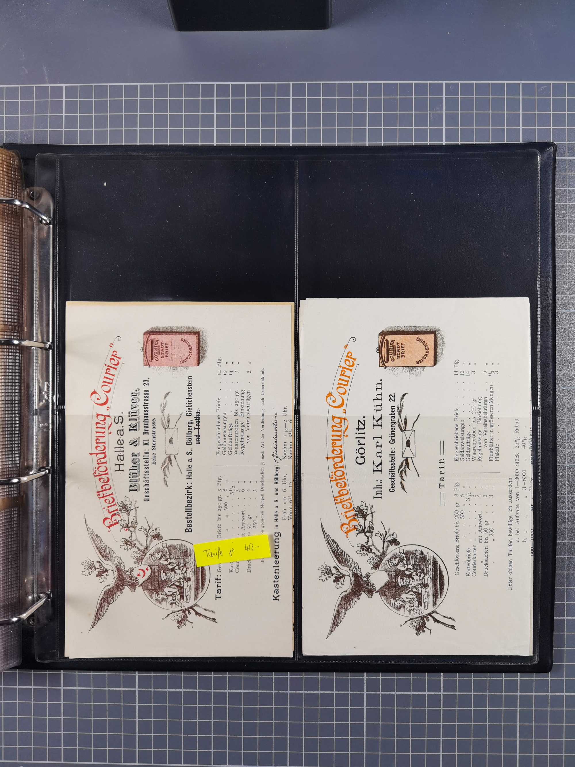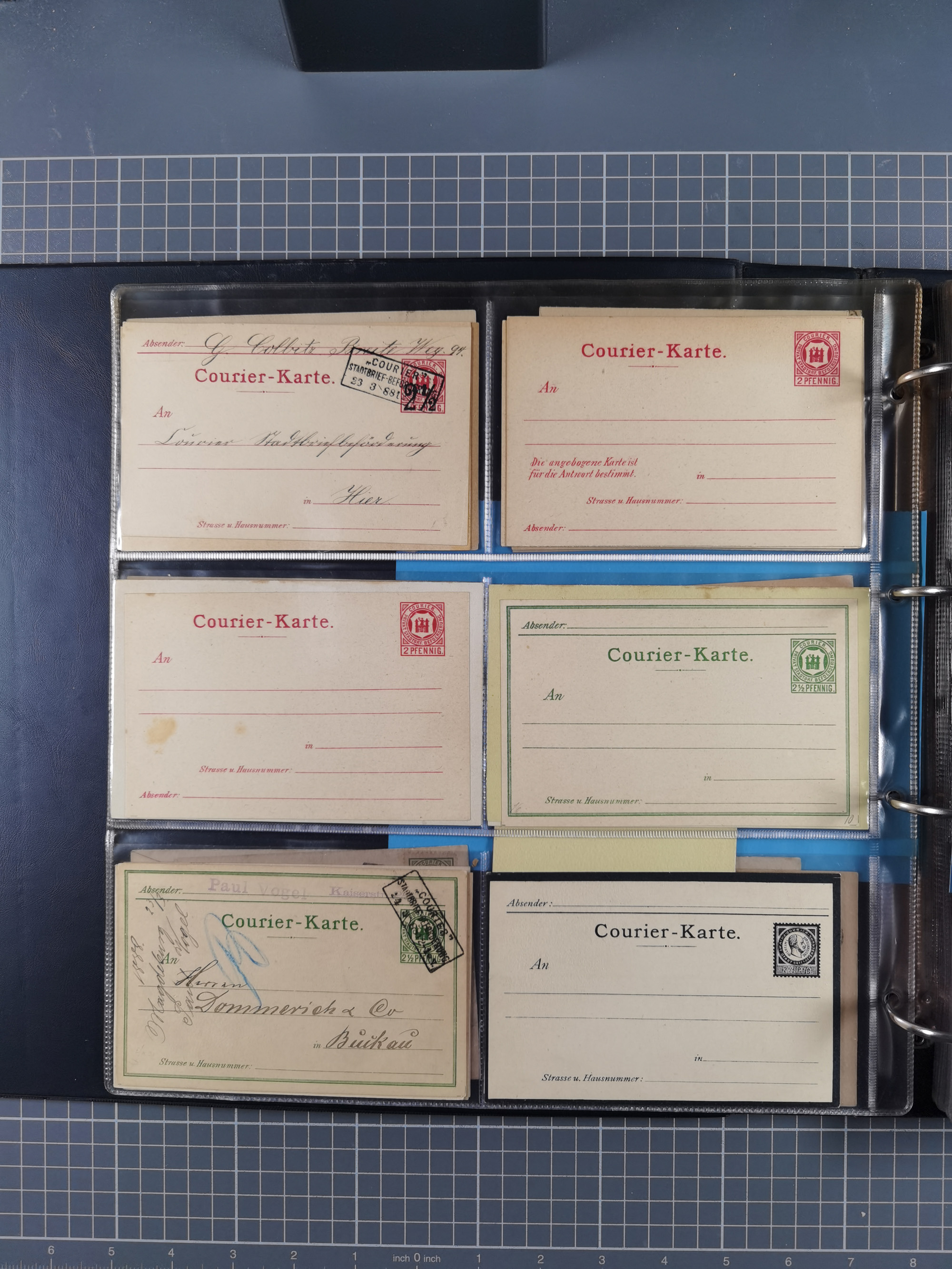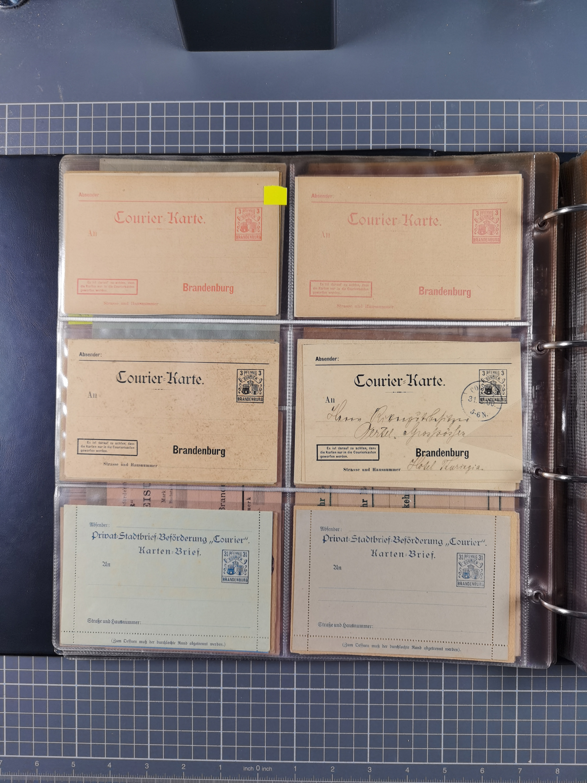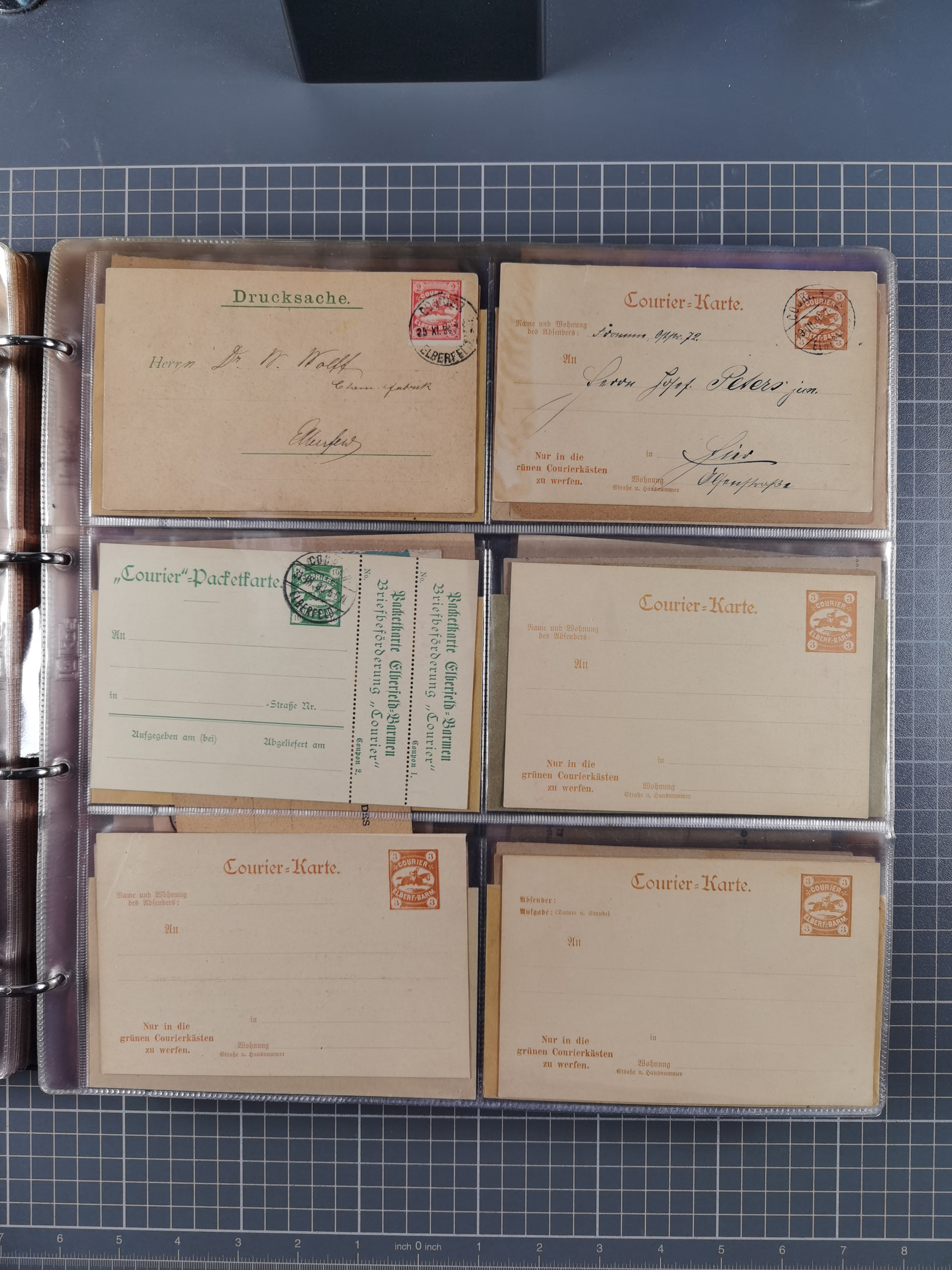 Halle/Saale: 1891/1900, ca. 50 Briefe, Karten und ungebrauchte/gebrauchte Ganzsachen von allen Anstalten. Dabei u.a. Courier Mi.-Nr. 1 im Paar auf Brief, Mi.-Nr. 2 auf Brief und Mi.-Nr. 18 auf Postkarte sowie “Expresse” mit u.a. P9 gebraucht und P12 mit Blanko-Stempel