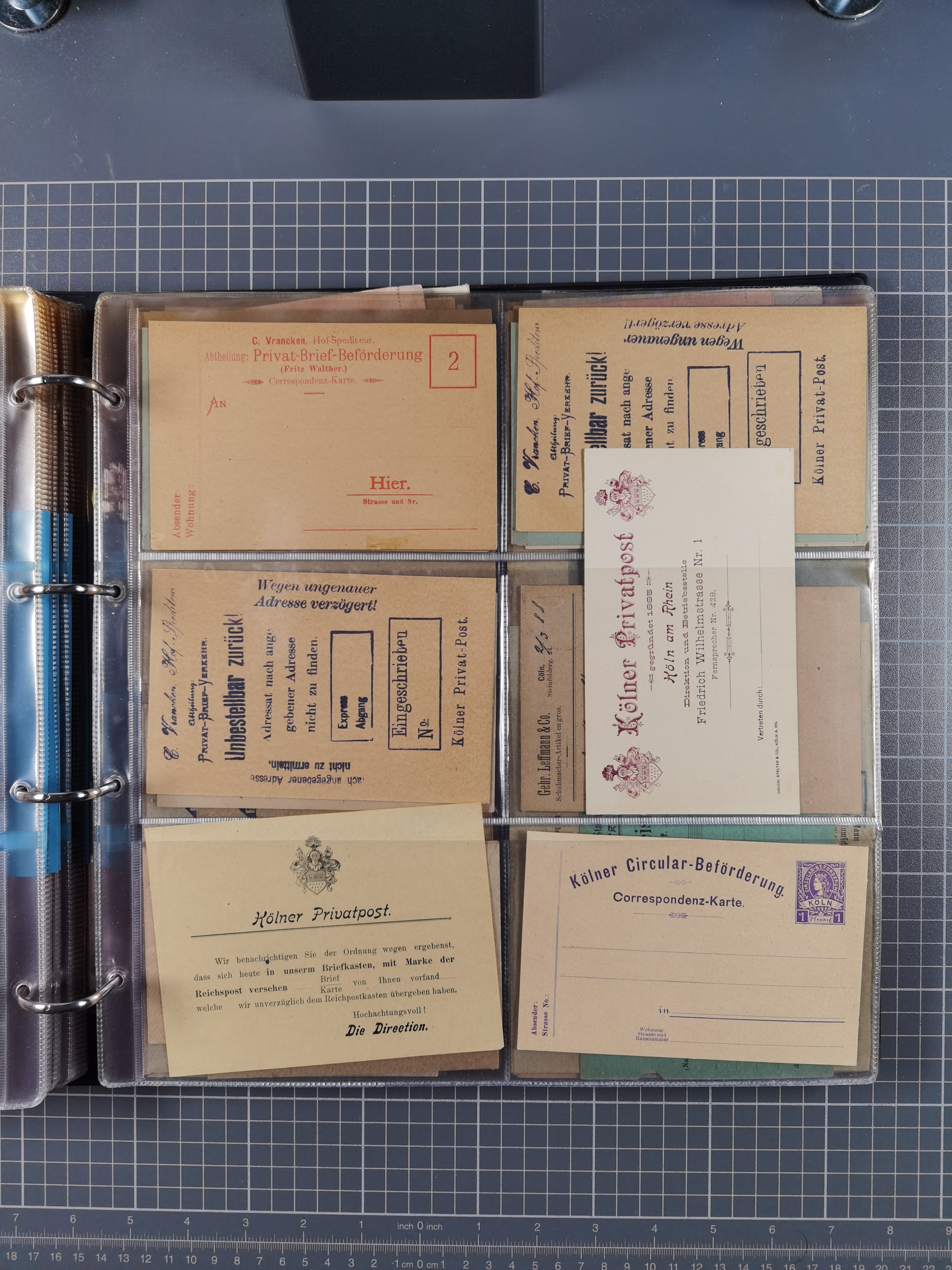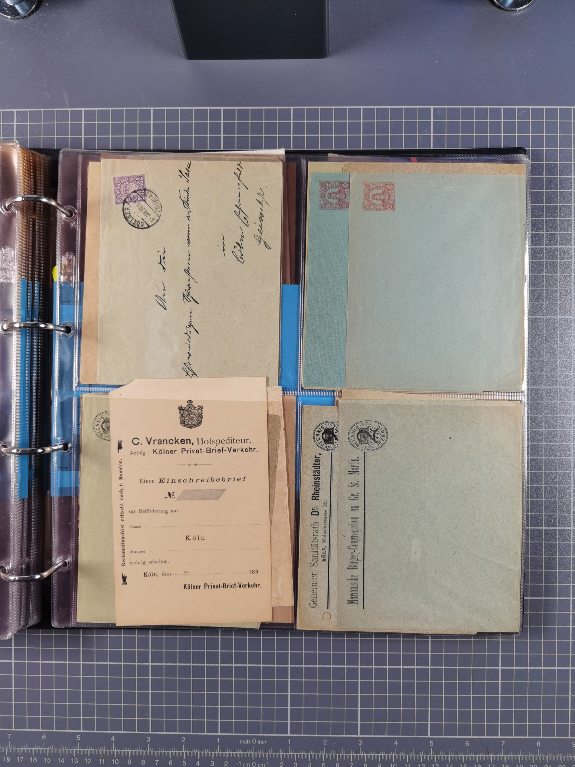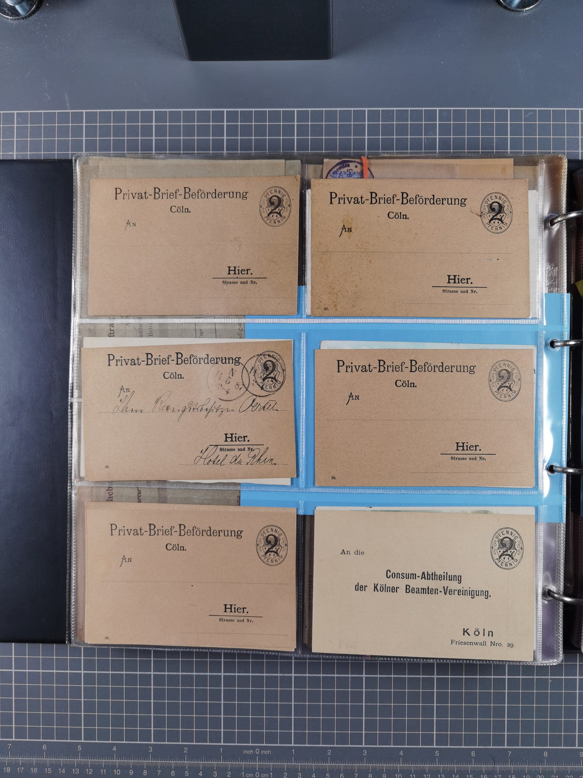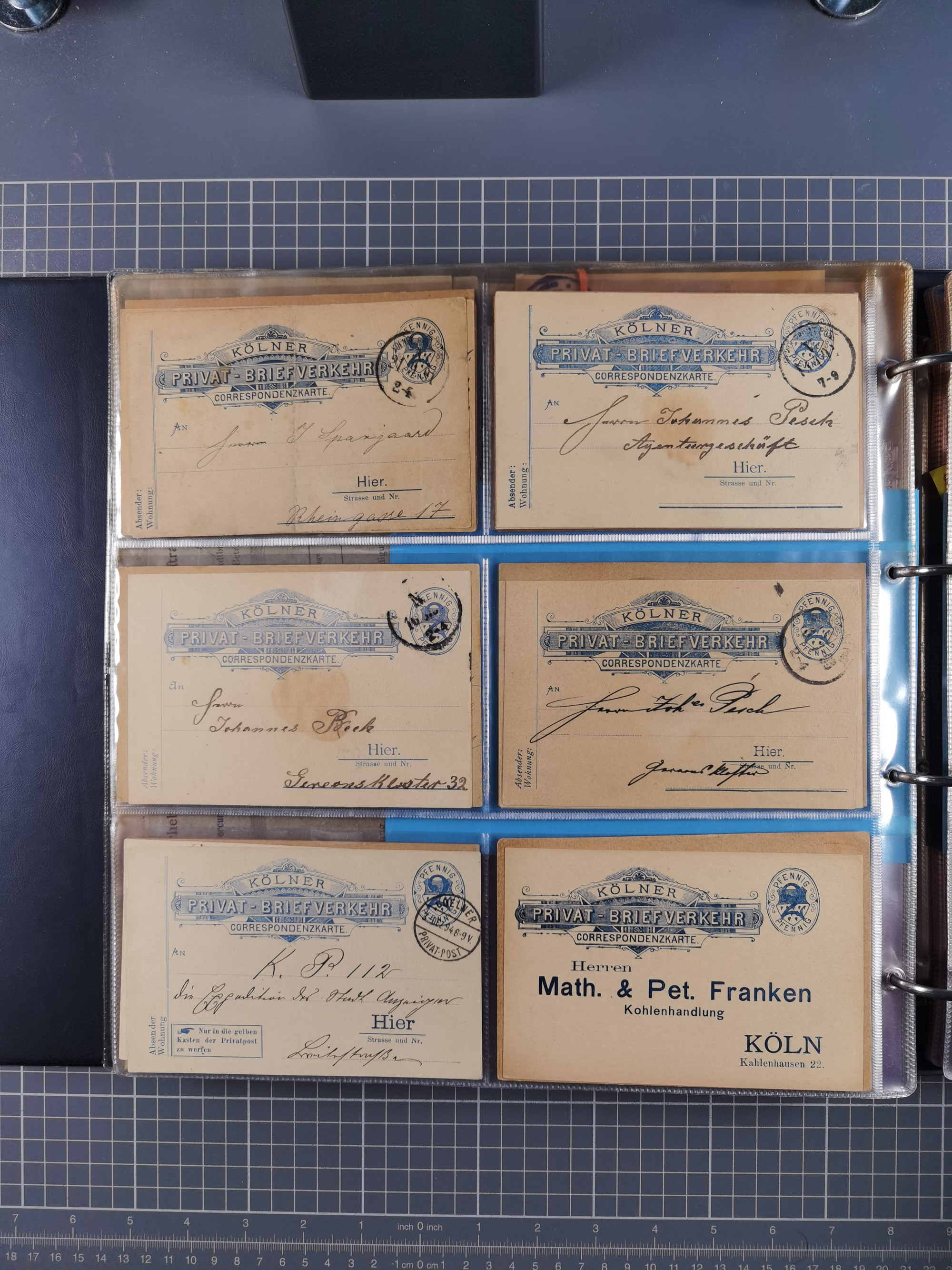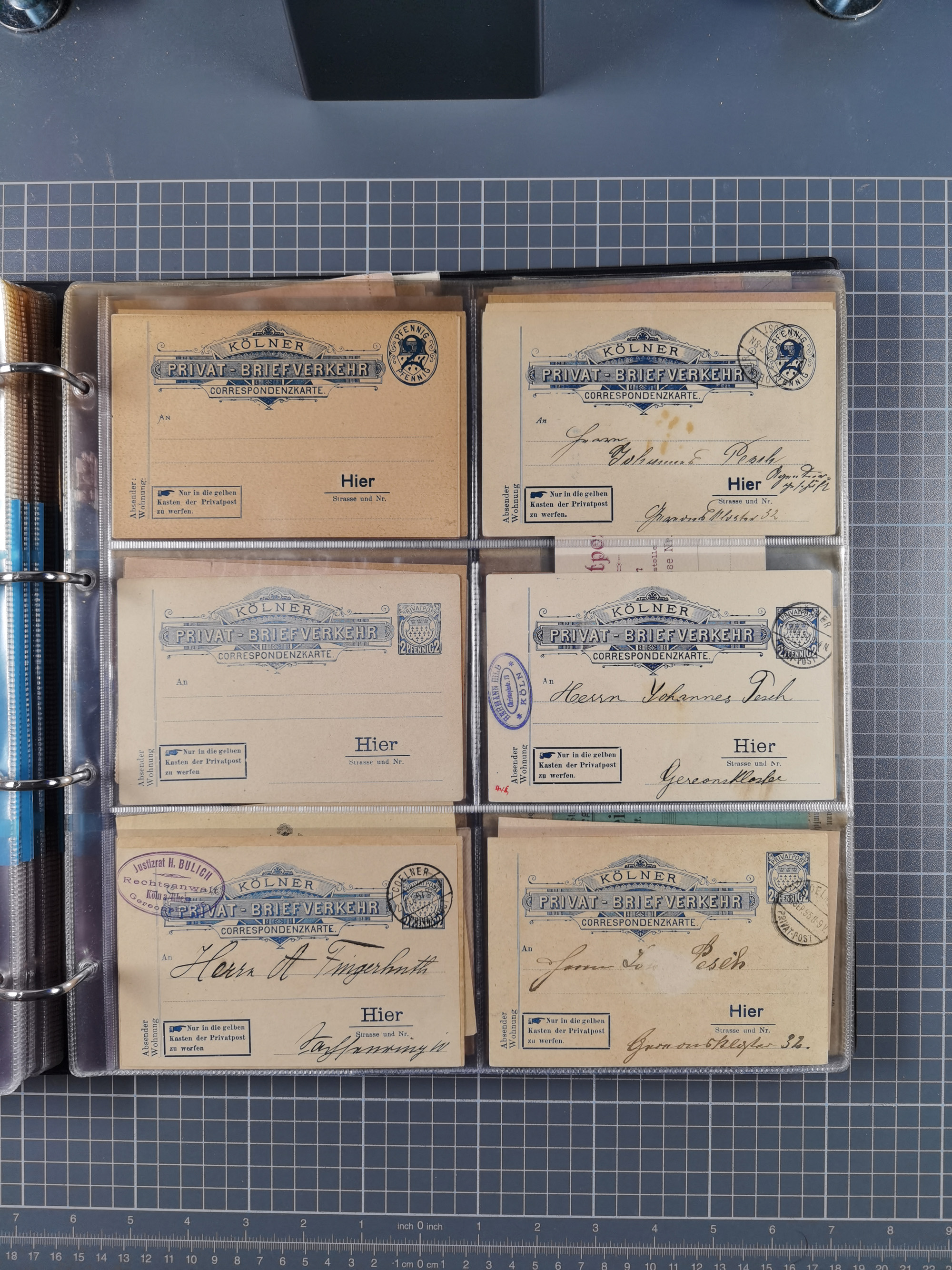 Köln: 1886/1900, ca. 100 Briefe, Karten und ungebrauchte/gebrauchte Ganzsachen sowie Formulare (u.a. “Abmeldung (Duplikat” ungebraucht) mit Schwerpunkt “Privat-Brief-Verkehr”. Dabei u.a. frankierte Firmenbriefe mit Mi.-Nr. 5 und 9, PP1 ungebraucht, PP5 ungebraucht und PU1 “Franz Wiillick” gebraucht , P28 ungebraucht und K4 gebraucht