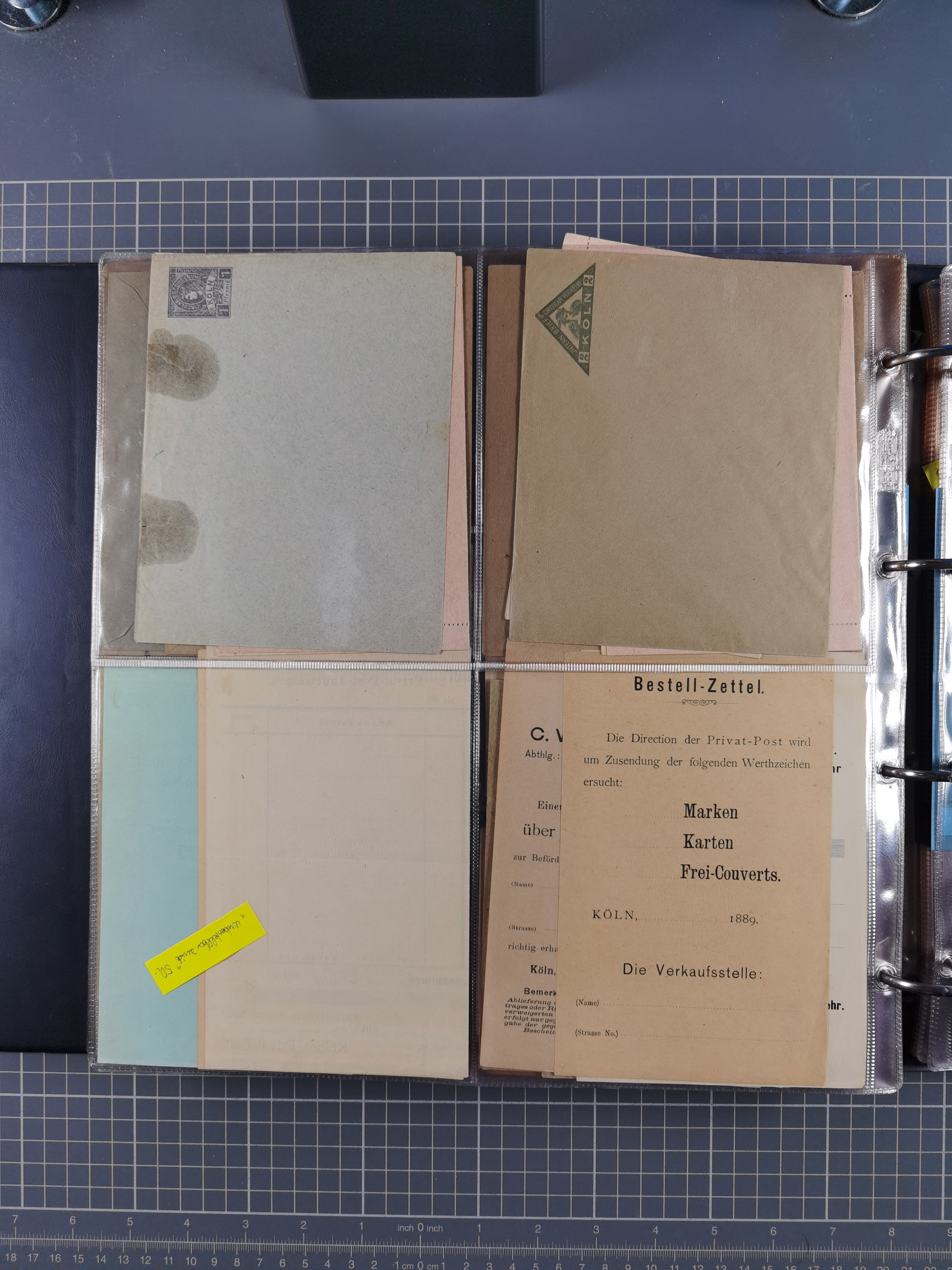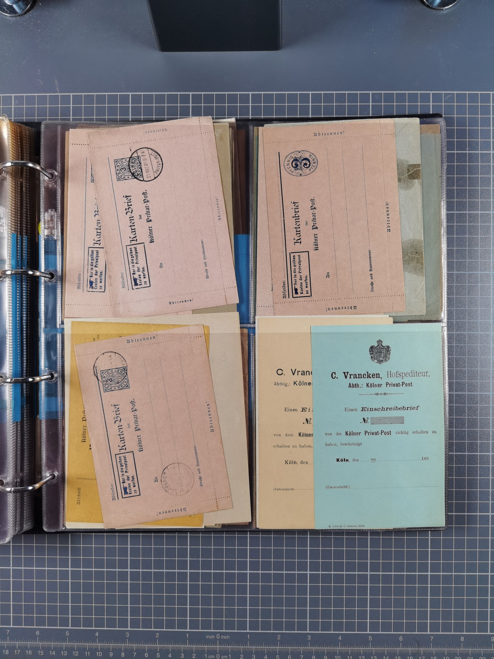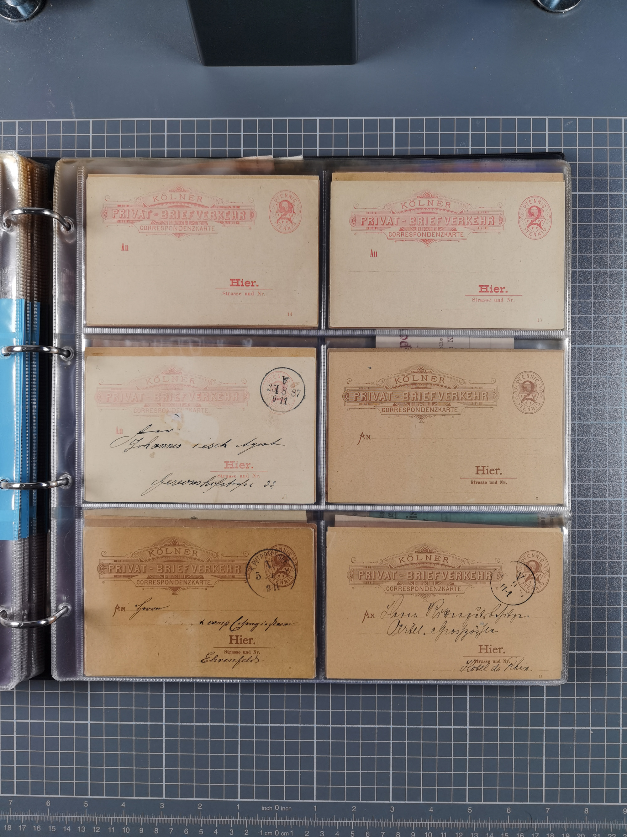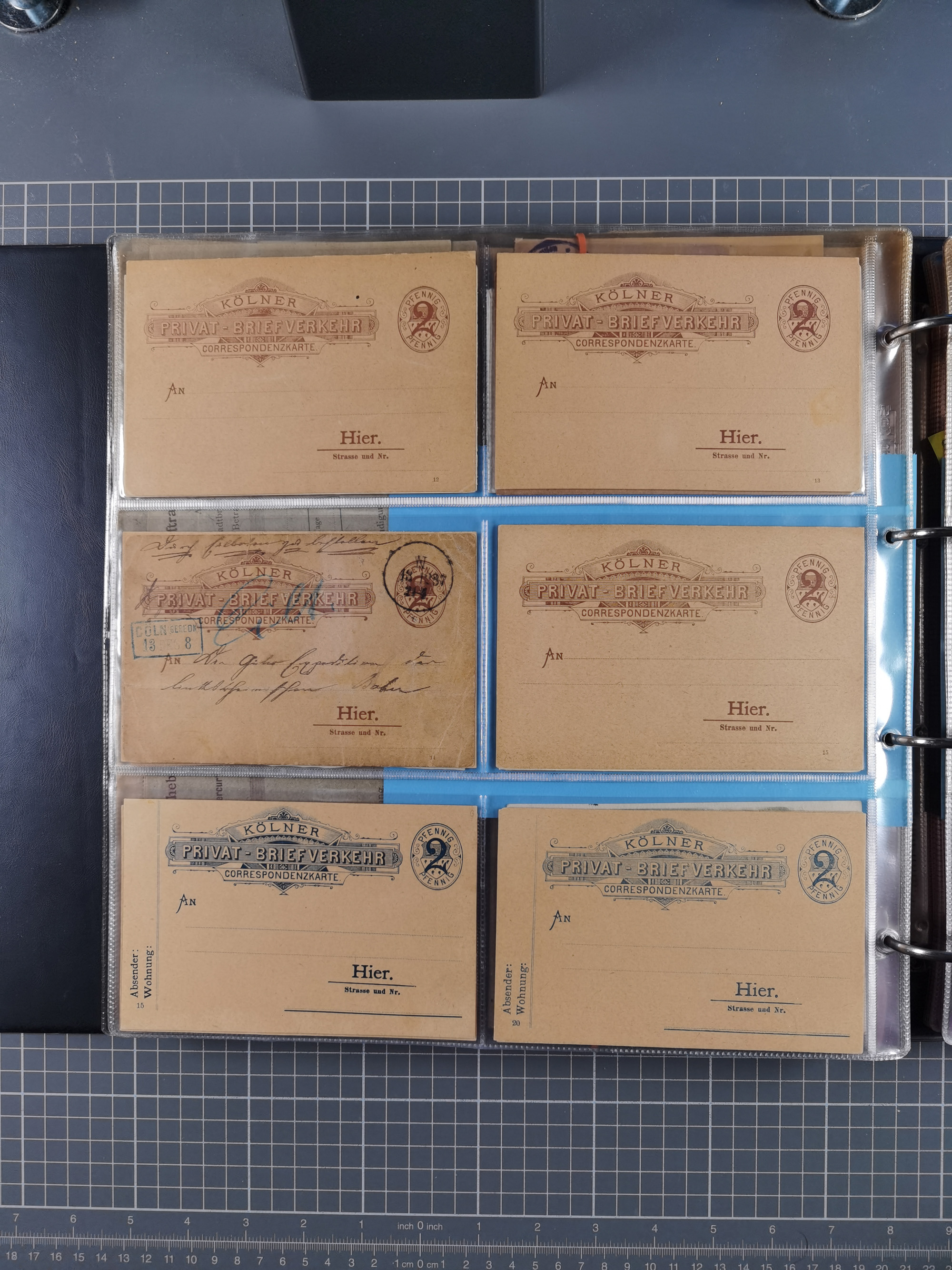 Köln: 1886/1900, ca. 100 Briefe, Karten und ungebrauchte/gebrauchte Ganzsachen sowie Formulare (u.a. “Abmeldung (Duplikat” ungebraucht) mit Schwerpunkt “Privat-Brief-Verkehr”. Dabei u.a. frankierte Firmenbriefe mit Mi.-Nr. 5 und 9, PP1 ungebraucht, PP5 ungebraucht und PU1 “Franz Wiillick” gebraucht , P28 ungebraucht und K4 gebraucht