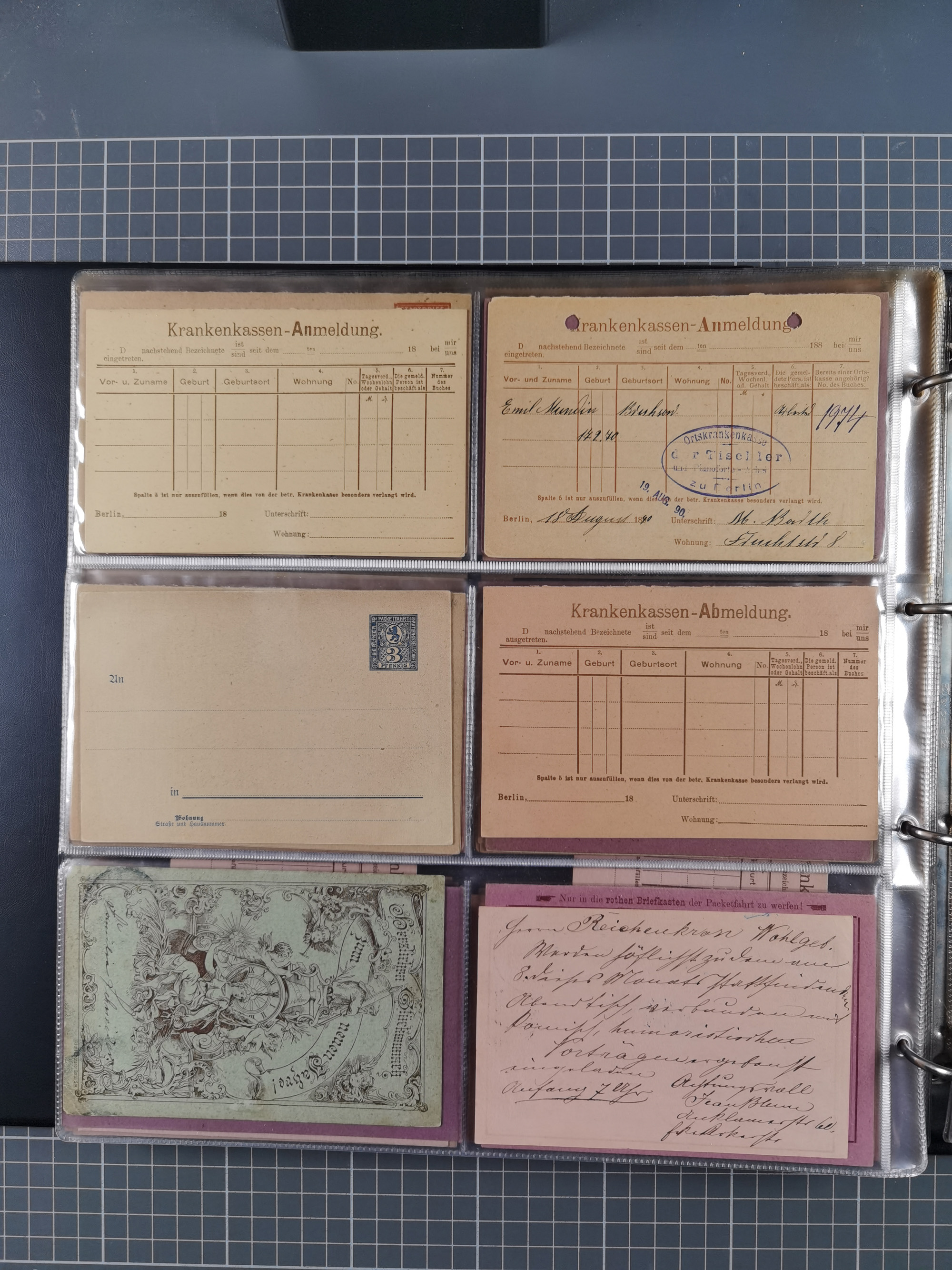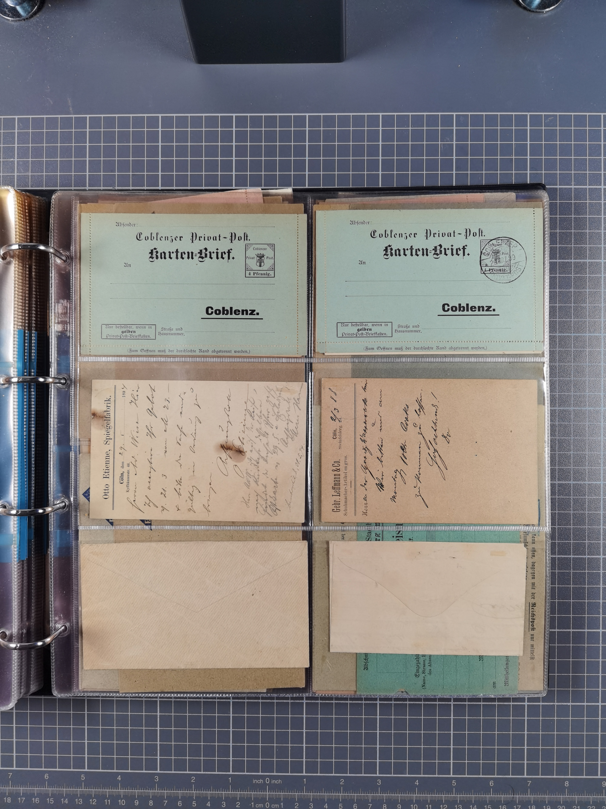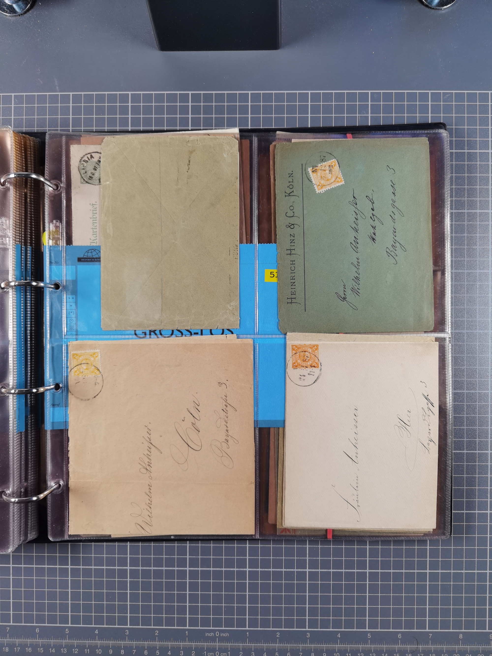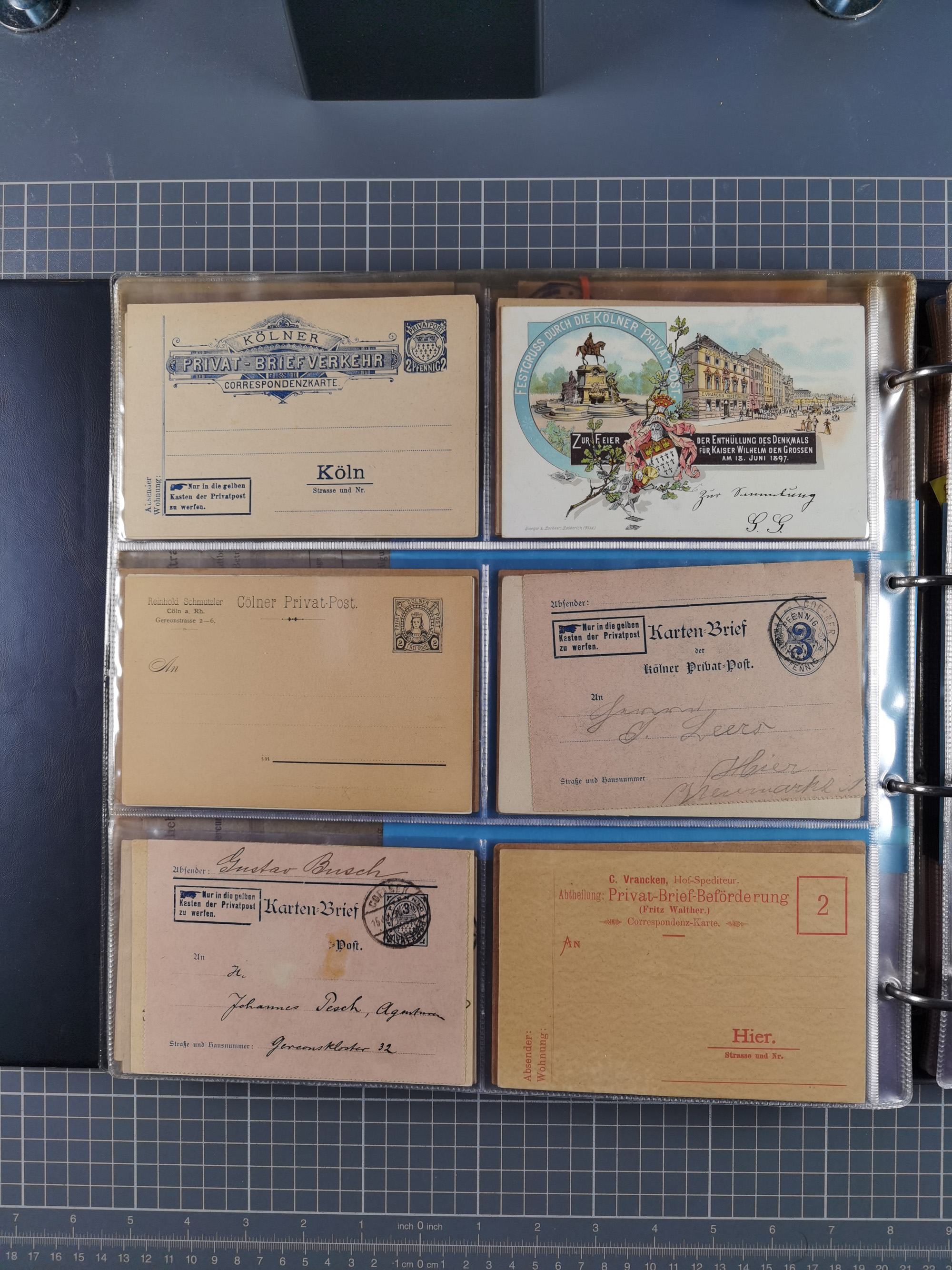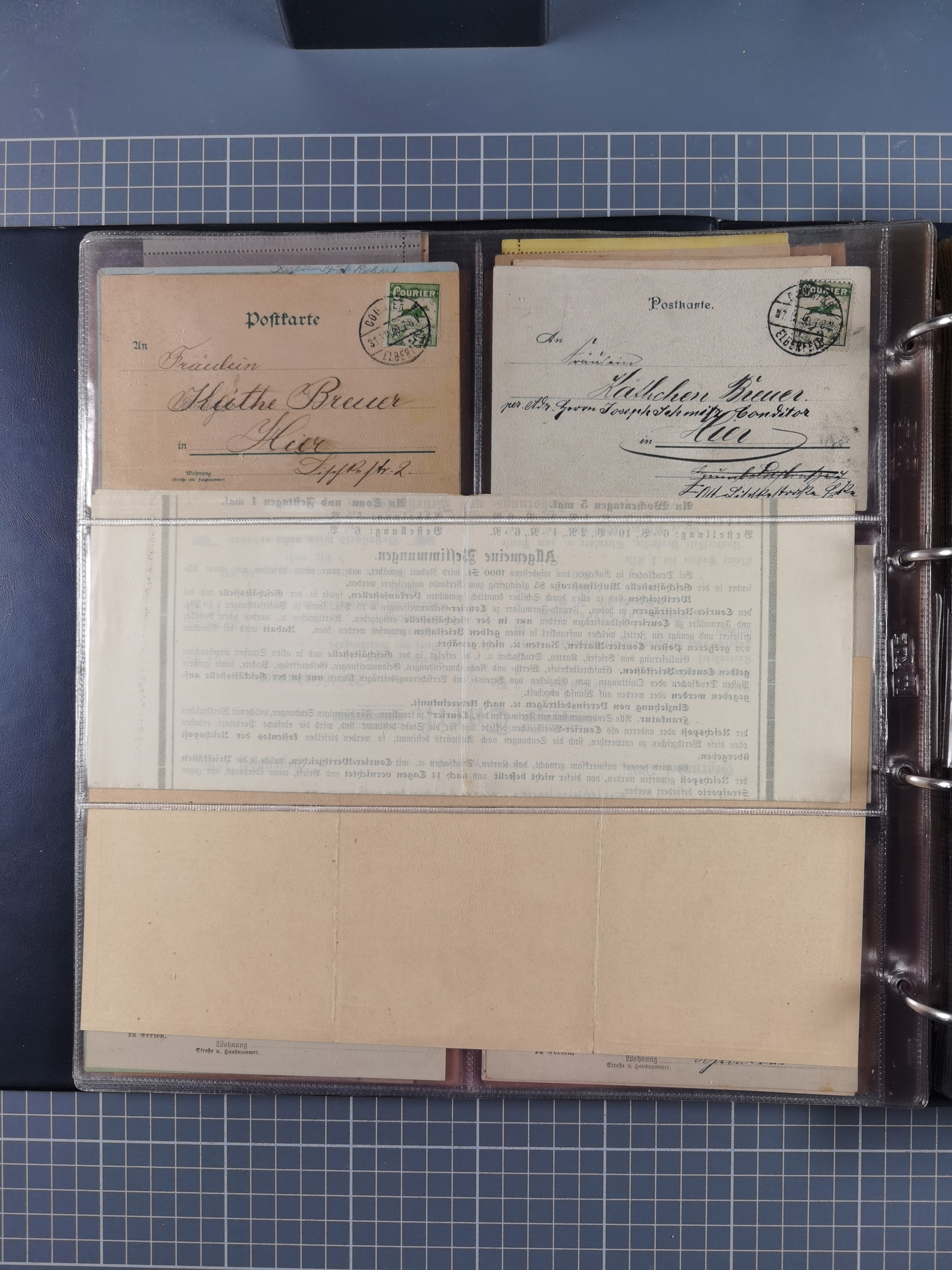 Köln: 1886/1900, ca. 100 Briefe, Karten und ungebrauchte/gebrauchte Ganzsachen sowie Formulare (u.a. “Abmeldung (Duplikat” ungebraucht) mit Schwerpunkt “Privat-Brief-Verkehr”. Dabei u.a. frankierte Firmenbriefe mit Mi.-Nr. 5 und 9, PP1 ungebraucht, PP5 ungebraucht und PU1 “Franz Wiillick” gebraucht , P28 ungebraucht und K4 gebraucht