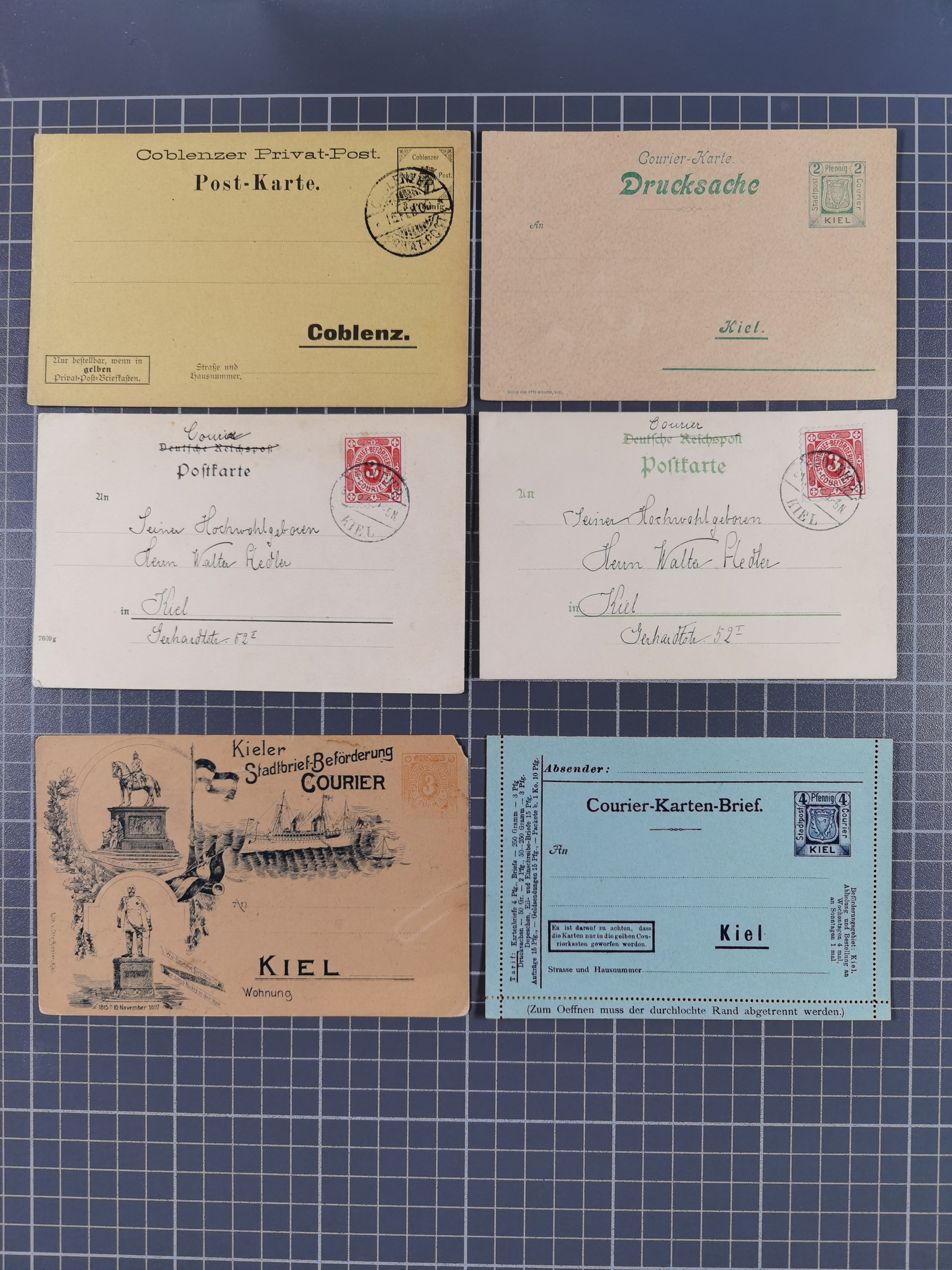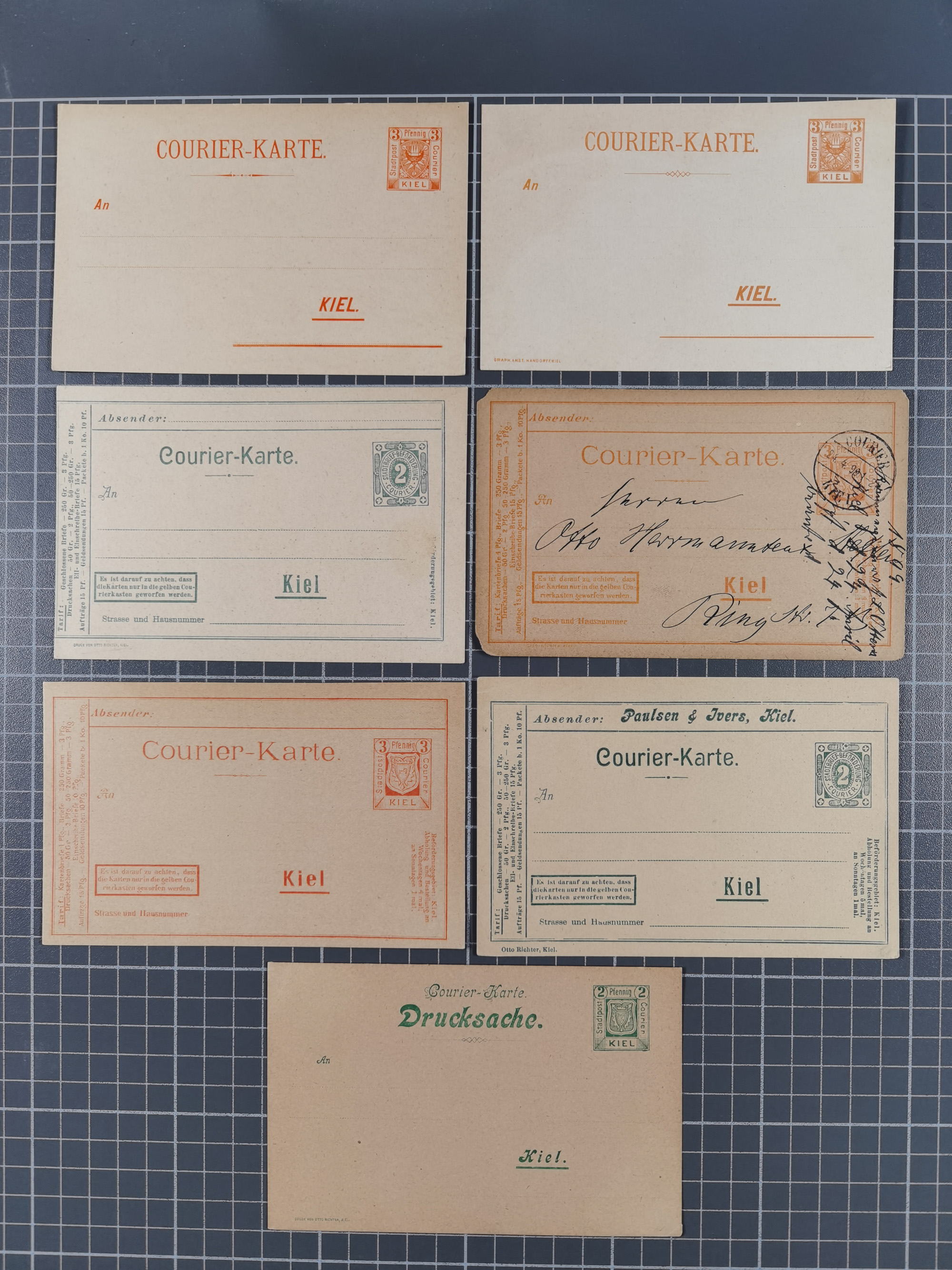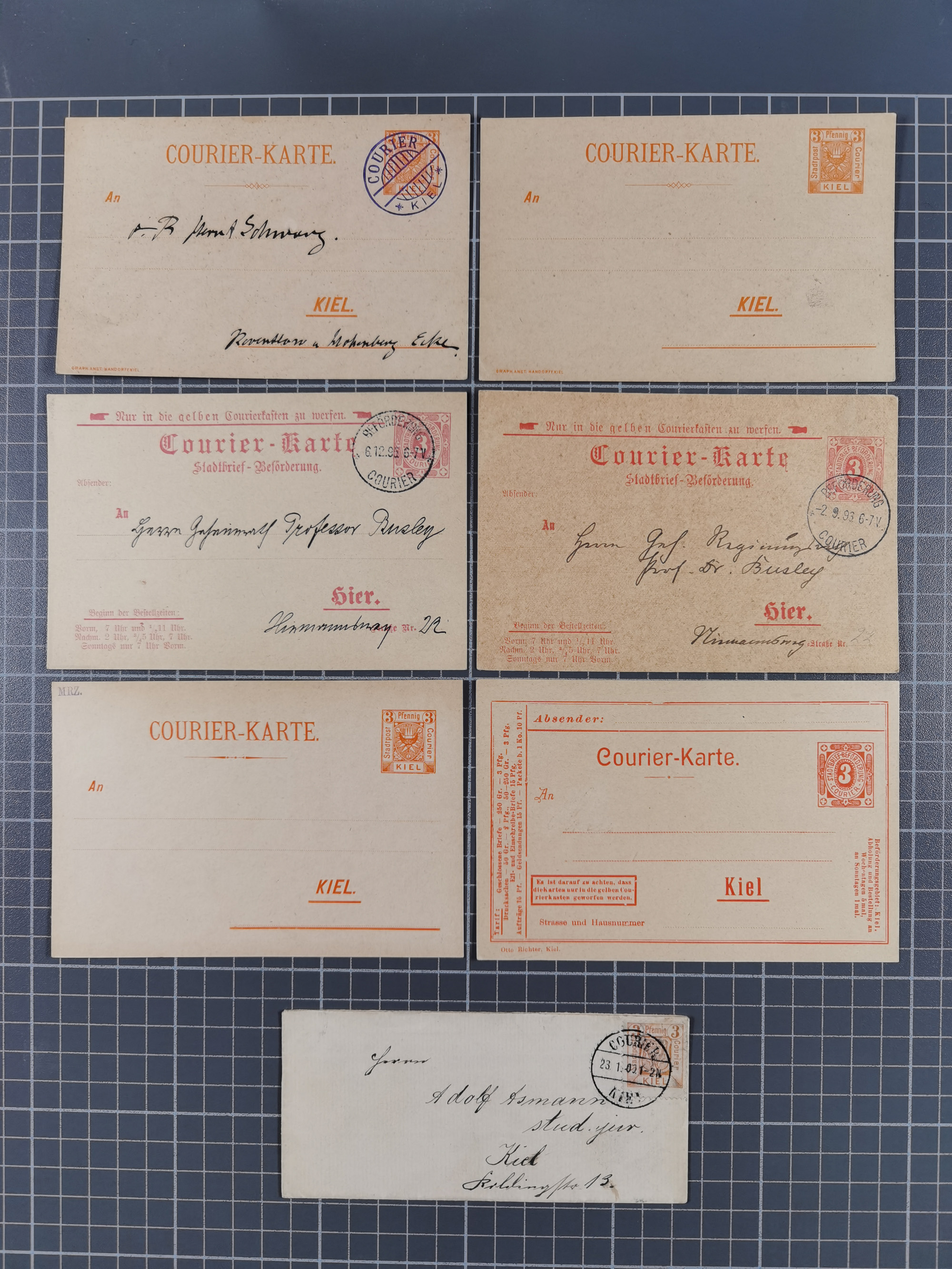 Kiel-Courier: 1895/1900, Partie mit Mi.-Nr. 3 auf zwei Postkarten und Mi.-Nr. 1210 auf Brief sowie 16 ungebrauchte und gebrauchte Ganzsachenkarten. Dabei u.a. P2 und P3 gebraucht, P12Z ungebraucht und P27 gebraucht