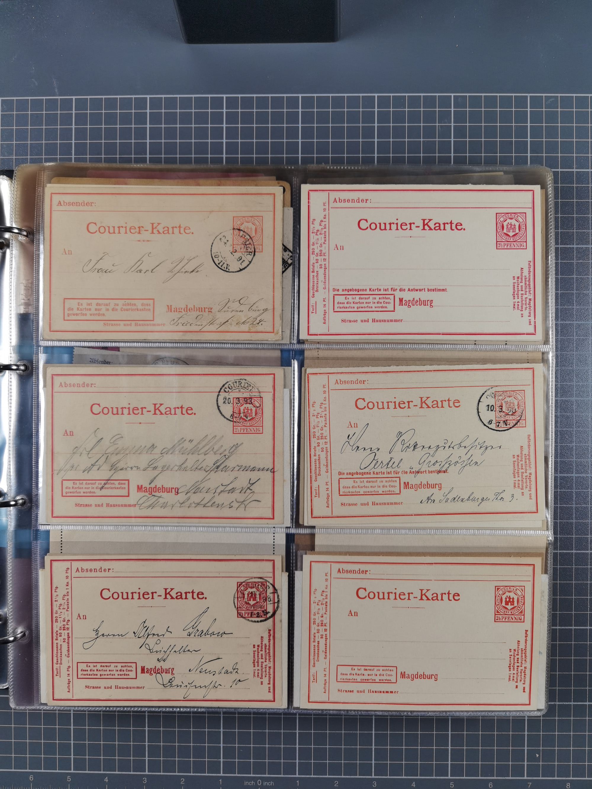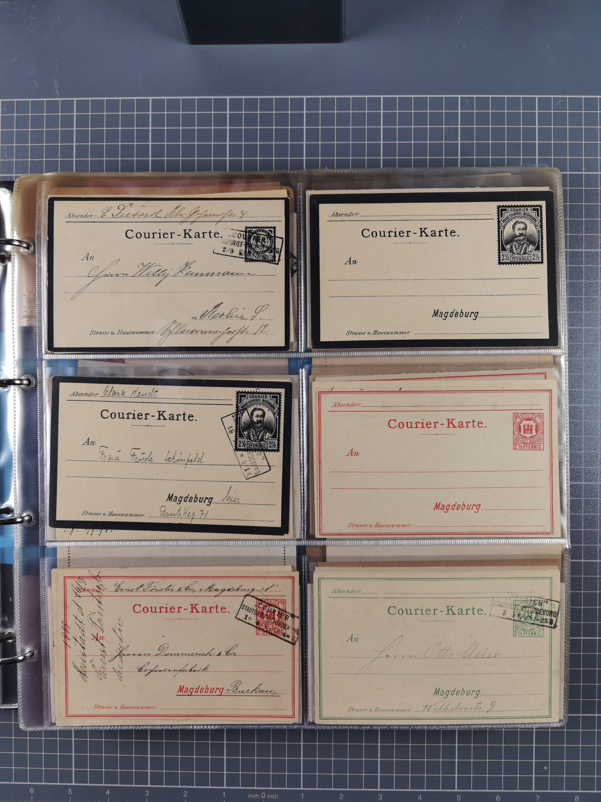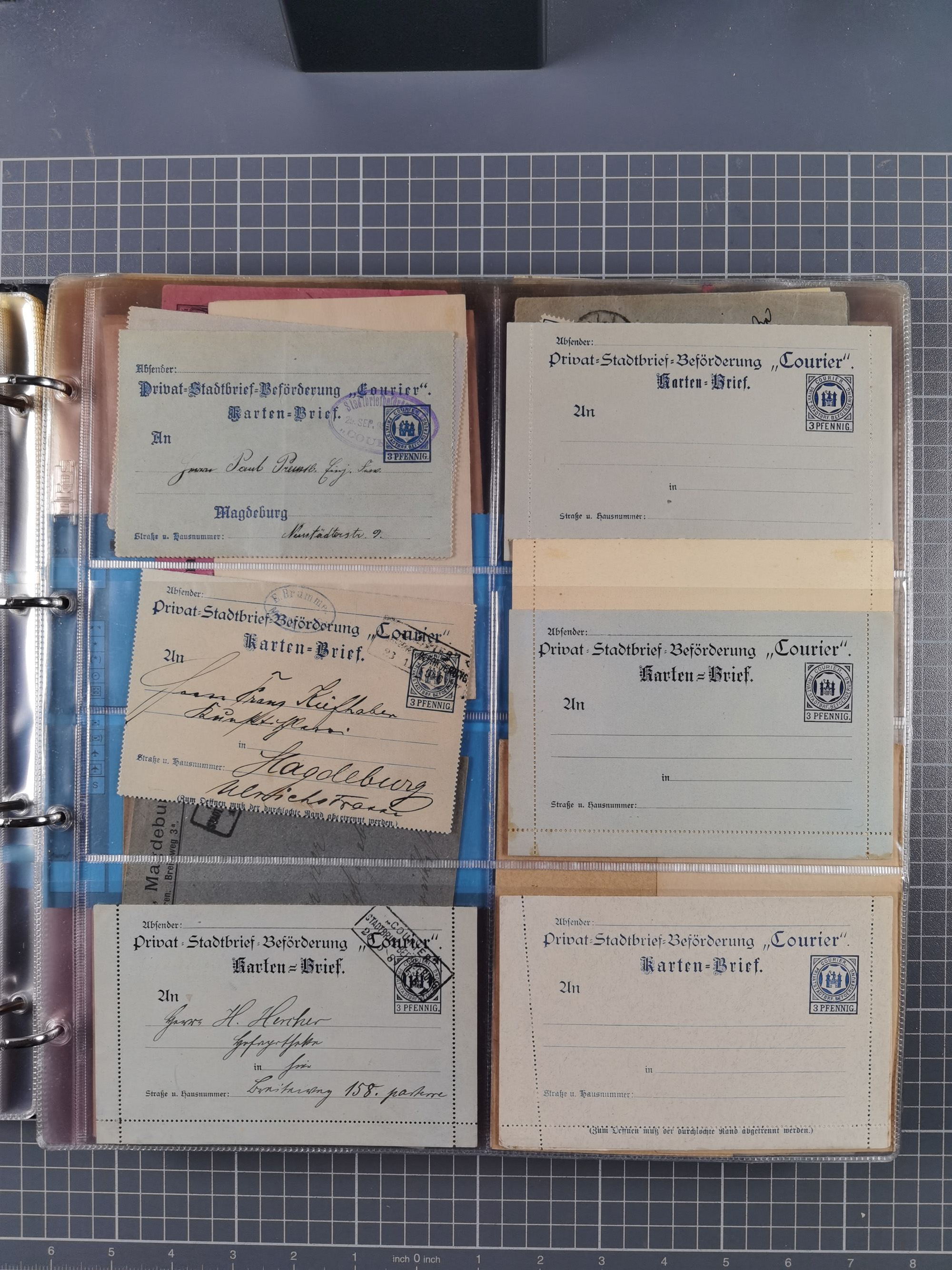 Magdeburg-Courier: 1886/1900, ca. 80 Briefe, Karten und ungebrauchte/gebrauchte Ganzsachen inkl. Privatpost Courier. Dabei u.a. P4 gebraucht, P13 gebraucht, P28 gebraucht, P29 gebraucht und 2½ Pfg. GSK in oliv mit Eigenwerbung gebraucht