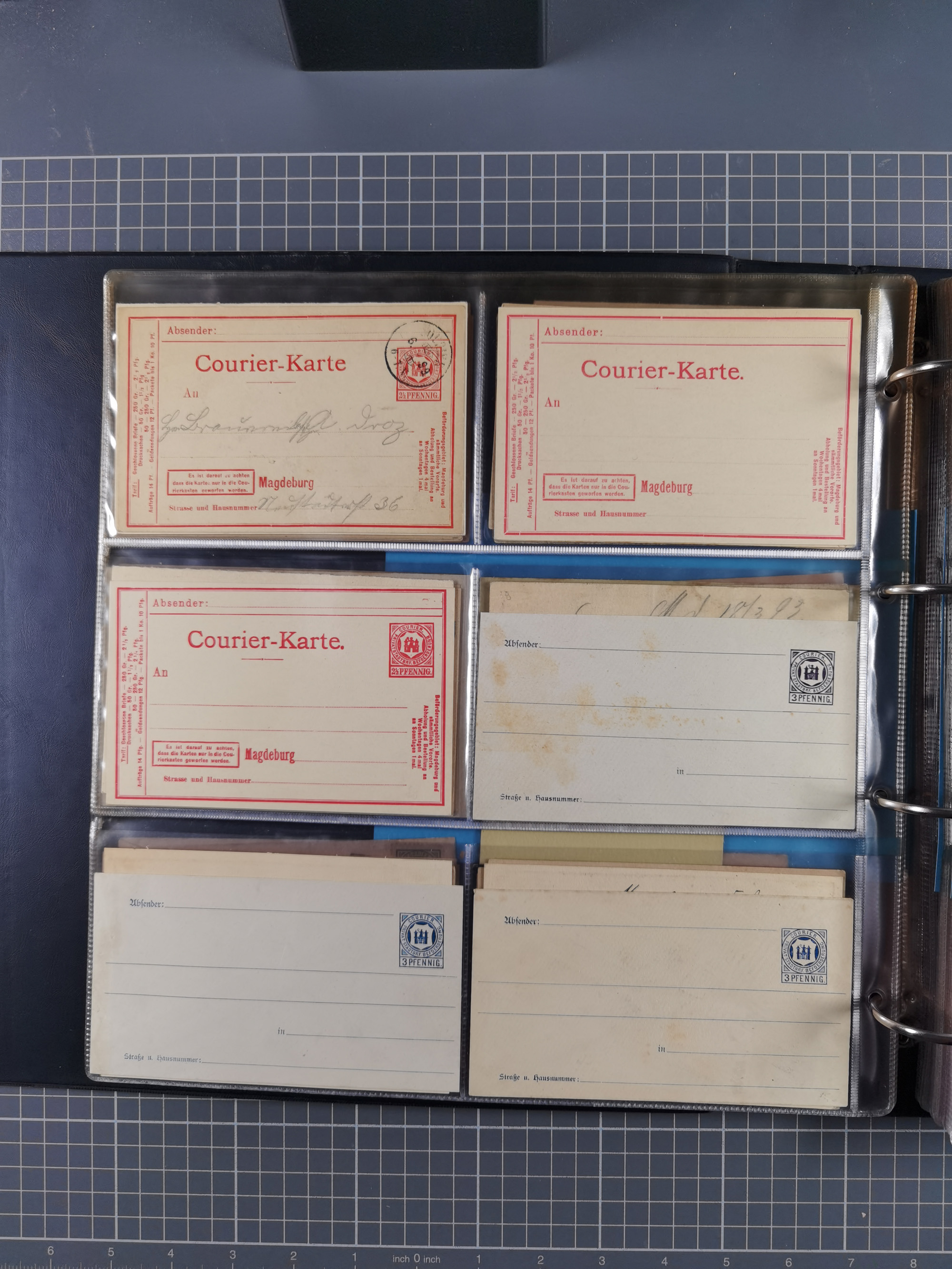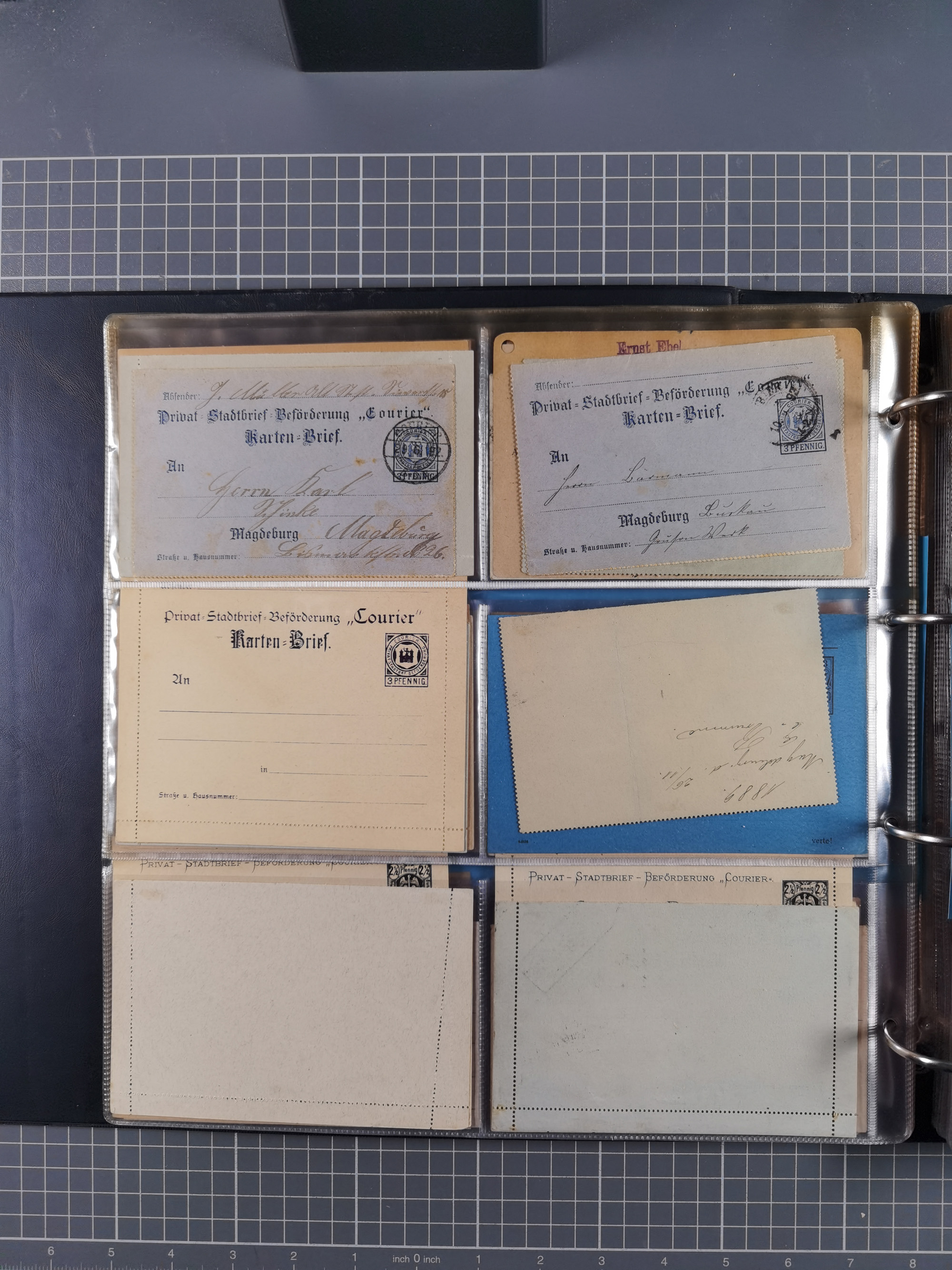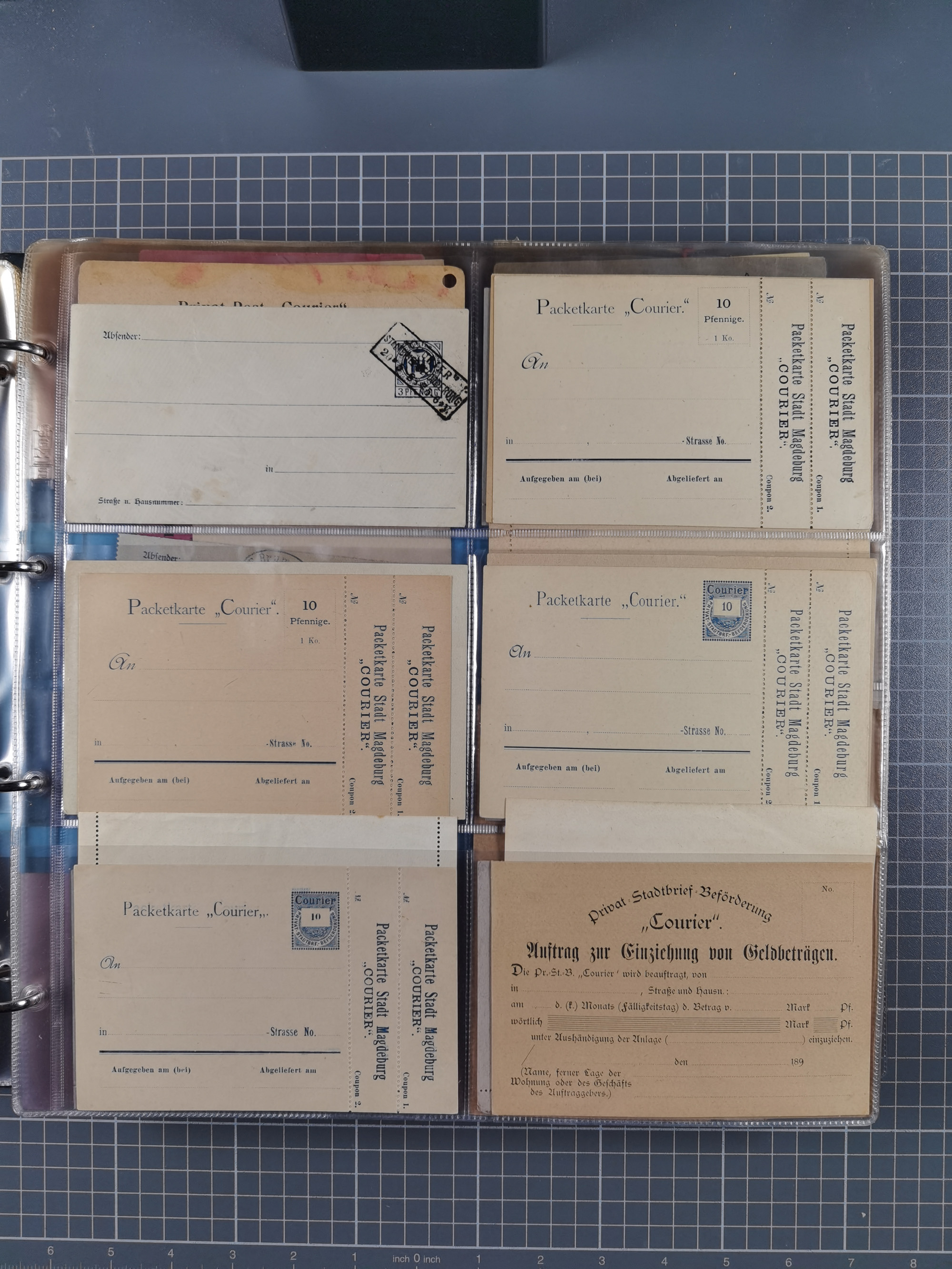 Magdeburg-Courier: 1886/1900, ca. 80 Briefe, Karten und ungebrauchte/gebrauchte Ganzsachen inkl. Privatpost Courier. Dabei u.a. P4 gebraucht, P13 gebraucht, P28 gebraucht, P29 gebraucht und 2½ Pfg. GSK in oliv mit Eigenwerbung gebraucht