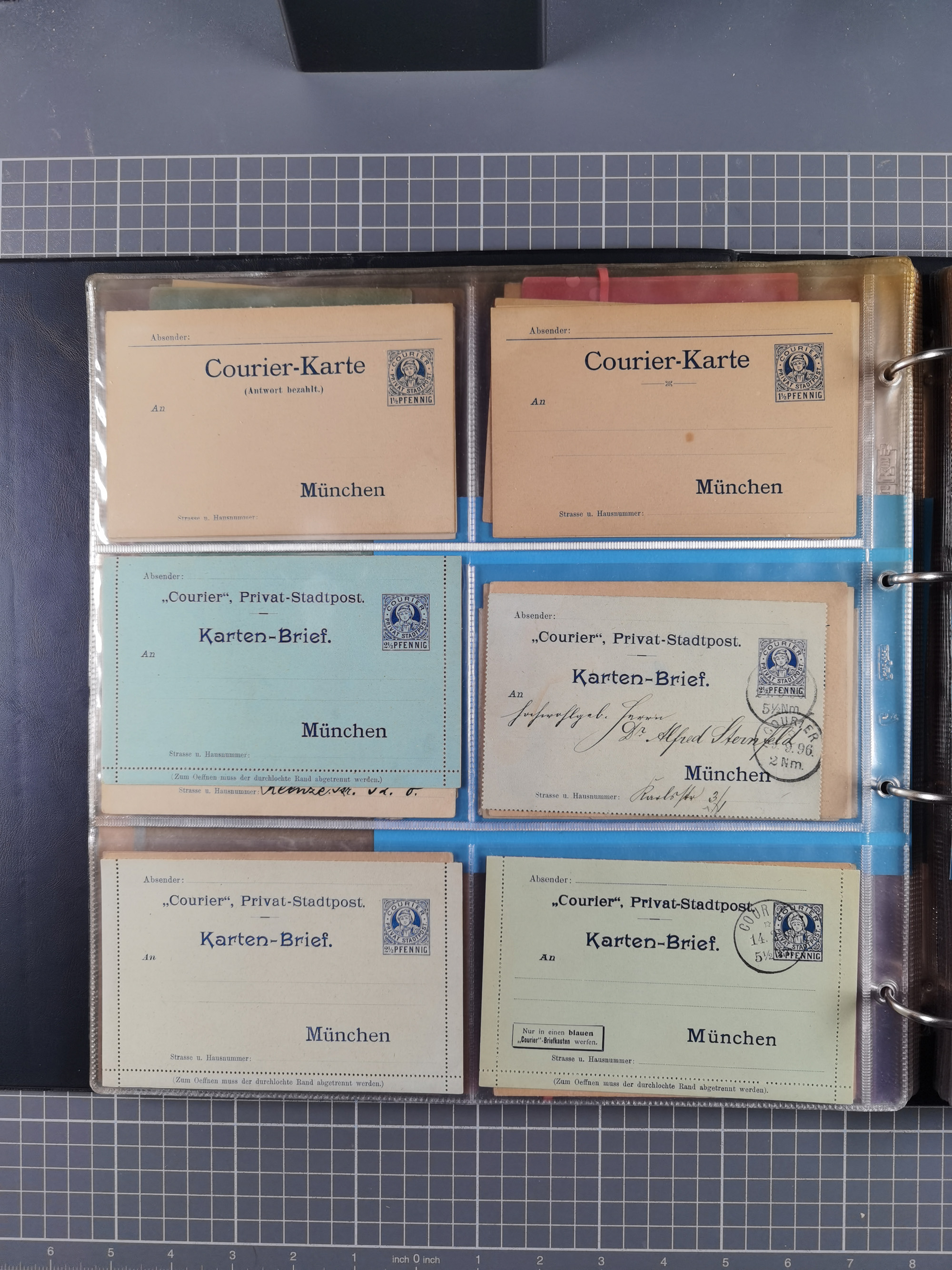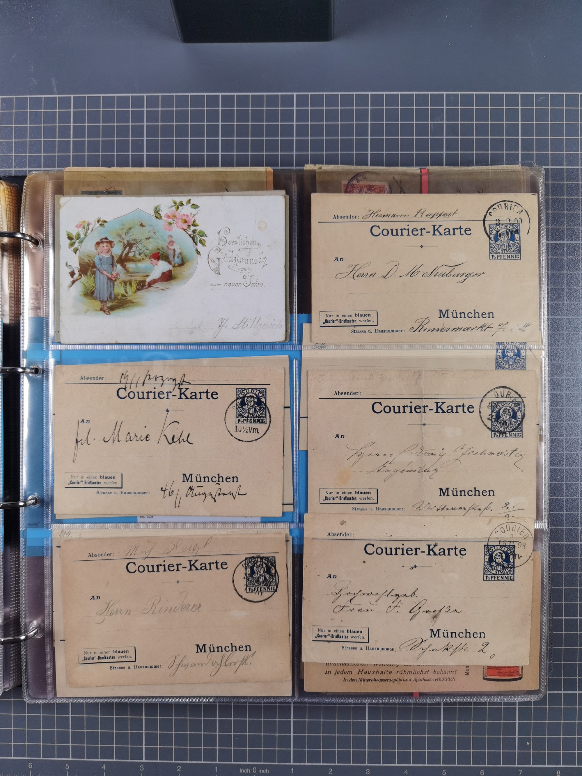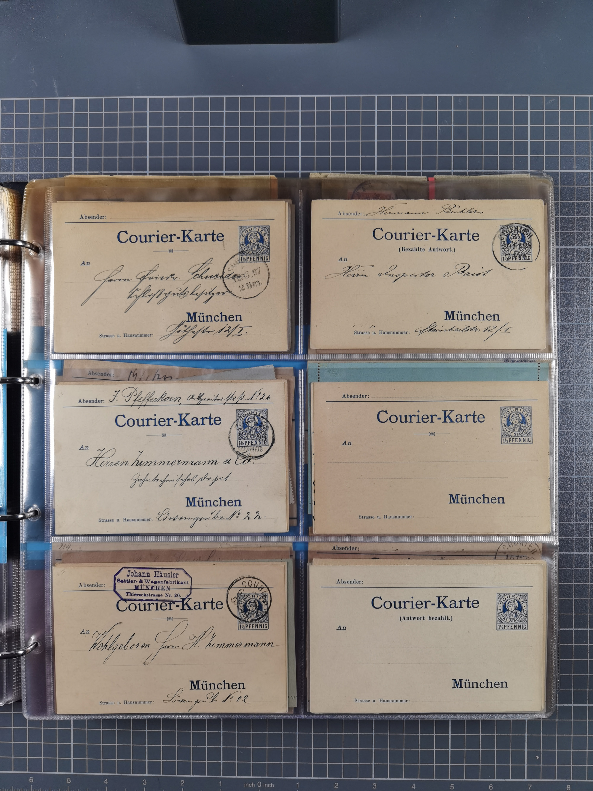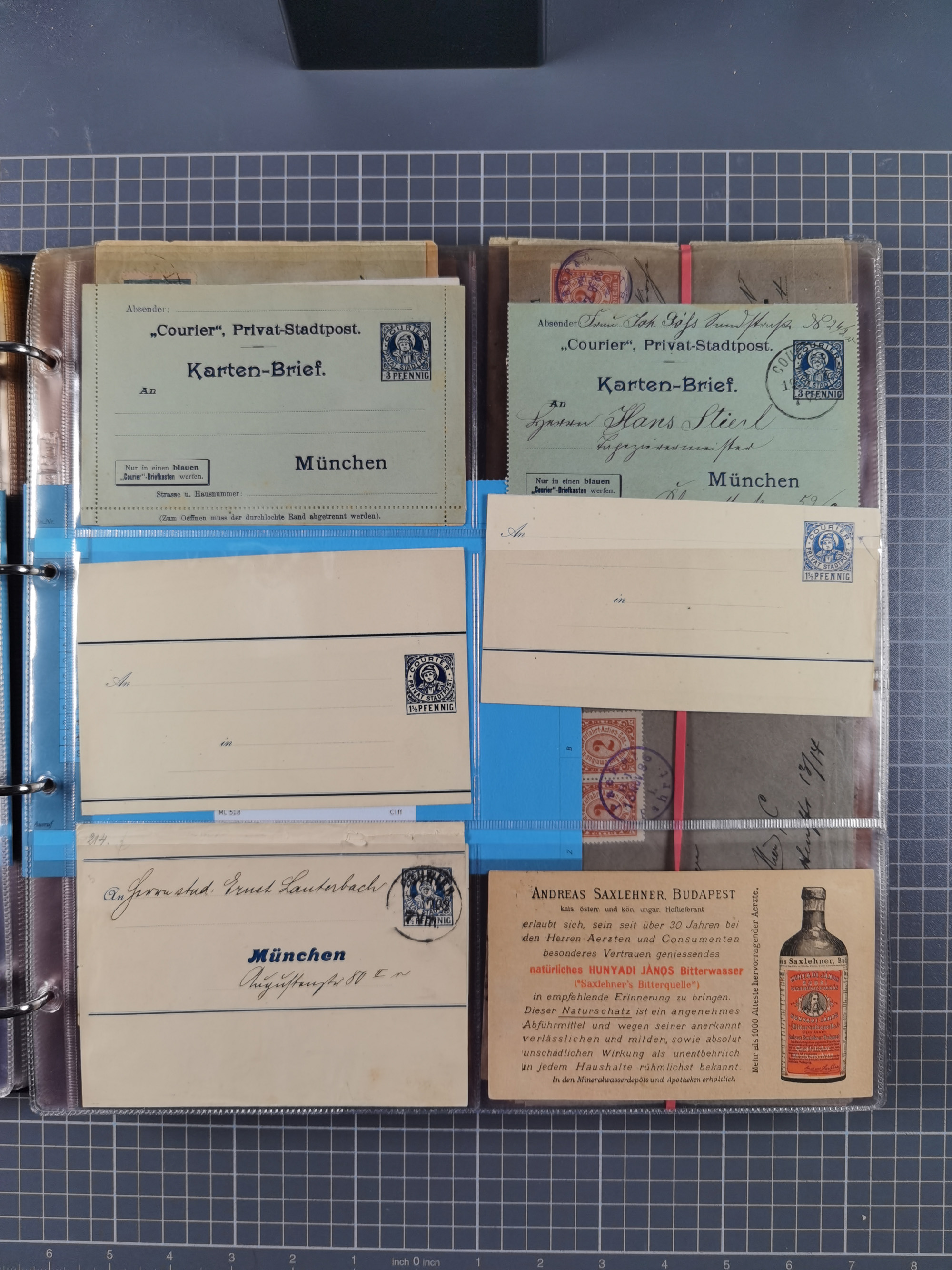 München-Courier: 1896/1900, fast 40 Briefe, Karten und ungebrauchte/gebrauchte Ganzsachenkarten. Dabei u.a. gebrauchte Privat-GSK 1½ Pfg. blau der Firma Saxlehner mit Abbildung einer Bitterwasser-Flasche, meist in guter Erhaltung