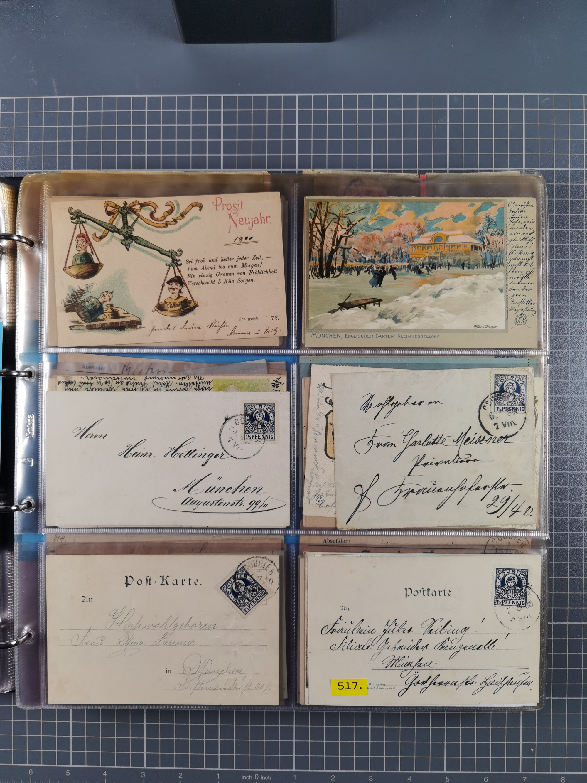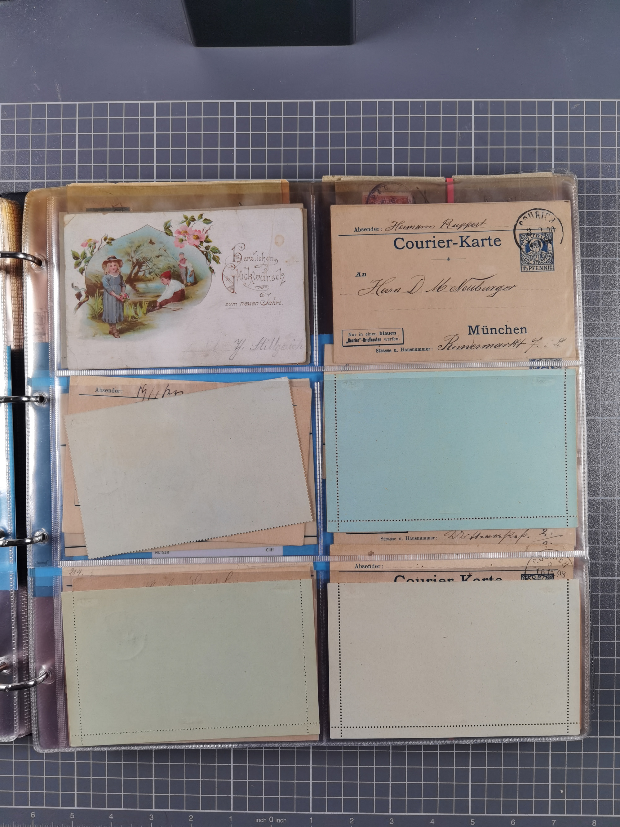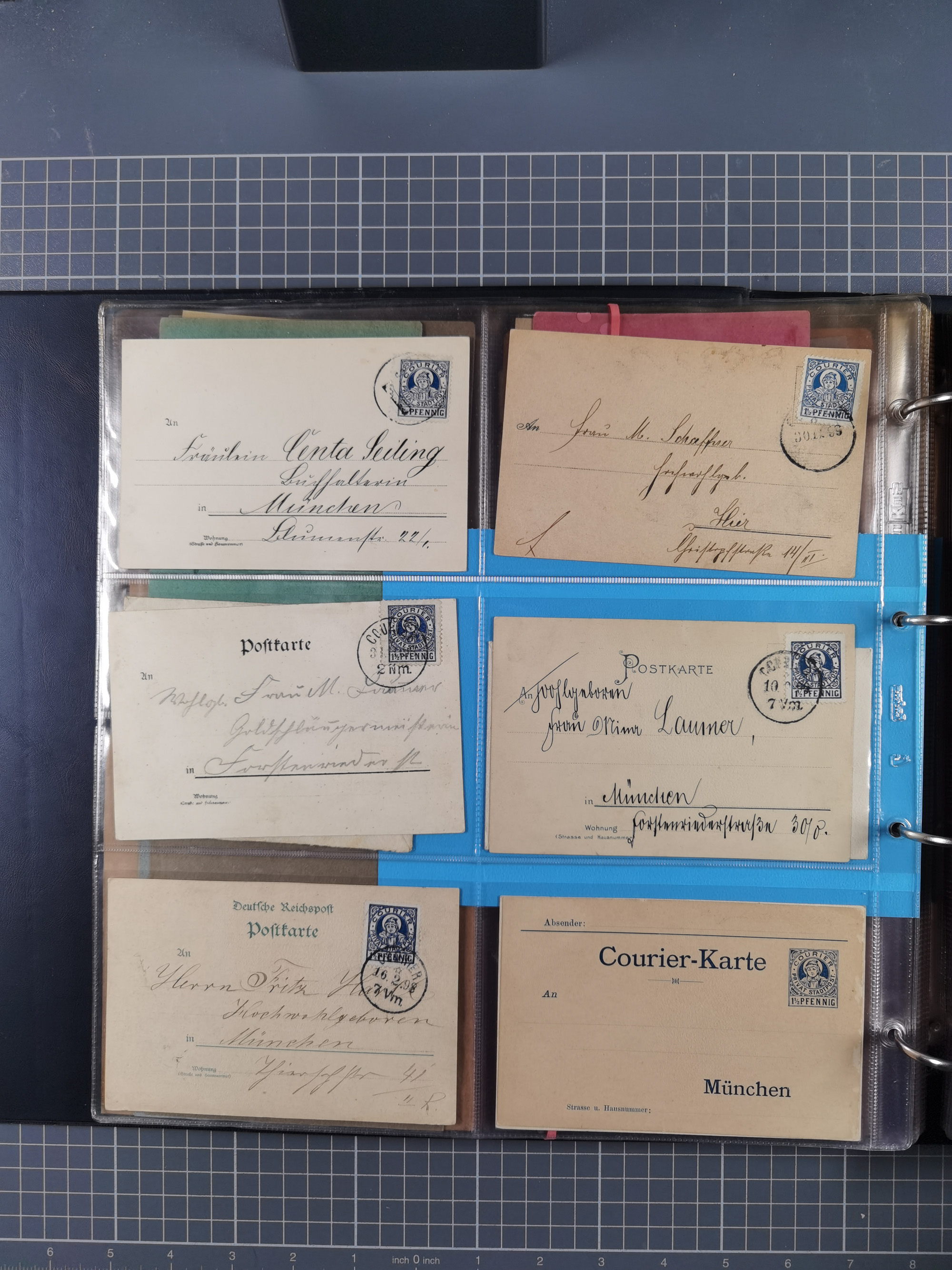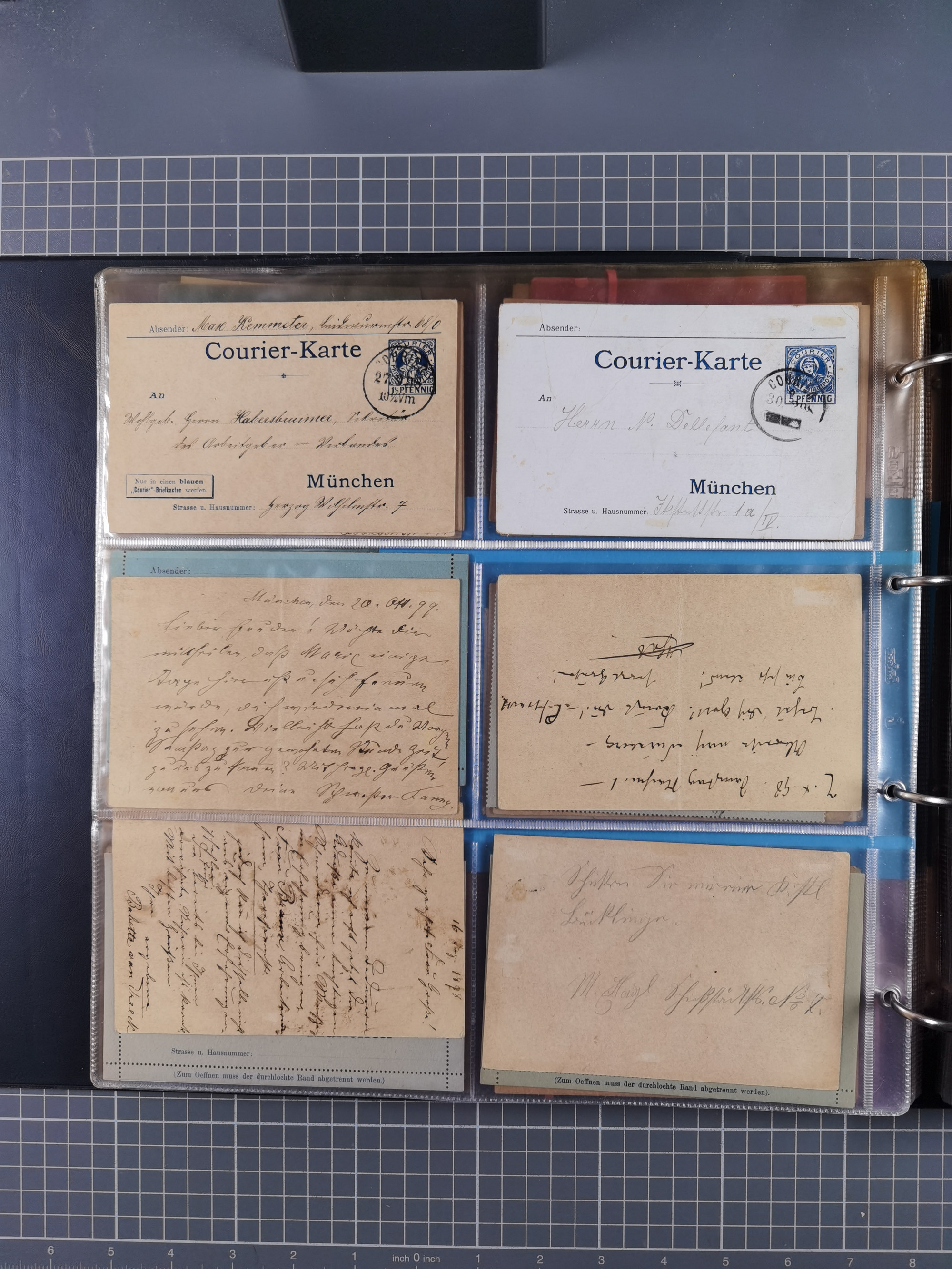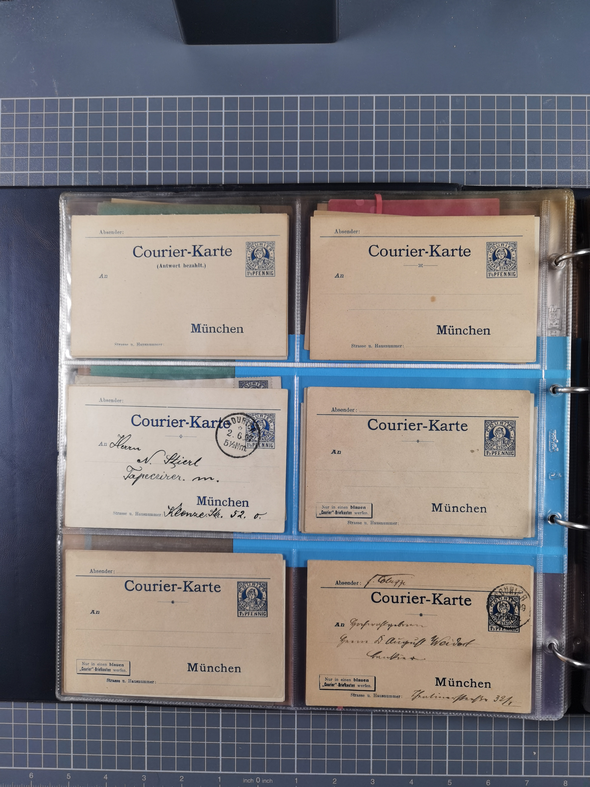 München-Courier: 1896/1900, fast 40 Briefe, Karten und ungebrauchte/gebrauchte Ganzsachenkarten. Dabei u.a. gebrauchte Privat-GSK 1½ Pfg. blau der Firma Saxlehner mit Abbildung einer Bitterwasser-Flasche, meist in guter Erhaltung