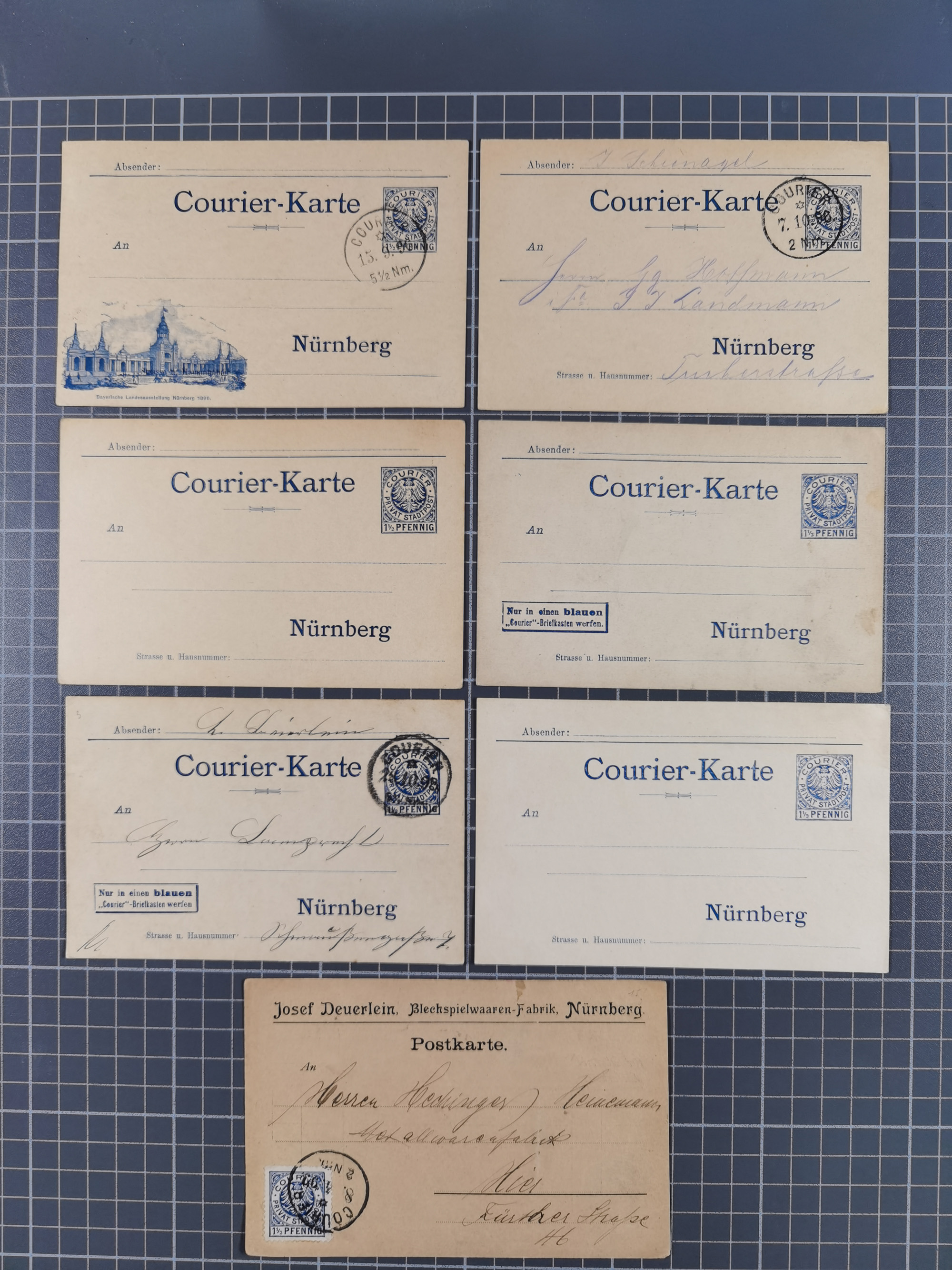 Nürnberg-Courier: 1895/1900, Partie mit 21 Briefen, Karten und ungebrauchten/gebrauchten Ganzsachen. Dabei u.a. Ganzsachenkarte 1½ Pfg. mit vorderseitigem Bildzudruck “Bayerische Landesausstellung Nürnberg 1896” (Blanko-Stempel), meist in guter Erhaltung