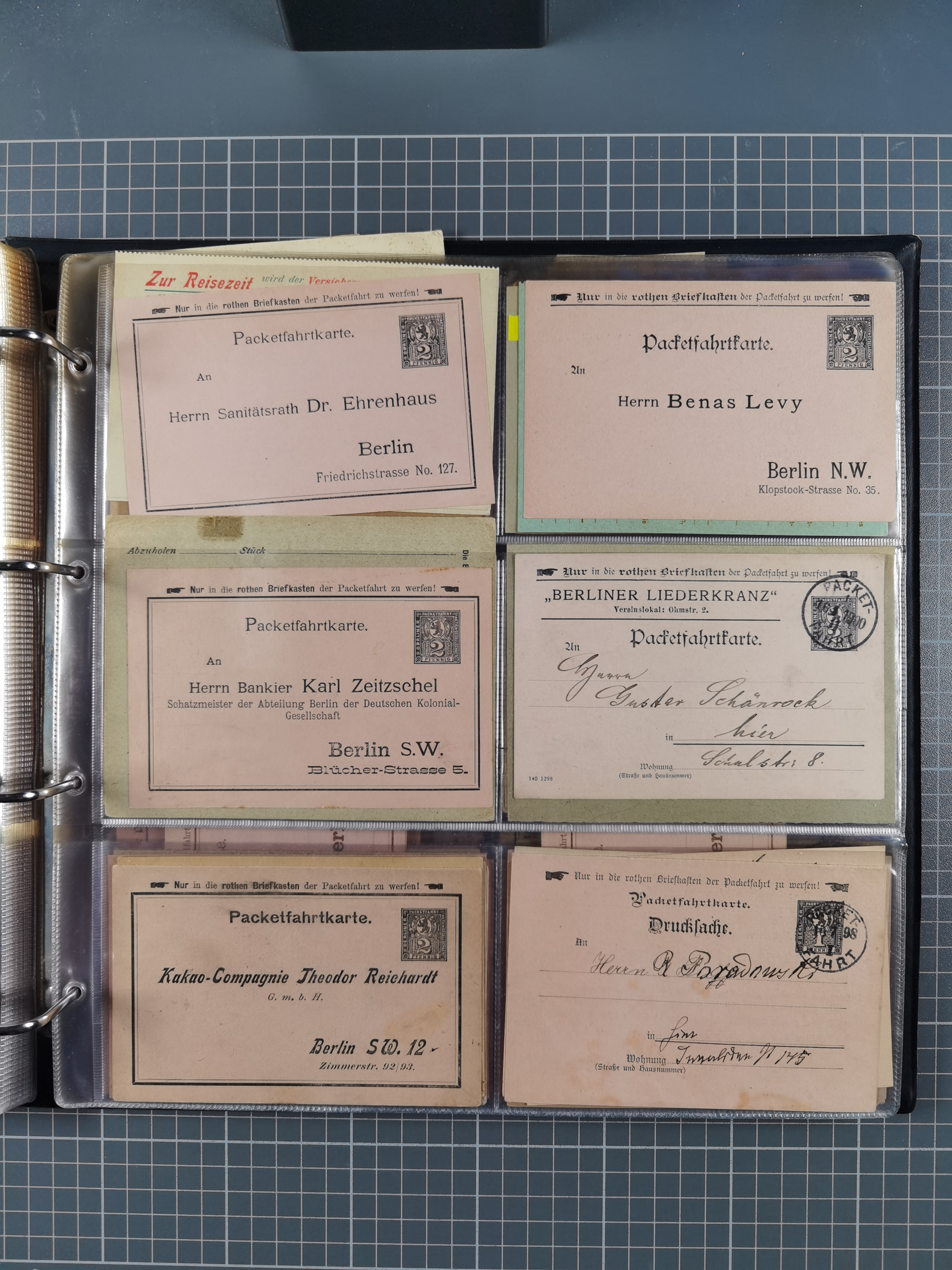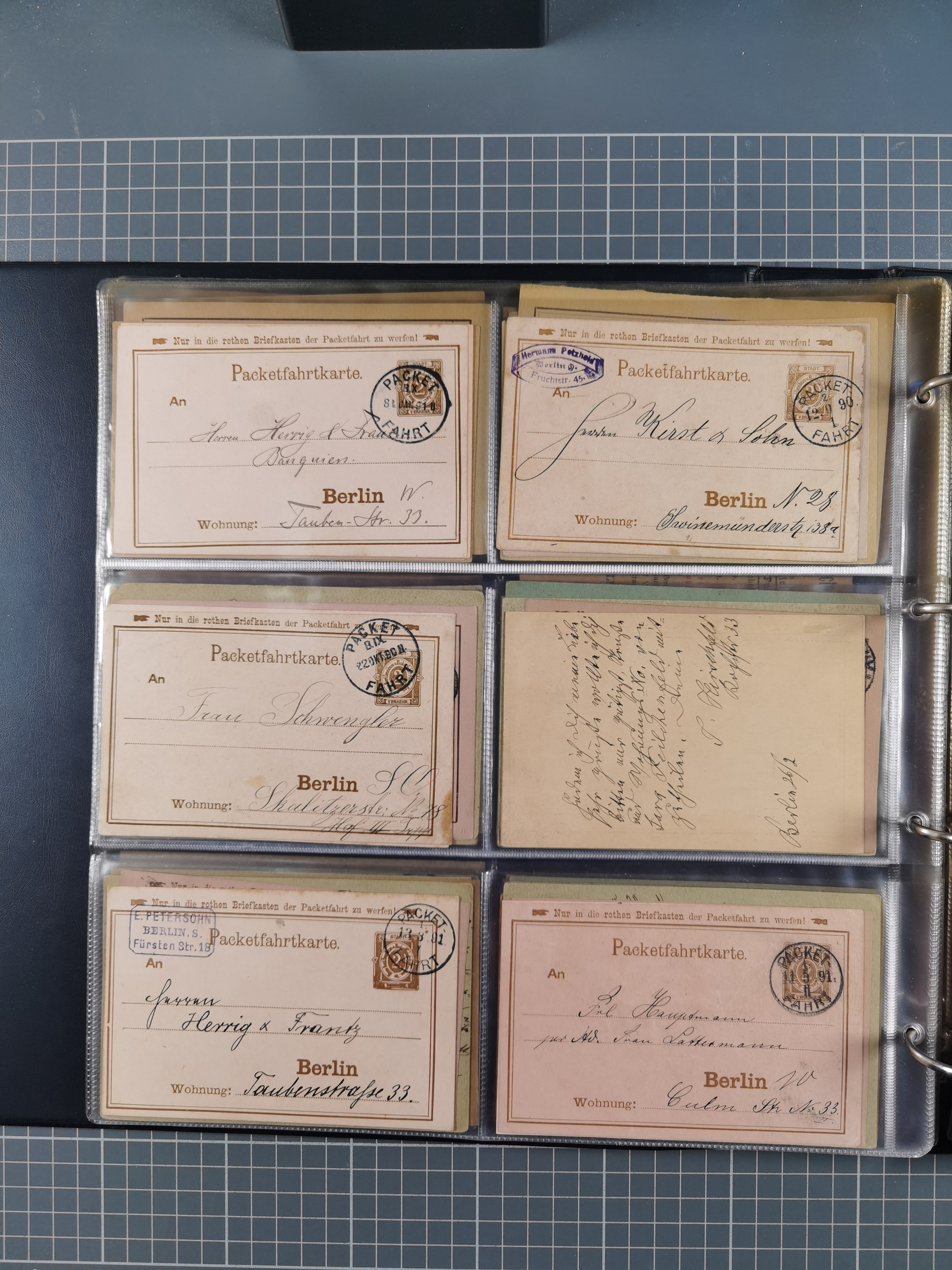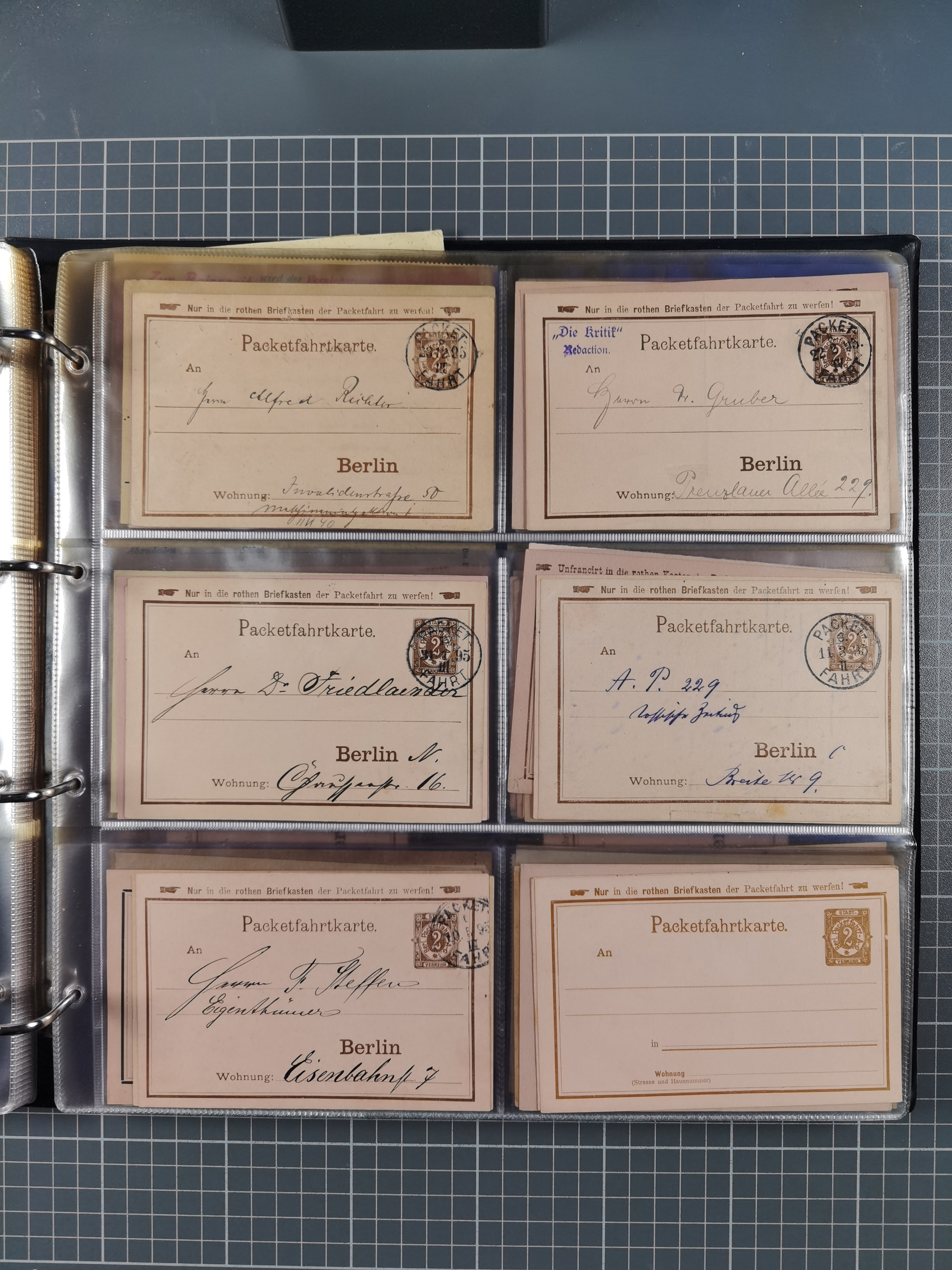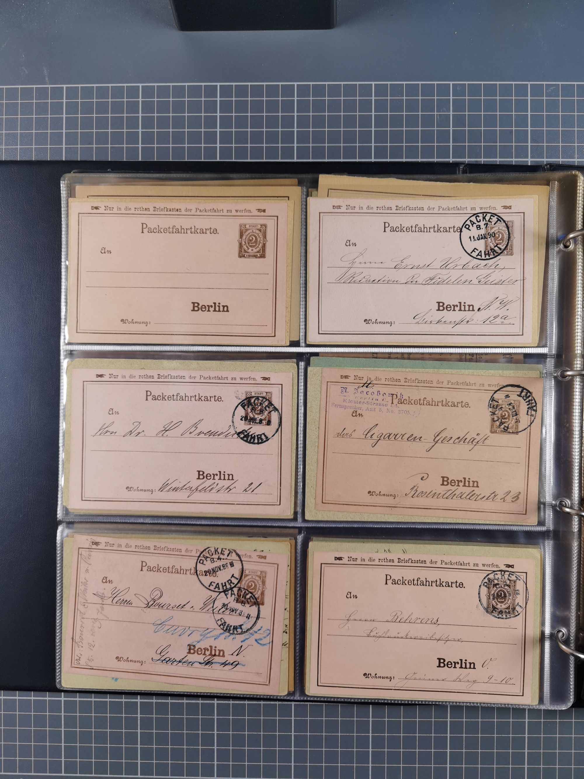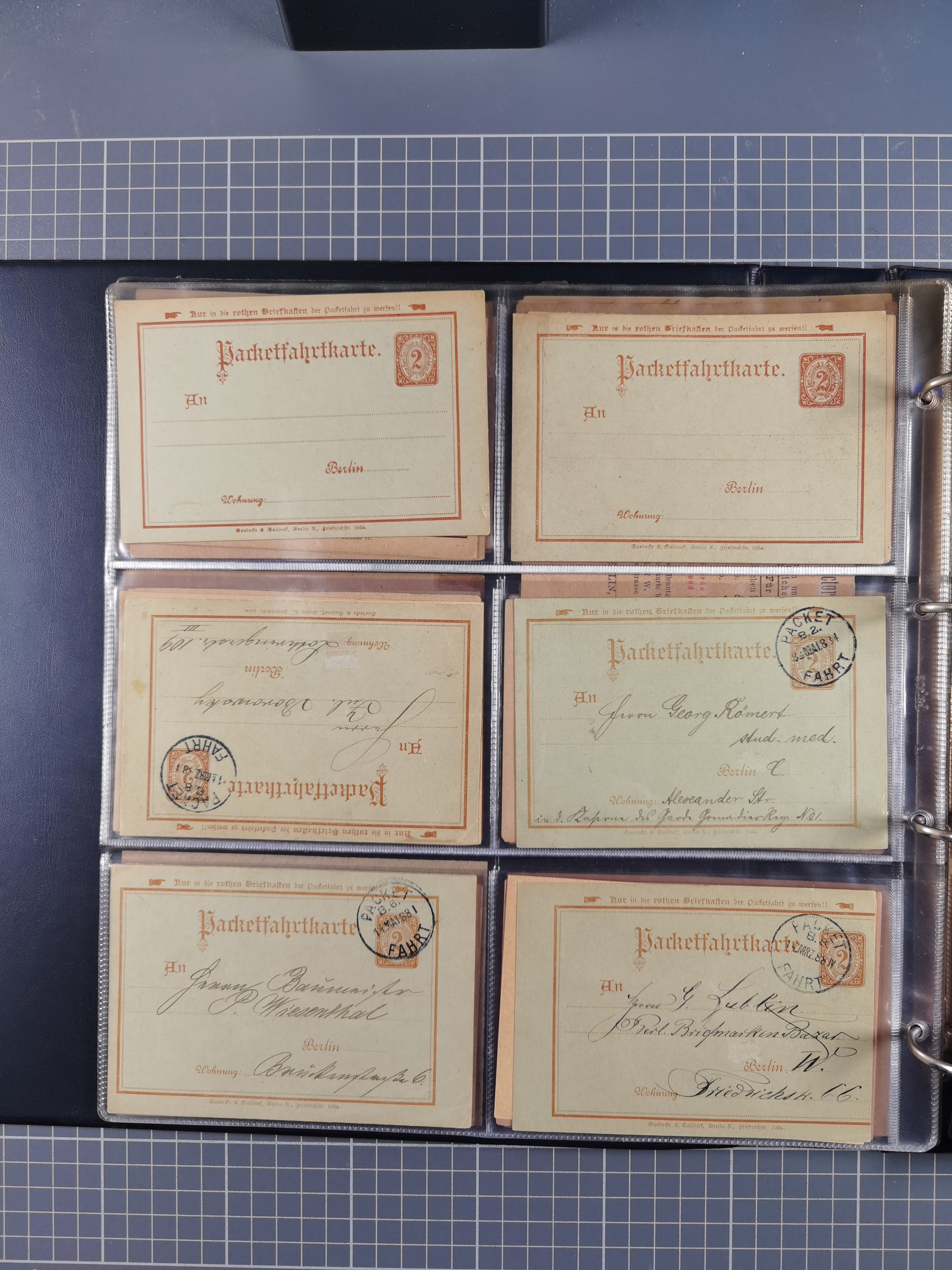 Berlin-Berliner Packetfahrt-Gesellschaft: 1886/1902, interessante Sammlung “Ganzsachenkarten und Streifbänder” mit ca.290 ungebrauchten und gebrauchten Ganzsachen. Dabei u.a. P46Z gebraucht, P60b mt Bild “Kgl. Schloss u.Denkmal des Grossen Kurfürst” und PP556 ungebraucht, dazu viele Karten auf Privatbestellung inkl. Doppeltkarten, Werbungen usw.