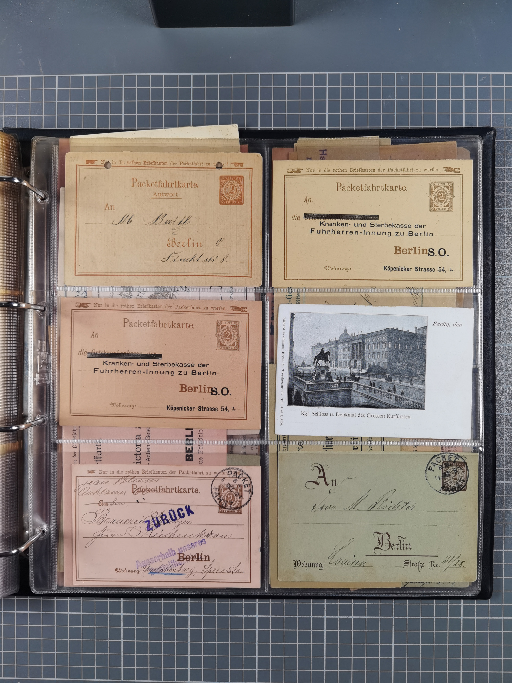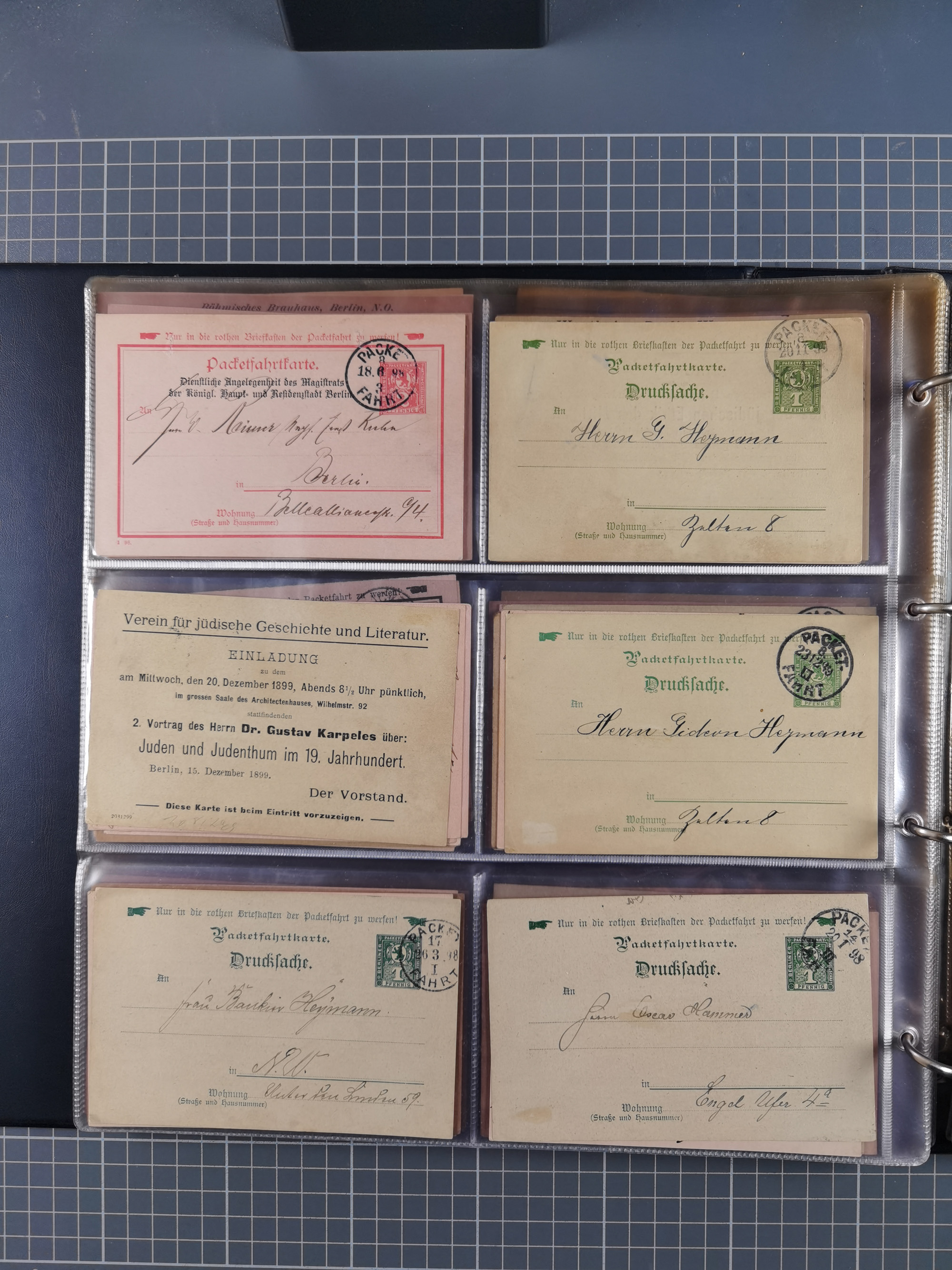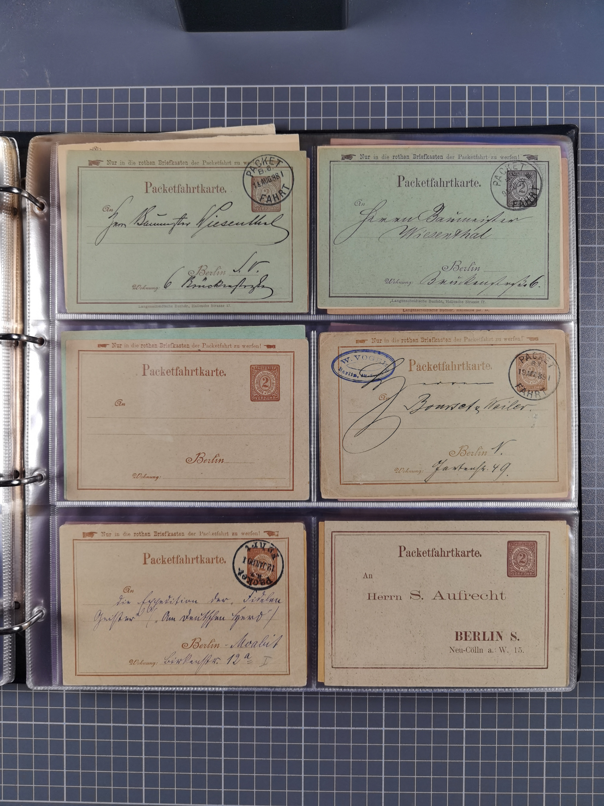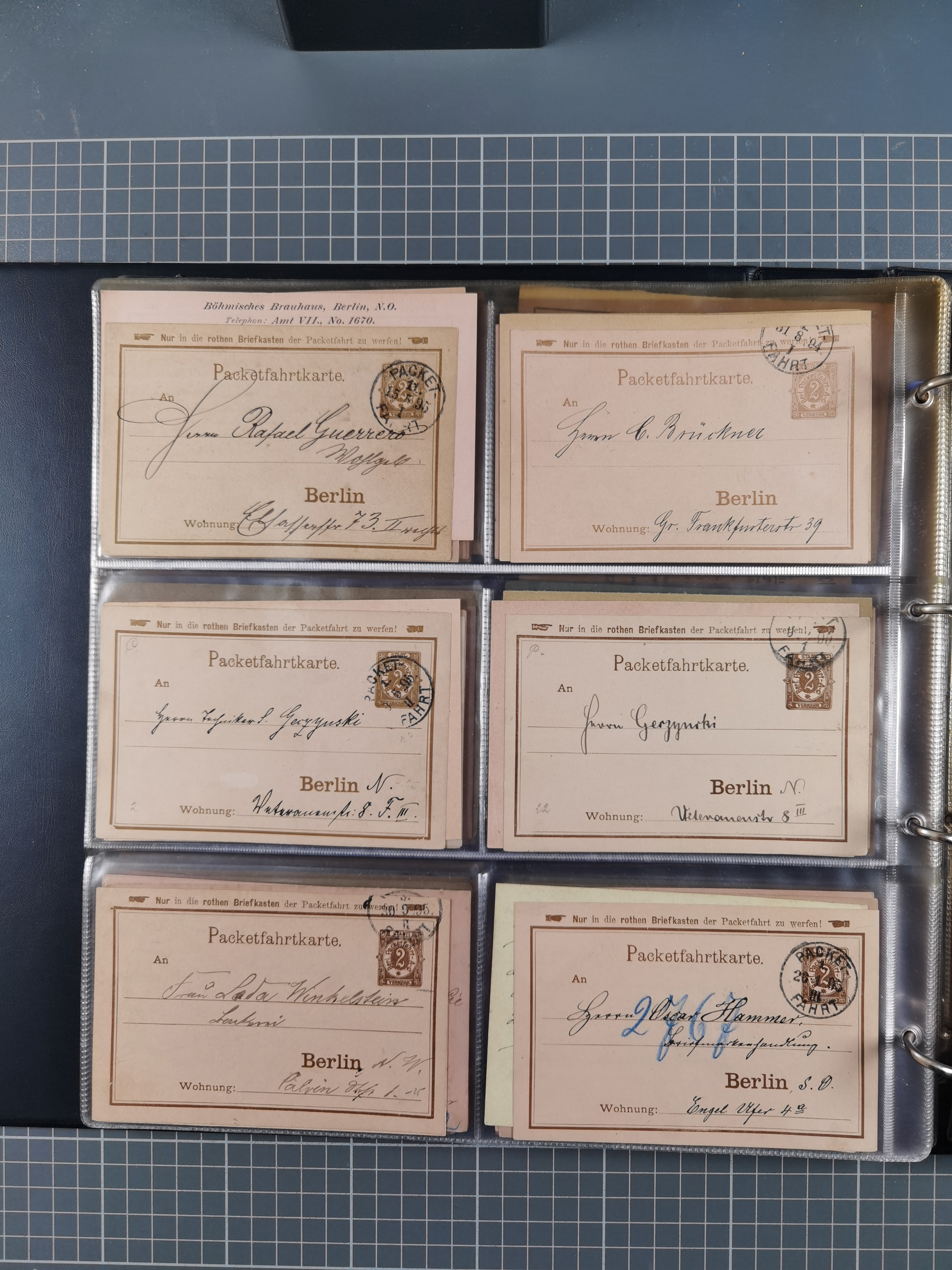 Berlin-Berliner Packetfahrt-Gesellschaft: 1886/1902, interessante Sammlung “Ganzsachenkarten und Streifbänder” mit ca.290 ungebrauchten und gebrauchten Ganzsachen. Dabei u.a. P46Z gebraucht, P60b mt Bild “Kgl. Schloss u.Denkmal des Grossen Kurfürst” und PP556 ungebraucht, dazu viele Karten auf Privatbestellung inkl. Doppeltkarten, Werbungen usw.