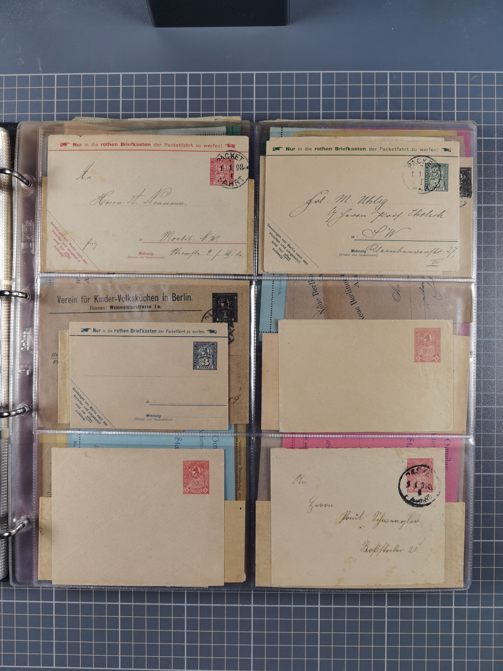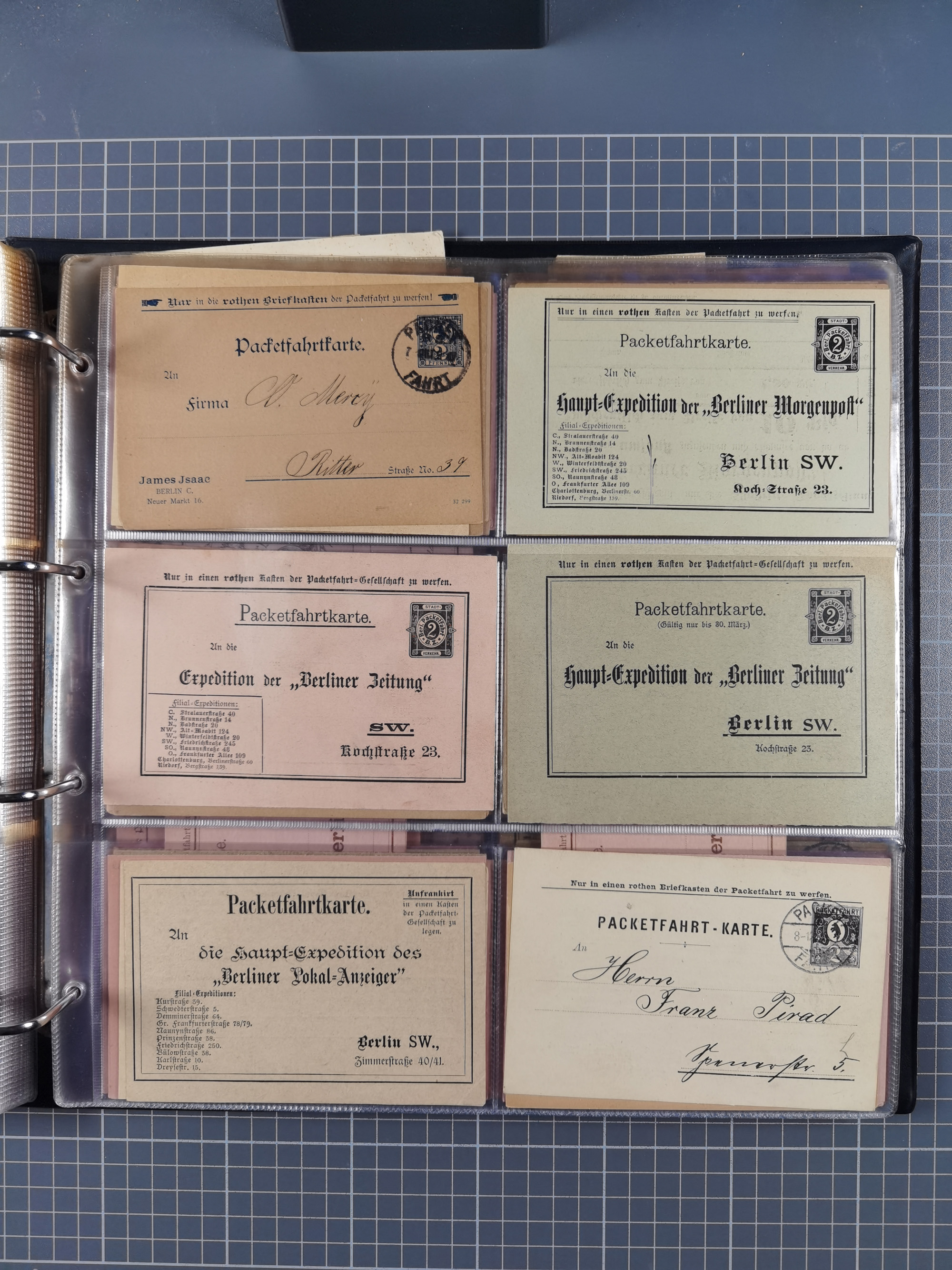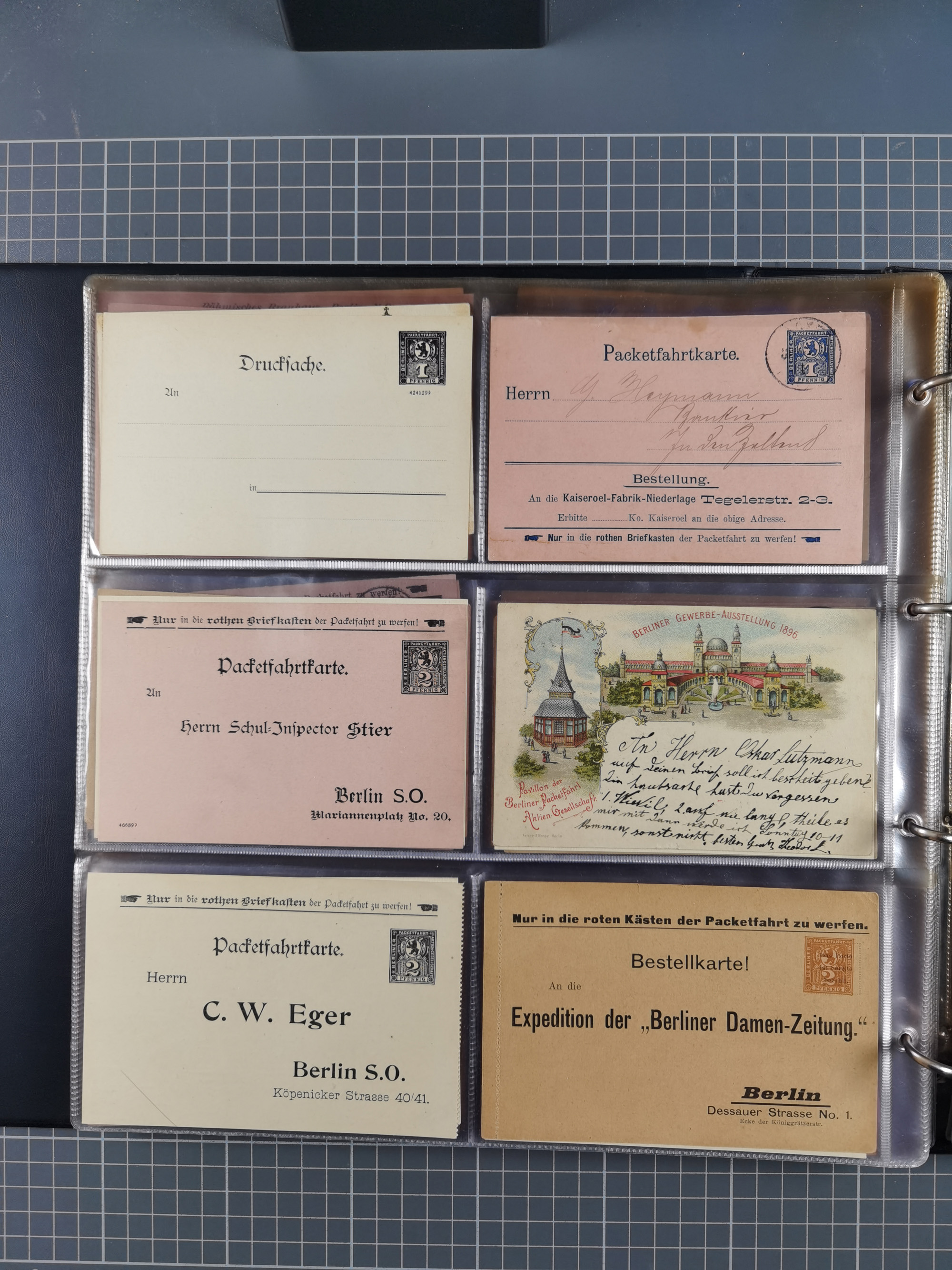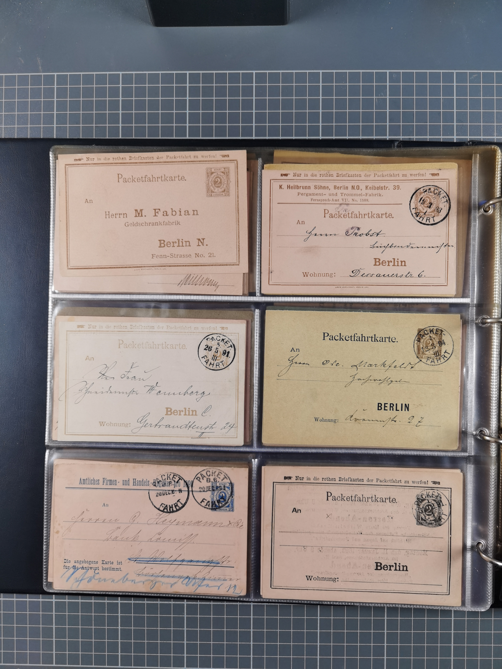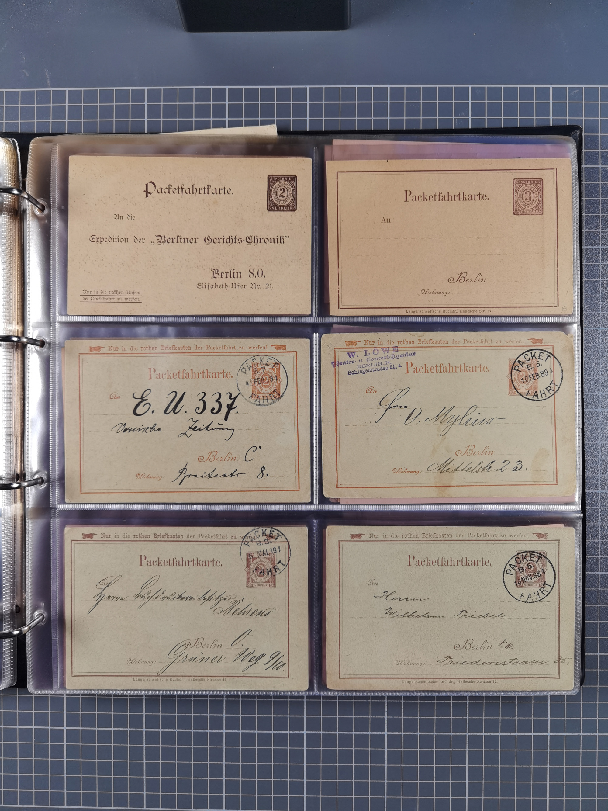 Berlin-Berliner Packetfahrt-Gesellschaft: 1886/1902, interessante Sammlung “Ganzsachenkarten und Streifbänder” mit ca.290 ungebrauchten und gebrauchten Ganzsachen. Dabei u.a. P46Z gebraucht, P60b mt Bild “Kgl. Schloss u.Denkmal des Grossen Kurfürst” und PP556 ungebraucht, dazu viele Karten auf Privatbestellung inkl. Doppeltkarten, Werbungen usw.