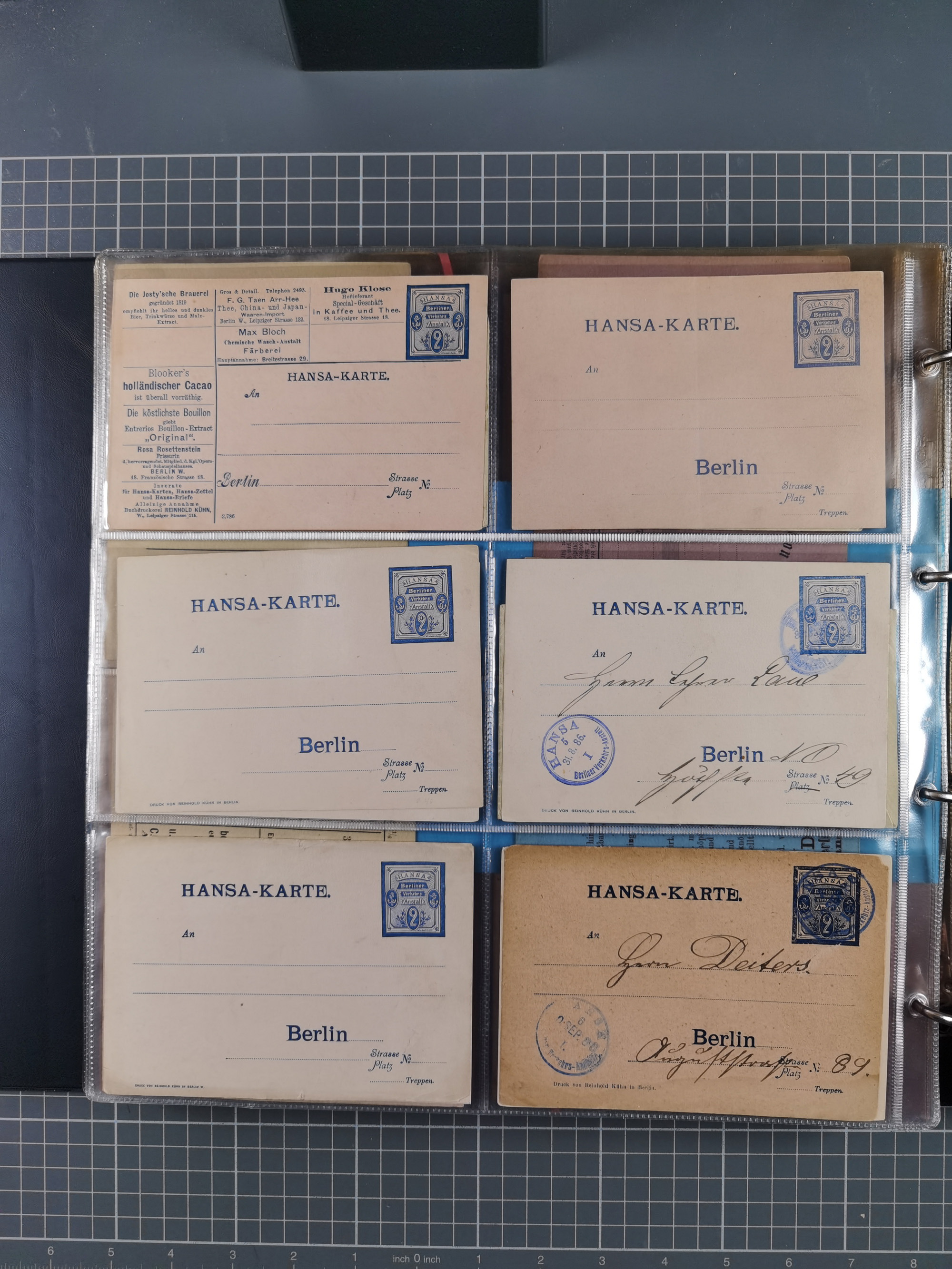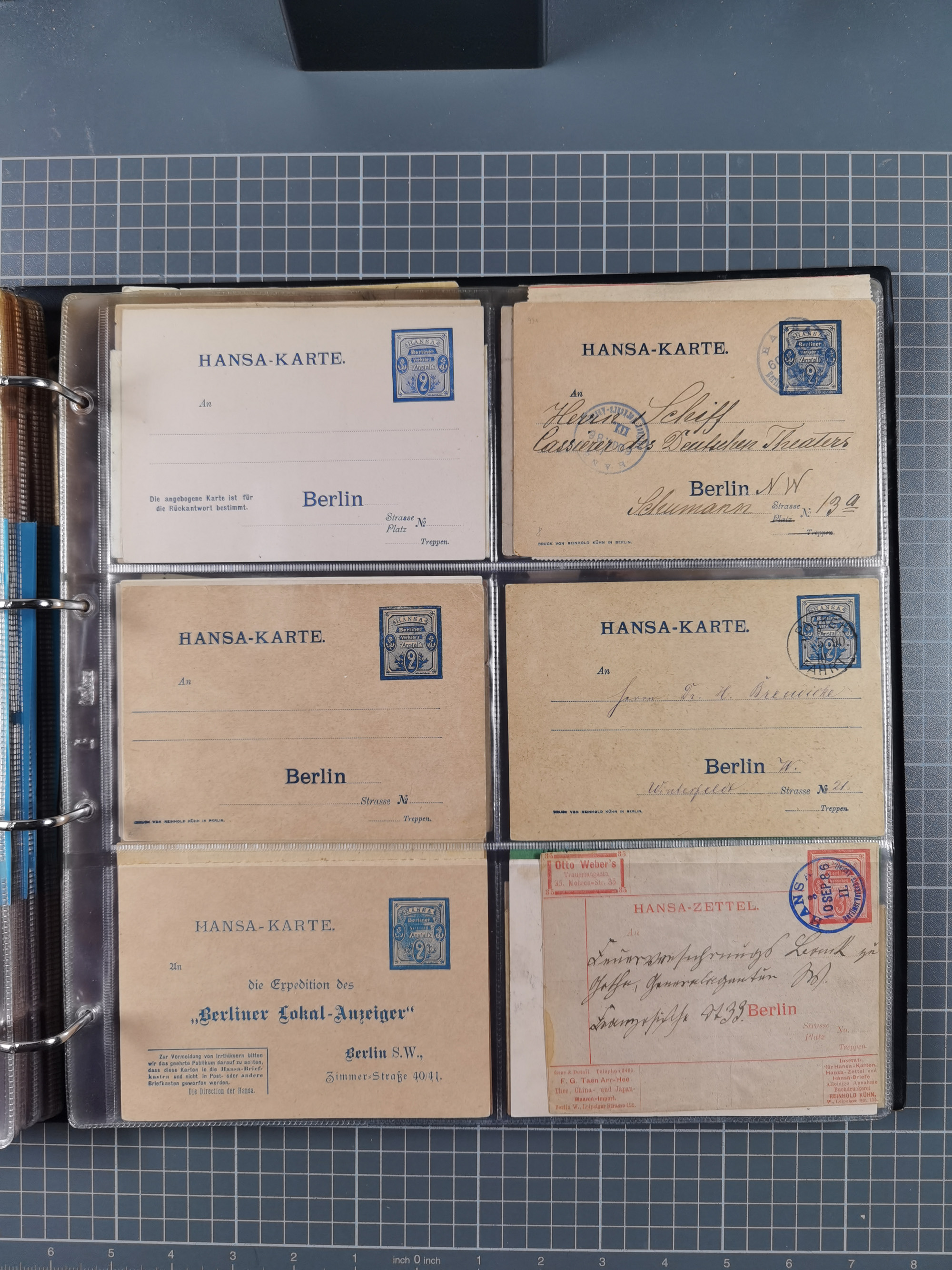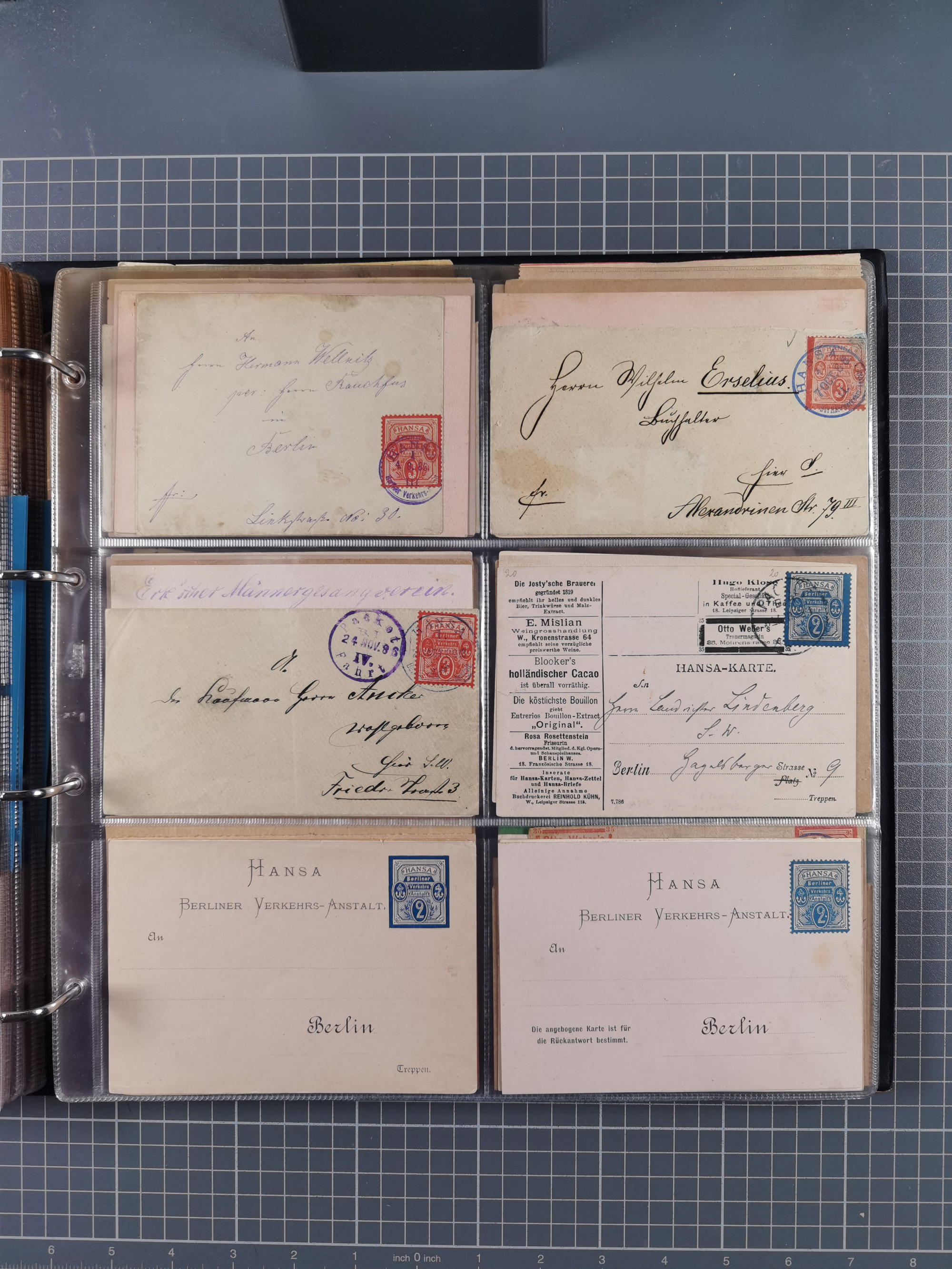 Berlin: 1873/1900, Sammlung diverser Anstalten mit Schwerpunkt bei der “HANSA” und “Berliner Verkehrs-Anstalt” mit ca. 160 Briefen, Karten und ungebrauchten/gebrauchten Ganzdsachen. Dabei u.a. Brief- und Druckschriften-Expedition Mi.-Nr. 1 auf Drucksachen-Doppelkarte, Hansa mit Franko-Stempe 1886 auf Postkarte, Berliner Privatpost und Spedition A.G. mit mehreren GSK auf Privatbestellung, K5 gebraucht und GU1 gebraucht mit farbiger Glückwunsch-Einlage