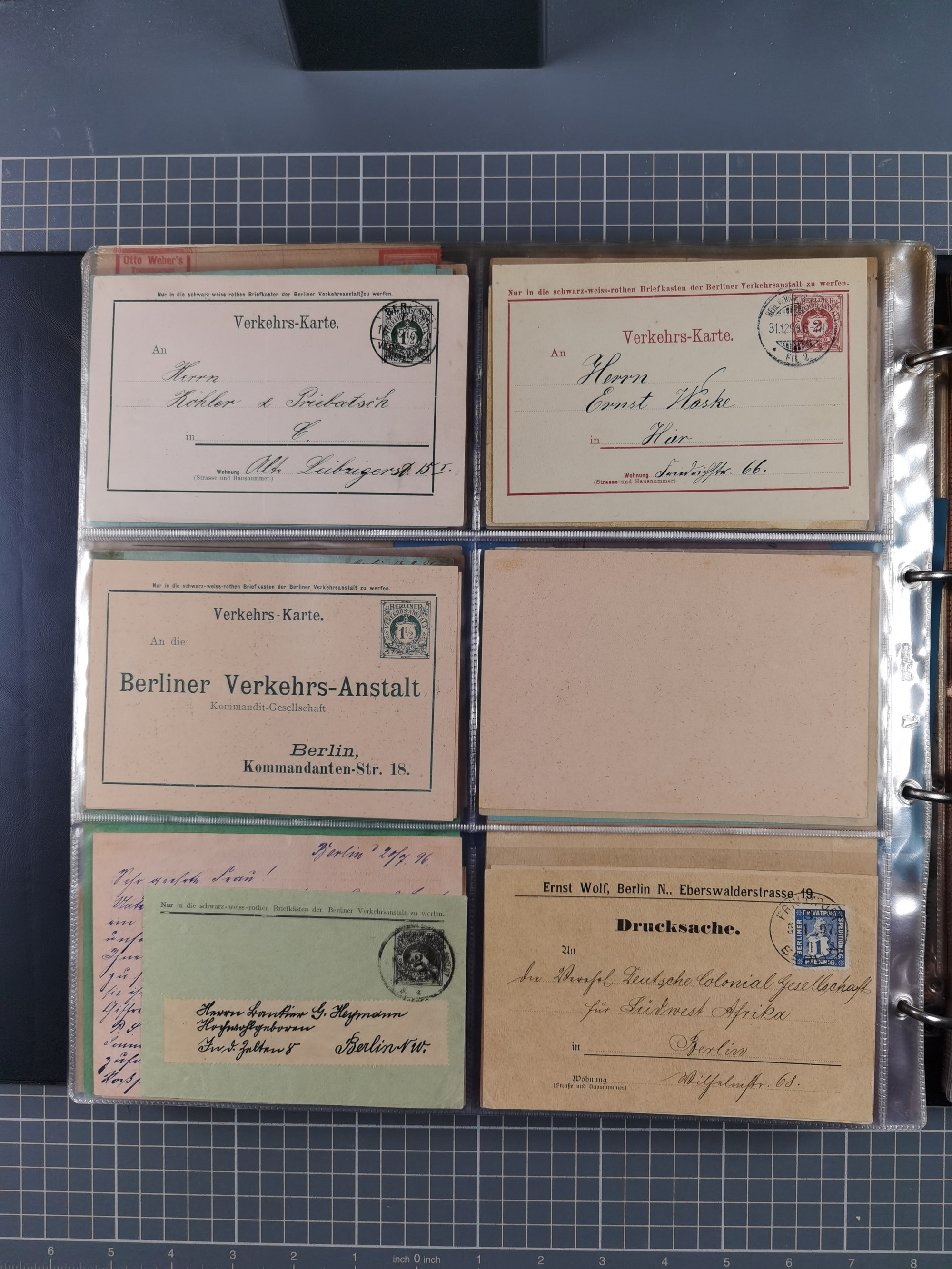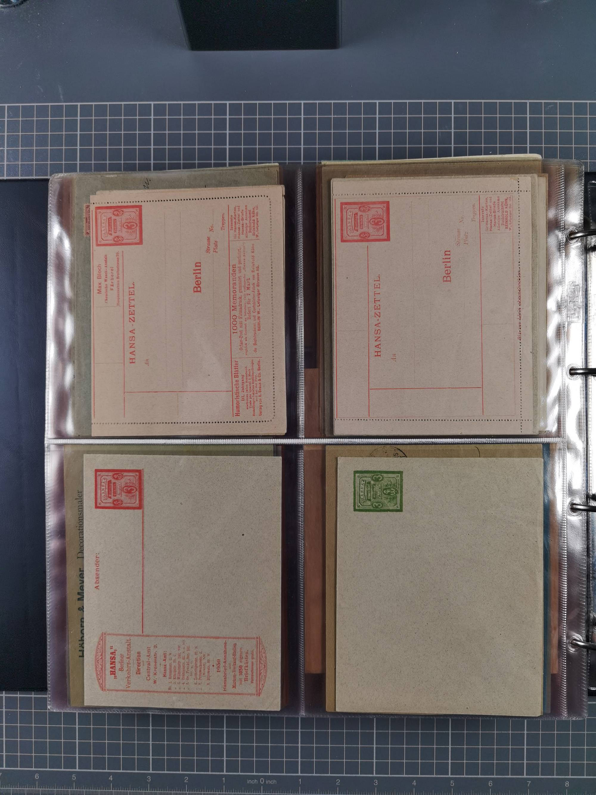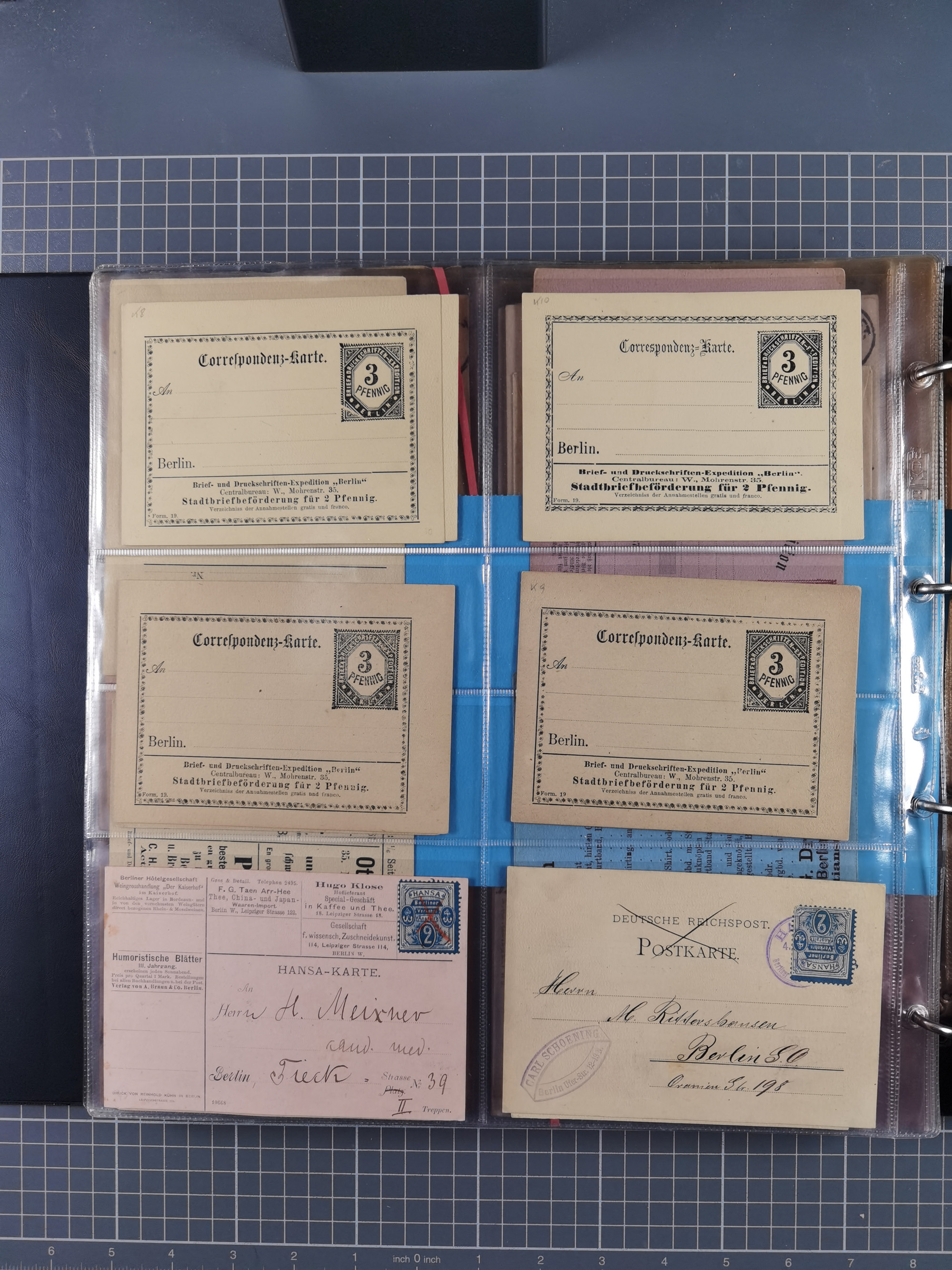 Berlin: 1873/1900, Sammlung diverser Anstalten mit Schwerpunkt bei der “HANSA” und “Berliner Verkehrs-Anstalt” mit ca. 160 Briefen, Karten und ungebrauchten/gebrauchten Ganzdsachen. Dabei u.a. Brief- und Druckschriften-Expedition Mi.-Nr. 1 auf Drucksachen-Doppelkarte, Hansa mit Franko-Stempe 1886 auf Postkarte, Berliner Privatpost und Spedition A.G. mit mehreren GSK auf Privatbestellung, K5 gebraucht und GU1 gebraucht mit farbiger Glückwunsch-Einlage