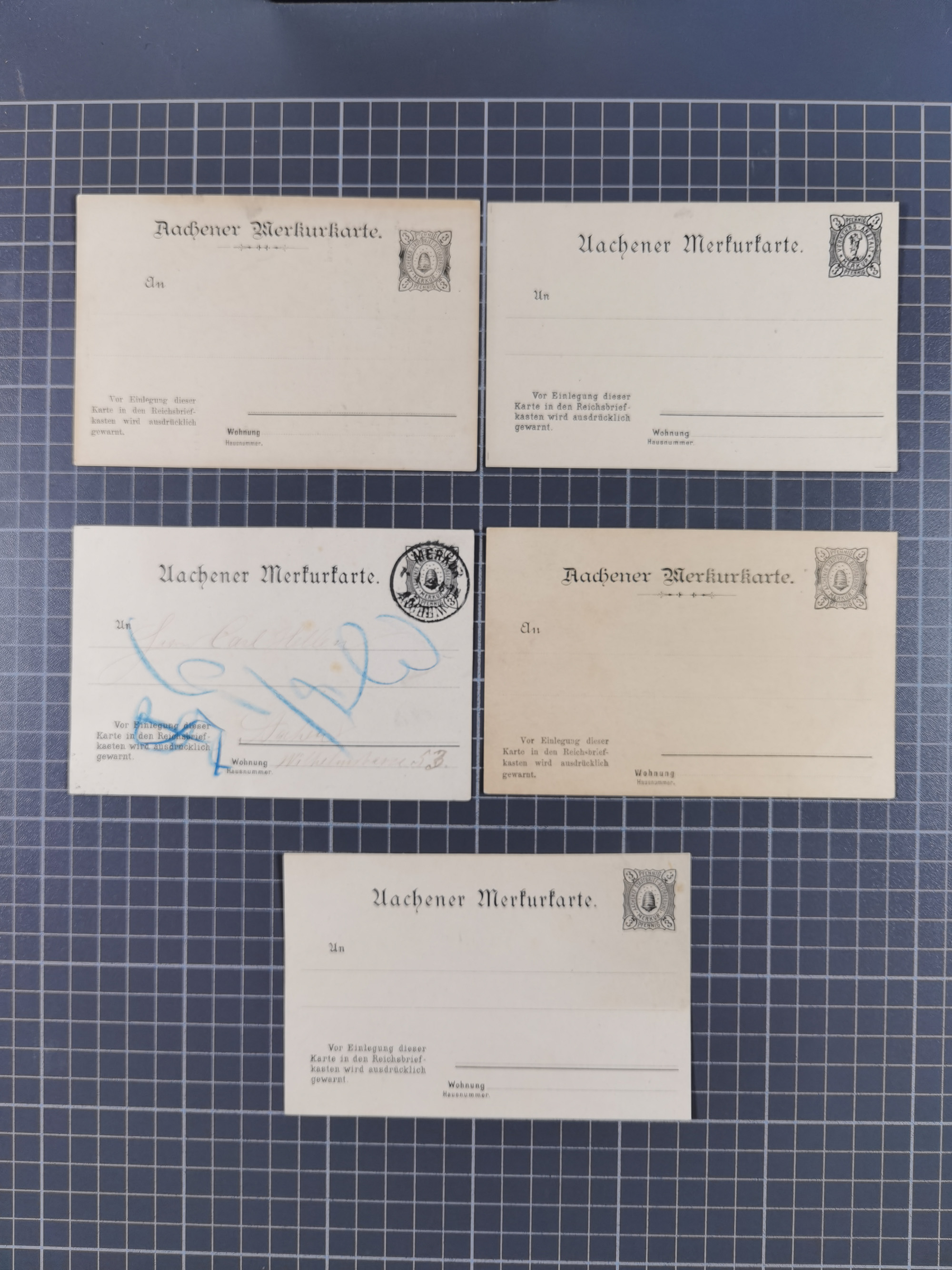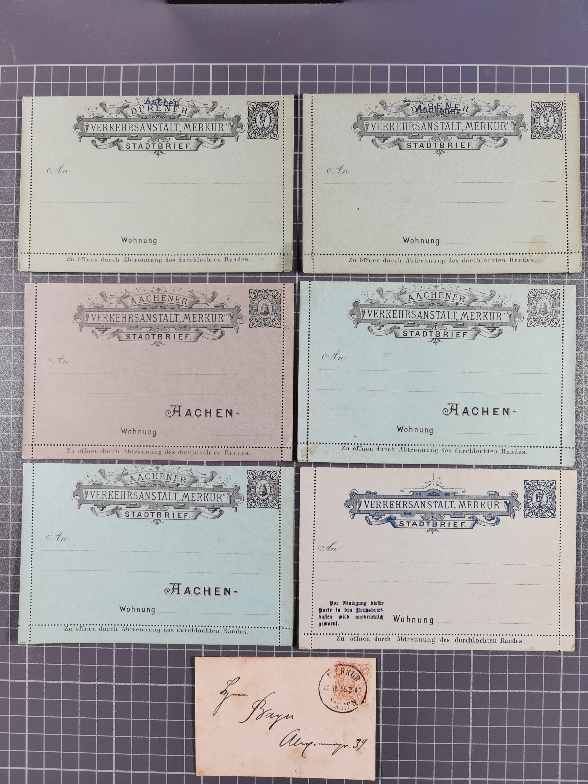 Aachen-Merkur: 1894/97, Partie mit Mi.-Nr. 2 auf Ortsbrief und mit 11 ungebrauchten und einer gebrauchten Ganzsache. Dabei P1 gebraucht mit viel Text und K2II und IV ungebraucht, meist in guter Erhaltung