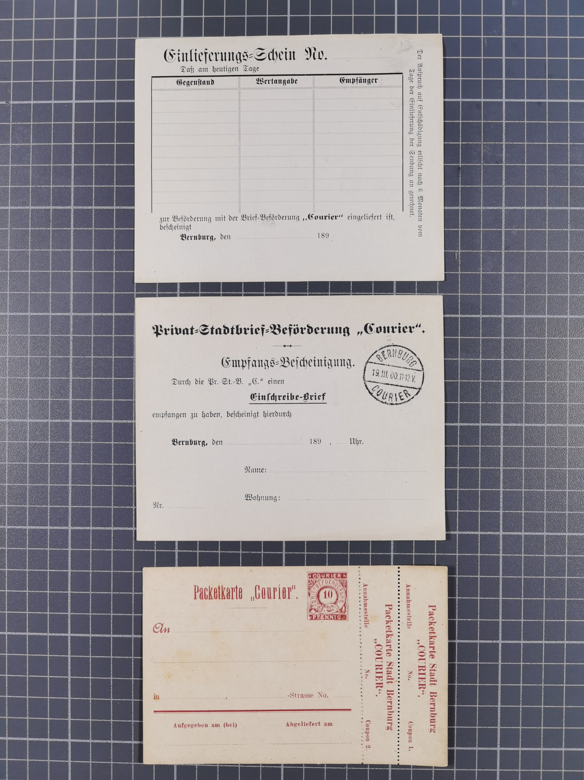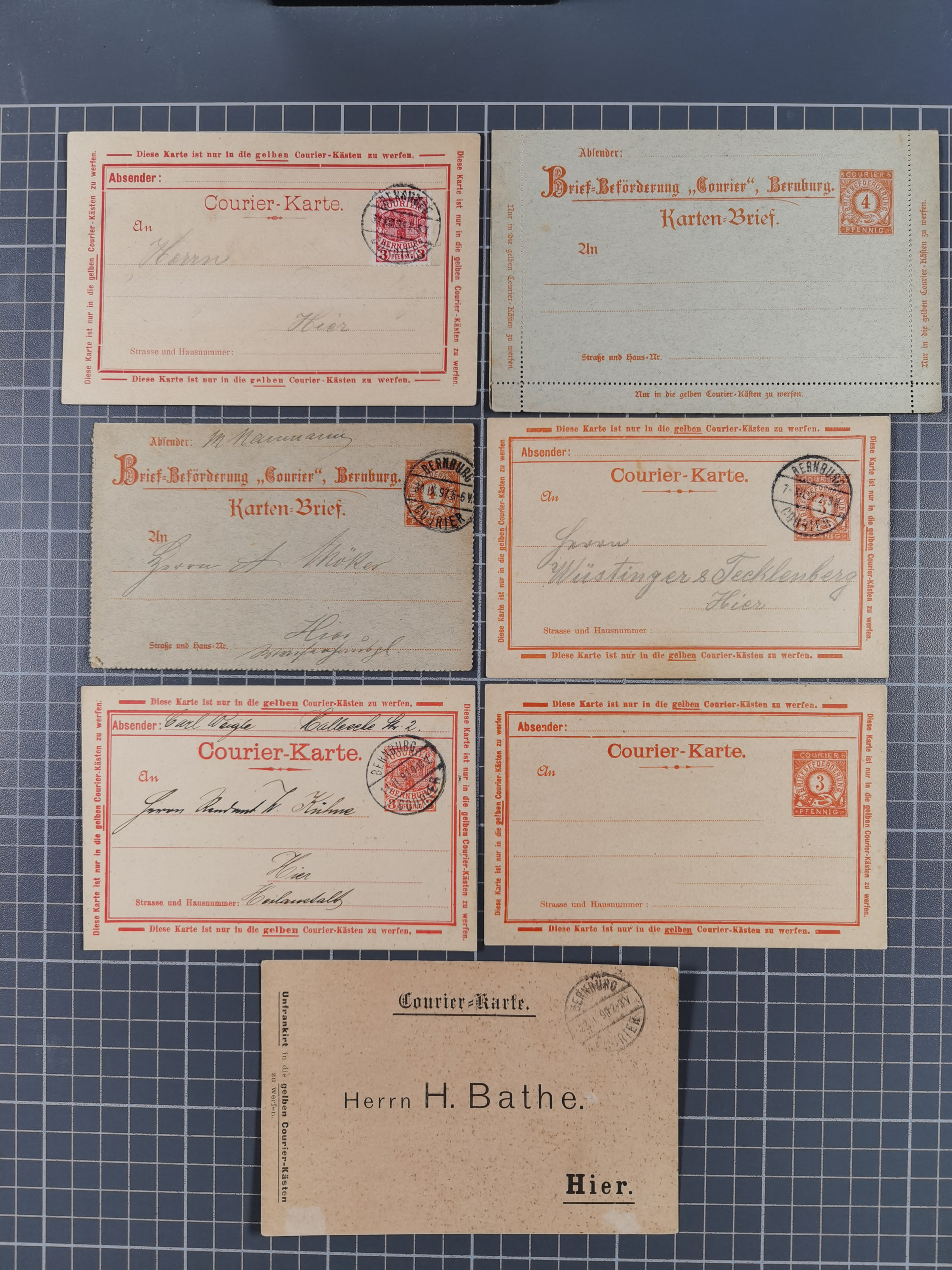 Bernburg-Courier: 1897/1900, Partie mit Mi.-Nr. 2 auf PF1 (Text und Teil der Adresse radiert), sechs ungebrauchte und gebrauchte Ganzsachen und drei Formulare bzw. Vordruckkarte. Dabei u.a. P1 und P2 gebraucht, PPF1 gebraucht und K1 gebraucht