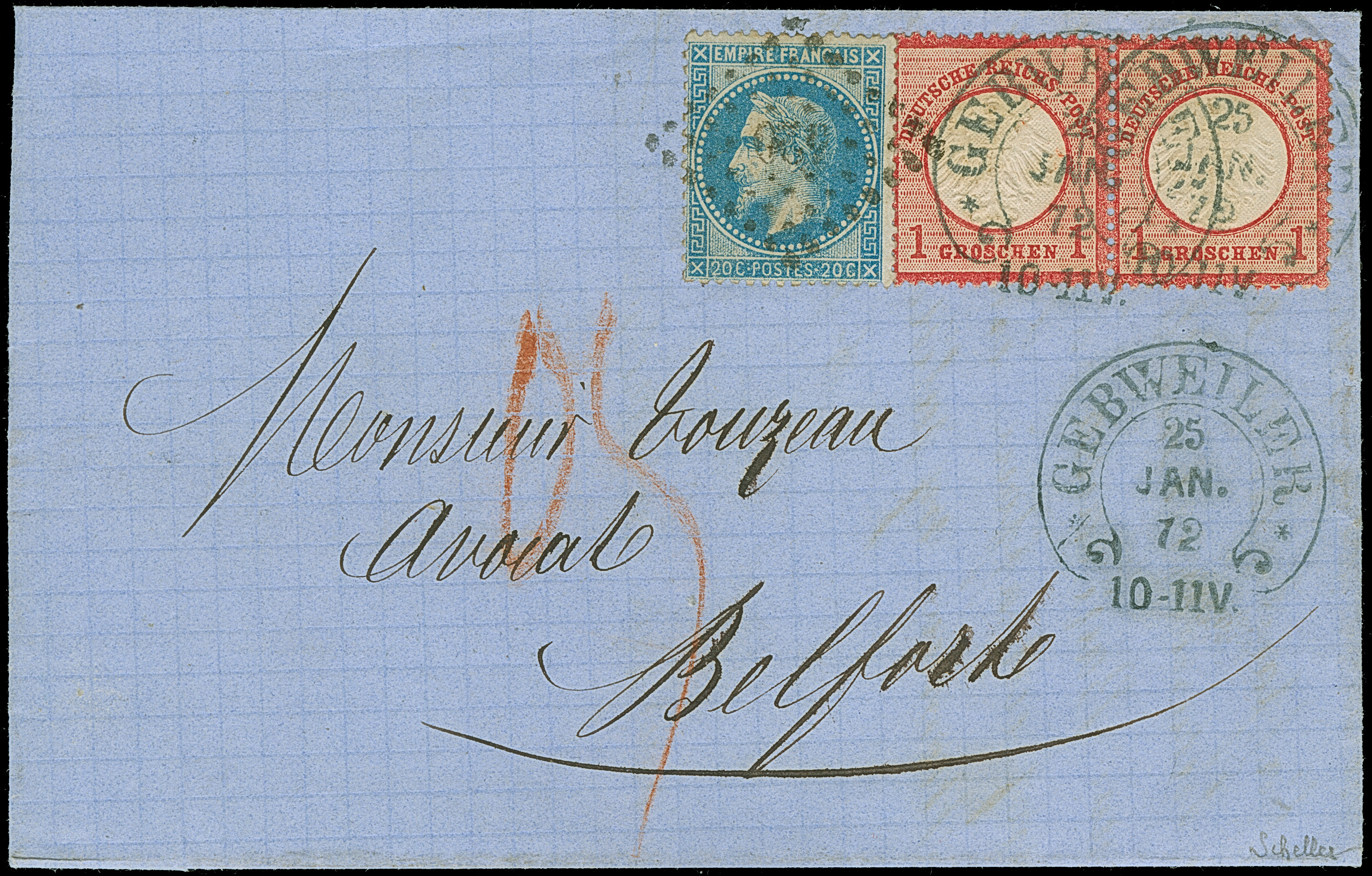 kleiner Schild 1 Gr. rotkarmin im waagerechten Paar, farbrisch, gut gezähnt und gut geprägt, sauber entwertet durch Hufeisenstempel “GEBWEILER 25 JAN. 72” (Spalink-Nr. 13) in Doppelfrankatur mit Frankreich Napoleon 20 C. blau mit PC “420” auf Faltbrief nach Belfort mit rückseitigem Ankunftsstempel, gute Erhaltung, signiert Scheller