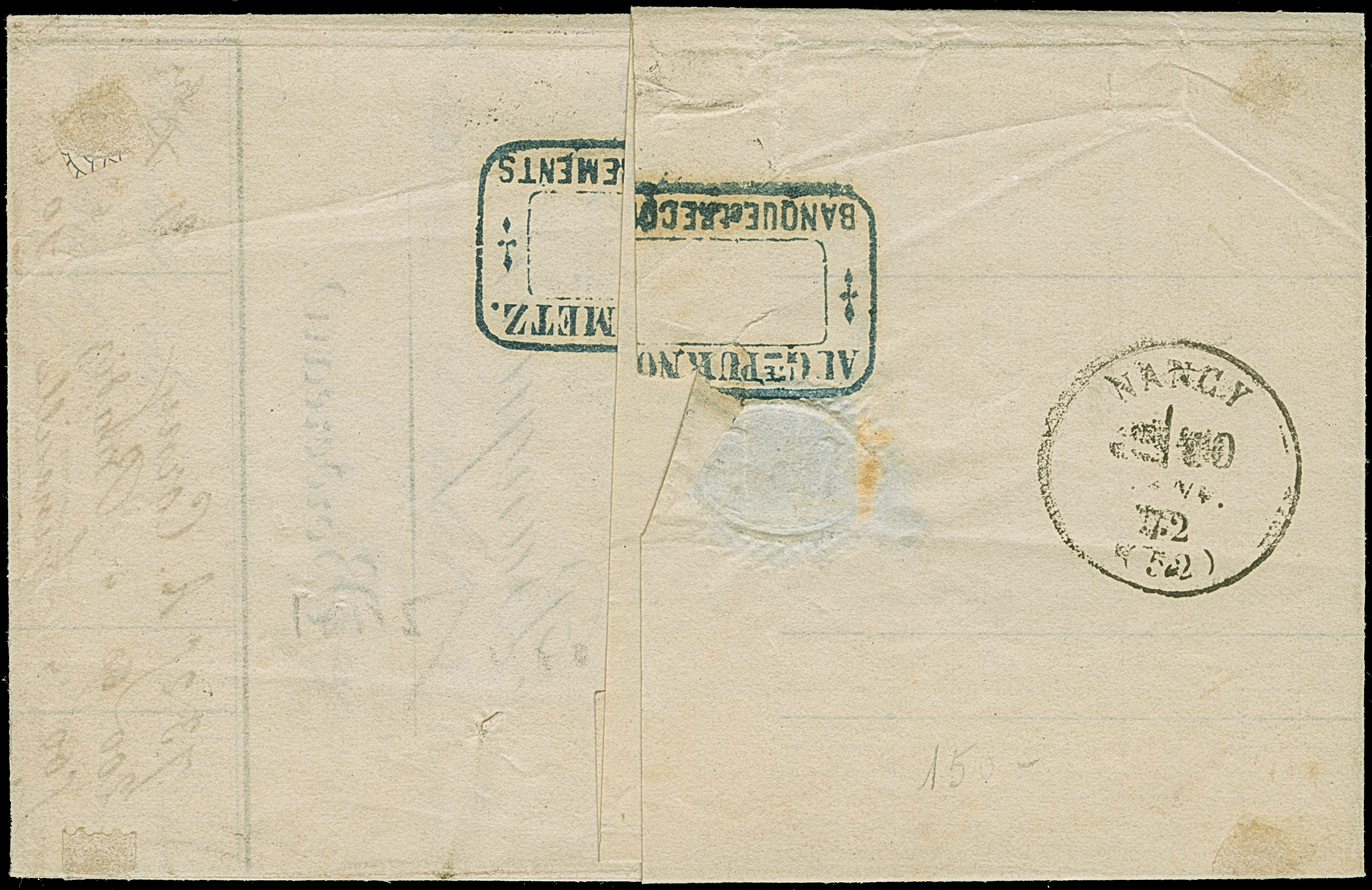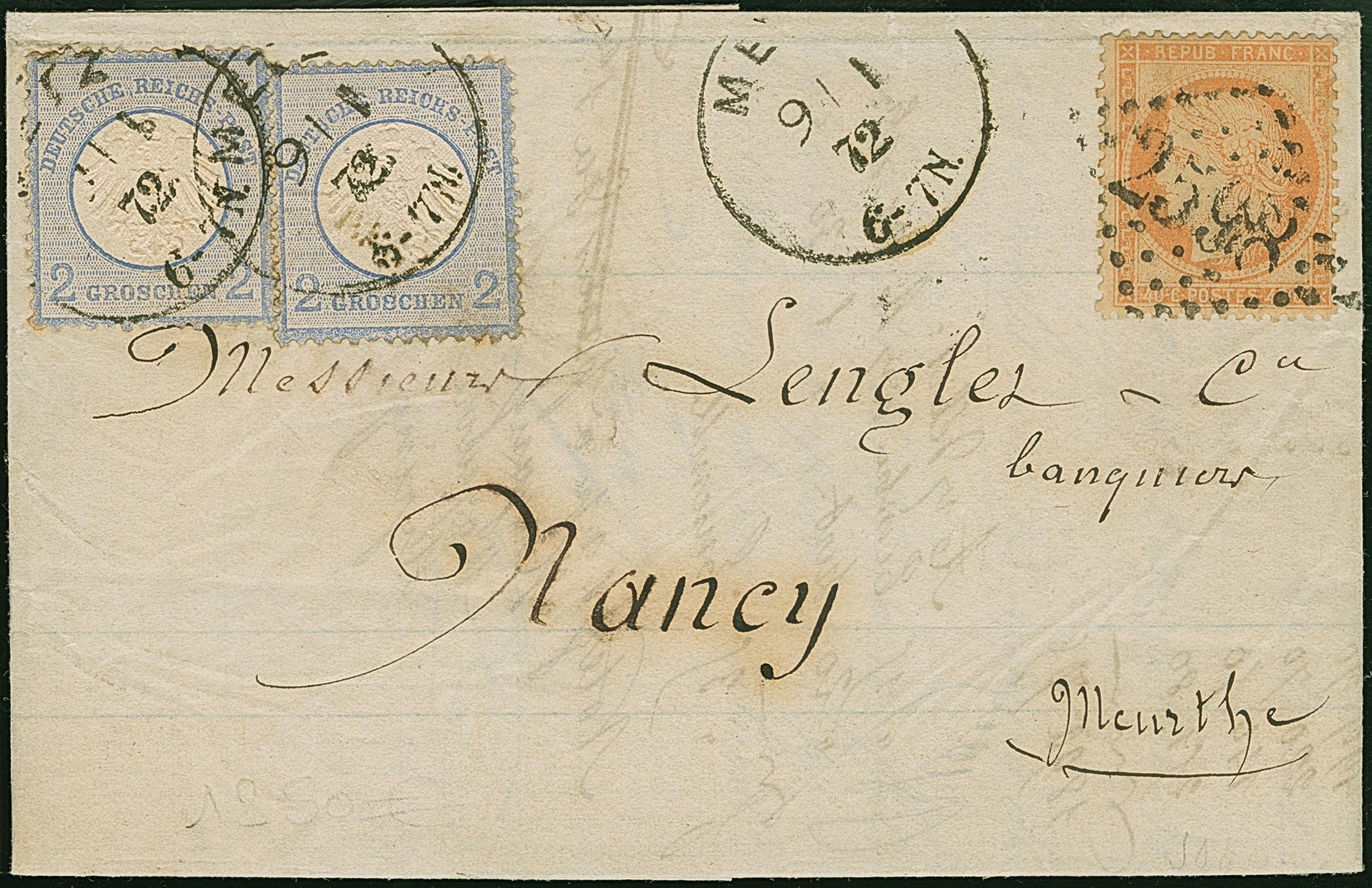 kleiner Schild 2 Gr. ultramarine, zwei Stücke, entwertet durch EKr. “METZ 9 1 72" in Doppelfrankatur mit Frankreich Cérès 40 C. orange mit PC “2598” (NANCY) auf vollständigem Faltbrief nach Nancy mit rückseitigem Ankunftsstempel, eine Brustschildmarke wenige Zahnverkürzungen, die andere gering getönt und etwas eckrund, eine frühe Doppelfrankatur in guter Erhaltung