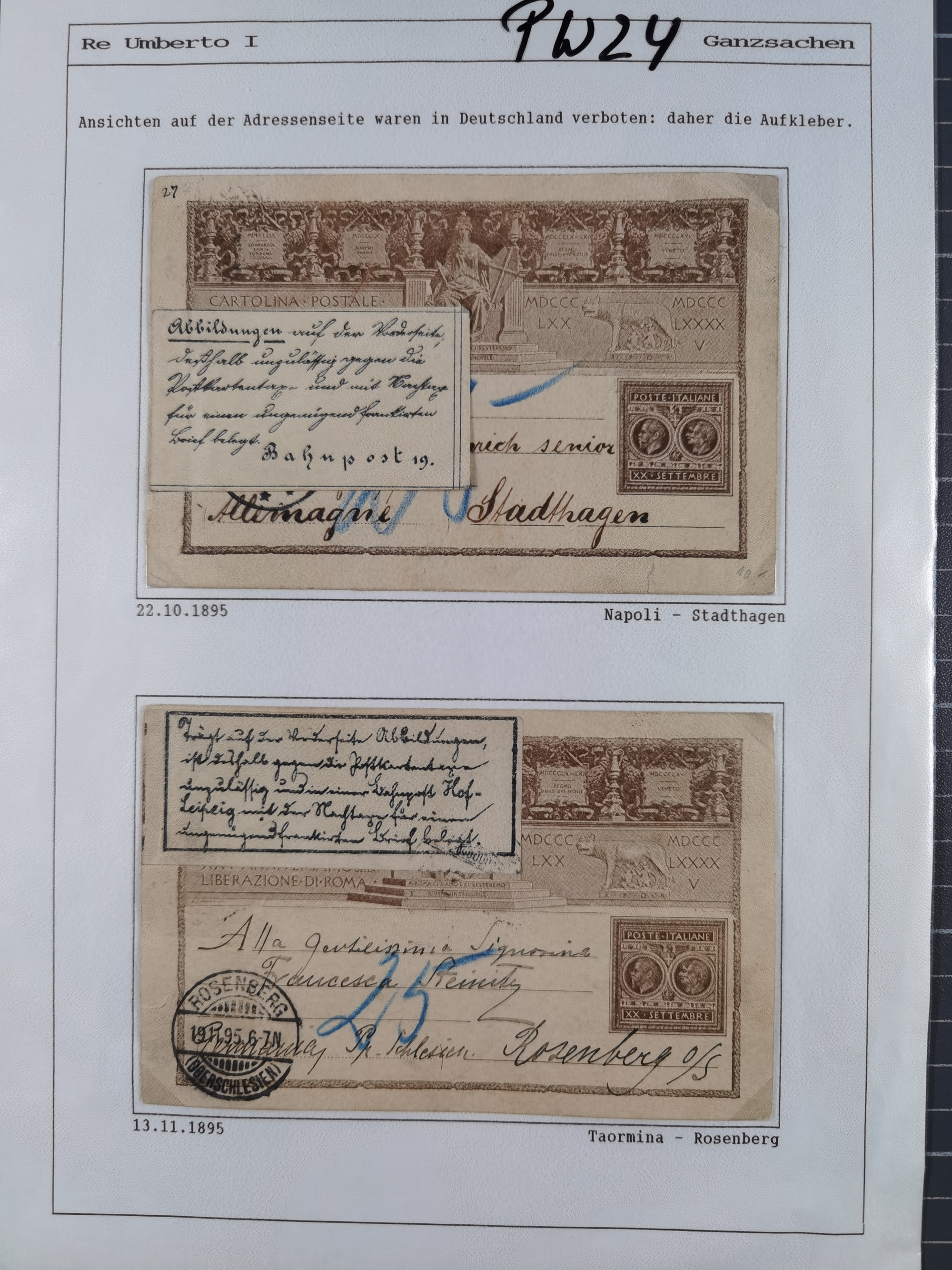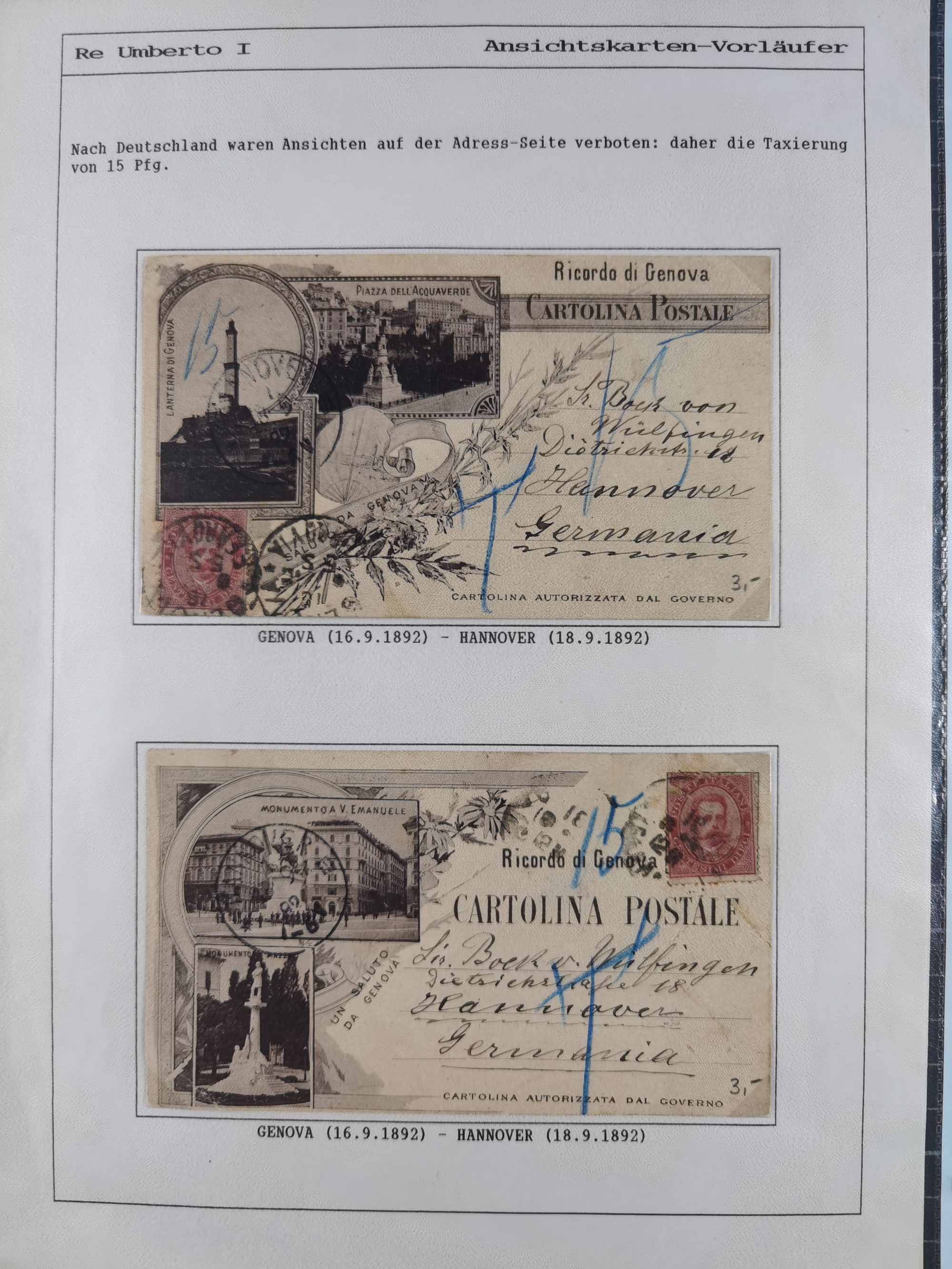 1892/96, 6 used cards, including five to Germany, of those two bearing a label stating that the presence of an illustration on the address side rendered them invalid at the postcard rate, and two without the label, those four charged postage due, interesting group