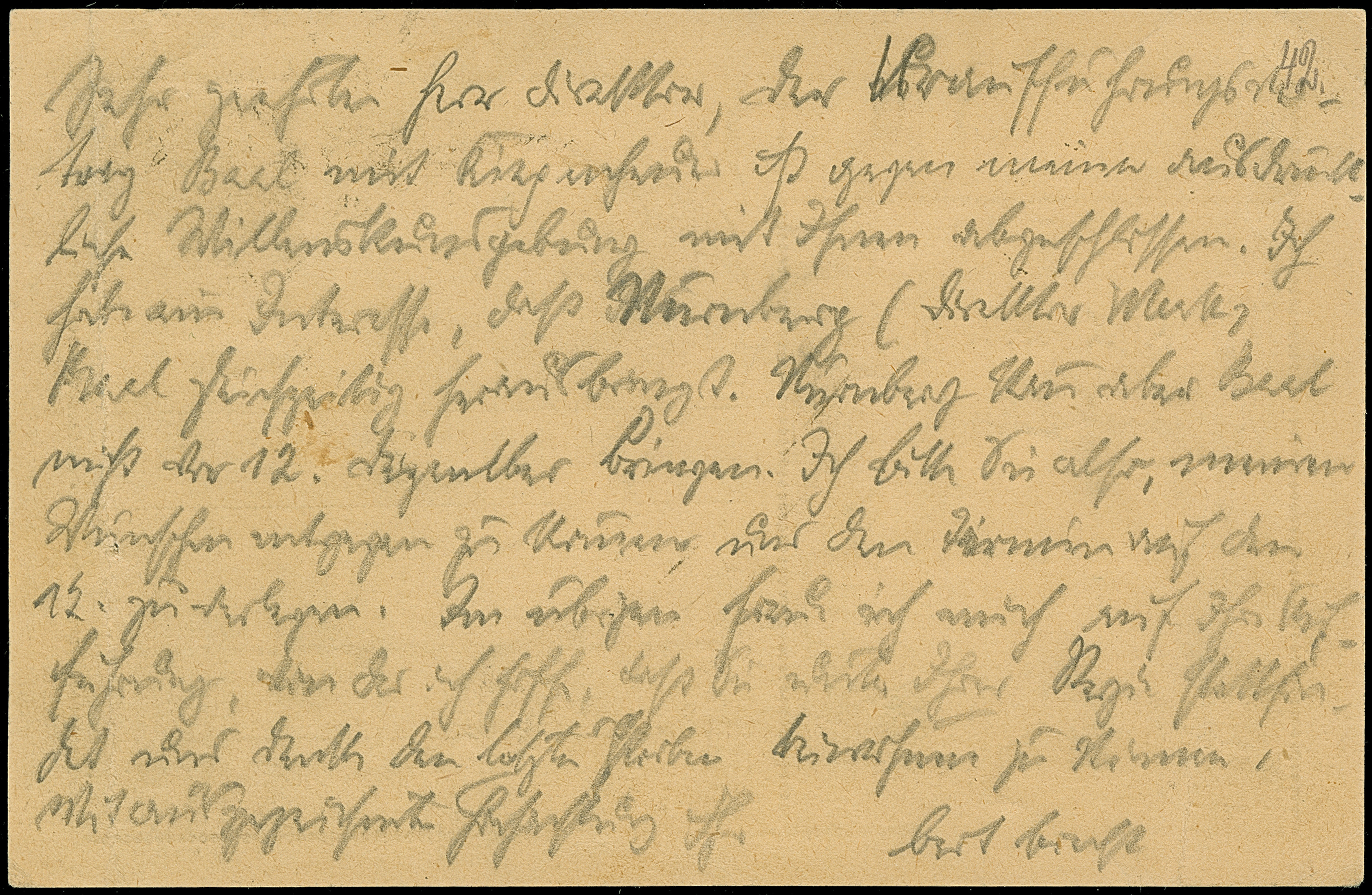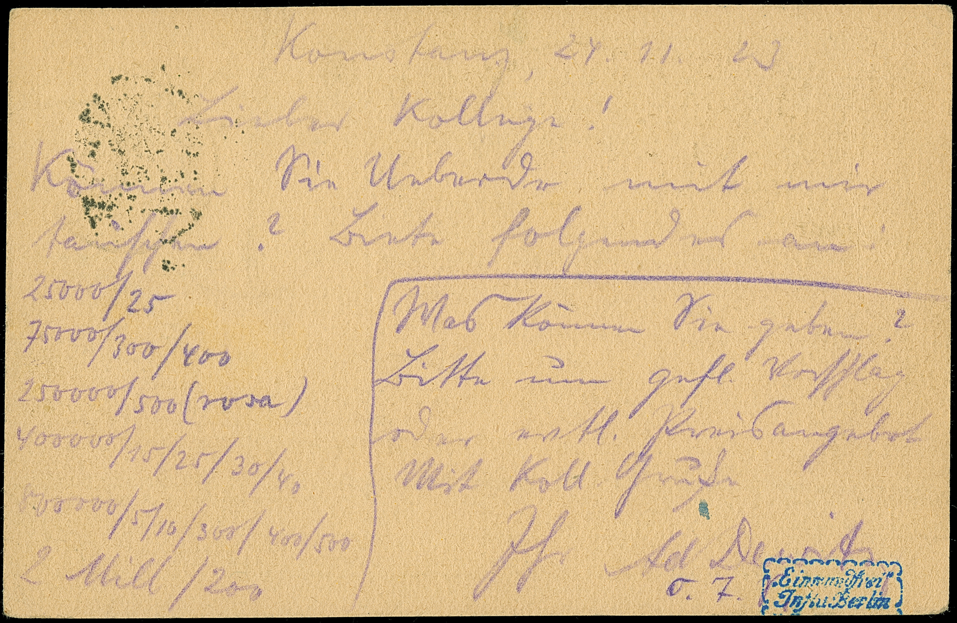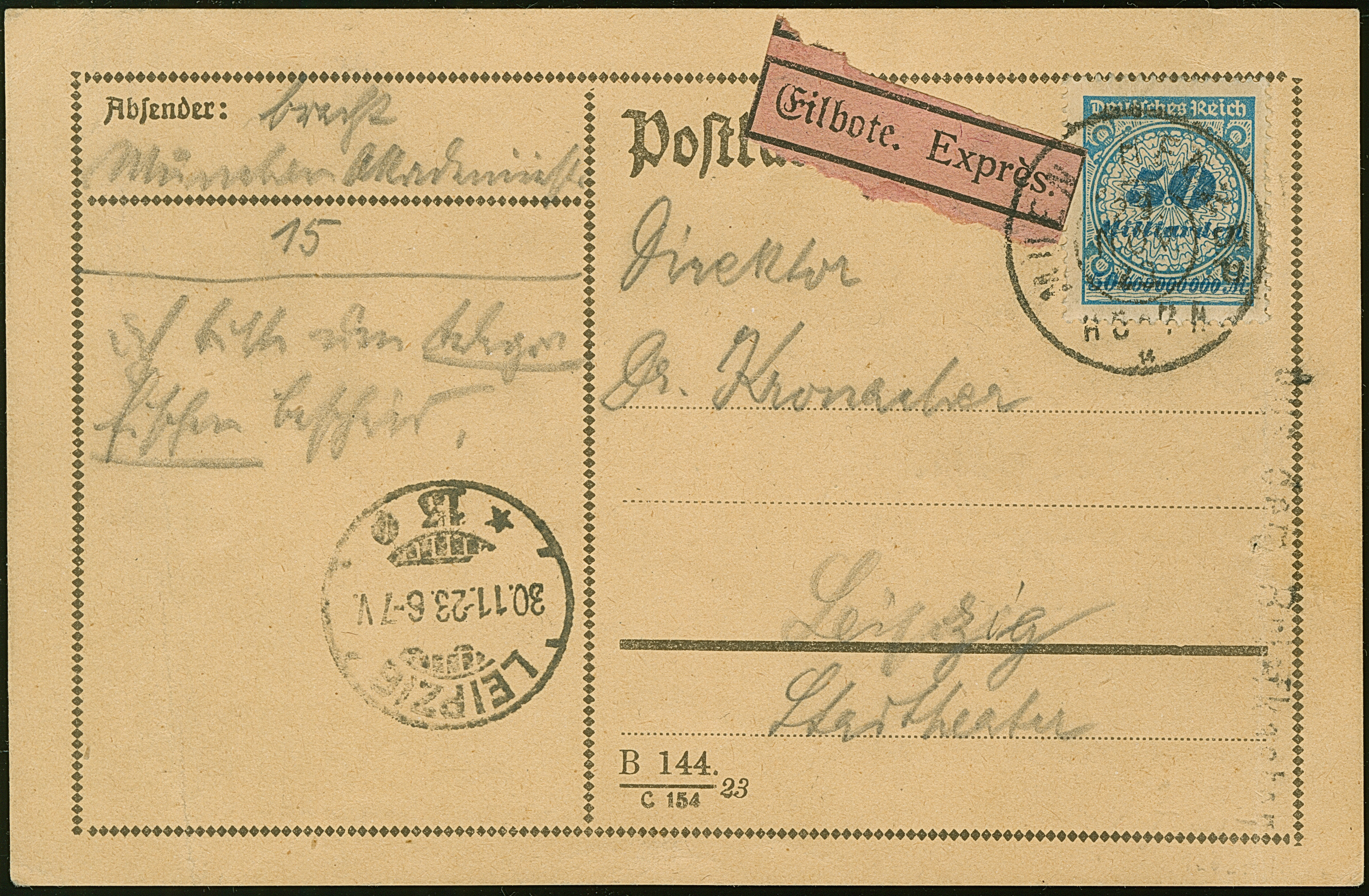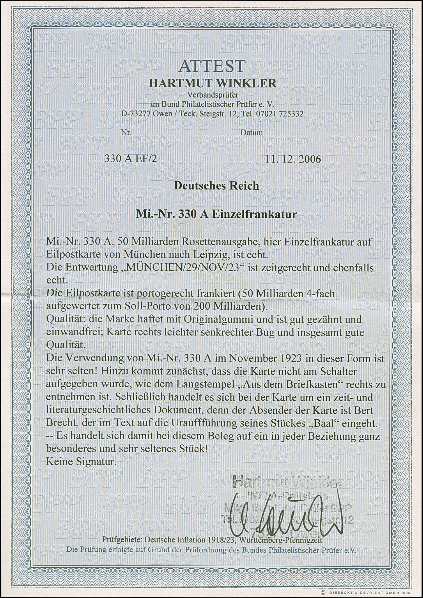 Korbdeckel 50 Mrd. M. gezähnt mit Stempel “MUENCHEN 2 B.P. 29.NOV.23” als tarifgerechte Einzelfrankatur auf Eilboten-Karte mit L1 “Aus dem Briefkasten an den Direktor des Stadttheaters Dr. Kronacher in Leipzig mit vorderseitigem Ankunftsstempel. Rückseitig mit interessantem Text mit der Bitte um Verschiebung der Uraufführung des Drama ”Baal" mit eigenhändiger Unterschrift “Bert (Bertolt) Brecht”. Die Karte mit senkrechtem Bug rechts neben der Karte, die Marke ist in einwandfreier Erhaltung. Eine der ganz seltenen Einzelfrankaturen der 50 Mrd. M. aus November 1923 und in Verbindung mit dem interessanten Text und der Unterschrift von Bertolt Brecht ein zeit- und literaturgeschichtliches Dokument, Fotoattest Winkler BPP (2006)