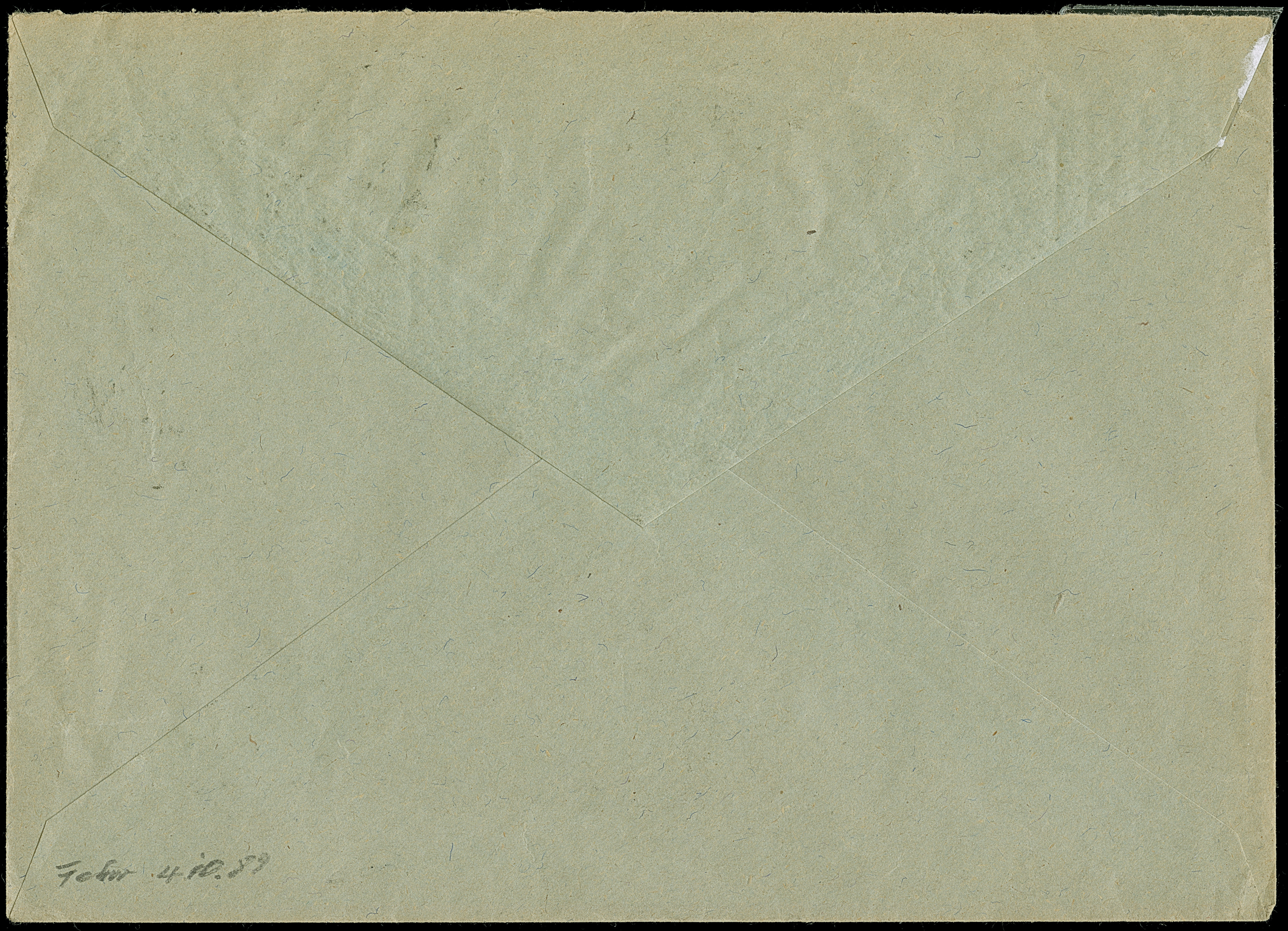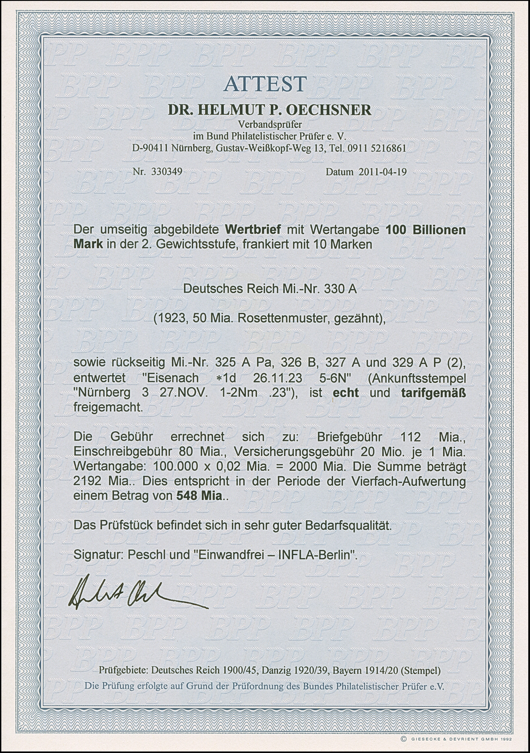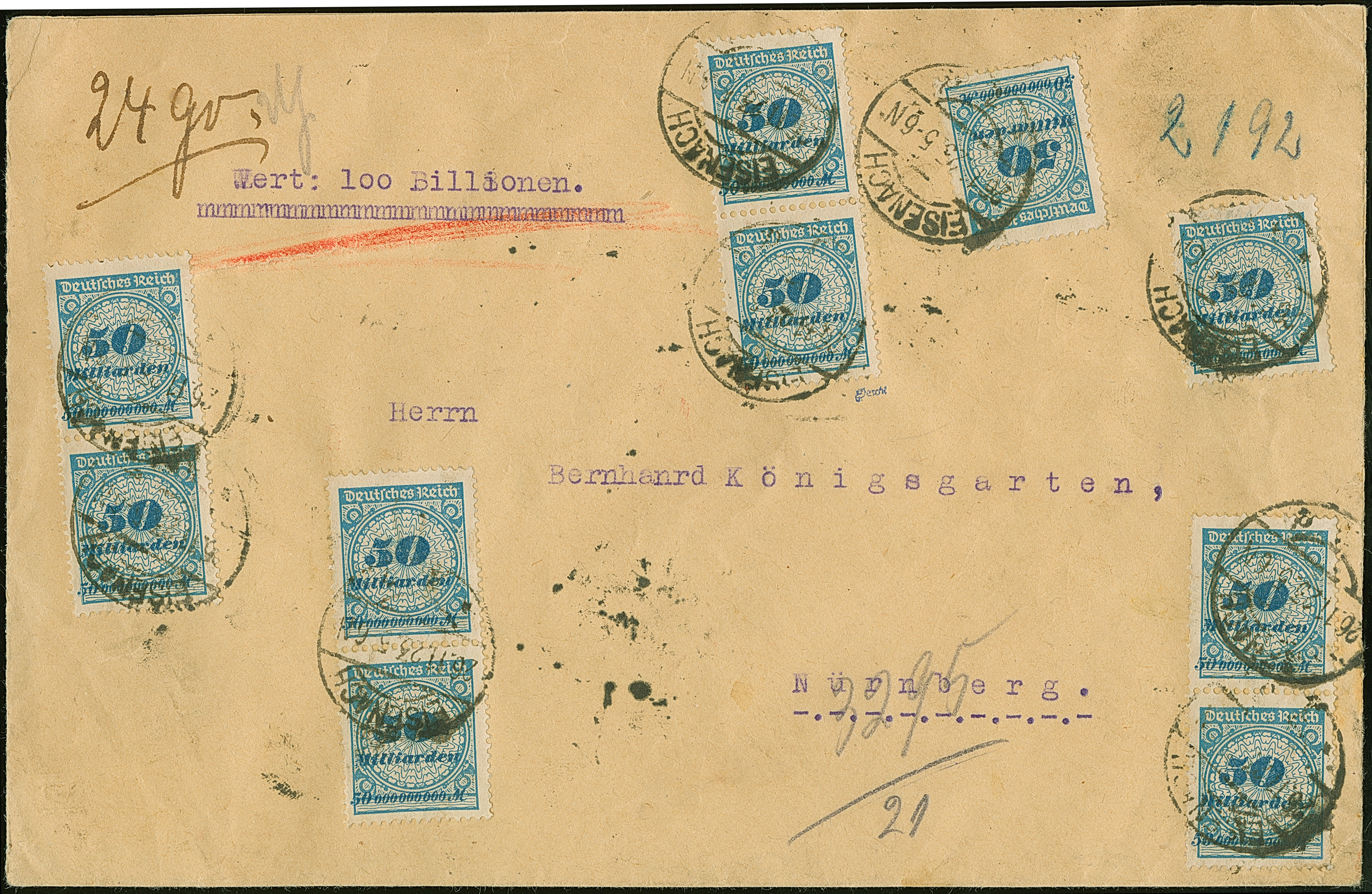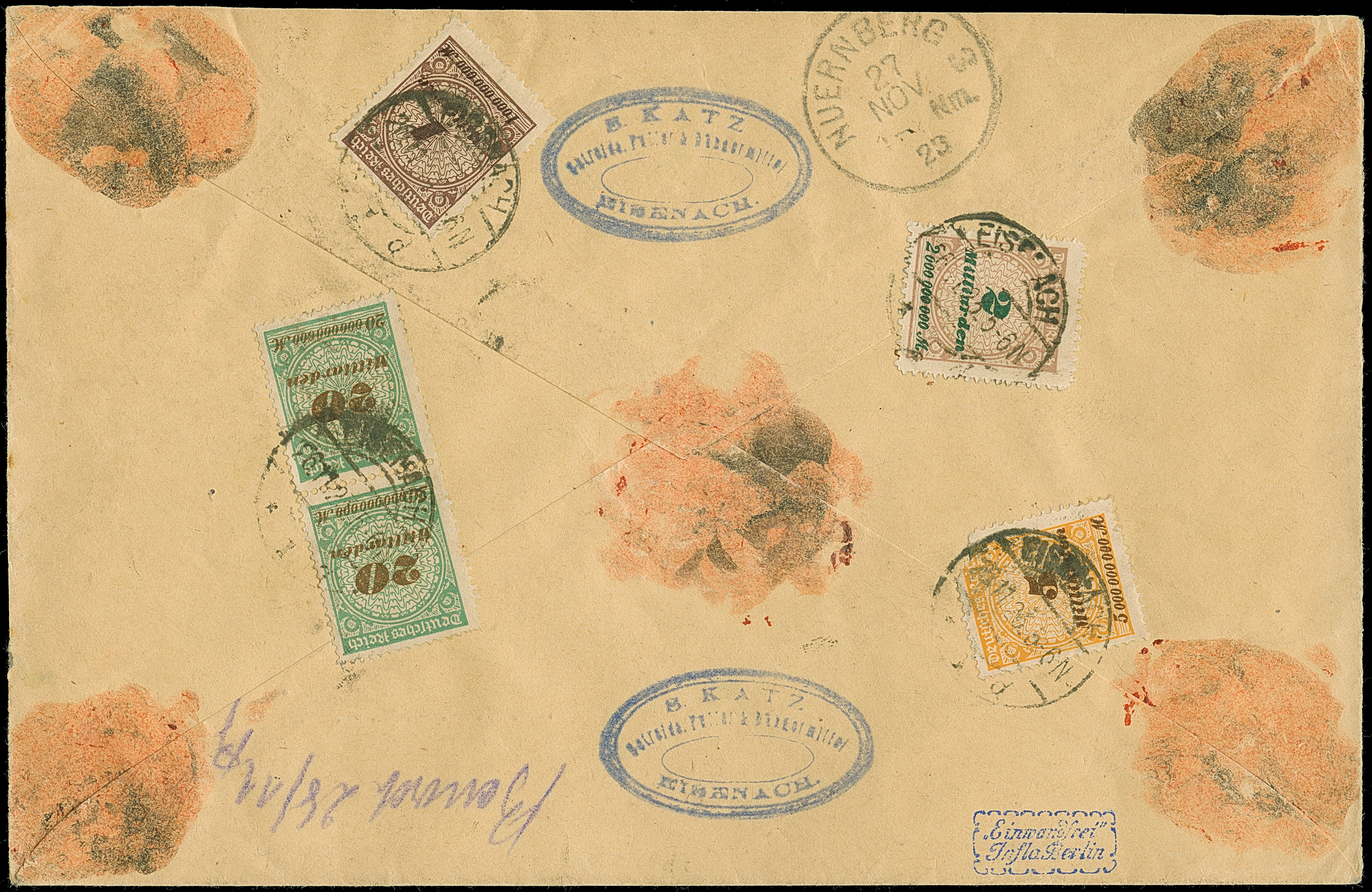 Korbdeckel 50 Mrd. M. gezähnt, vier senkrechte Paare und zwei Einzelmarken sowie senkrechtes Paar 20 Mrd. M. gezähnt, 5 Mrd. M. gezähnt, 2 Mrd. M. durchstochen und 1 Mrd. M. gezähnt je mit Stempel “EISENACH 26.11.23” als tarifgerechte Frankatur vorder- und rückseitig auf Wertbrief der 2. Gewichtsstufe mit Wertangabe “100 Billionen Mark” nach Nürnberg. Auf der Vorderseite hat der Rotstift das Papier zum Teil durchbrochen und wenige Marken haben kleine Eckzahn bzw. Eckfehler, ansonsten in guter Gesamterhaltung. Ein interessanter Wertbrief mit 10 Werten der 50 Mrd. M. gezähnt vom Ersttag der Portoperiode, Fotoattest Oechsner BPP (2011)