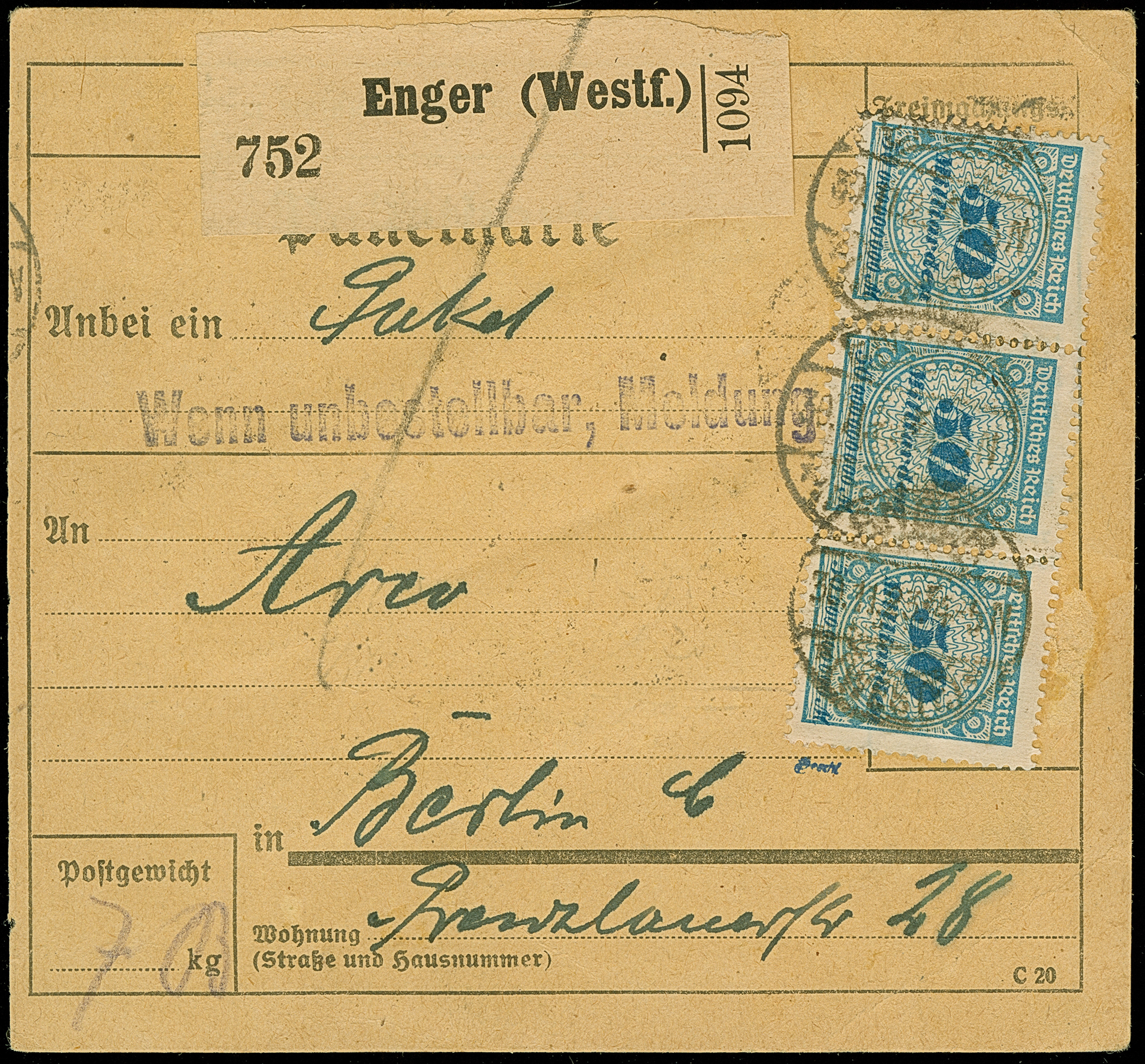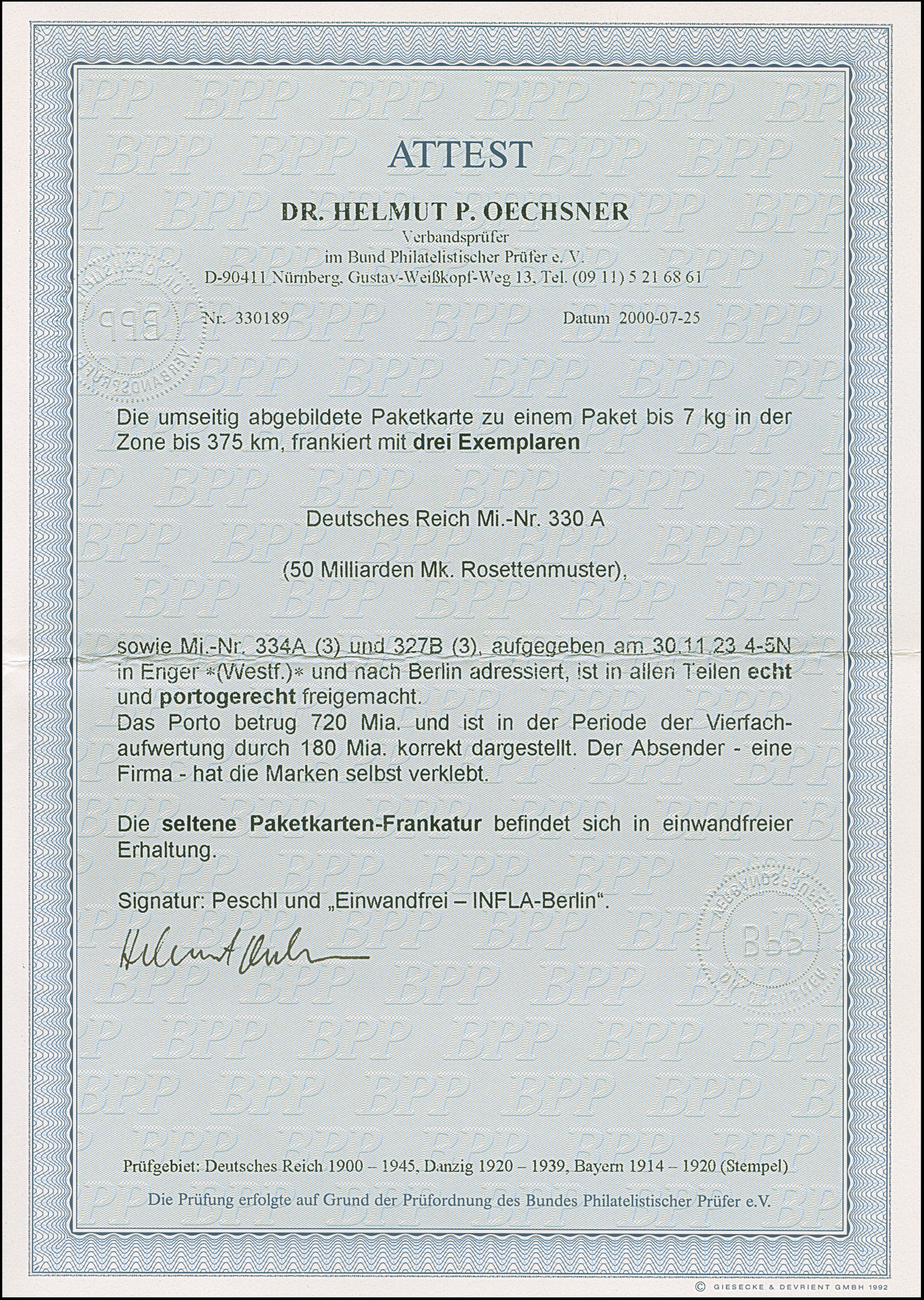 Korbdeckel 50 Mrd. M. im waagerechten Paar und Einzelmarke sowie senkrechter Dreierstreifen 5 Mrd. auf 10 Mio. Mark gezähnt und 5 Mrd. M. durchstochen je mti Stempel “ENGER 30.11.23” als tarifgerechte Frankatur vorder- und rückseitig auf Paketkarte für ein 7 kg schweres Paket nach Berlin. Die Marken leicht unfrisch bzw. zum Teil gelöst, ansonsten in einwandfreier Erhaltung. Eine interessante und seltene Verwendung vom letzten Tag der Portoperiode, sign. Infla Berlin und Peschl sowie Fotoattest Oechsner BPP (2000)