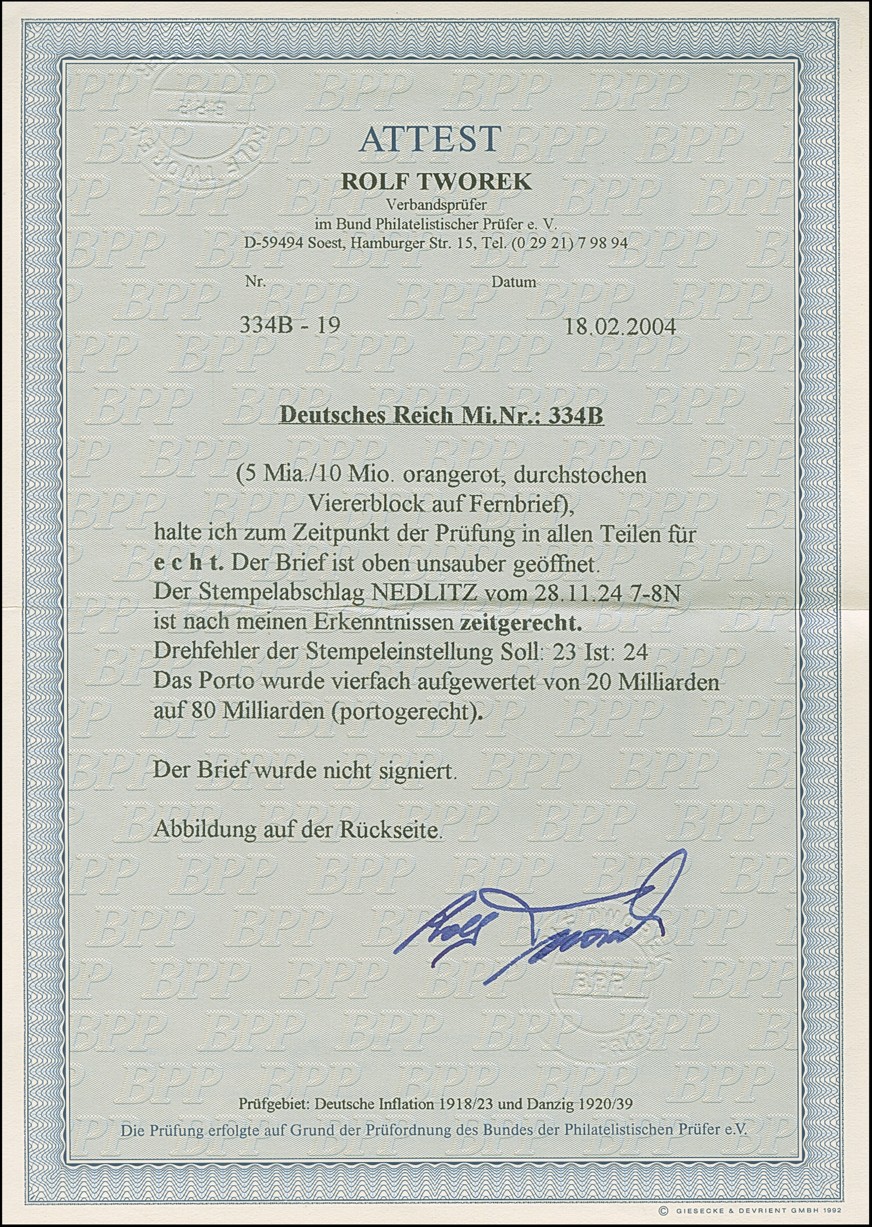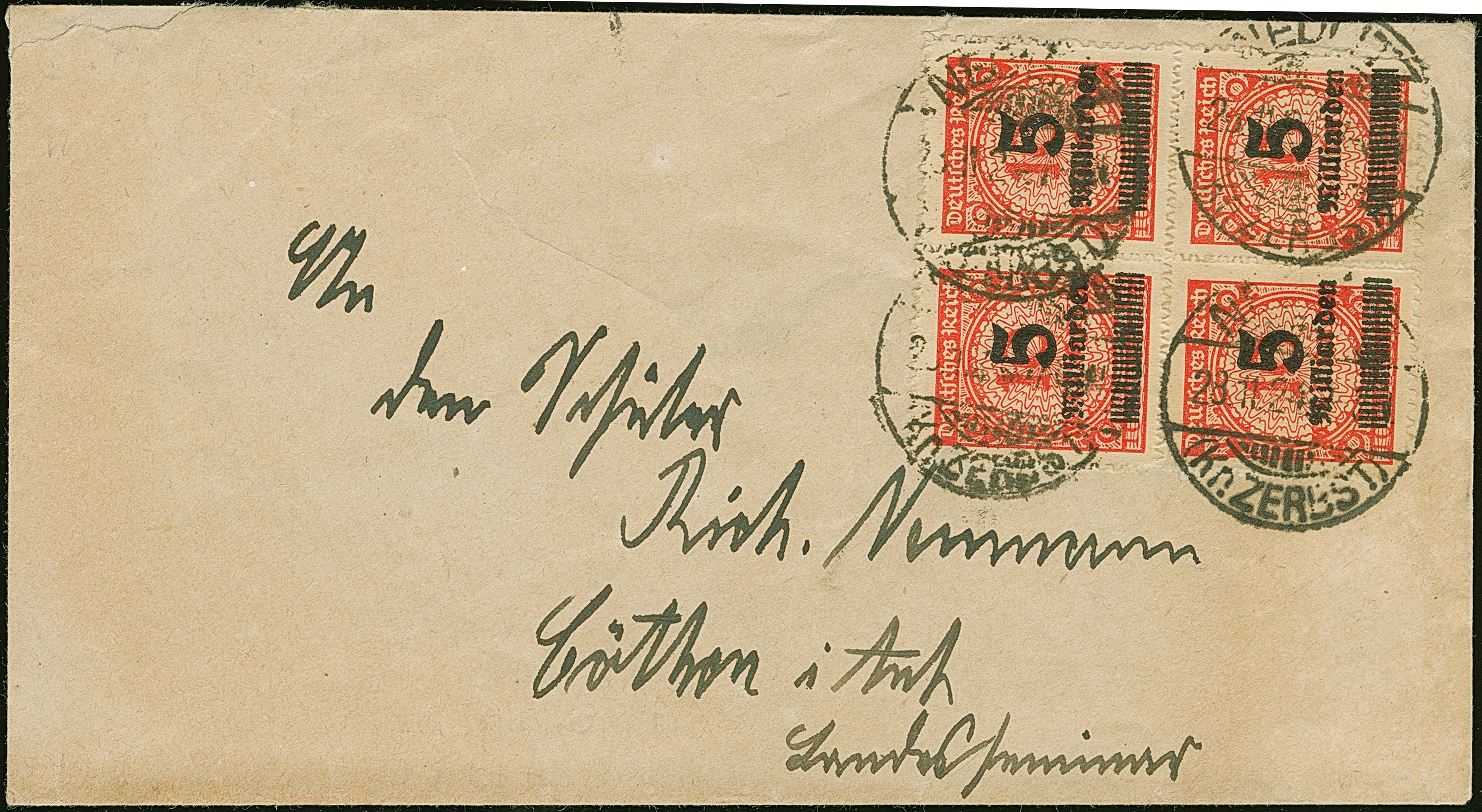 5 Mrd. auf 10 Mio. M. durchstochen im Viererblock mit Stempel “NEDLITZ 28.11.24” (Fehleinstellung, richtig 1923) als tarifgerechte Mehrfachfrankatur auf Brief bis 20 g nach Köthen. Der Umschlag mit Beförderungsspuren und Öffnungsfehler rückseitig, die rechte untere Marke mit Durchstichfehler rechts, ansonsten in guter Erhaltung. Mehrfachfrankaturen dieser Marke sind selten, in Verbindung mit dem Viererblock sind nur ganz wenige Briefe bekannt, Fotoattest Tworek BPP (2004)