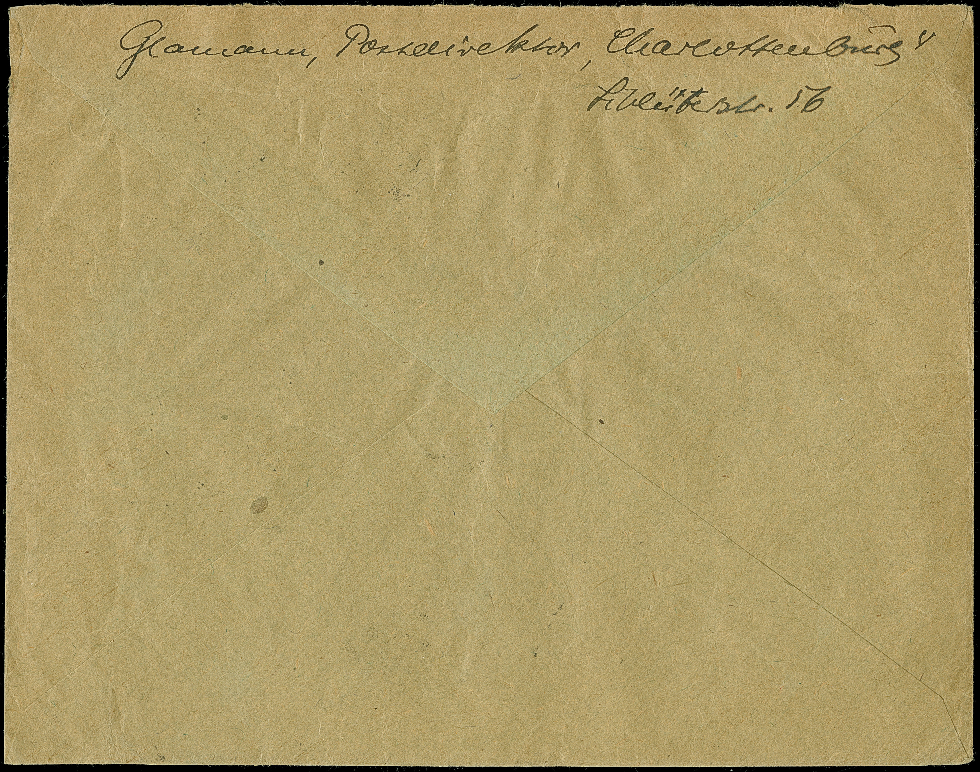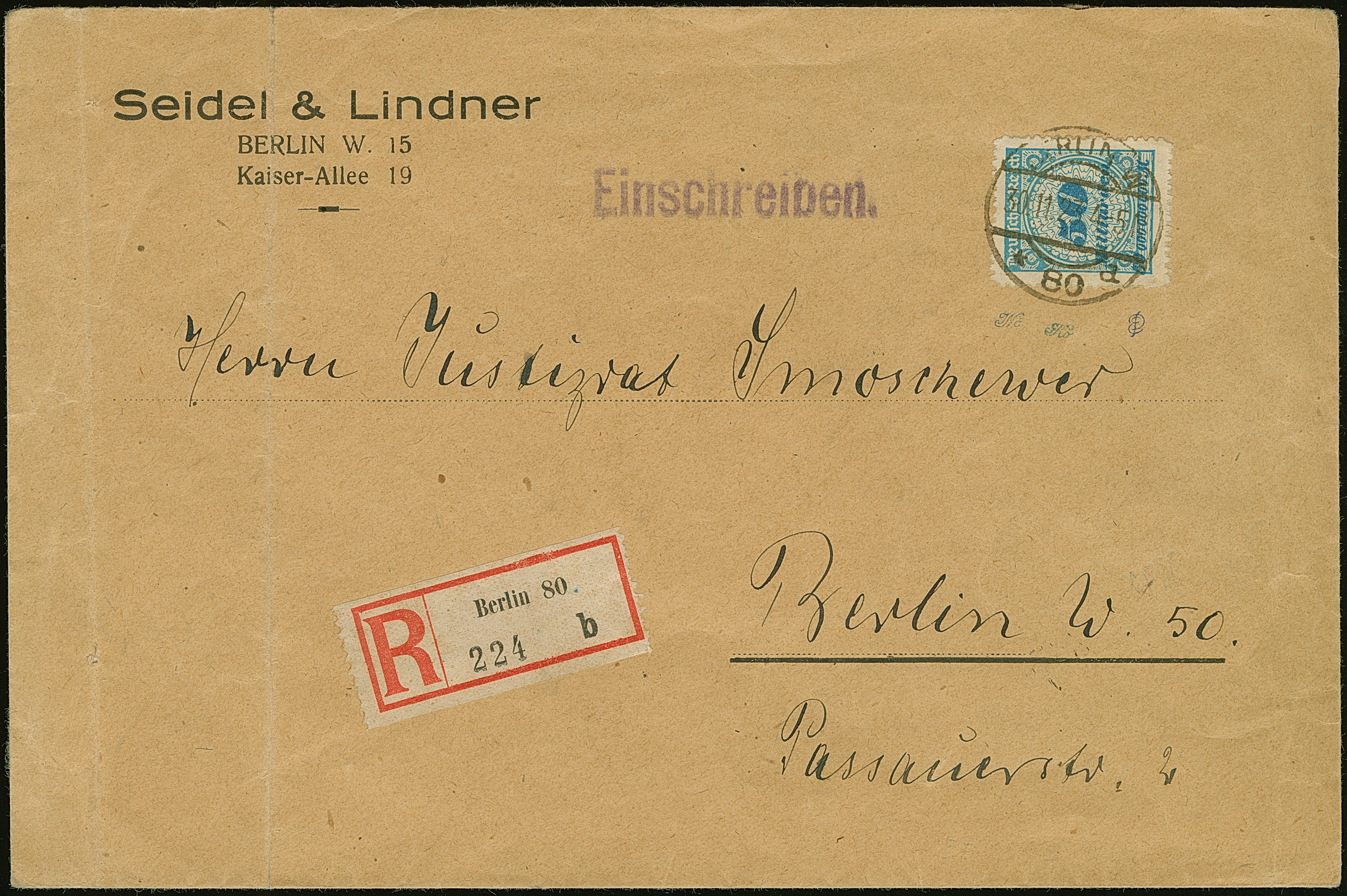 Korbdeckel 50 Mrd. M. durchstochen mit Stempel “BERLIN 30.11.12” auf überfrankiertem R-Ortsbrief über 100 g mit Ankunftsstempel. Der Umschlag links mit senkrechten Faltungen, die Marke mit gutem Durchstich ist in einwandfreier Erhaltung. Trotz der Überfrankatur in Höhe von 10 Milliarden Mark eine äußerst seltene Verwendung dieser Marke im November 1923, drei Monogramme als Signaturen
