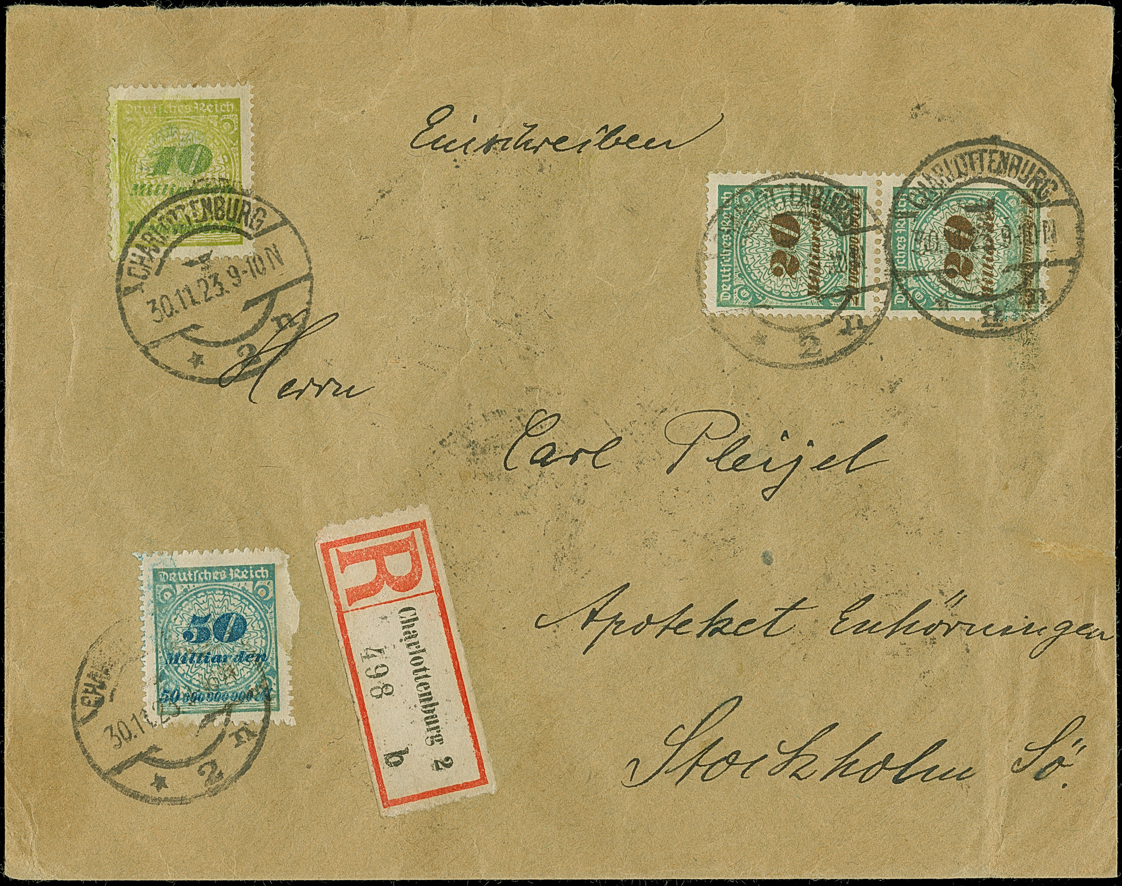 Korbdeckel 50 Mrd. M. durchstochen, senkrechtes Paar 20 Mrd. M. gezähnt und Einzelmarke 10 Mrd. M. gezähnt je mit Stempel “CHARLOTTENBURG 30.11.23” als tarifgerechte Frankatur auf R-Brief bis 20 g nach Stockholm. Der Umschlag mit Beförderungsspuren und die Marken zum Teil leicht verfärbt, die 50 Mrd. M.-Marke mit gutem Durchstich und kleiner Eckzahnkerbe, ansonsten in guter Erhaltung. Eine seltene November-Verwendung der 50 Mrd. M. durchstochen, Fotoattest Tworek BPP (2020)