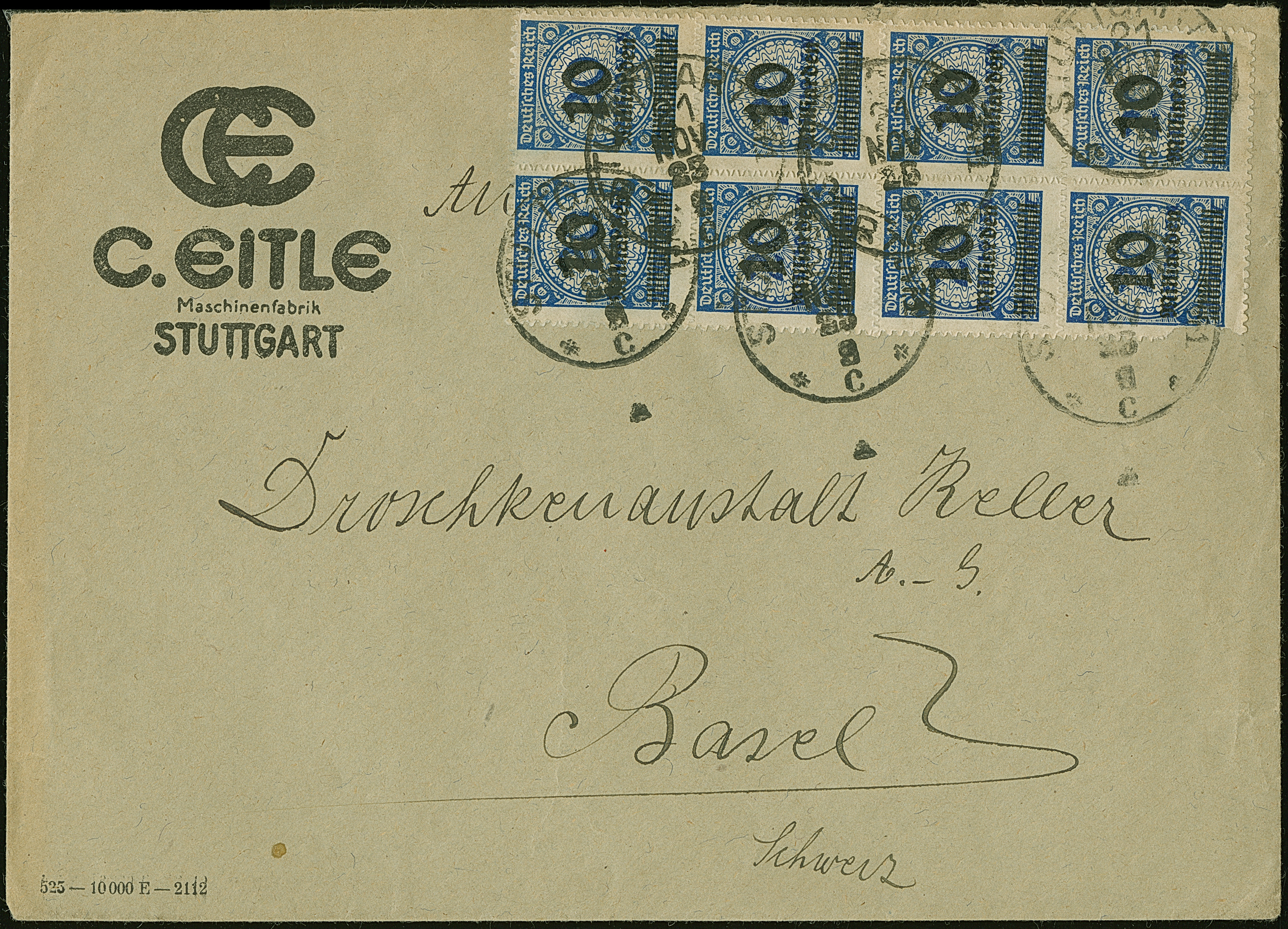 10 Mrd.  auf 20 Mio. M. durchstochen im senkrechten 8er-Block je mit Stempel “STUTTGART 21.11.23” als tarifgerechter Mehrfachfrankatur auf Firmen-Vordruckbrief nach Basel. Die linke untere Marke schon fehlerhaft vor dem Aufkleben, ansonsten ist der Durchstich bei allen Marken gut und wie der Umschlag in einwandfreier Erhaltung. Mehrfachfrankaturen dieser Marken sind nicht häufig, in Verbindung mit größeren Einheiten sehr selten