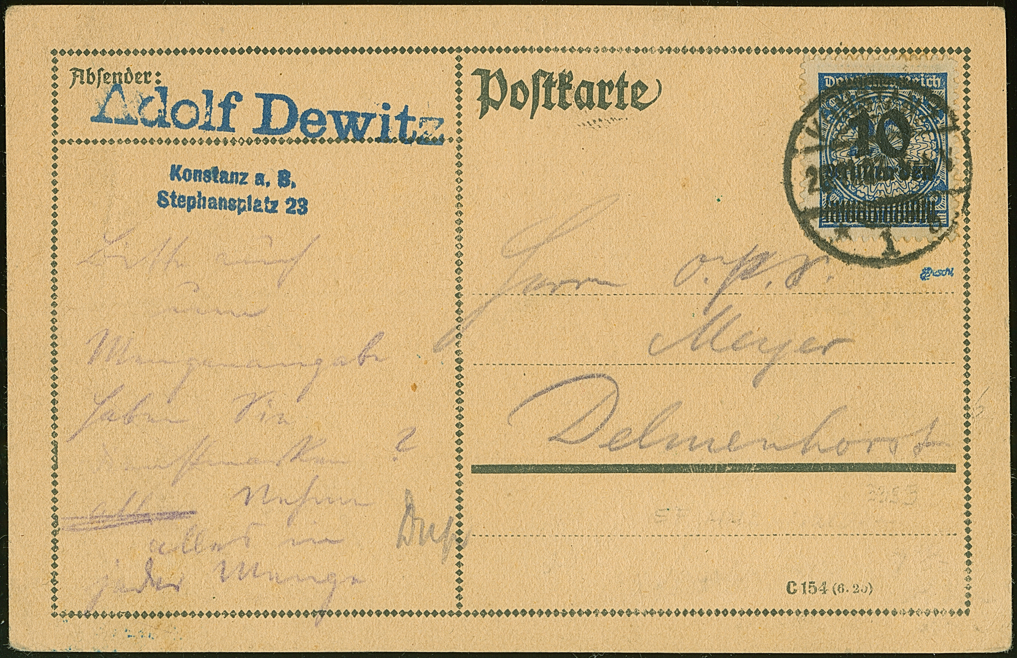 10 Mrd. auf 20 Mio. M. durchstochen mit Stempel “KONSTANZ 25.11.23” als tarifgerechte Einzelfrankatur auf Postkarte nach Delmenhorst. Die Marke mit gutem Durchstich ist wie die Karte in einwandfreier Erhaltung, sign. Infla Berlin und Peschl