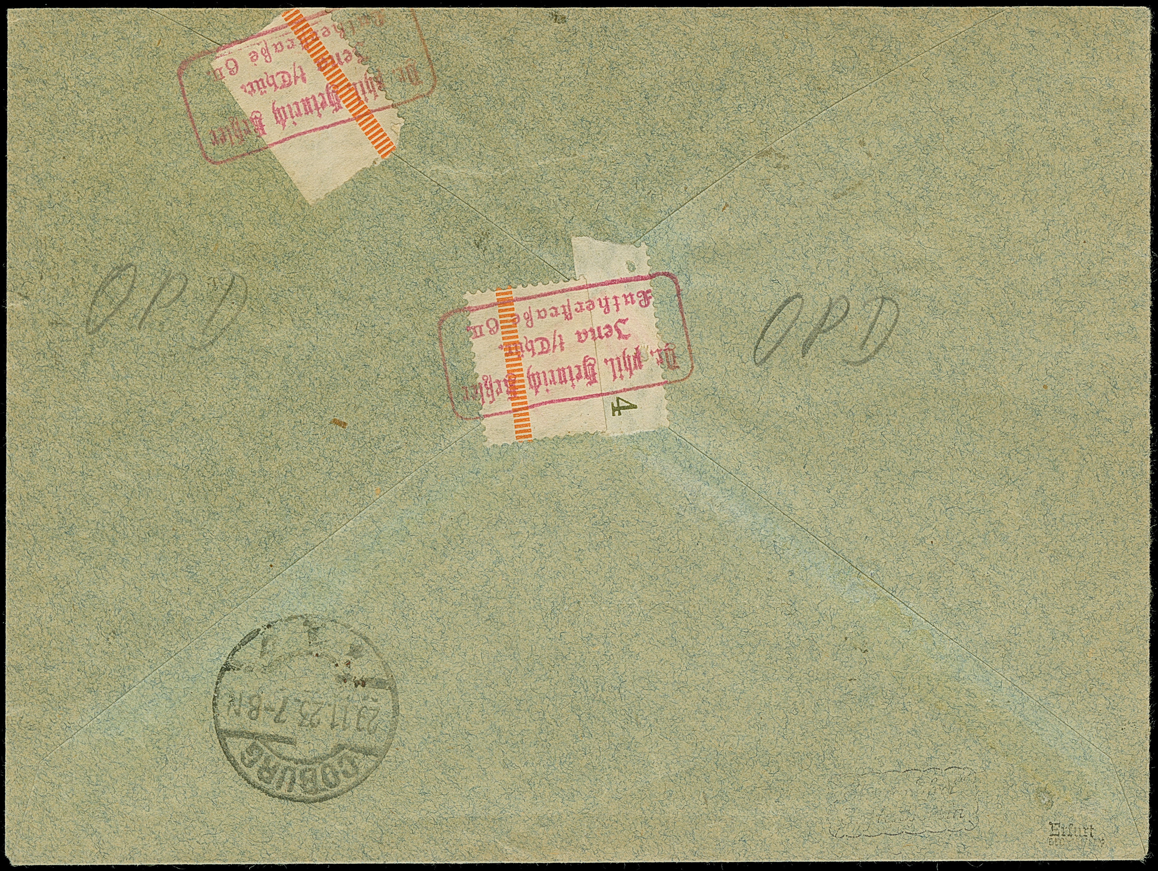 10 Mrd. auf 50 Mio. M. durchstochen mit Plattendruck-Oberrand “A” mit Aufdruck OPD Erfurt und drei Einzelmarken 10 Mrd. auf 50 Mio. durchstochen je mit Stempel “JENA 29.11.23” als tarifgerechte Mehrfachfrankatur auf R-Brief nach Coburg mit Ankunftsstempel. Die Marken zum Teil mit Durchstichfehlern, die Marke mit Oberrand ist in einwandfreier Erhaltung, sign. Infla Berlin und Bechtold BPP