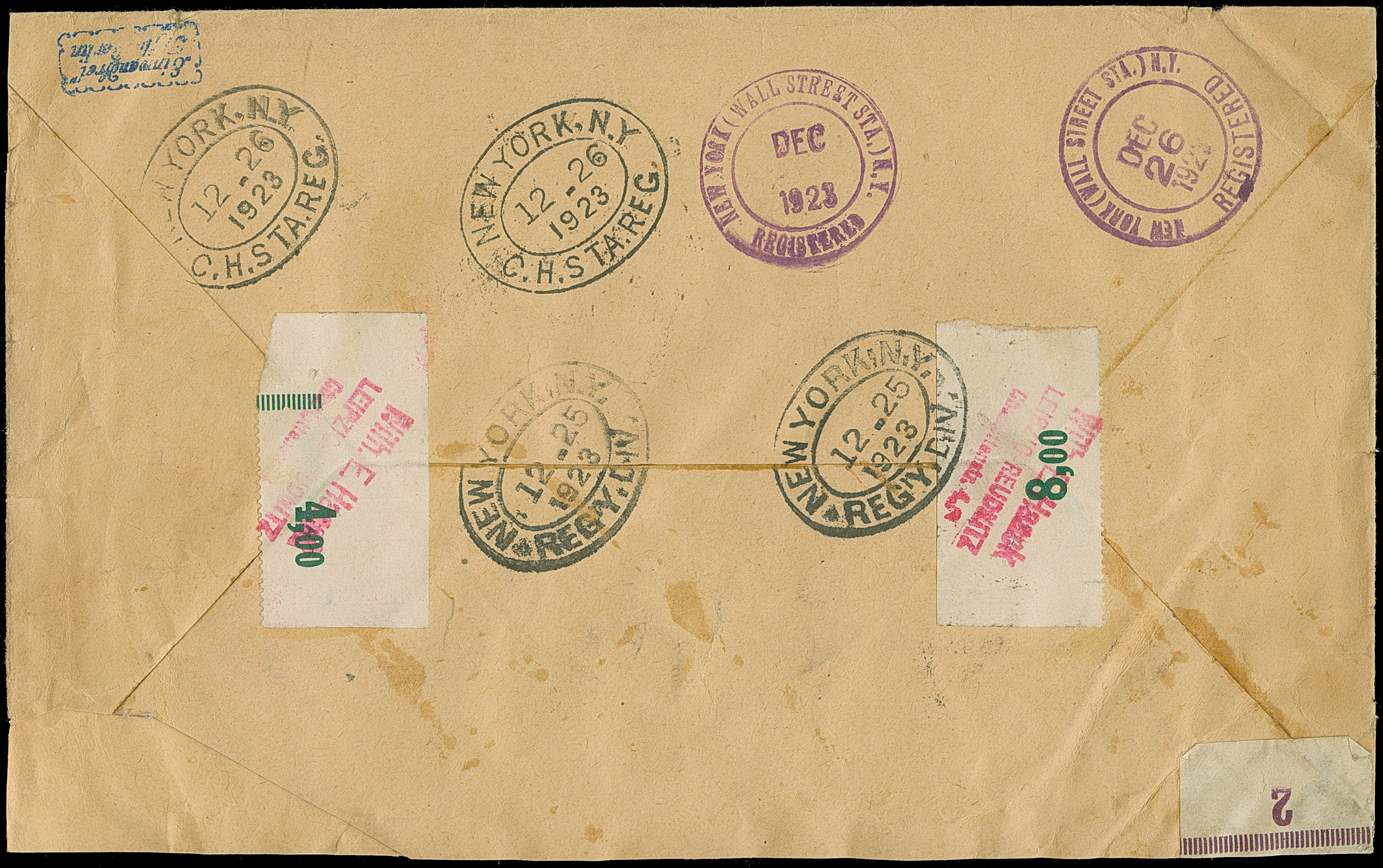 5 Mrd. auf 4 Mio. M. im Viererblock in Mischfrankatur mit Rentenpfennig 3-50 Pfg. jeweils mit Stempel “LEIPZIG 13 14.12.23” als tarifgerechte Frankatur auf R-Brief bis 60 g mit undeutlichem Versuchs-R-Stempel vom 14.12.23 und zusätzlichem R-Zettel “Leipzig 13” (war bei Auslandssendungen vorgeschrieben) nach New York mit Ankunftsstempel. Der Umschlag mit Beförderungsspuren im Rand und rechts mit Einriss, ansonsten in guter Erhaltung. Eine außergewöhnlich seltene Mischfrankatur aus Dezember 1923 mit fünf verschiedenen Werten bis 50 Pfg. der Rentenpfennig-Ausgabe, in dieser Form vermutlich einmaliger Brief, sign. Infla Berlin und Peschl