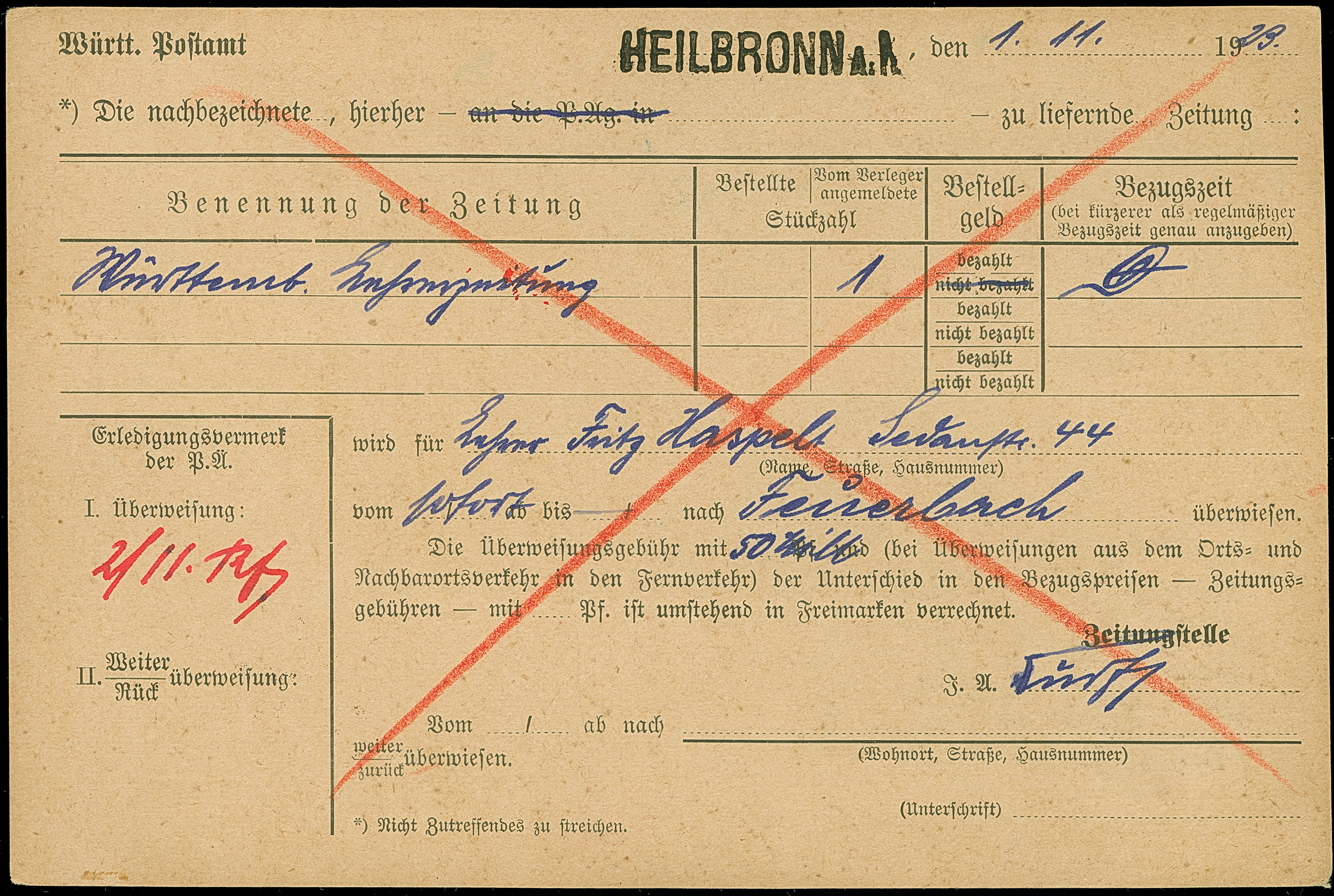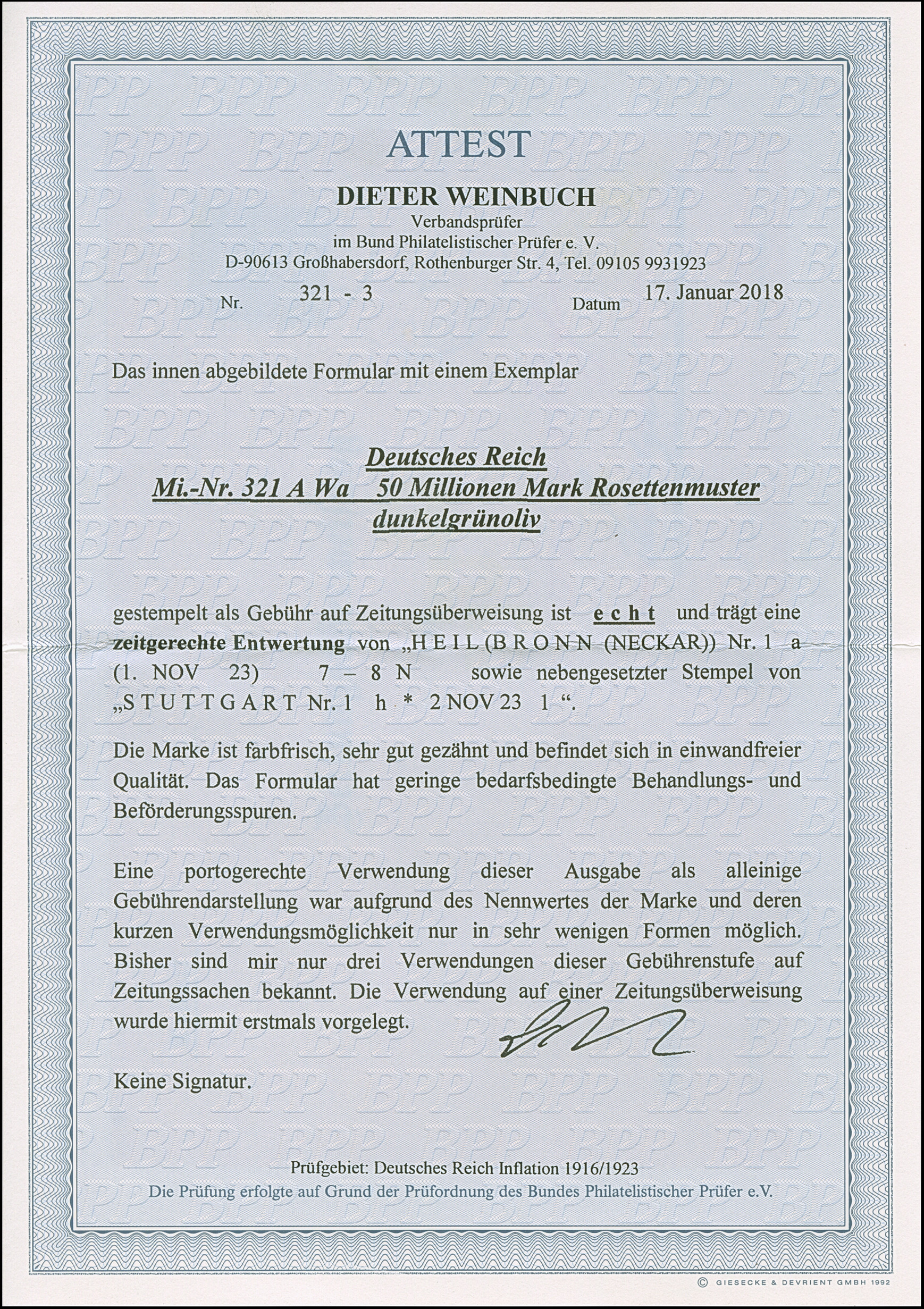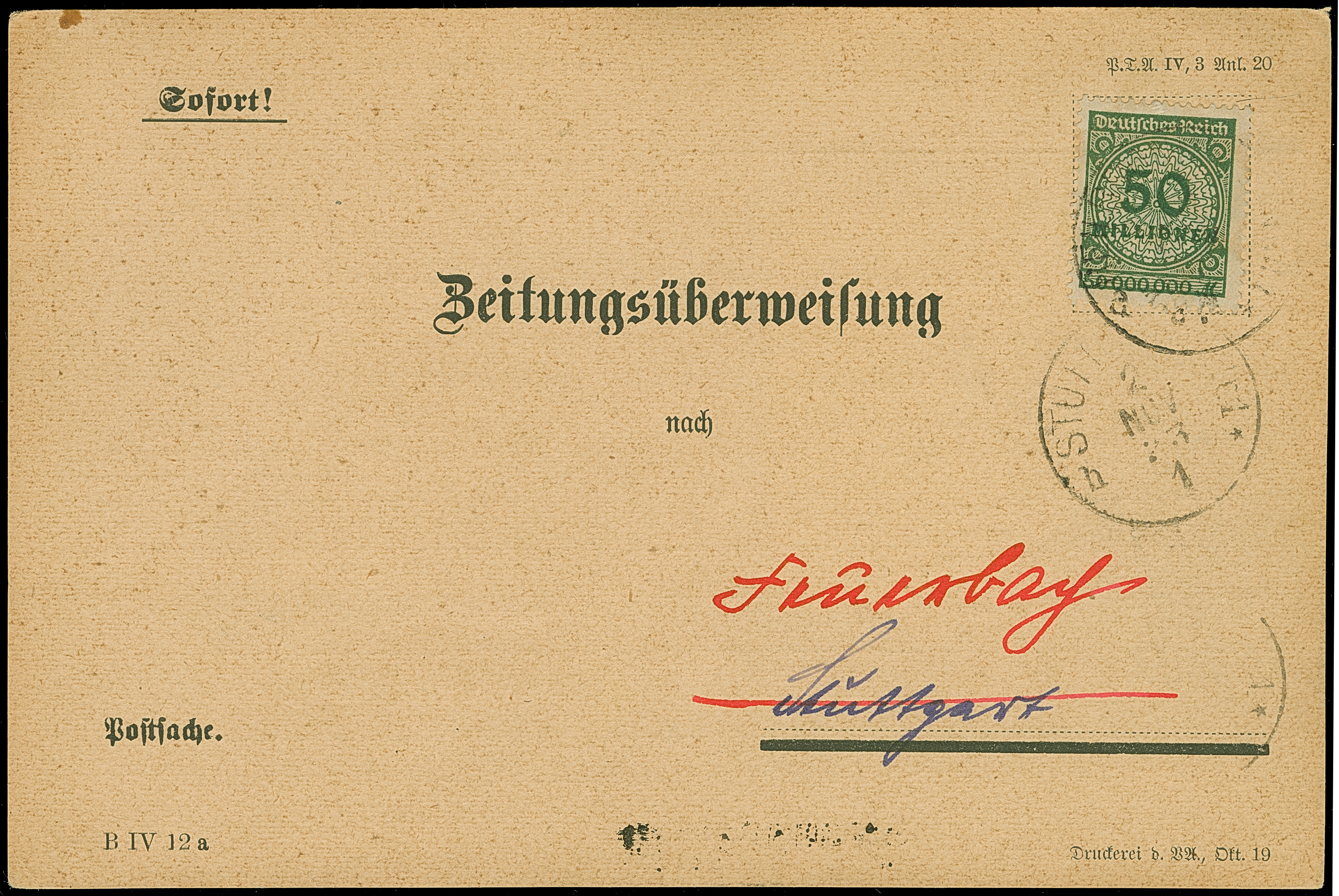 Korbdeckel 50 Mio. M. gezähnt mit Stempel “HEILBRONN 1.NOV.23” als tarifgerechte Einzelfrankatur auf Postsachen-Vordruckkarte “Zeitungsüberweisung” für eine Zeitung nach Stuttgart mit vorderseitigem Ankunftsstempel und Nachsendung nach Feuerbach. Das Formular hat leichte Bearbeitungs- und Beförderungsspuren, die Marke ist in einwandfreier Erhaltung. Eine der ganz wenigen bekannten Einzelfrankaturen mit dieser Marke und hier als einmalige Verwendung auf Zeitungsüberweisung, eine der Seltenheiten der Inflationszeit, Fotoattest Weinbuch BPP (2018)