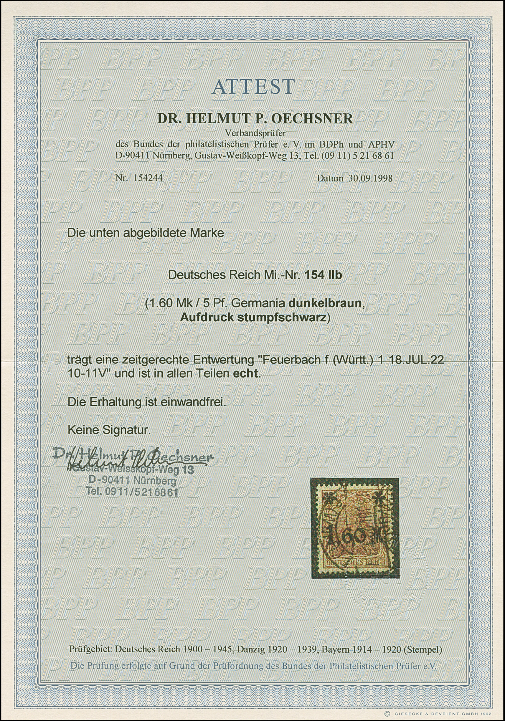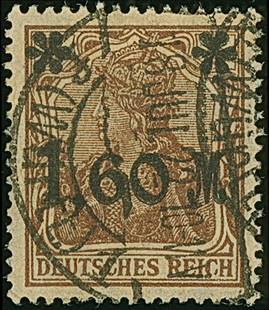 1921, Germania Aufdruck 1,60 M. 5 Pfg. dunkelbraun, matter Aufdruck, farbfrisch und gut gezähnt, sauber gestempelt. Fotoattest Dr. Oechsner BPP (1998)
