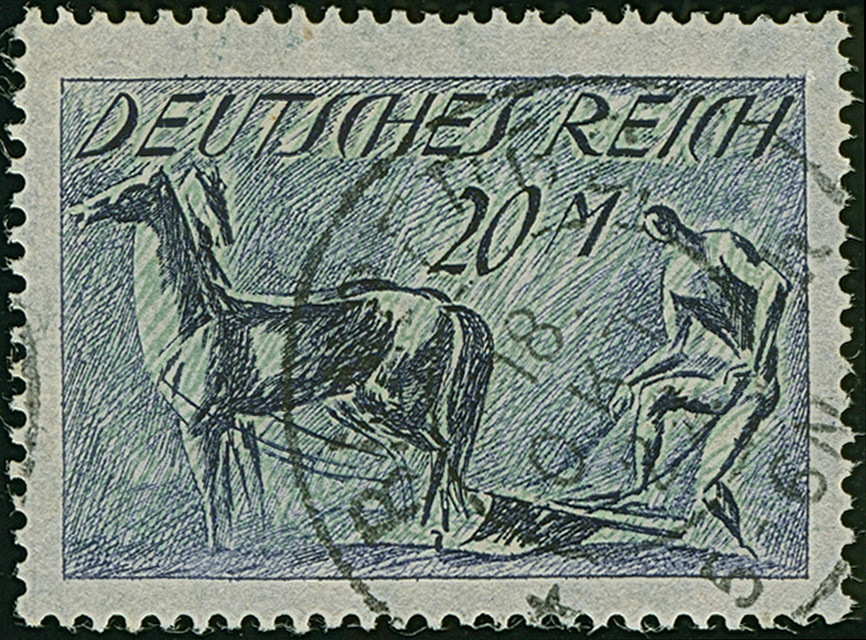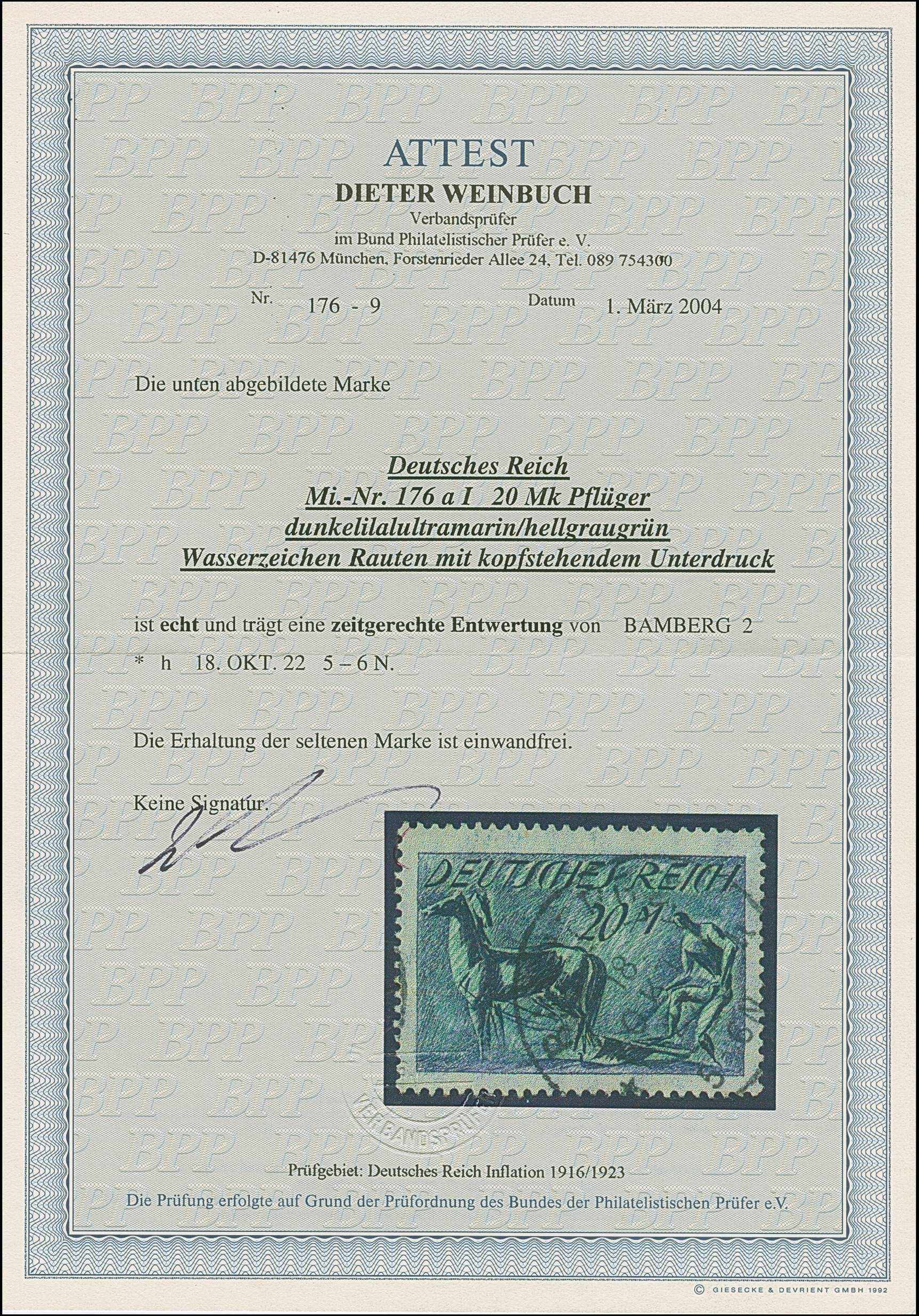 Pflüger 20 M. mit kopfstehendem Unterdruck, sauber gestempelt. Einwandfrei. Fotoattest Weinbuch BPP (2004)