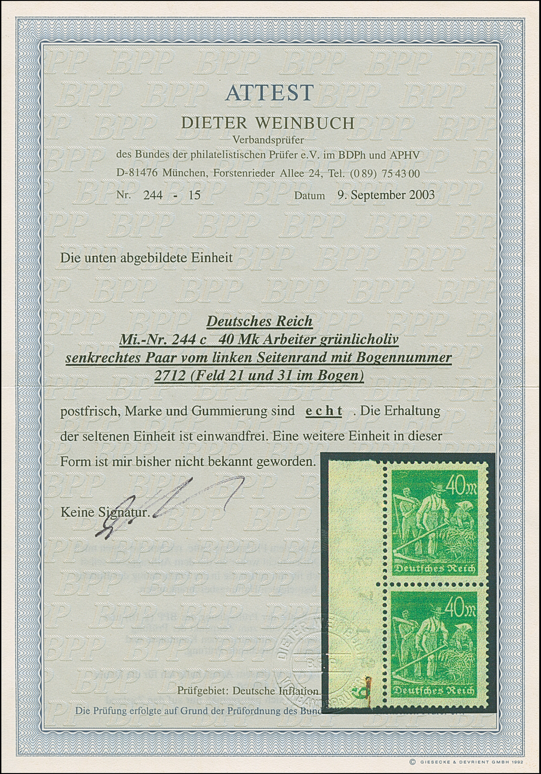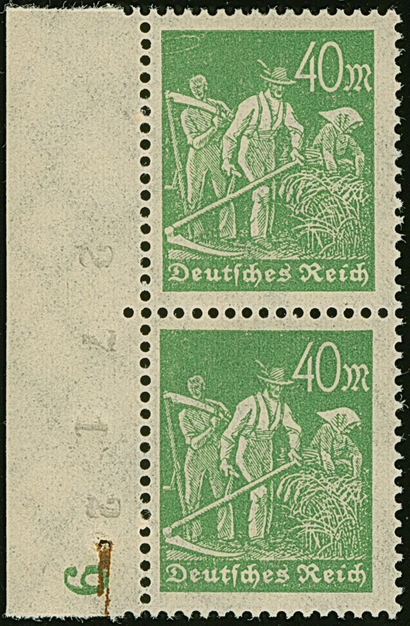 1922, Schnitter 40 M. dunkelgelblichgrün im senkrechten Randpaar mit Bogennummer, postfrisch und in tadelloser Erhaltung, unsigniert mit Fotoattest Weinbuch BPP (2003)