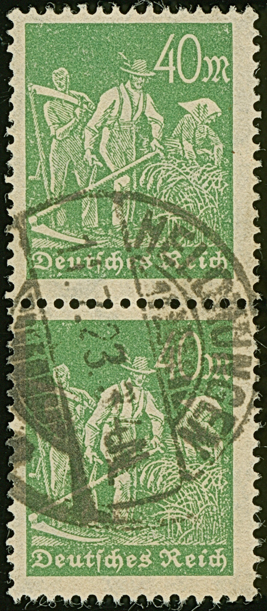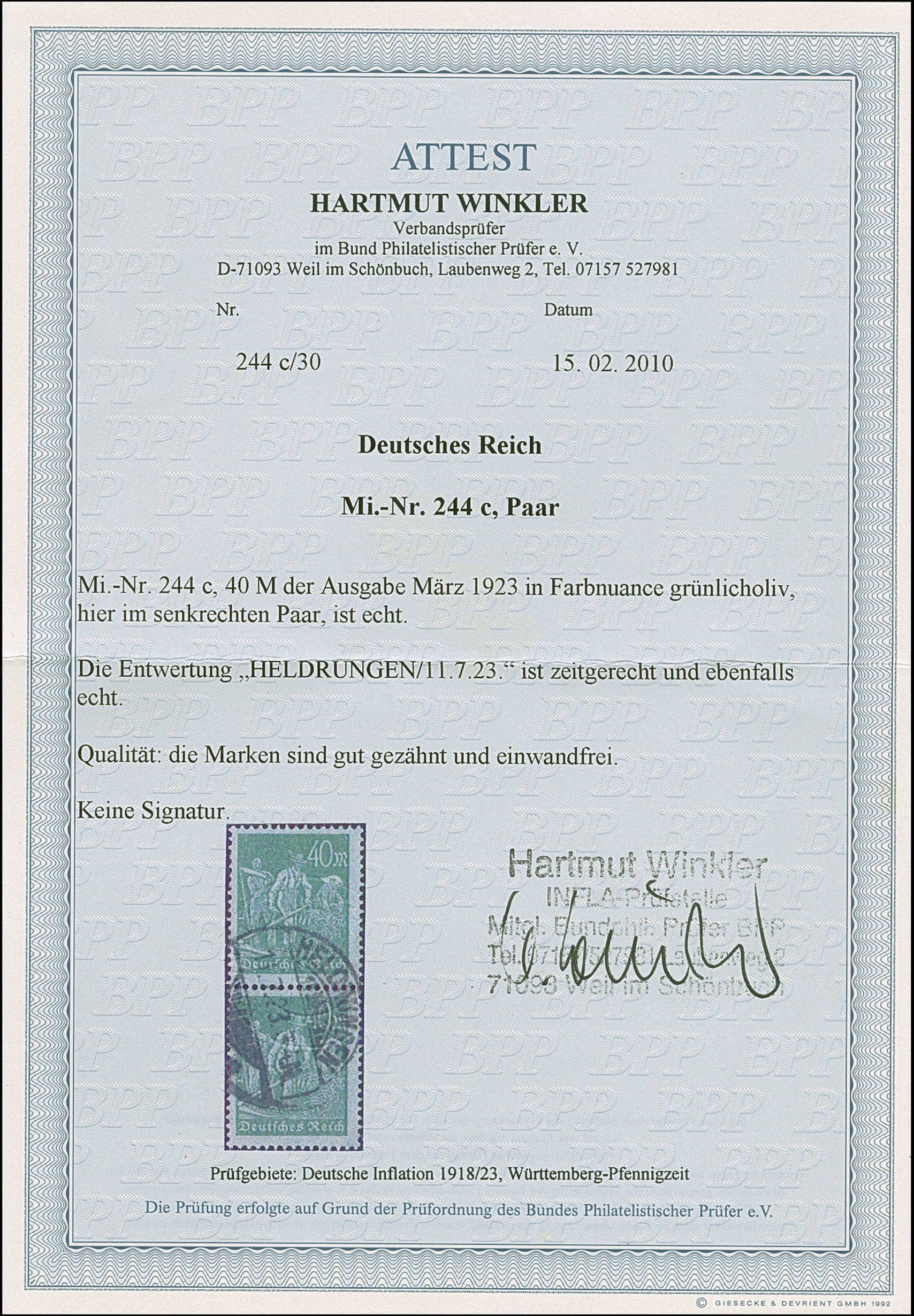 1922, Schnitter 40 M. dunkelgelblichgrün im senkrechten Paar mit Stempel “HELDRUNGEN 11.7.23”, in einwandfreier Erhaltung. Ein äußerst seltenes gestempeltes Paar, ProFi hat kein weiteres gestempeltes Paar mit dieser seltenen Farbe registriert, Fotoattest Winkler BPP (2010)